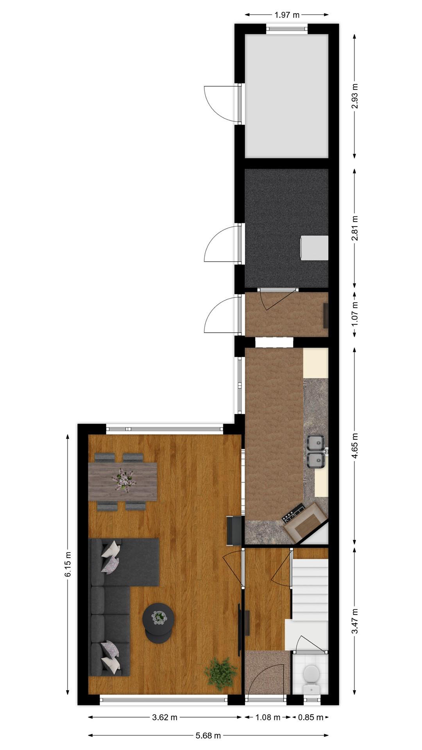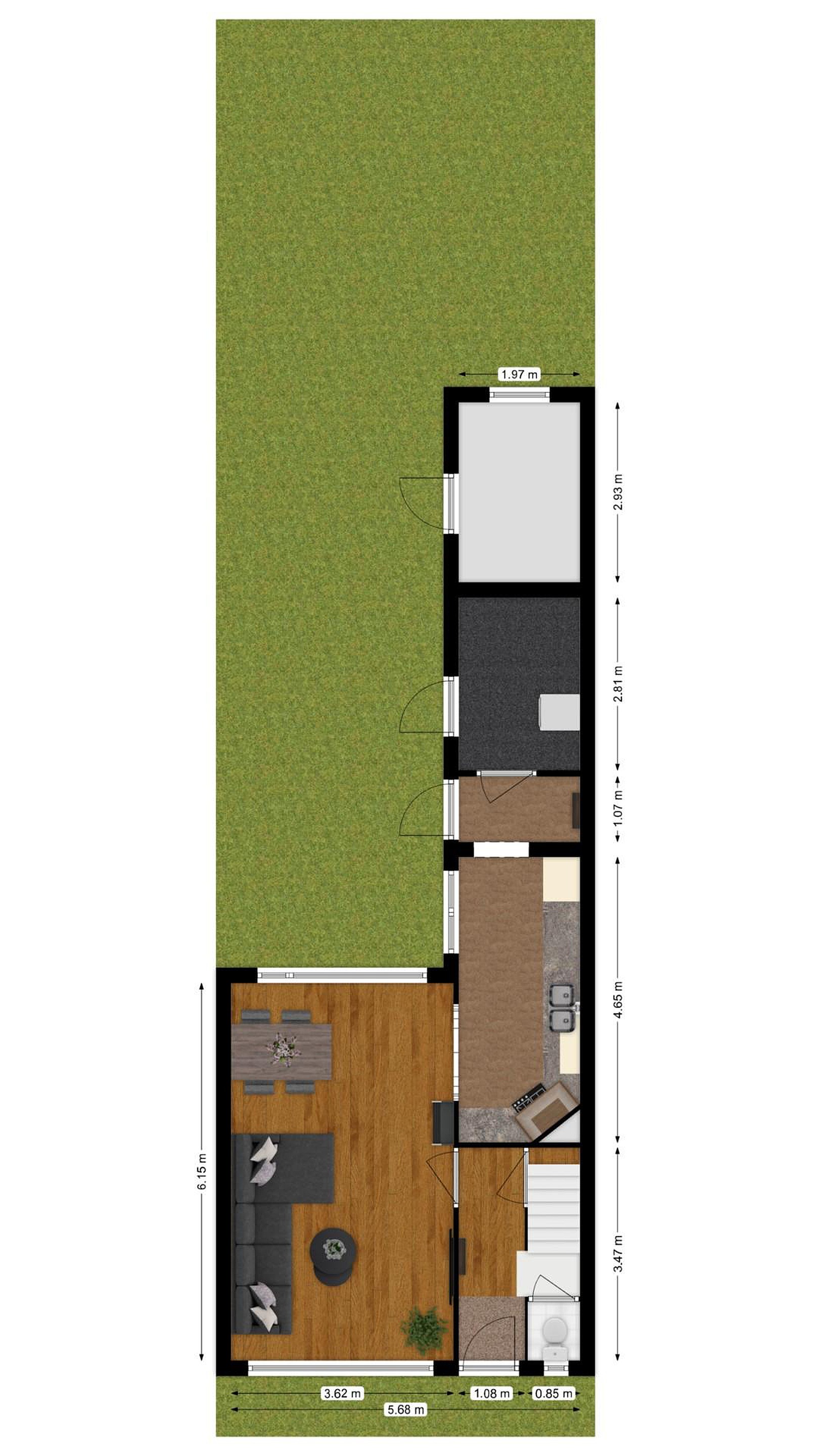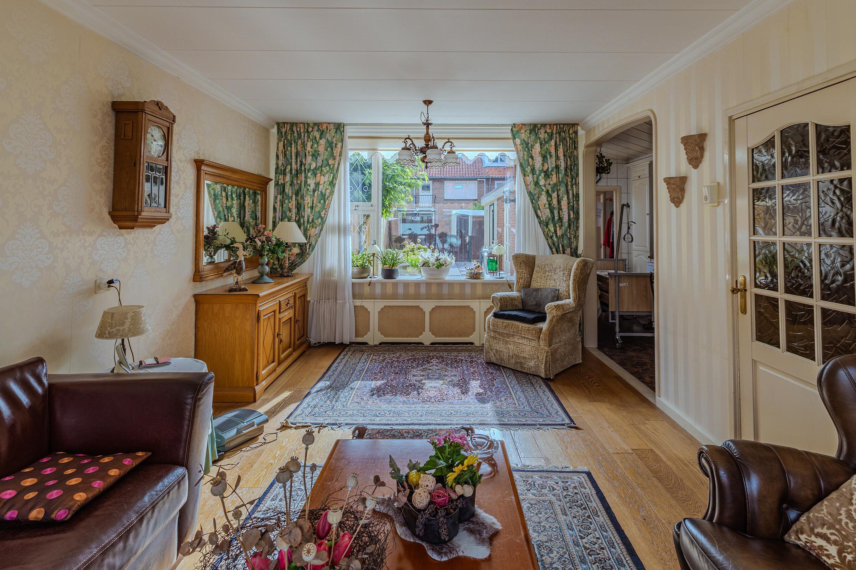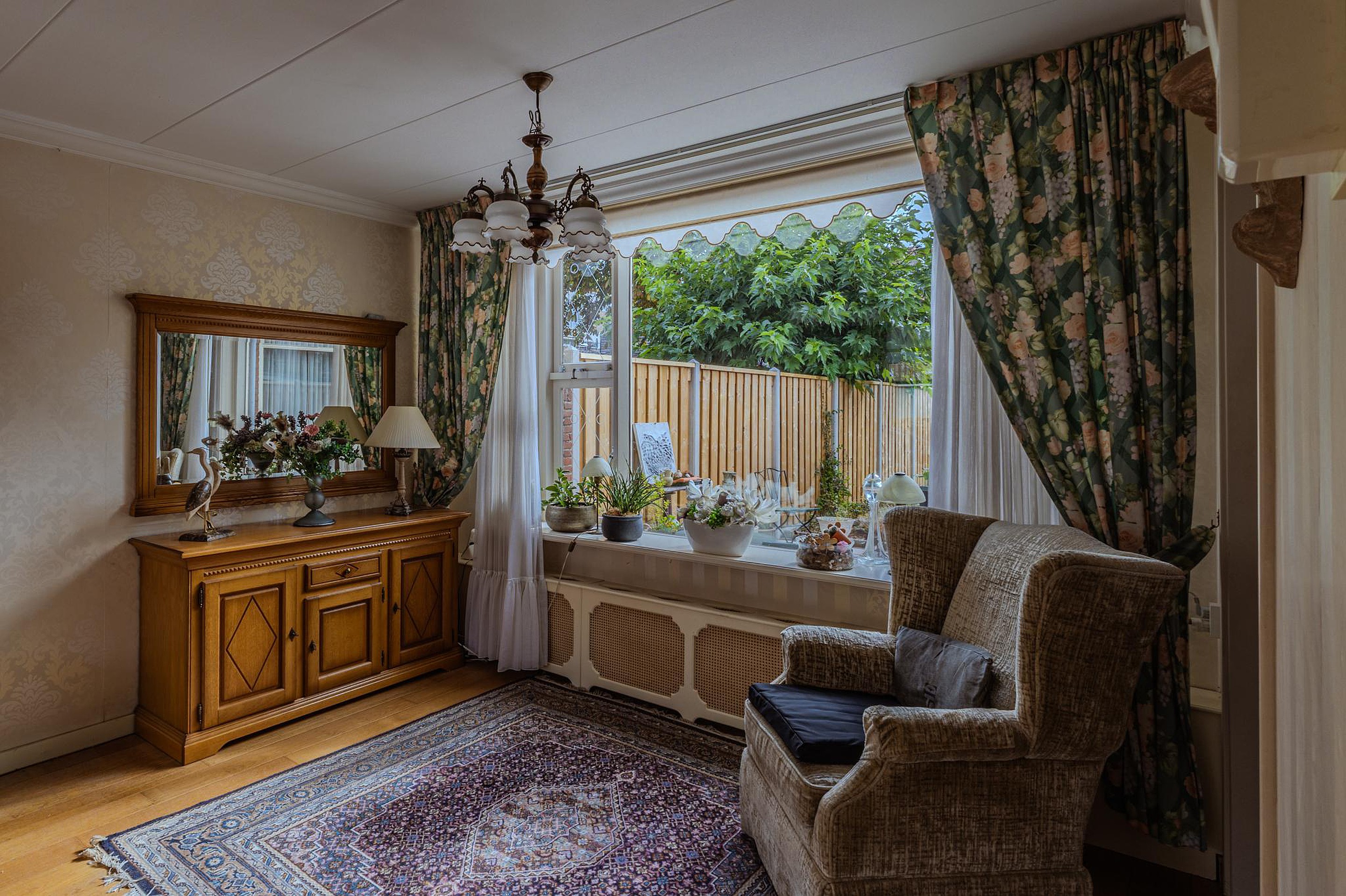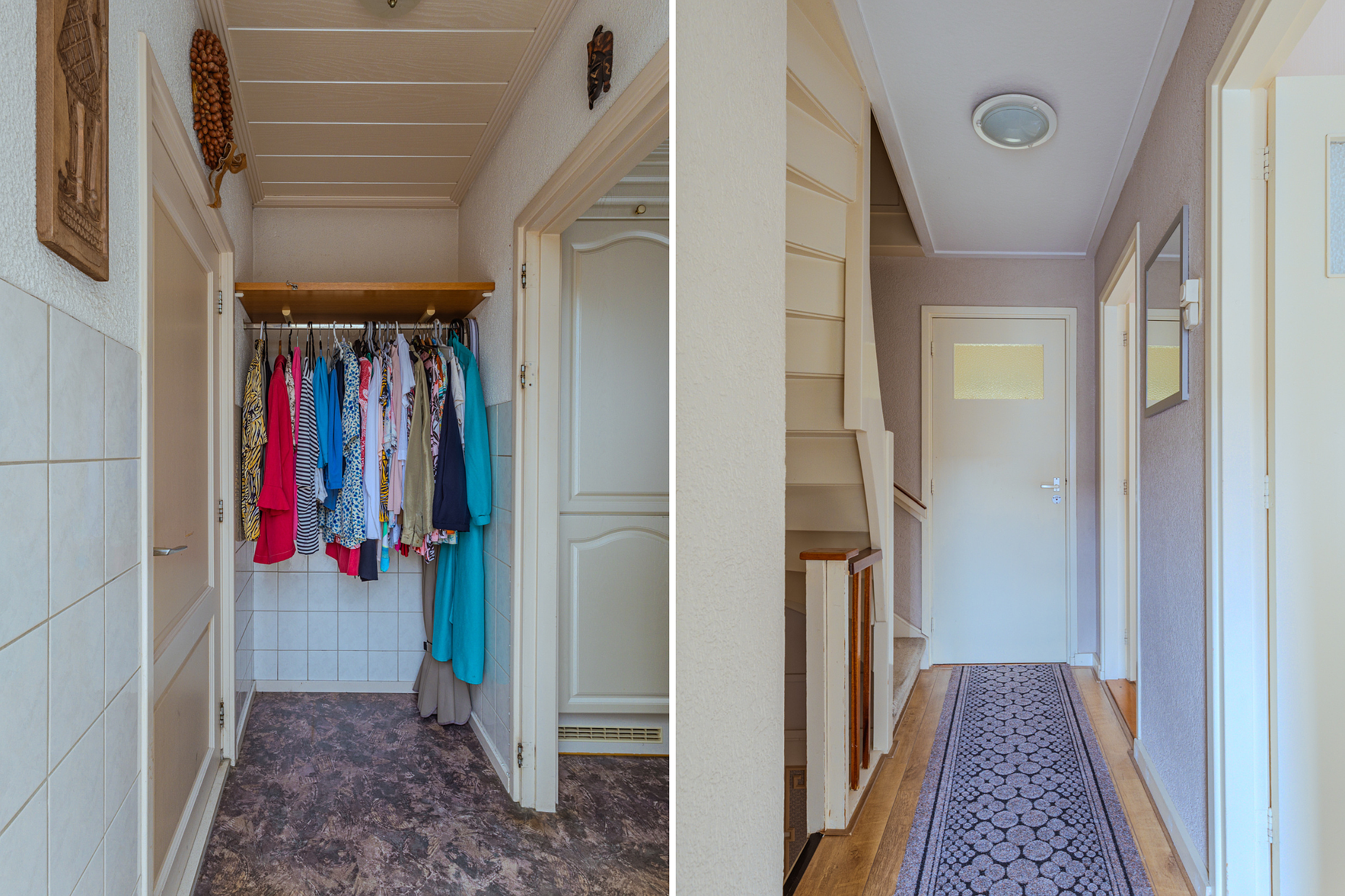 De entree vindt plaats in de hal, welke voorzien is van de trapopgang met nette toiletruimte voorzien van een staand toilet, de garderoberuimte en een praktische trap- / kelderkast. De doorzonwoonkamer heeft zowel aan de voor- als de achterzijde een grote raampartij met zonnescherm wat zorgt voor een prettige hoeveelheid lichtinval. De ruime halfopen keuken in L-opstelling is deels in de aanbouw gesitueerd en naast de vele opbergmogelijkheden voorzien van een gaskookplaat met schouw en een koel-/vriescombinatie. Het tussenportaal biedt een tweede garderoberuimte en geeft toegang tot de tuin en de bijkeuken. Deze royale bijkeuken is uitgerust met de witgoed-aansluitingen en biedt eveneens toegang tot de achtertuin.