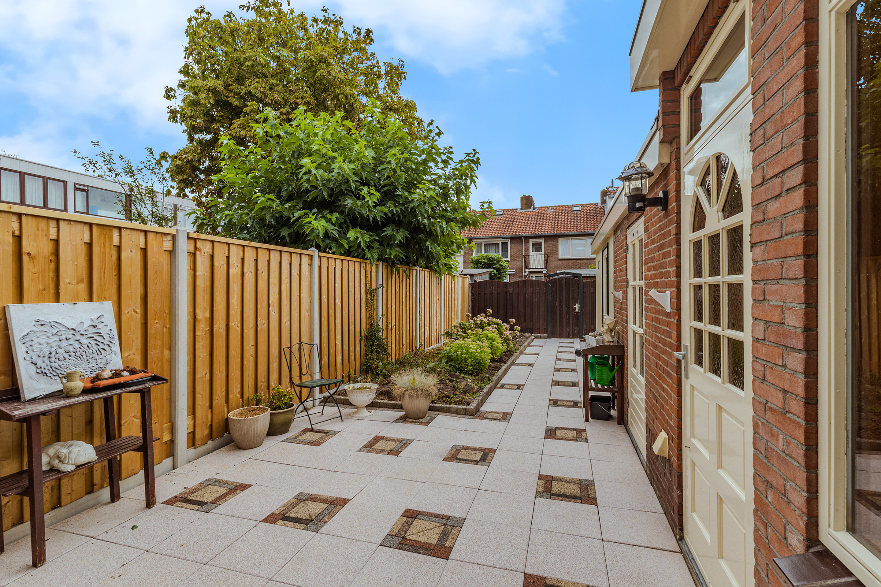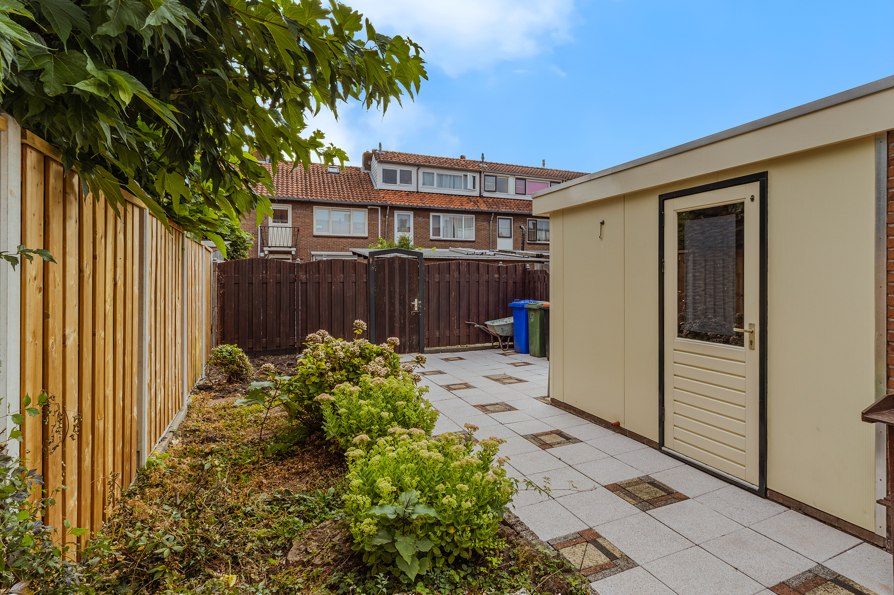 De ca. 15 meter diepe achtertuin is gelegen op het zuidoosten en is grotendeels voorzien van siertegels met een groot plantenborder tegen de schutting. De tuin is geheel omheind met een houten schutting met een achterom naar de achterliggende brandgang en een praktische aangebouwde berging van ca. 6 m2.