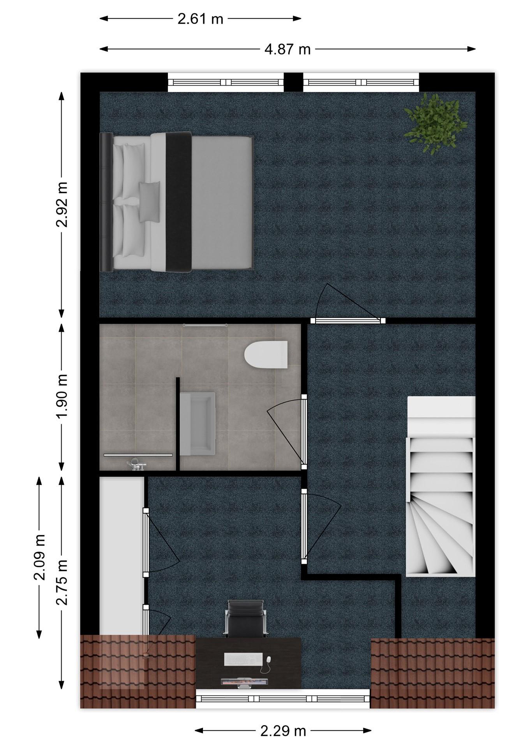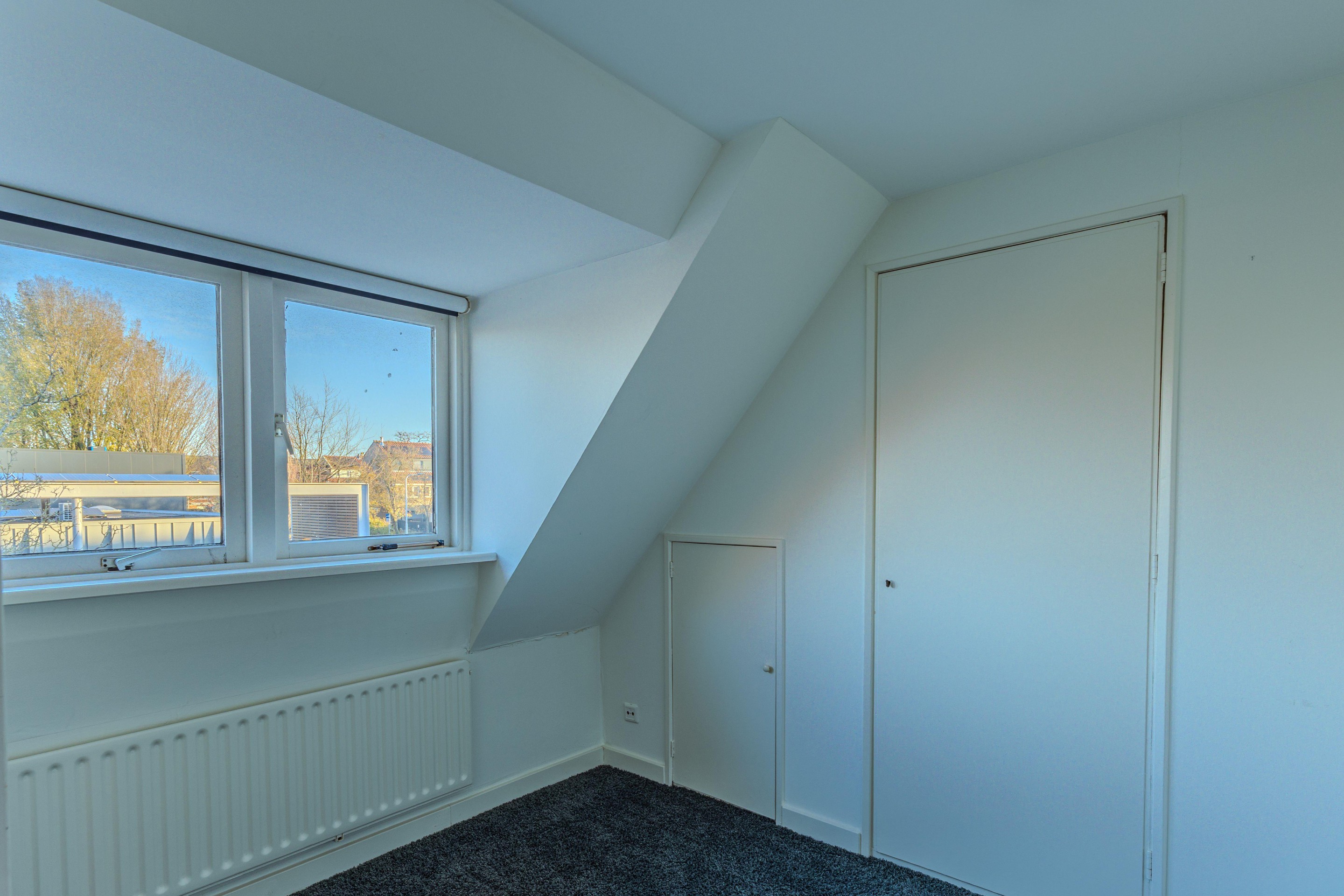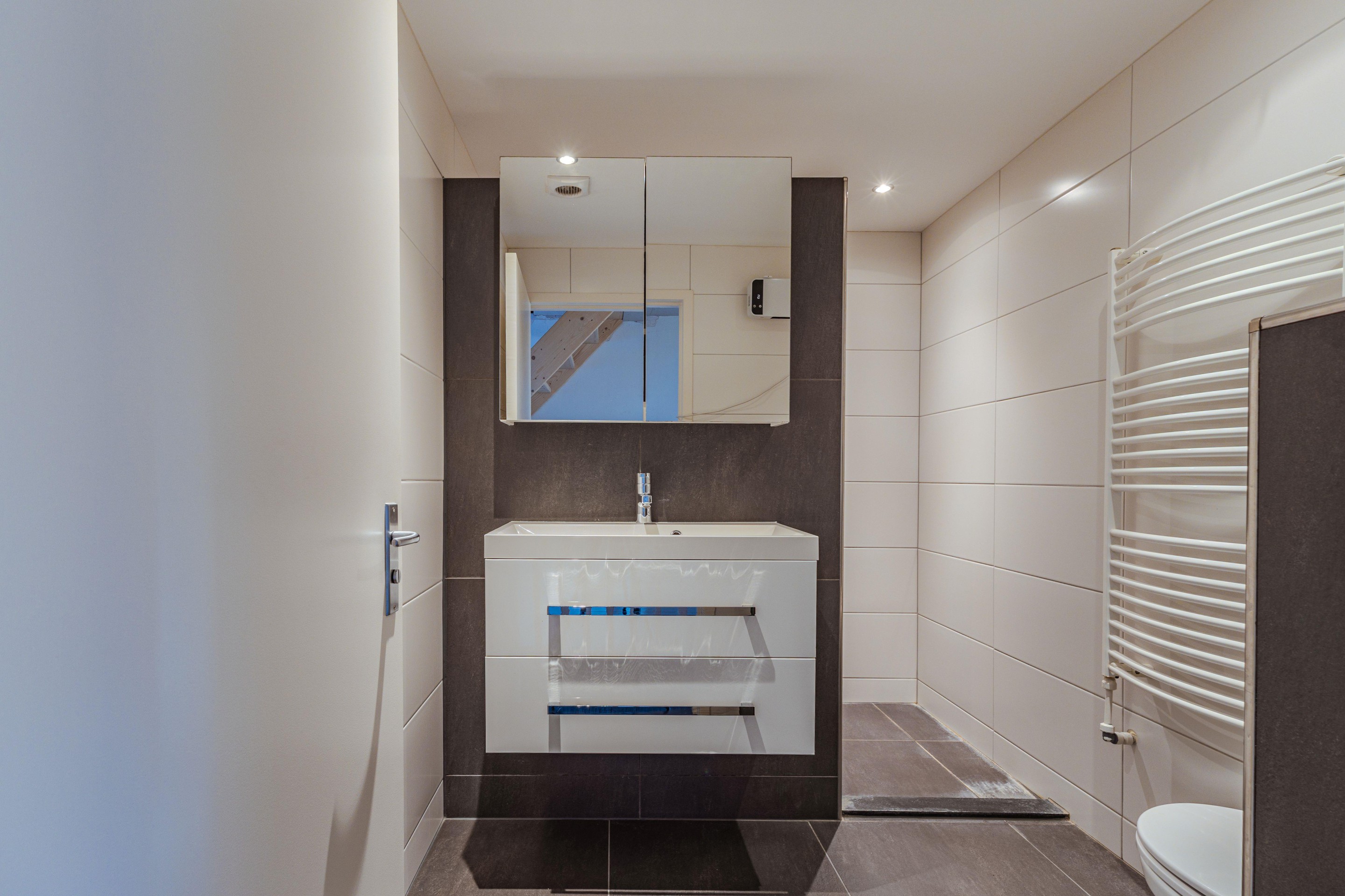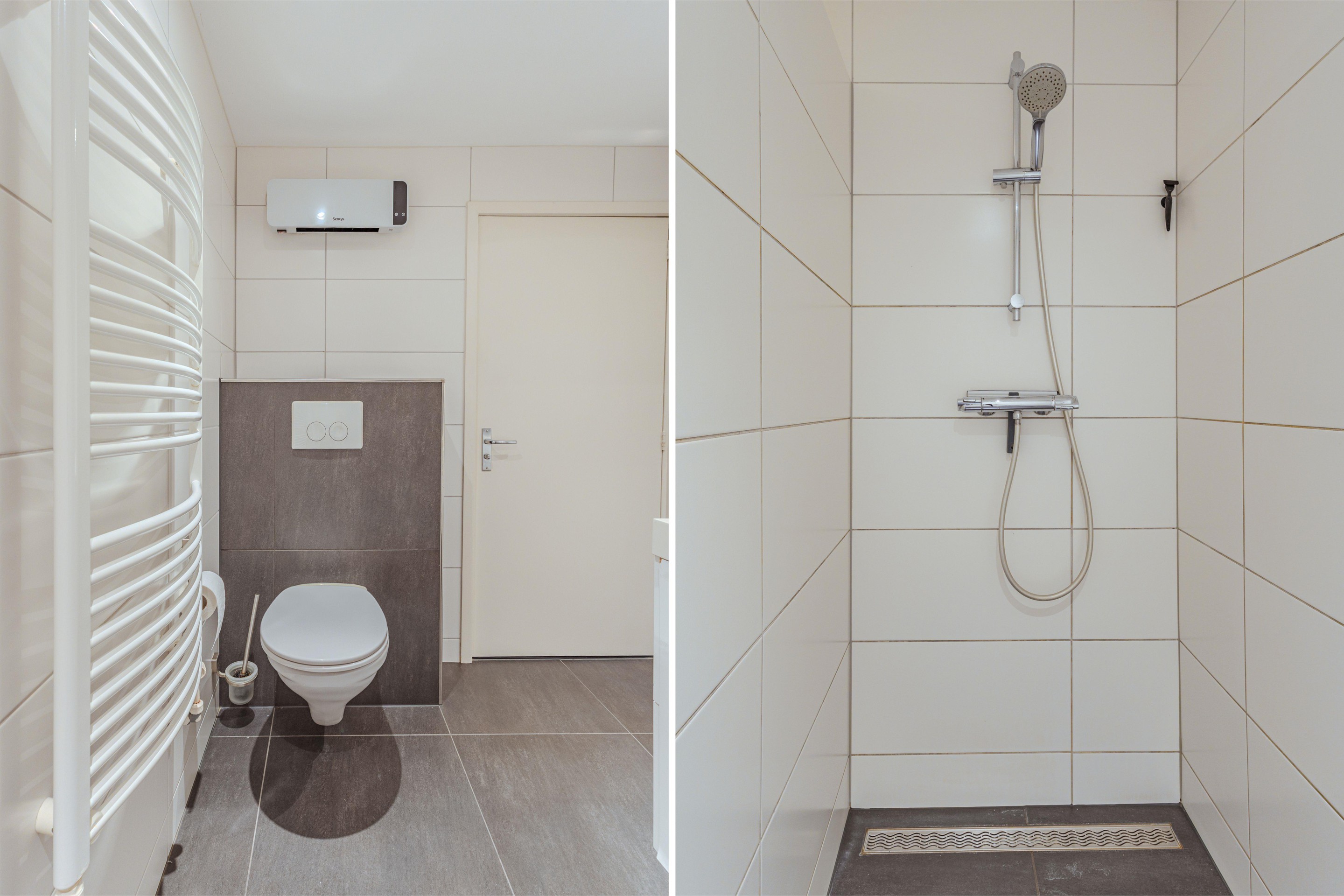 De overloop biedt toegang tot de twee slaapkamers, de badkamer en de trapopgang. De ruimste slaapkamer is dankzij de dakopbouw royaal van formaat. De raampartij is voorzien van een rolluik en de kamer beschikt bovendien over airconditioning. De tweede slaapkamer met dakkapel is gelegen aan de straatzijde en beschikt daarnaast over vaste kastruimte. De geheel betegelde badkamer is uitgerust met een 2de toilet, een wastafelmeubel, designradiator en een inloopdouche.