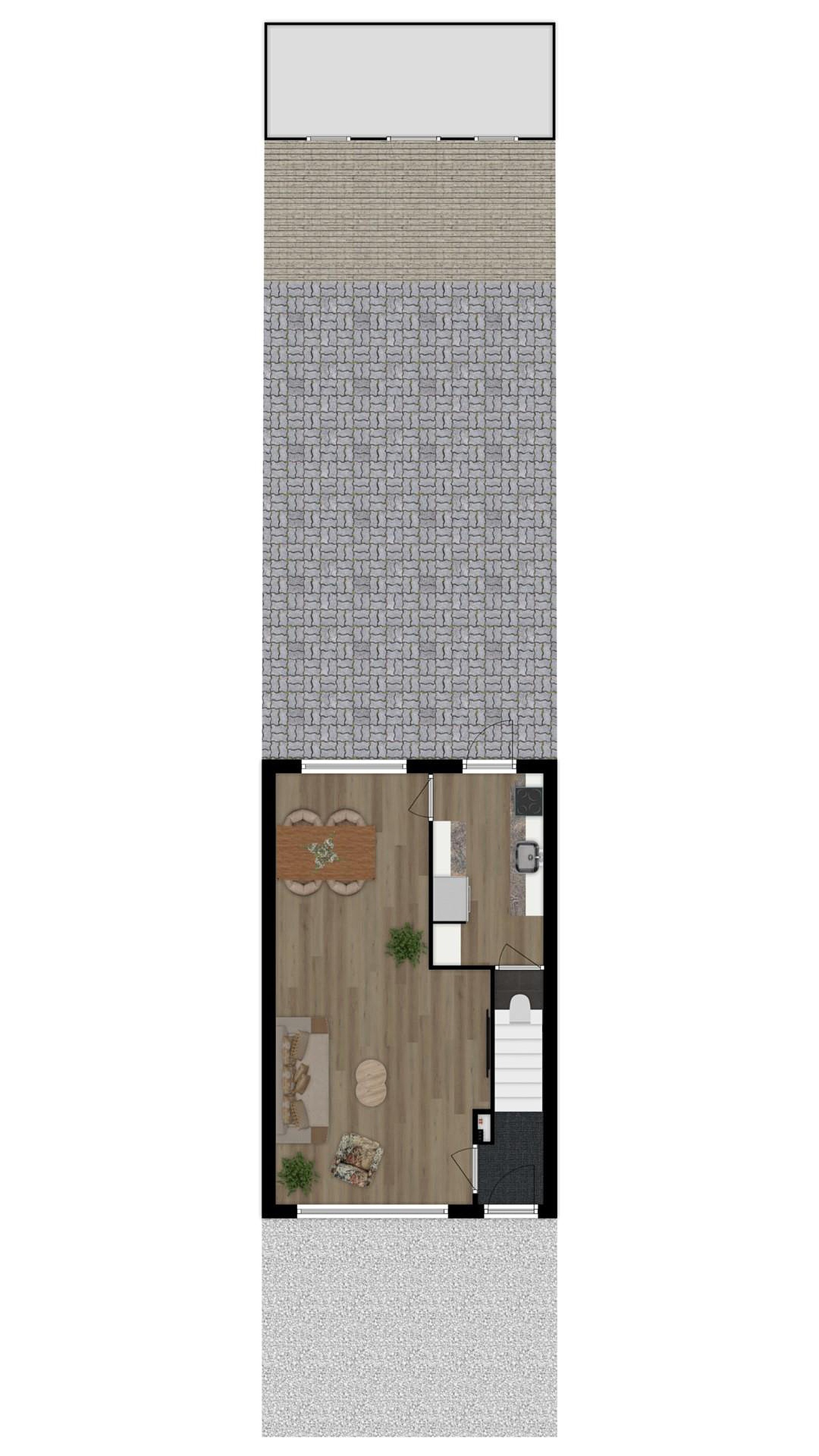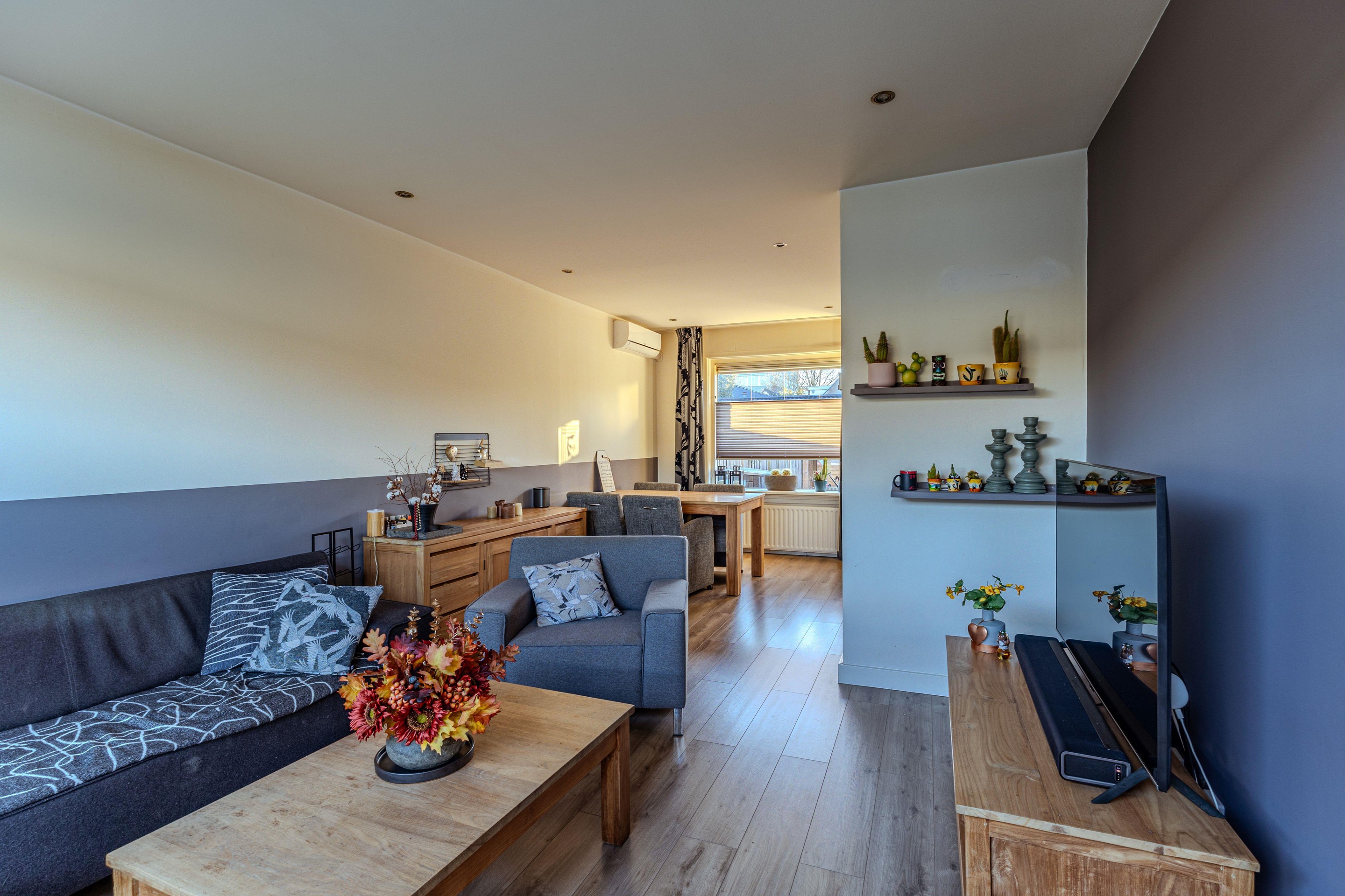 Entree in de hal met de meterkast, garderoberuimte en de trapopgang. De L-vormige doorzonwoonkamer is in 2020 voorzien van airconditioning, waardoor een prettig binnenklimaat altijd gewaarborgd is. De woonkamer is ingedeeld met een zitgedeelte aan de voorzijde waar de raampartij beschikt over een rolluik en een eetgedeelte aan de achterzijde, van waaruit tevens de toegang tot de keuken is. Deze is uitgerust met een combi-oven/magnetron, een vaatwasser, een inductiekookplaat en diverse berglades en kasten. Vanuit de keuken is de achtertuin bereikbaar, waarbij de deur naar de tuin is voorzien van een rolluik. Ook de nette en volledig betegelde toiletruimte is vanuit de keuken bereikbaar en is voorzien van een zwevend toilet.