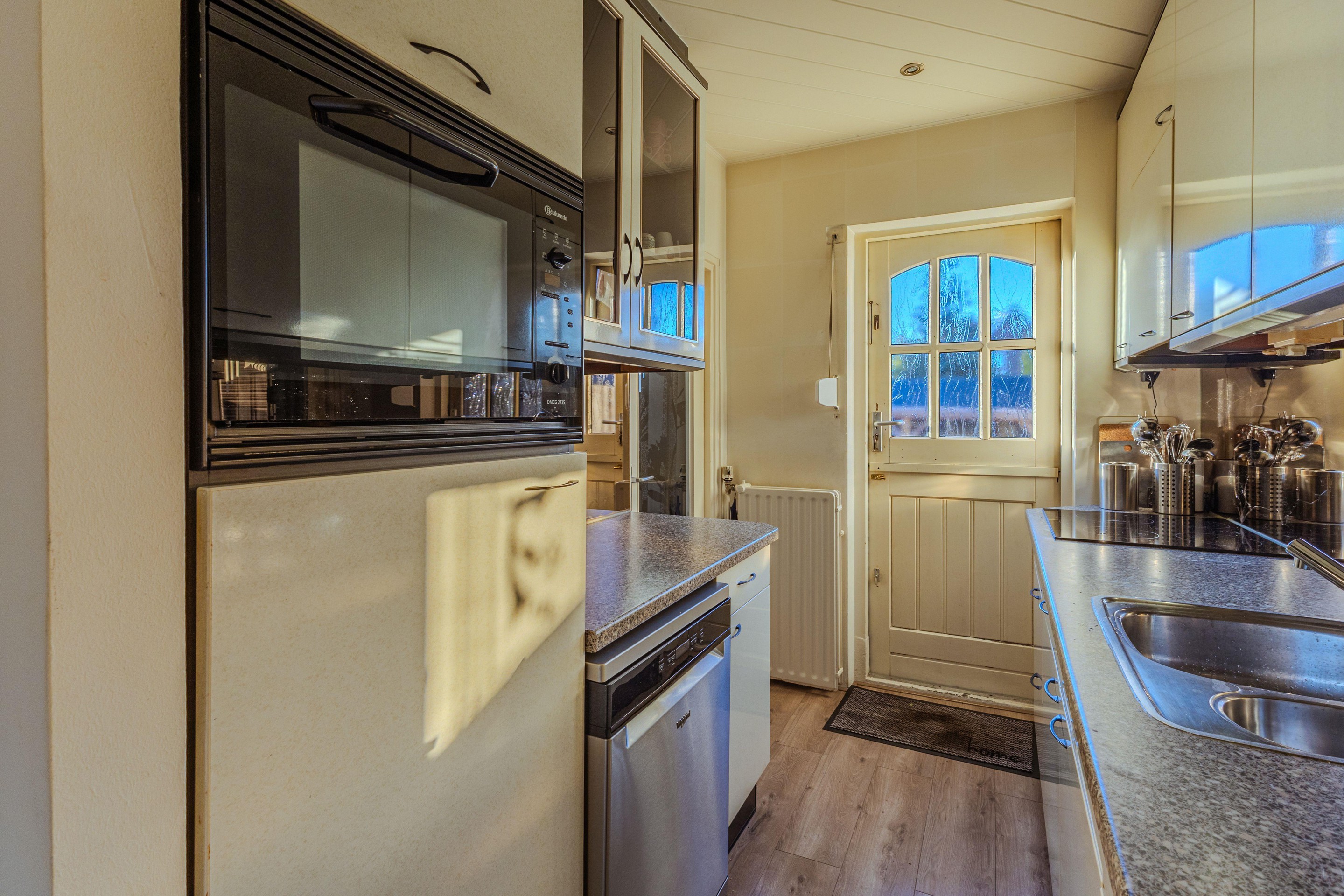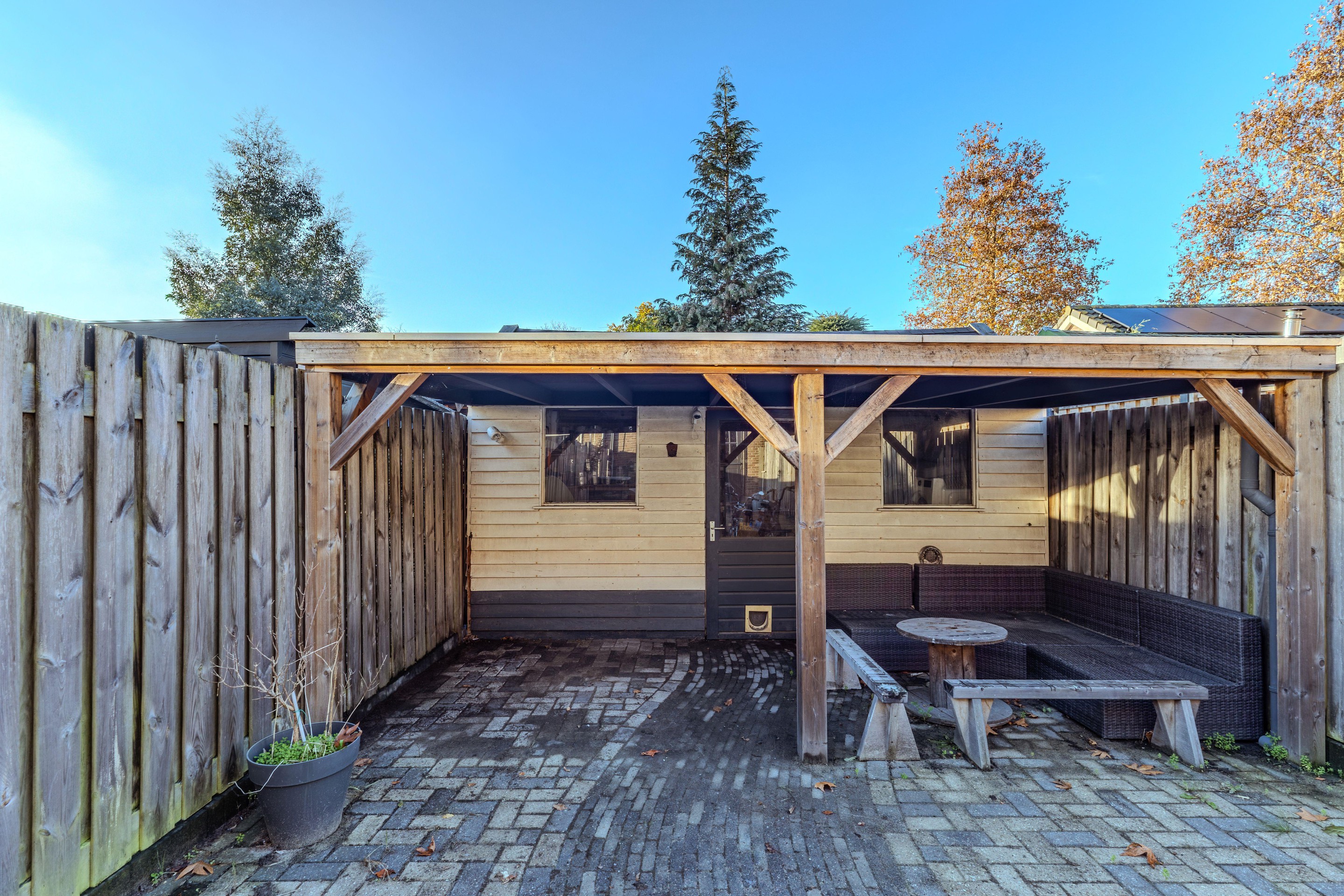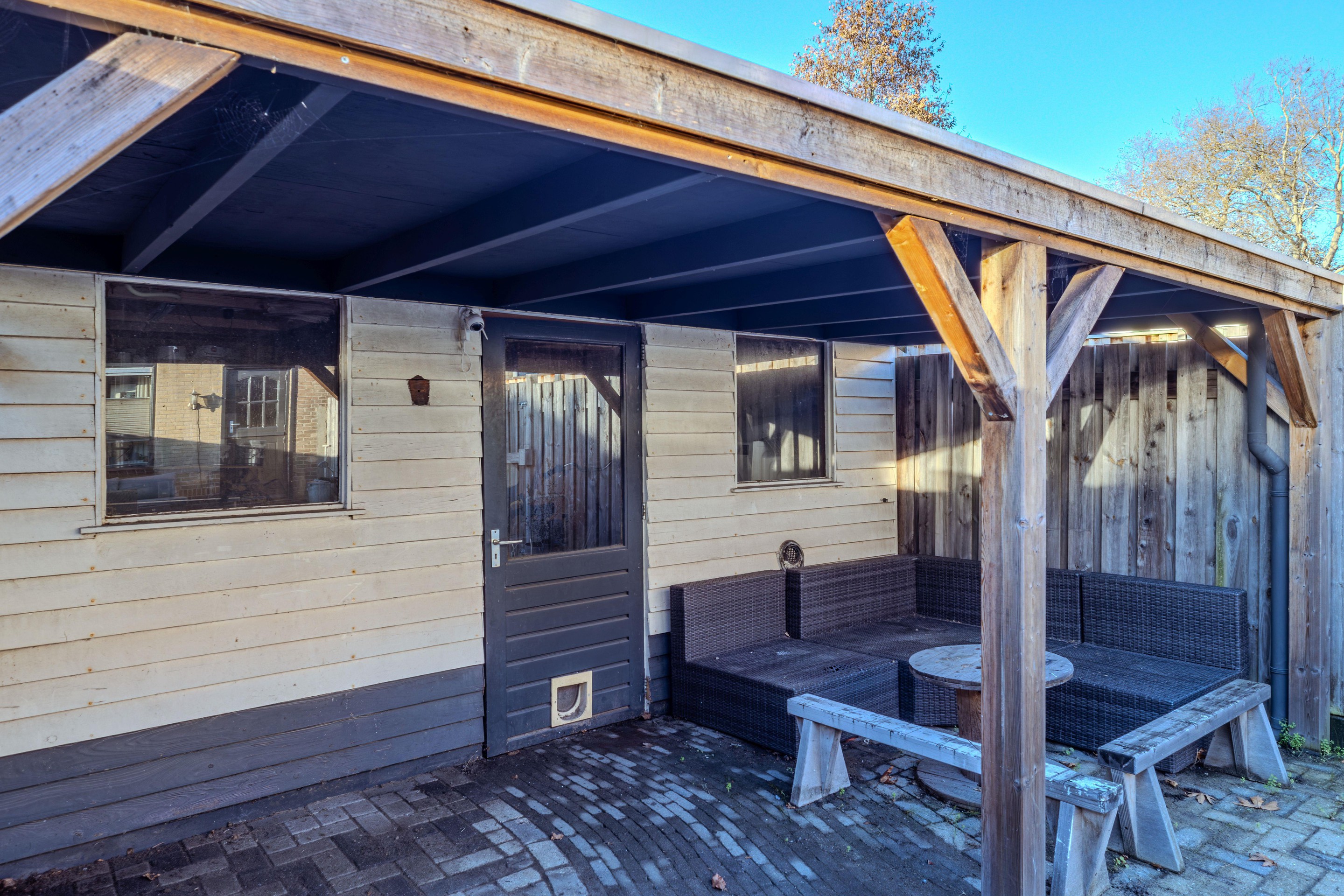 Buiten kun je optimaal genieten van een zonnige tuin op het westen. Achterin de tuin staat een riante berging met daaraan vast de in 2022 geplaatste overkapping—een ideale plek om in de zomer beschut te zitten en volop van je buitenruimte te genieten.