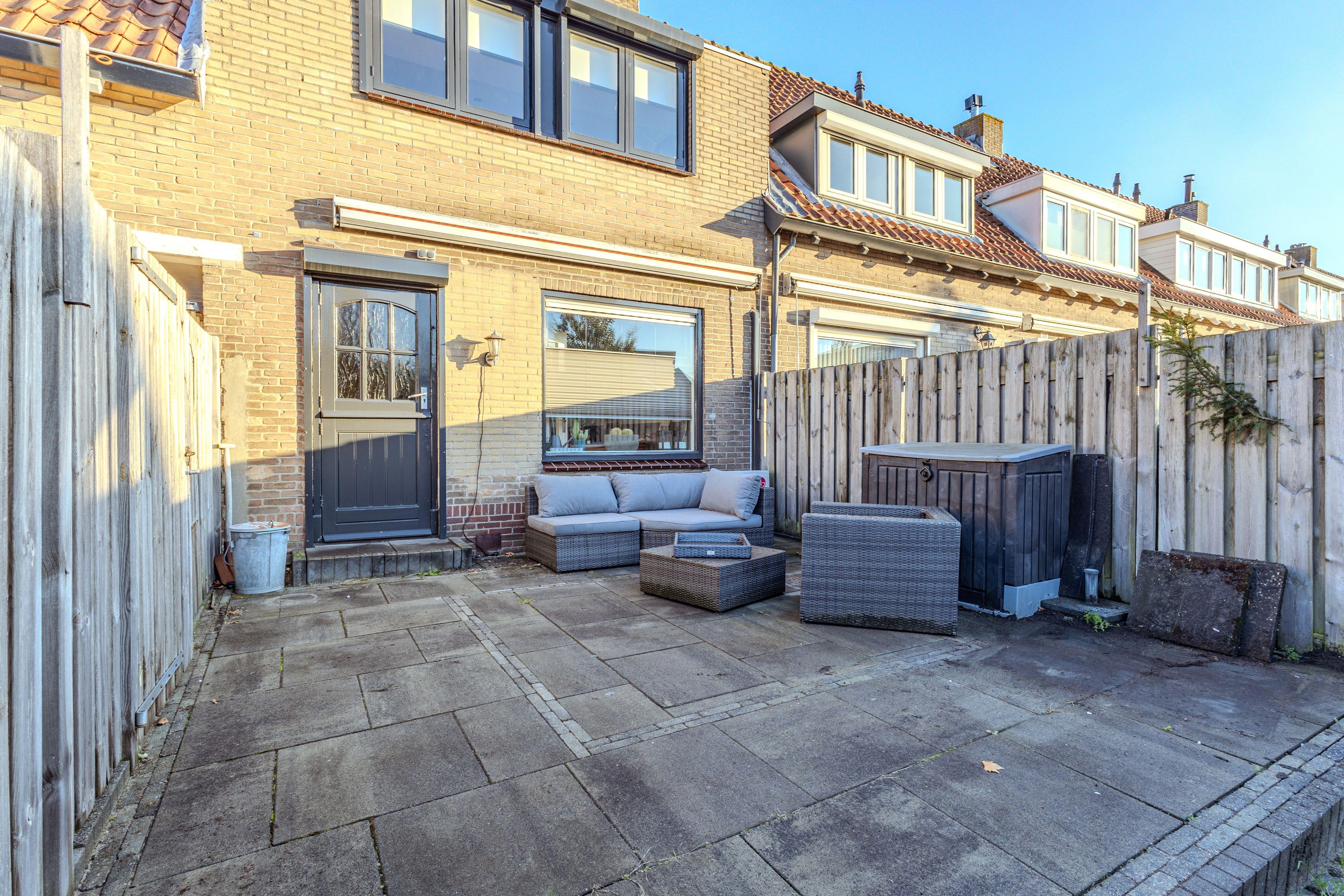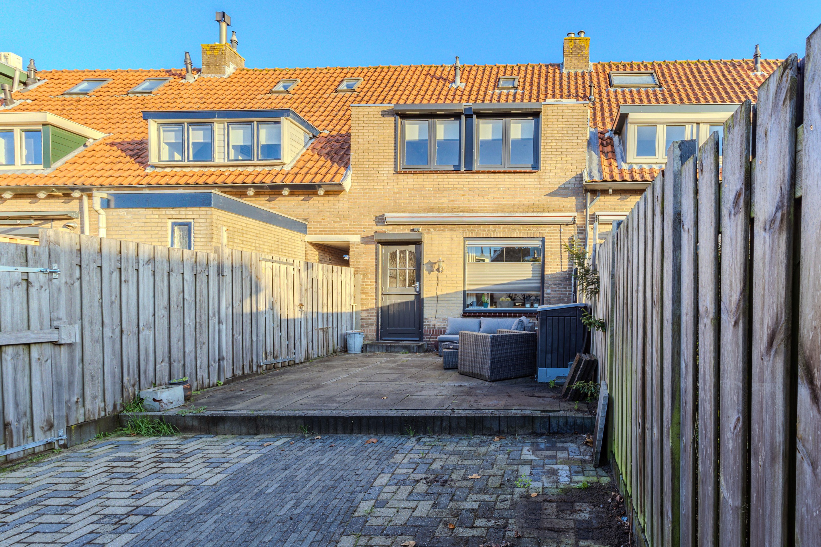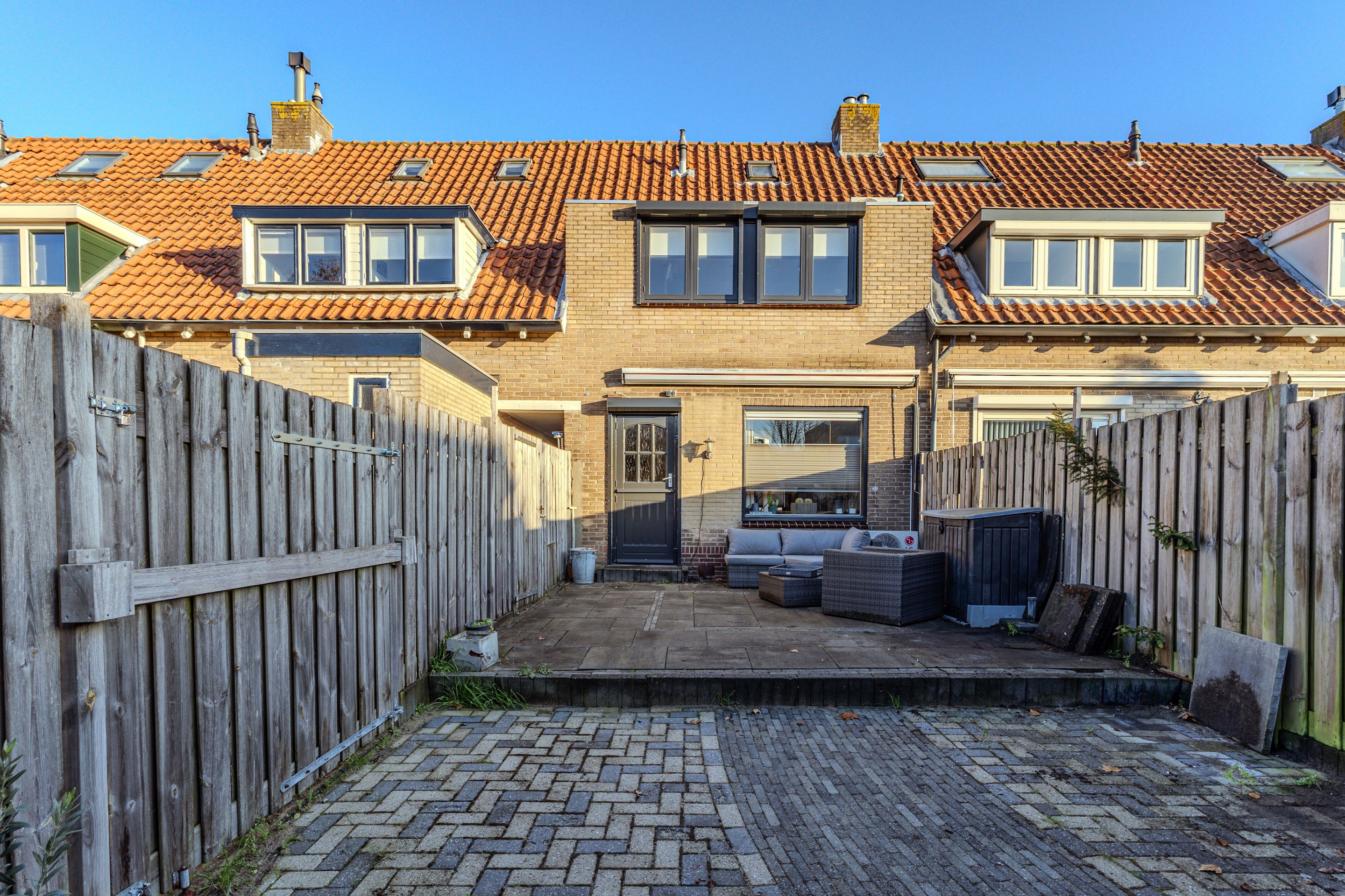 De heerlijk zonnige, op het westen gelegen achtertuin is ca. 13 meter diep en geheel voorzien van siertegels en -bestrating. Direct aan de achtergevel bevindt zich een zonnescherm en is er ruimte gecreëerd voor een comfortabele zithoek. De schutting aan de noordzijde is voorzien van twee poorten: een looppoort en een bredere poort, waardoor je bijvoorbeeld een motor eenvoudig in de tuin kunt plaatsen.