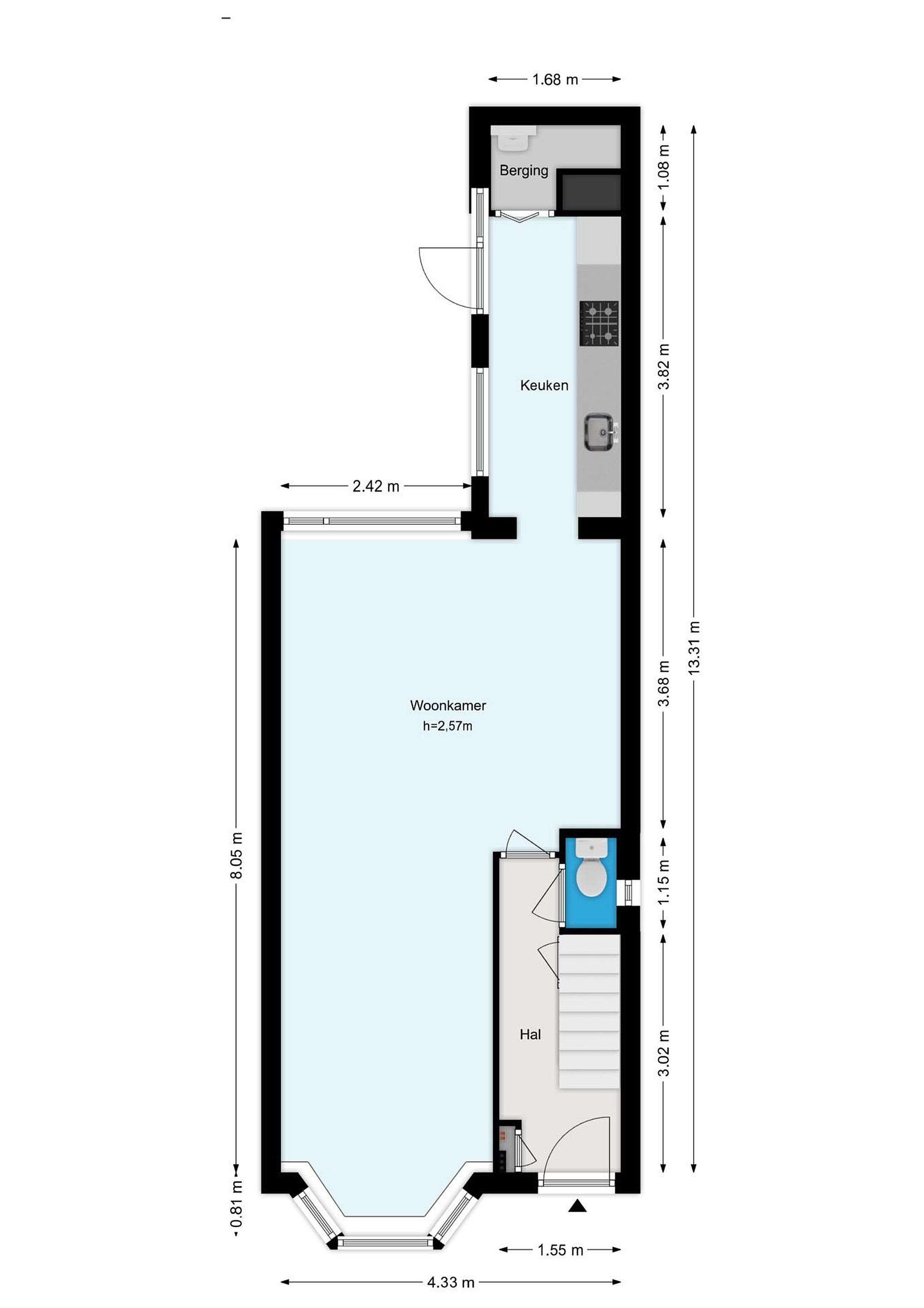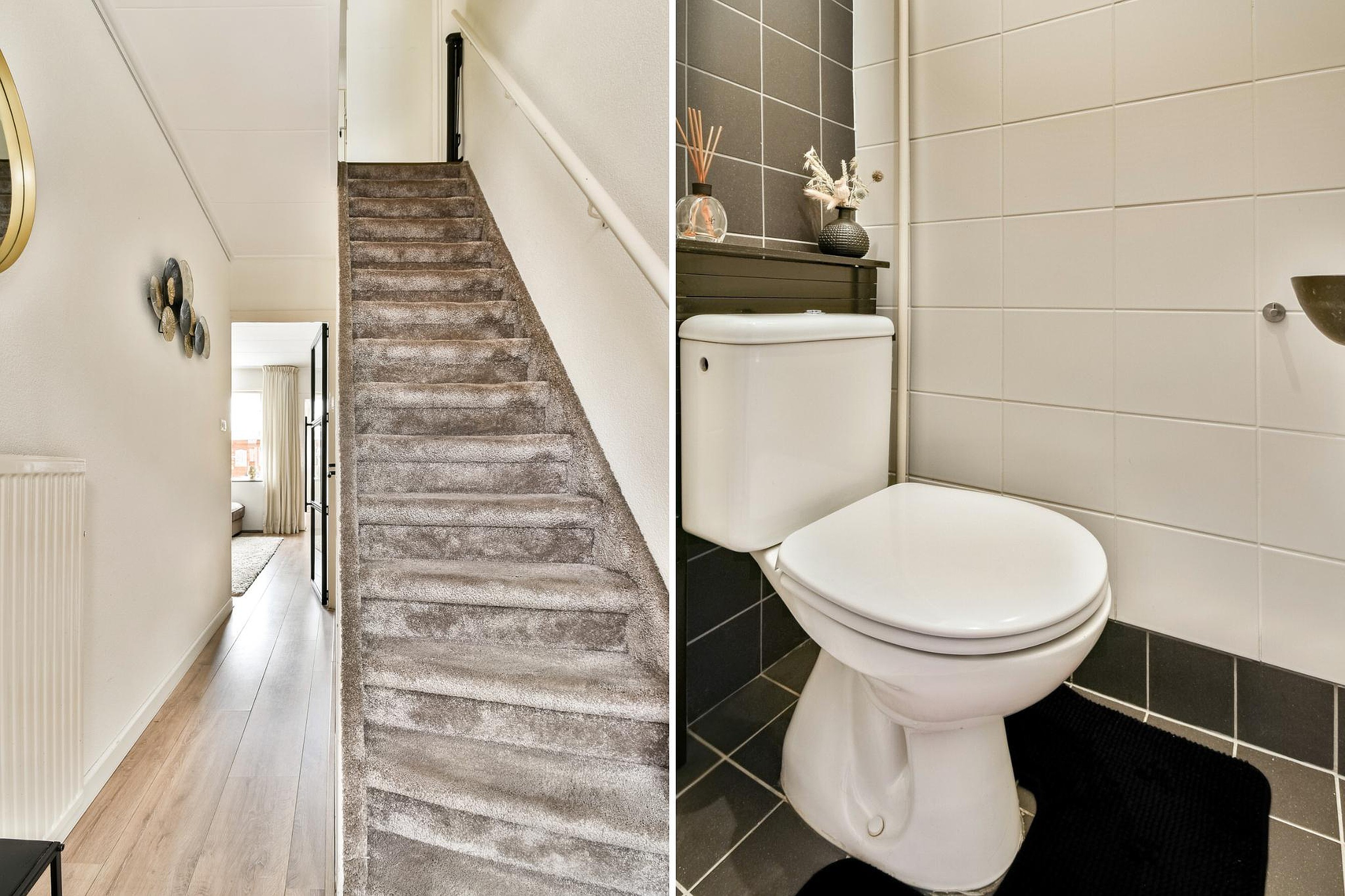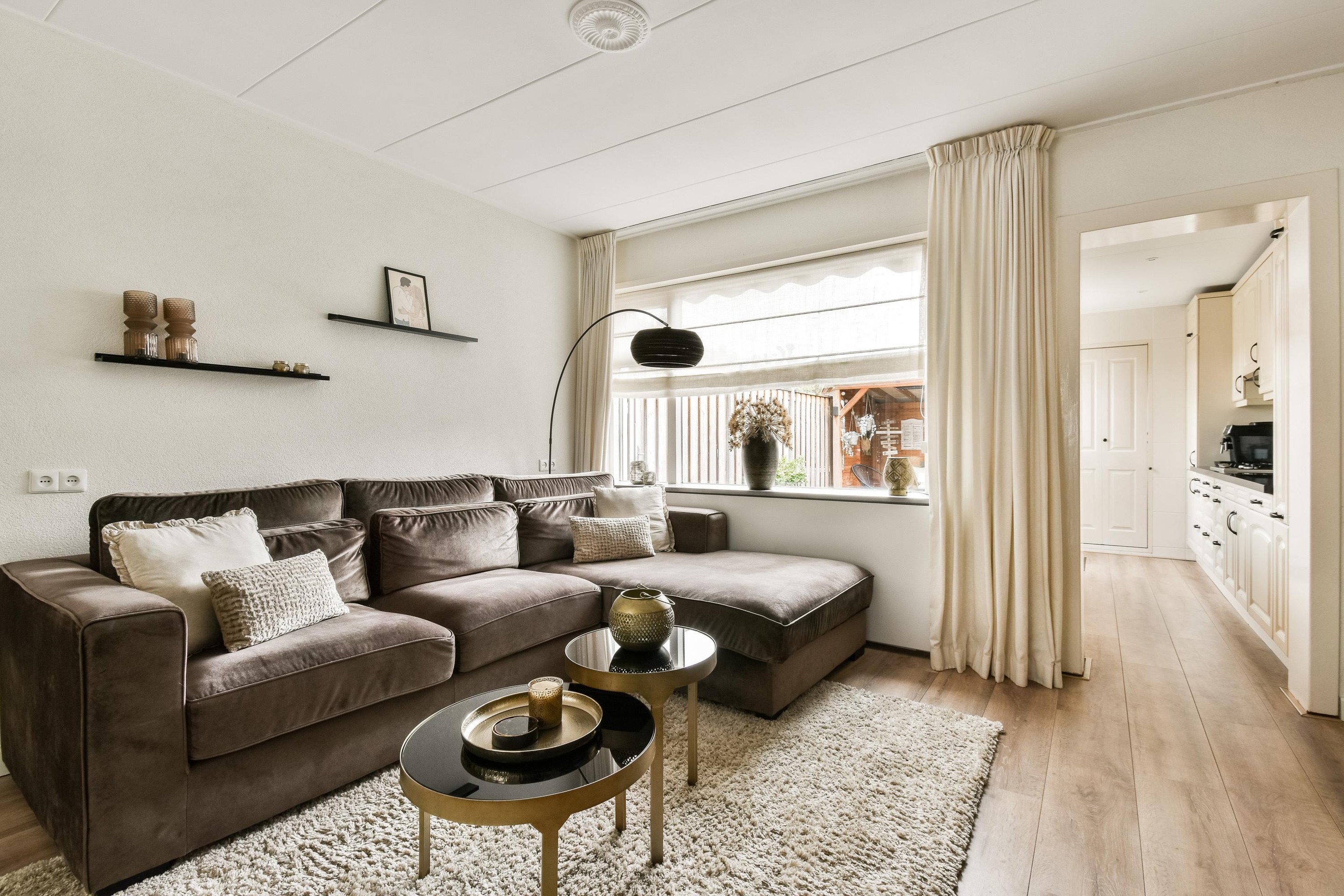 Via de nette entree met meterkast en garderobe kom je in de hal, met een volledig betegelde toiletruimte en een praktische kelder van ca. 4,60 m2 op stahoogte – ideaal voor opslag en proviand. Het hart van de woning is de sfeervolle L-vormige woonkamer. Een prachtige industriële stalen paneeldeur geeft toegang tot deze lichte ruimte met de karakteristieke erker aan de voorzijde, perfect als eetgedeelte. Aan de tuinzijde ligt het gezellige zitgedeelte met open verbinding naar de keuken. De gehele begane grond is voorzien van een hoogwaardige, doorgelegde laminaatvloer in warme houtnerf. De keuken in de aanbouw is functioneel uitgerust met gaskookplaat, koel-vriescombinatie en vaatwasser en biedt directe toegang tot de zonnige achtertuin en een handige berging.