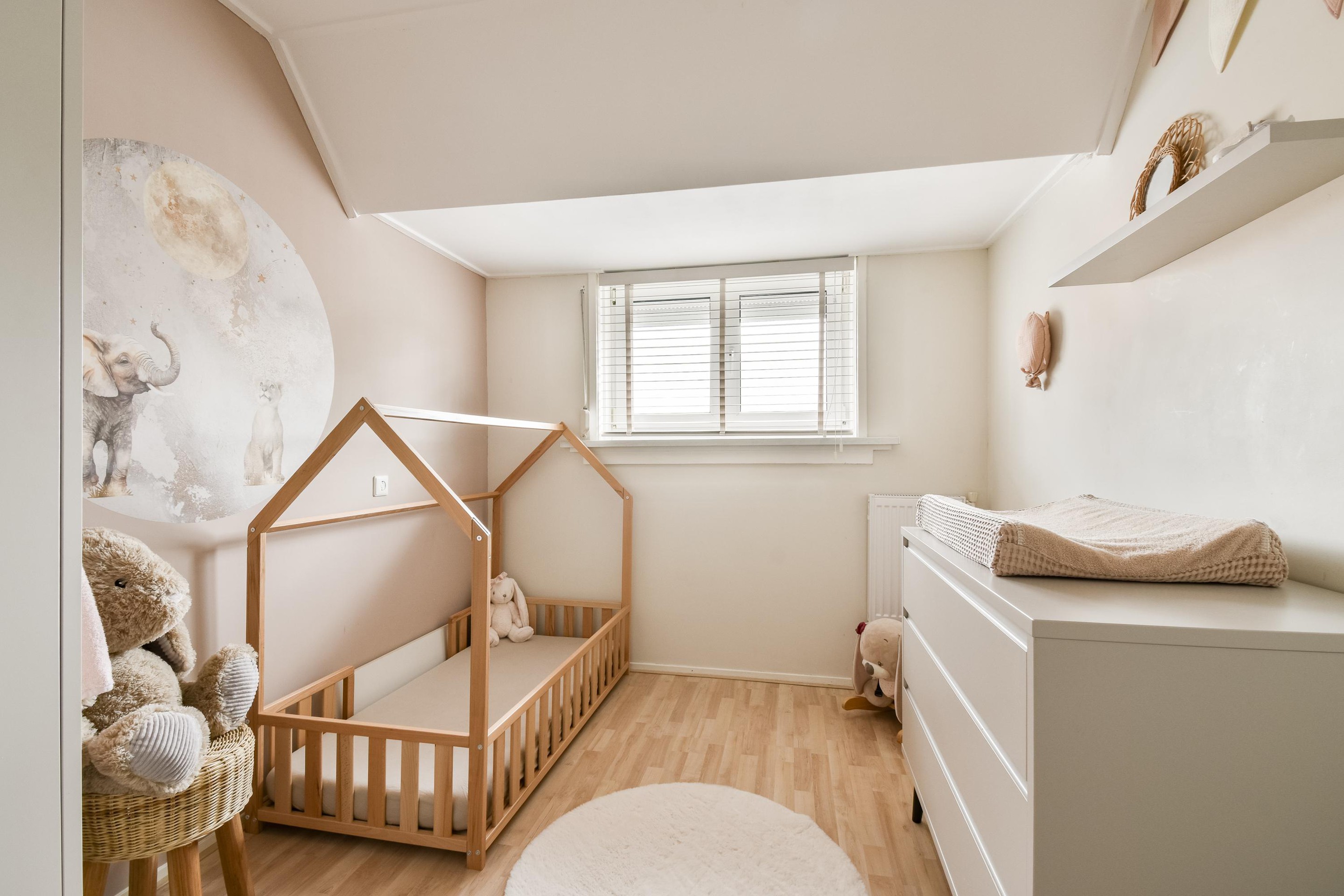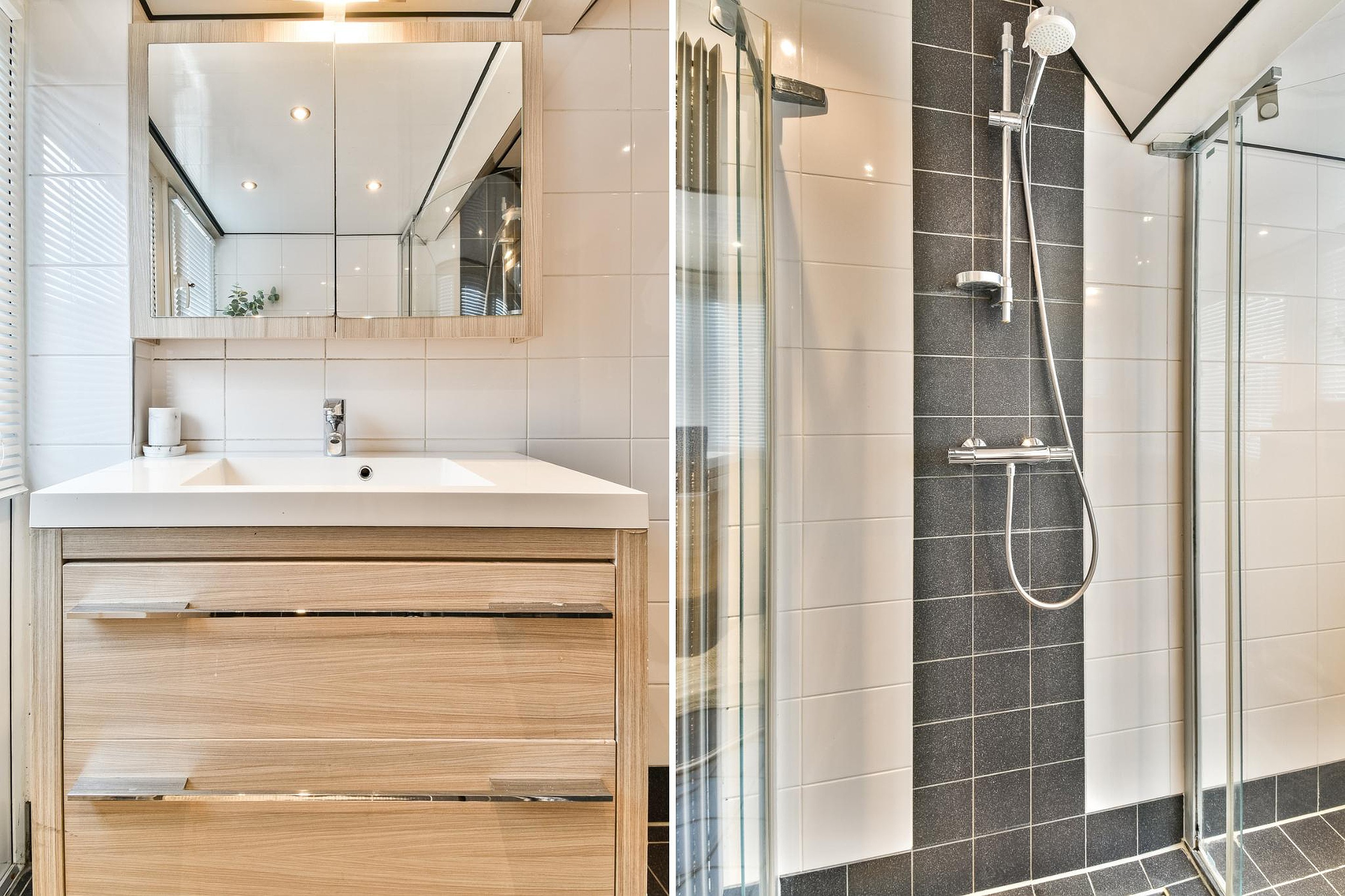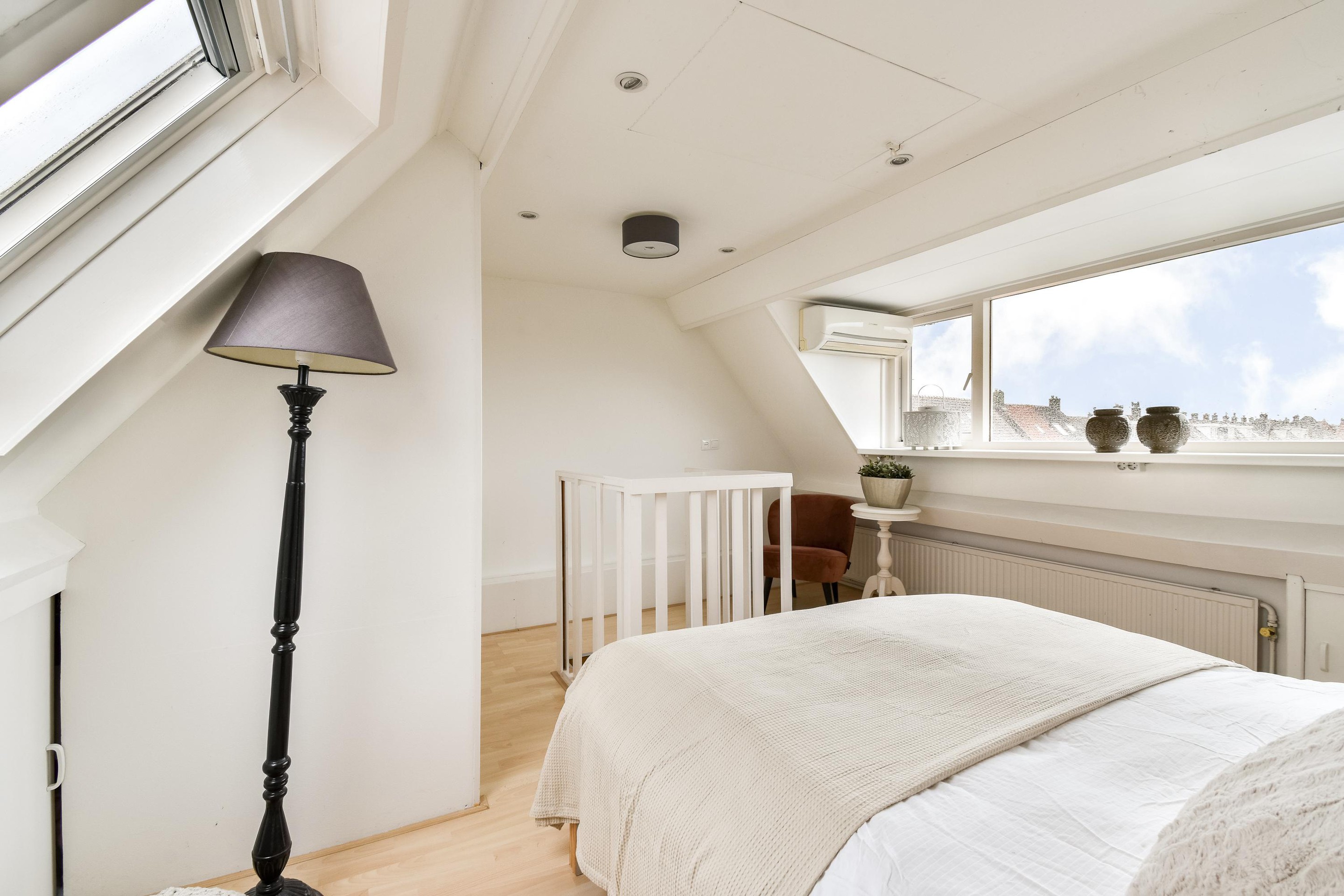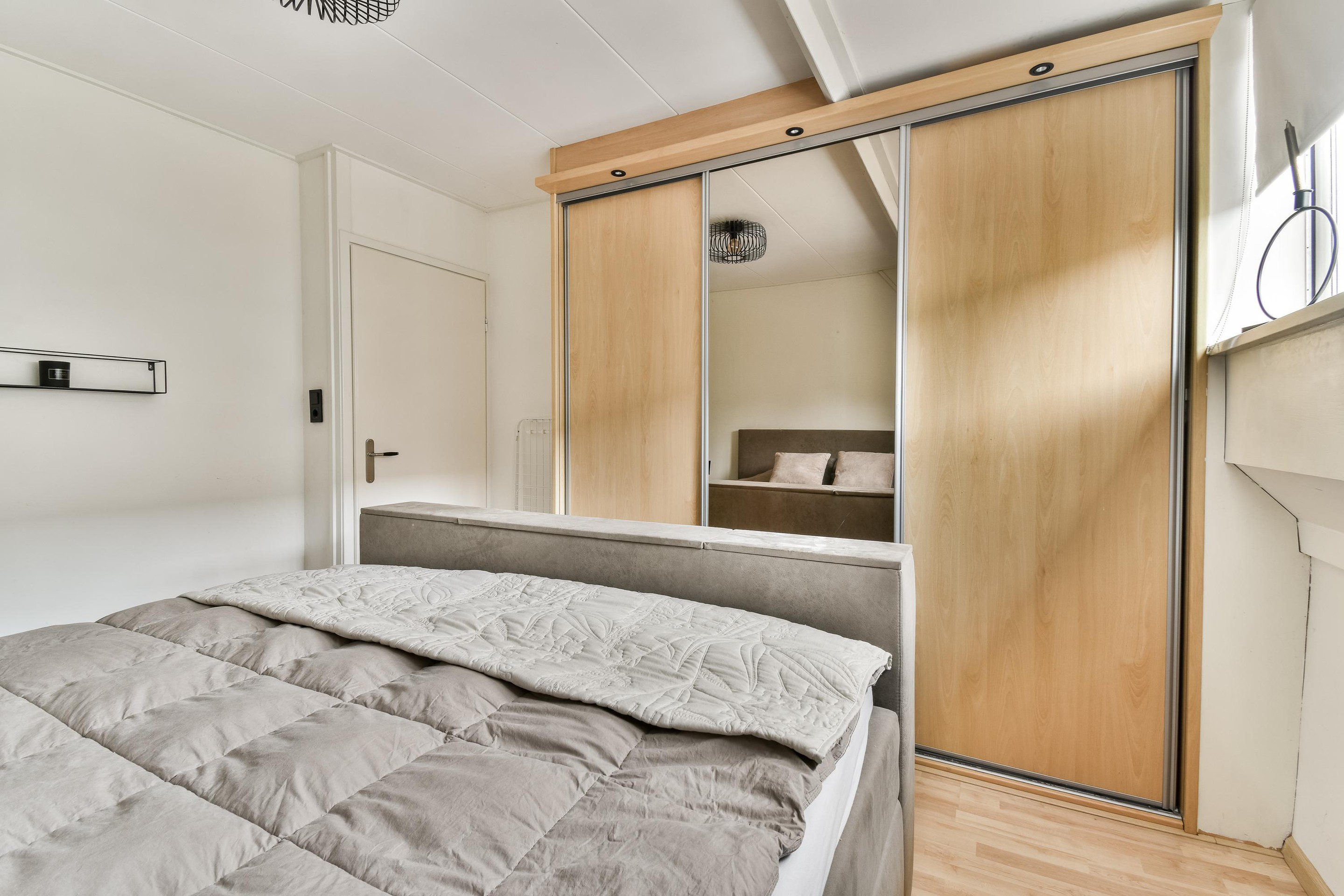 De ruime overloop biedt directe toegang tot twee slaapkamers, de badkamer, een vaste kast met witgoedaansluitingen en de trap naar de zolderetage. De slaapkamer aan de straatzijde is vergroot met een dakkapel, voorzien van airconditioning en een ruime vaste schuifdeurkast. De slaapkamer aan de tuinzijde heeft eveneens een dakkapel, kunststof kozijnen met rolluiken en handige kastruimte onder de trap. De complete badkamer is modern en netjes afgewerkt met een ruime inloopdouche, wastafelmeubel en zwevend toilet. Een groot pluspunt is de directe toegang tot het platte dak boven de aanbouw – ideaal om eenvoudig een fraai dakterras te realiseren.