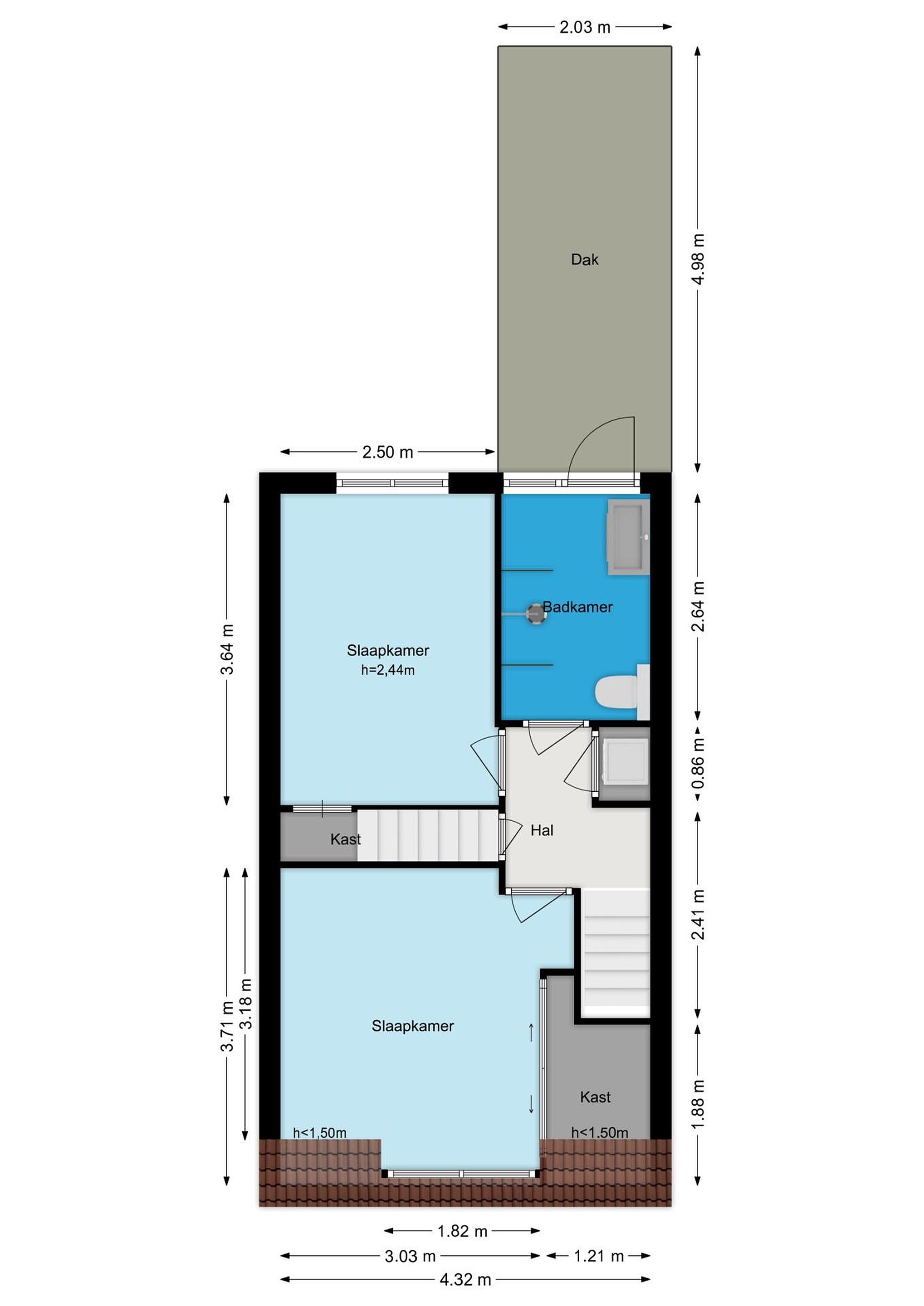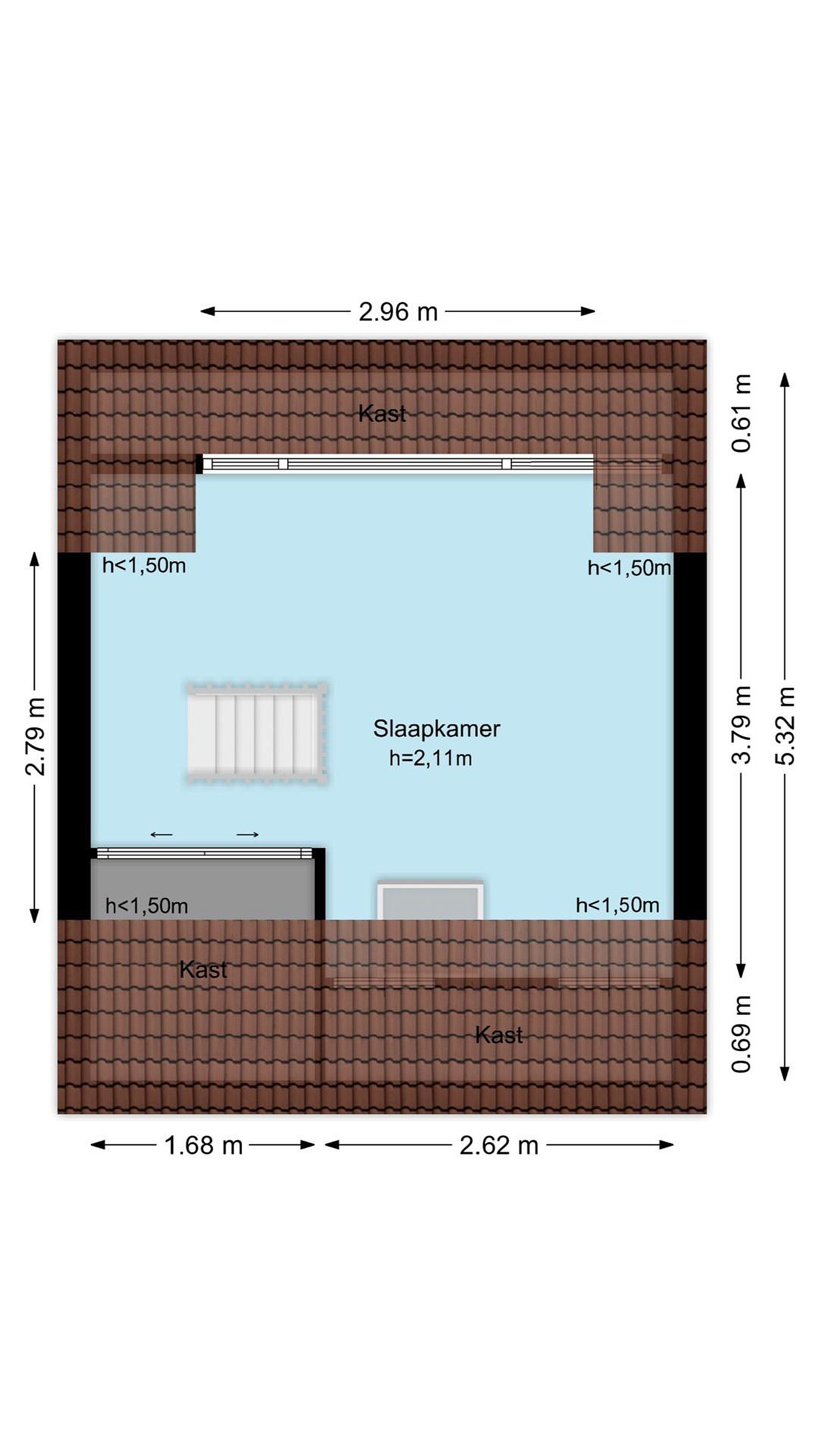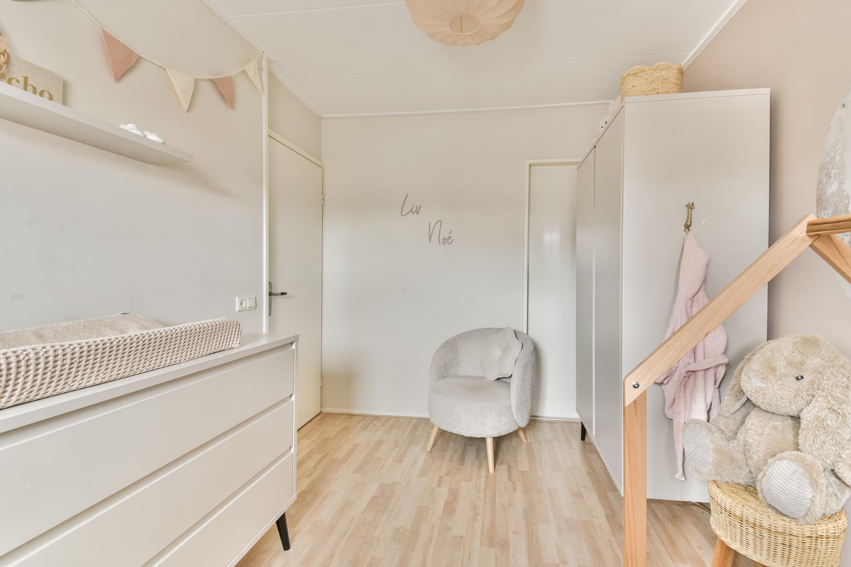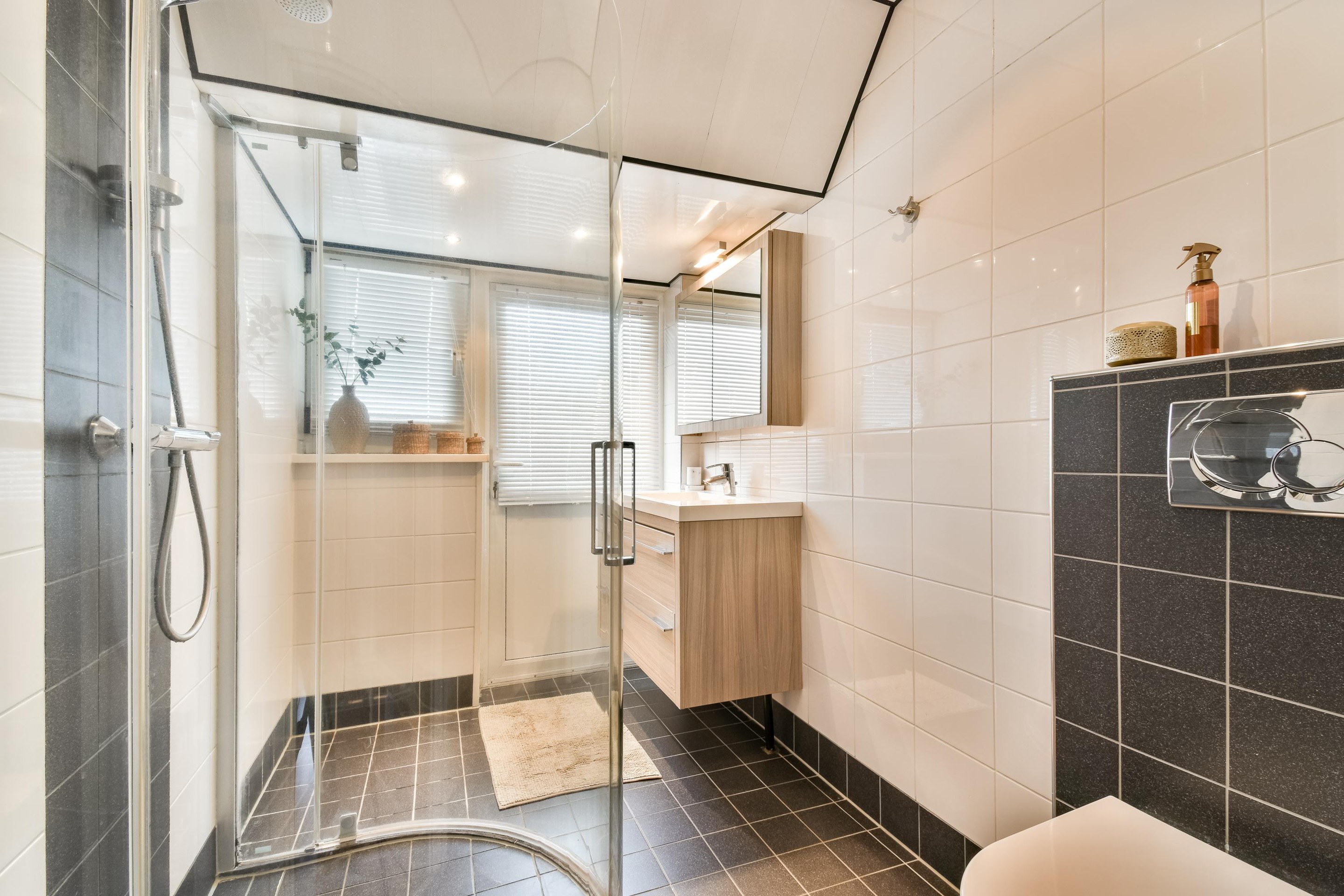 De ruime overloop biedt directe toegang tot twee slaapkamers, de badkamer, een vaste kast met witgoedaansluitingen en de trap naar de zolderetage. De slaapkamer aan de straatzijde is vergroot met een dakkapel, voorzien van airconditioning en een ruime vaste schuifdeurkast. De slaapkamer aan de tuinzijde heeft eveneens een dakkapel, kunststof kozijnen met rolluiken en handige kastruimte onder de trap. De complete badkamer is modern en netjes afgewerkt met een ruime inloopdouche, wastafelmeubel en zwevend toilet. Een groot pluspunt is de directe toegang tot het platte dak boven de aanbouw – ideaal om eenvoudig een fraai dakterras te realiseren.