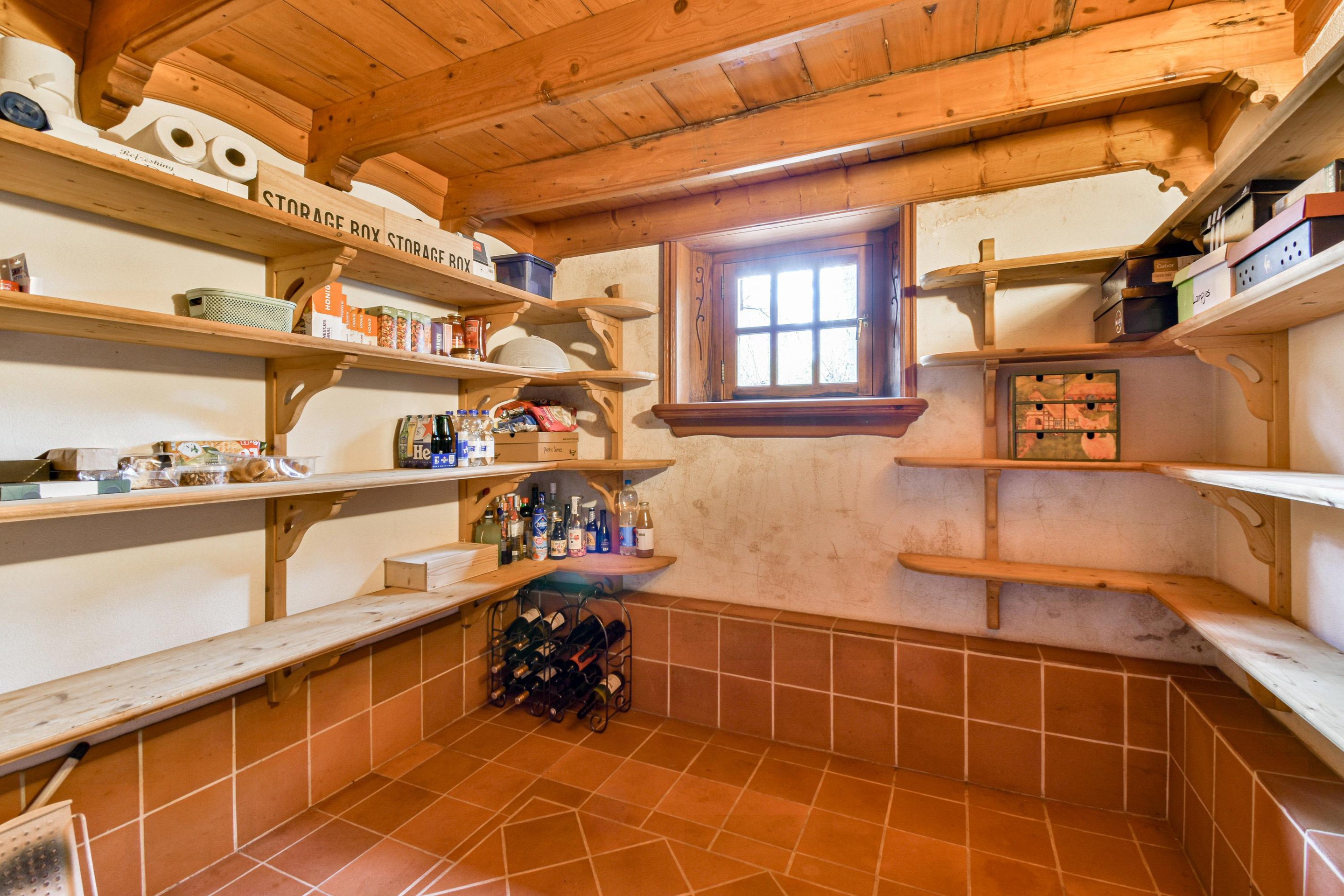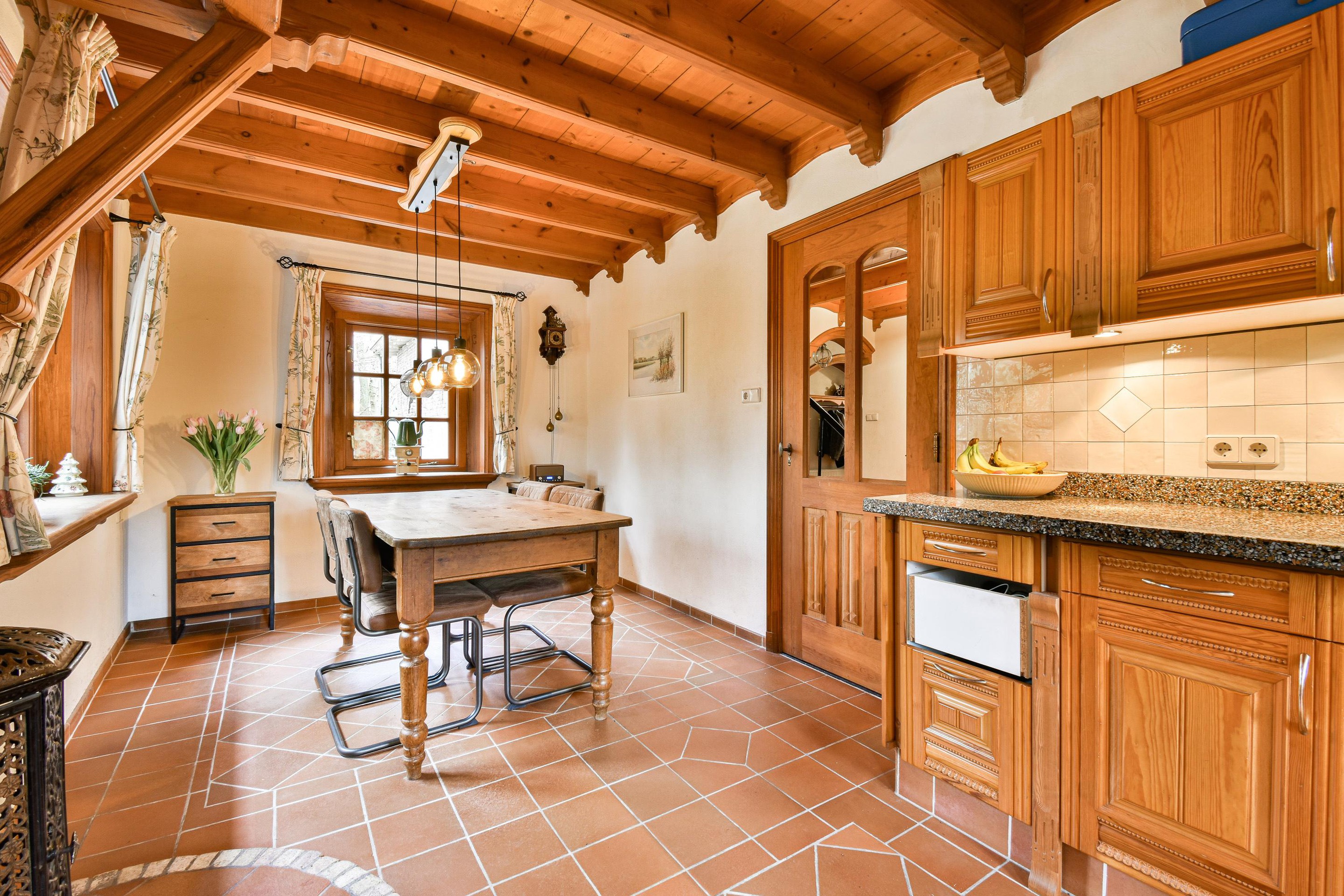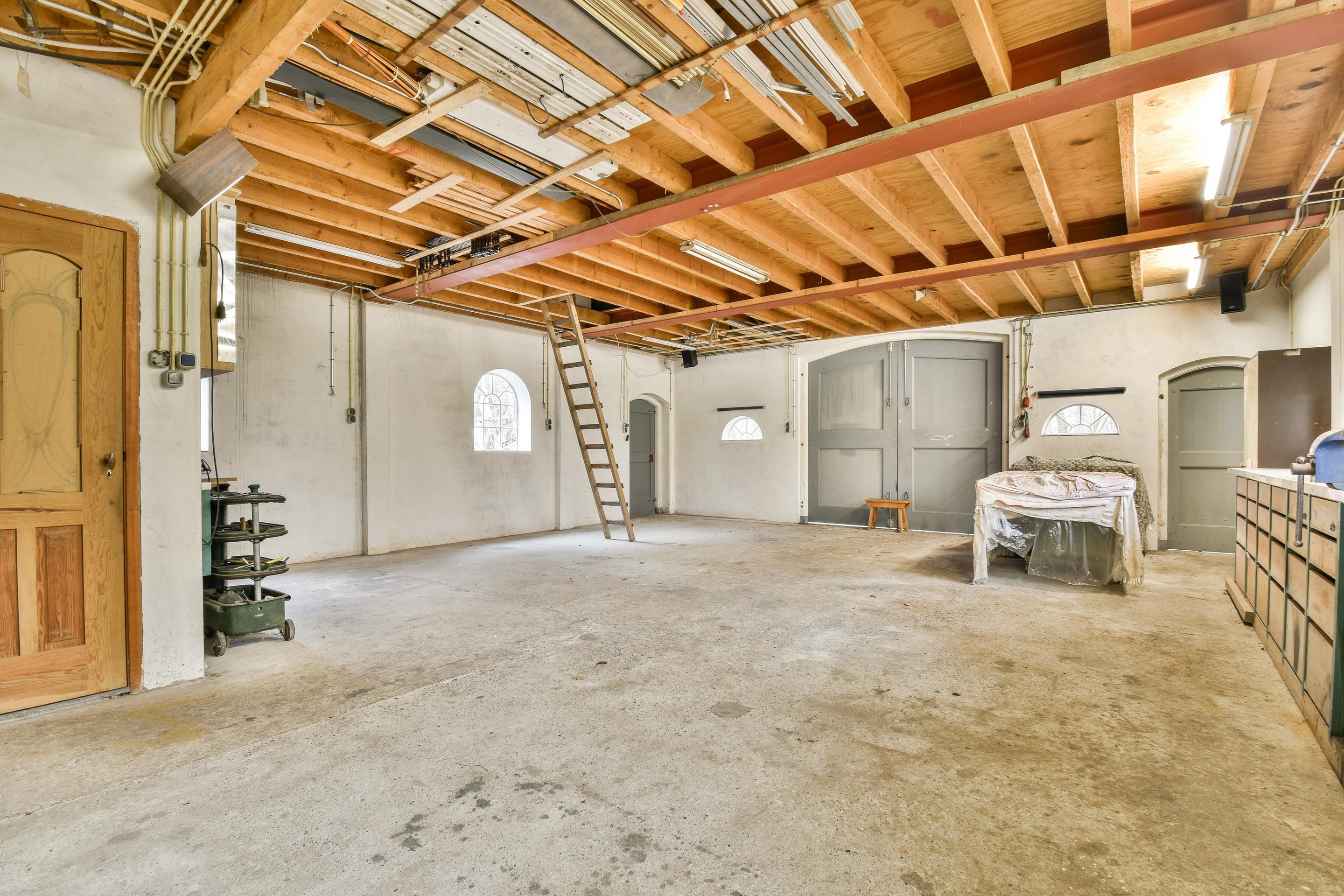 Begane grond Via de hoofdentree vindt de binnenkomst plaats in de ruime hal met grotendeels vloerverwarming. Hier bevinden zich de meterkast, de garderoberuimte en de toiletruimte v.v. vloerverwarming, zwevend toilet en fonteintje. Vanuit de hal is de etage bereikbaar en de vertrekken op de begane grond. De royale woonkamer beschikt, net als de overige ruimtes op deze woonlaag, over een sfeervol en hoog houten balkenplafond. De woonkamer is uitgerust met een klassieke schouw voorzien van een houtkachel. In de wand tussen de hal en de woonkamer bevindt zich een doorkijk. De woonkeuken is uitgerust met een handgemaakte keuken in L-opstelling. De keuken biedt onder andere een oven, een gaskookplaat, een vaatwasser, een koel-/vriescombinatie en een terrazzo aanrechtblad met dubbele spoelbak. Verder is hier een schouw en is er ruimte voor een groot eetmeubel. Vanuit de keuken toegang tot het achterportaal welke in directe verbinding staat met de achtertuin gebruikt wordt als de huidige hoofdingang tot de woning. Dit gedeelte is, net als de woonkeuken voorzien van vloerverwarming. De ruime kelder met houtgesneden wandplanken biedt volop opbergruimte voor proviand en overige boodschappen. De wasruimte beschikt over meerdere wasmachine-/drogeraansluitingen, een granieten bad met spoelbak en biedt toegang tot de inpandige werkplaats en de achtertuin. De werkplaats / open ruimte heeft een oppervlak van maar liefst 75 m2 en is mede door de bovenliggende vliering van meer dan 30 m2 multifunctioneel in gebruik. De ruimte dient momenteel als werkplaats maar kan eenvoudig dienen als bv. stalling voor voertuigen (of dieren), een atelier, kantoor of wat dacht u van het creëren van extra woonoppervlak? De mogelijkheden hier zijn oneindig. Dit multifunctionele gedeelte van de woning is voorzien van werkbank(en), originele stalraampjes, twee loopdeuren richting de tuin en een grote openslaande, dubbele branddeur.
