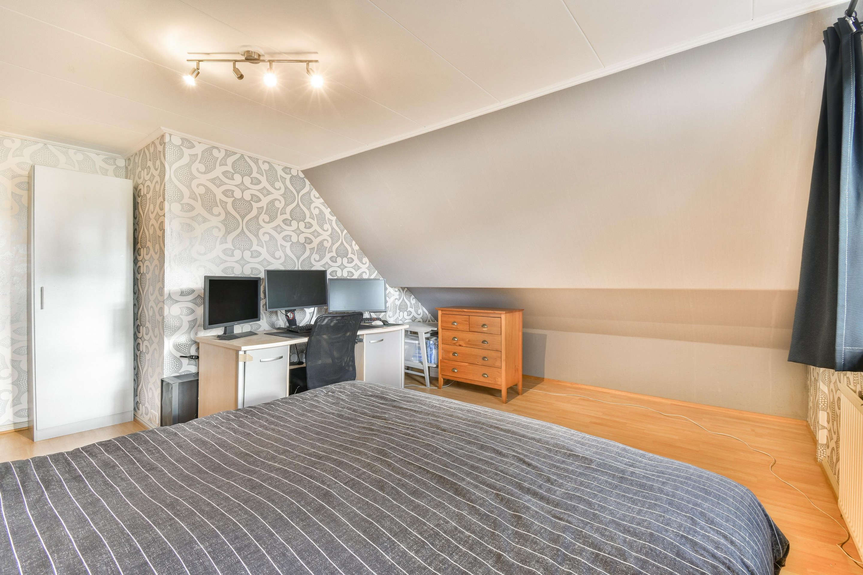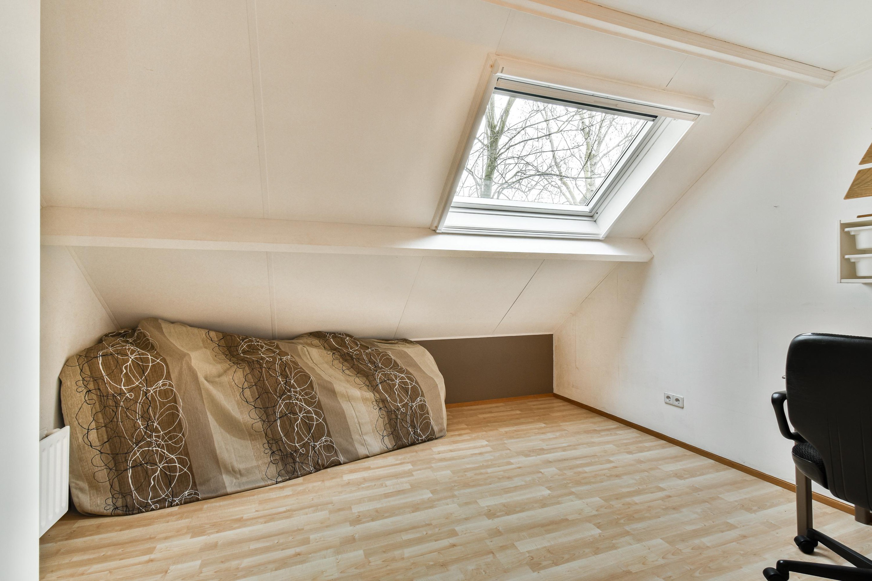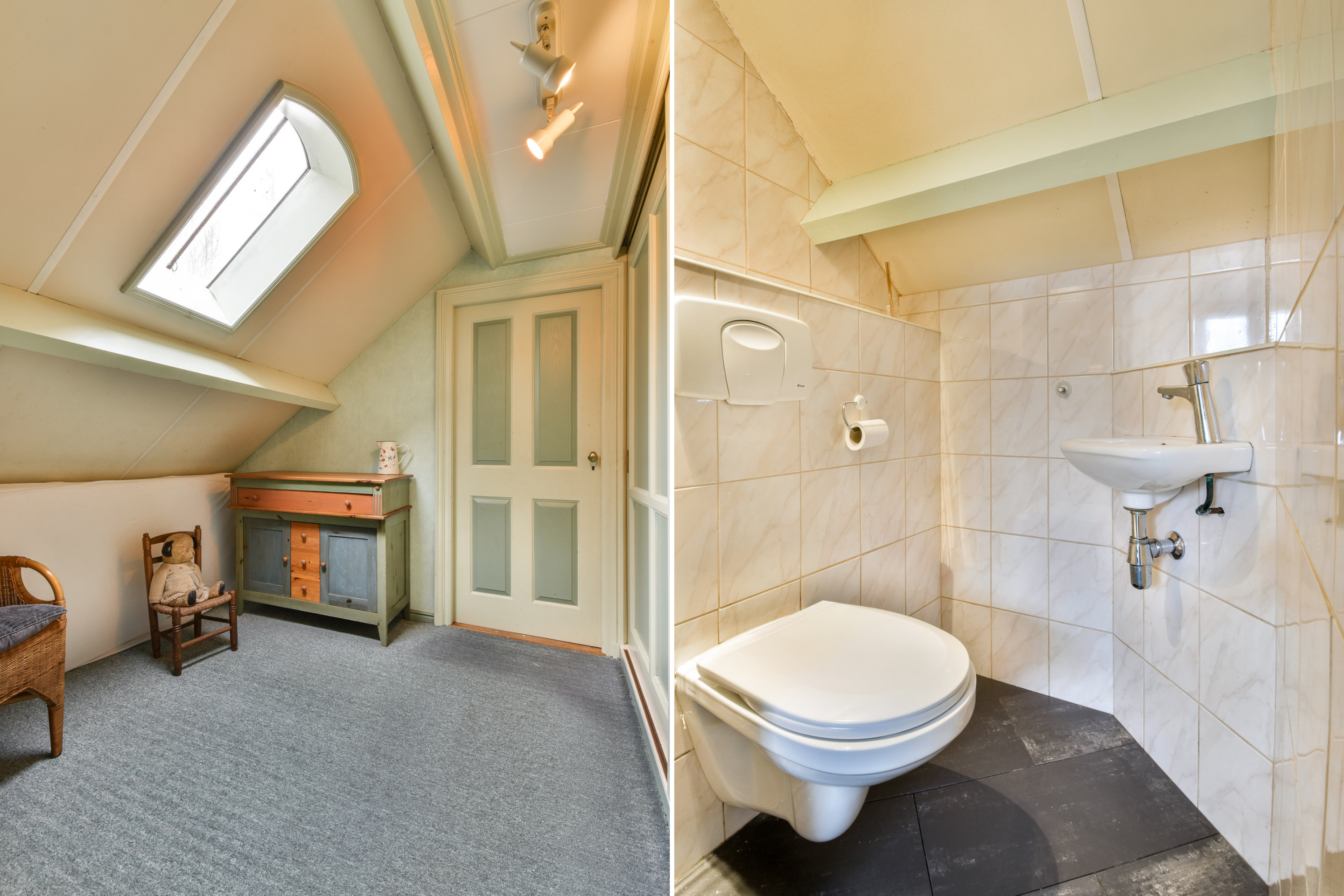 Eerste verdieping De overloop met vide is uitgerust met een dakkapel en vaste bergruimte. Van hieruit zijn de 1ste twee slaapkamers, de badkamer en de tussenhal bereikbaar. De 1ste ruime slaapkamer is gelegen aan de dijkzijde van de woning. De tweede slaapkamer is uitgerust met een Velux-dakraam en biedt toegang tot de bovengelegen zolderruimte. De geheel betegelde badkamer is uitgerust met een ligbad, een douchecabine, designradiator en een wastafel. De tussenhal staat in directe verbinding met de nette toiletruimte welke is uitgerust met een zwevend toilet en fonteintje. De werkkamer biedt een dakraam en een vaste schuifkast. Van hieruit toegang tot de overige twee slaapkamers waarbij de ruime derde slaapkamer over een Velux-dakraam beschikt. De vierde slaapkamer is aan de parkzijde gelegen en is uitgerust met een dakkapel.