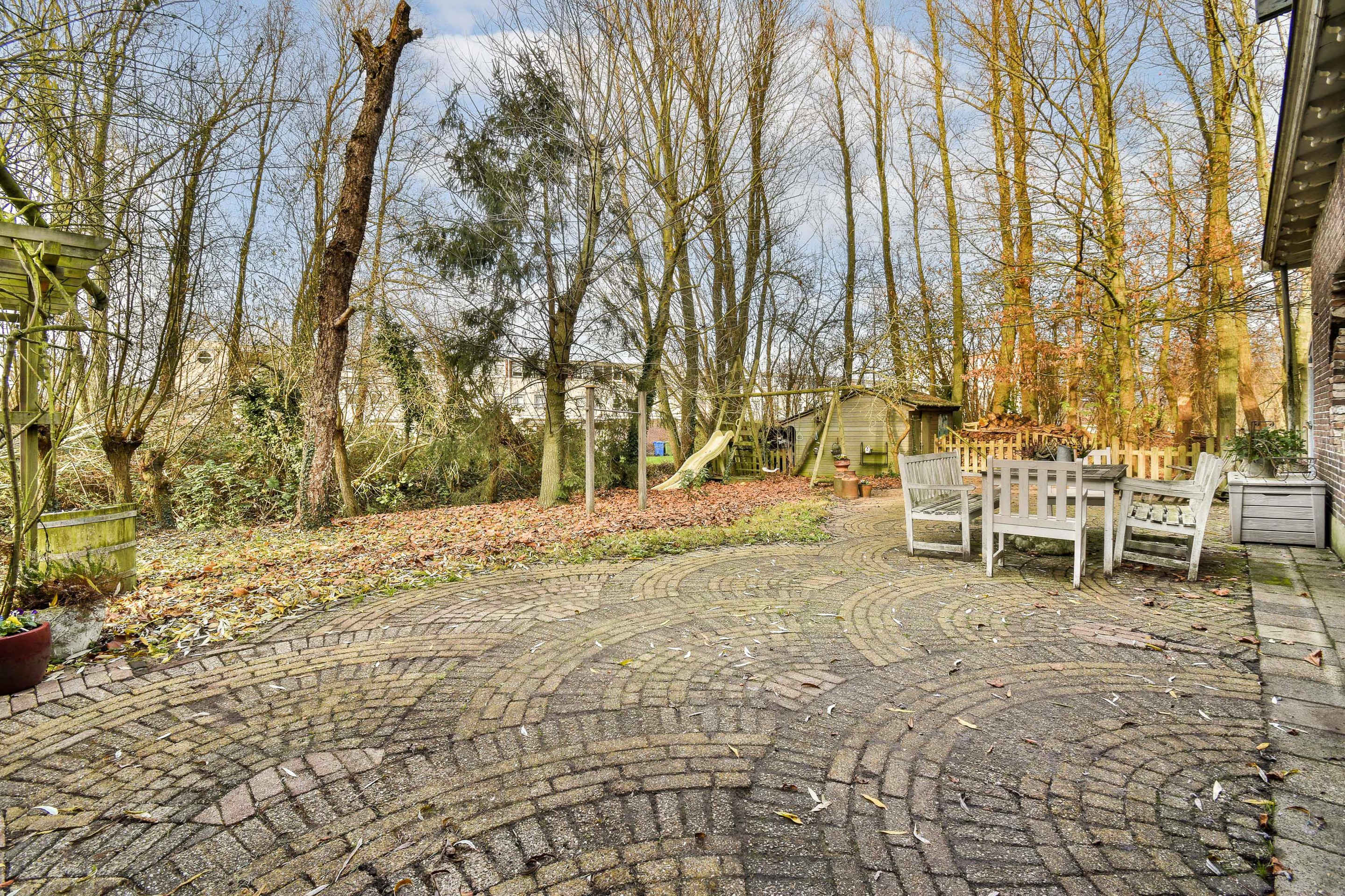 De riante tuin ligt rondom de woning en biedt een afwisseling van gazon, sierbestrating, beplanting, wilgen en volwassen bomen.