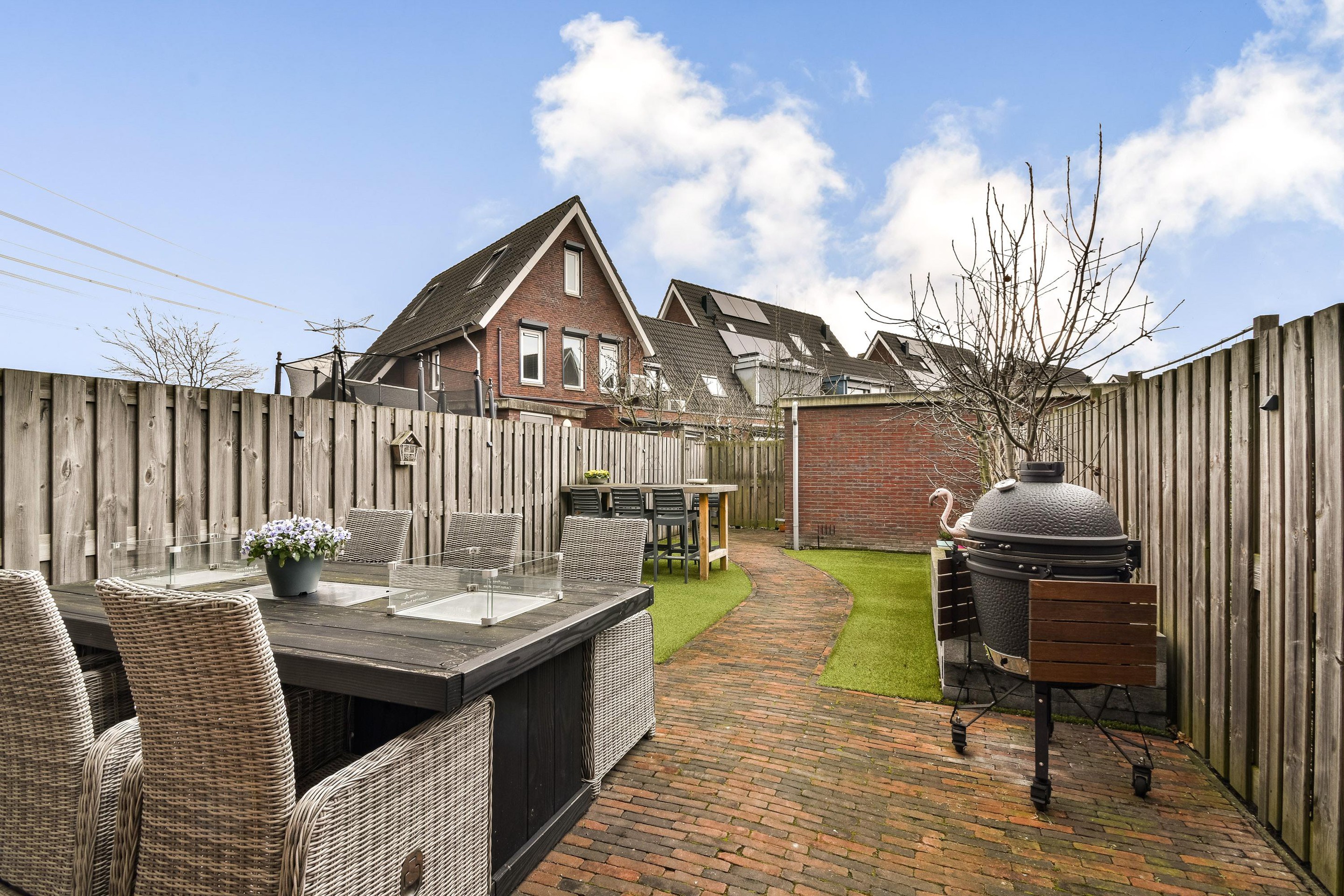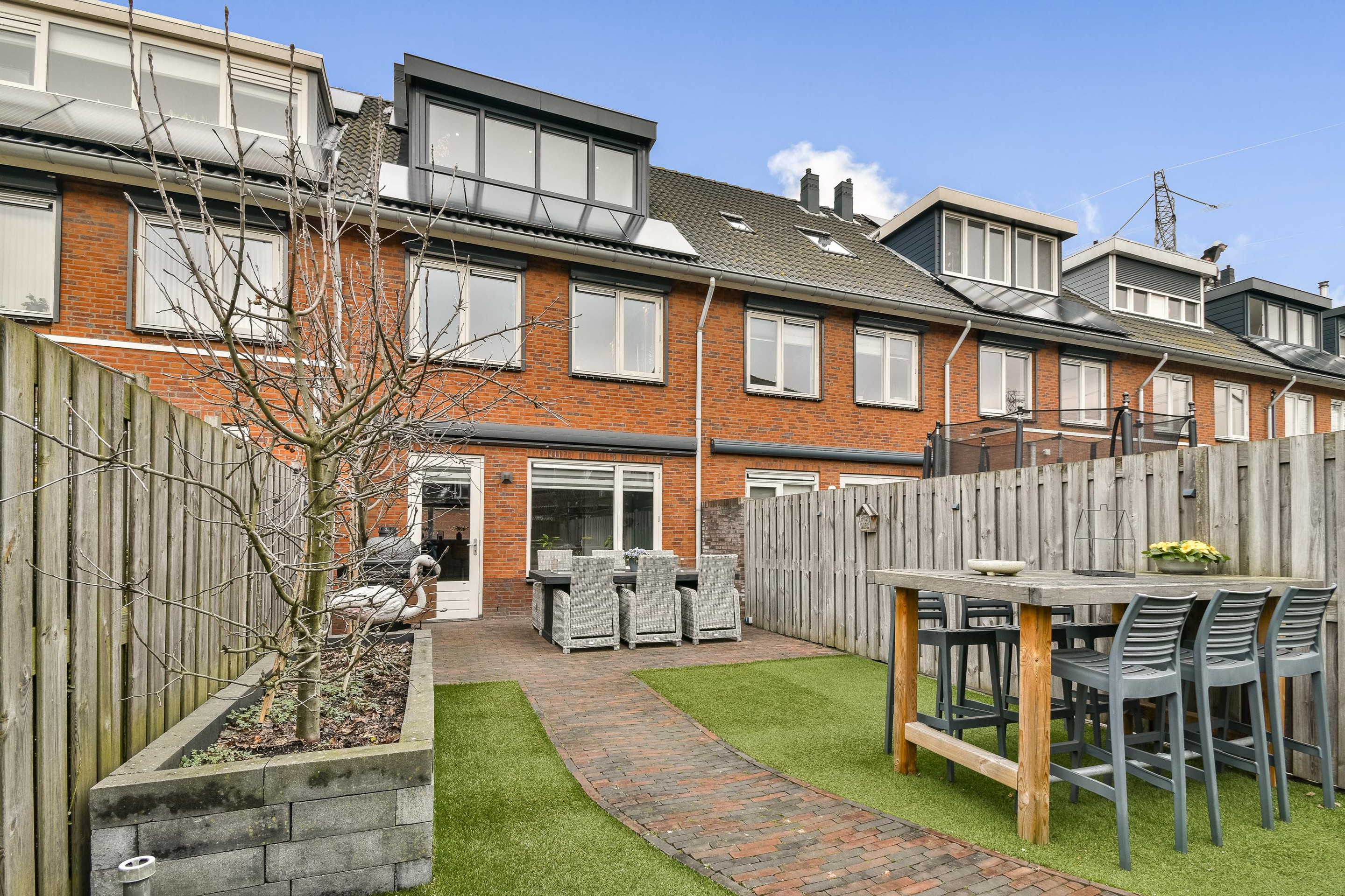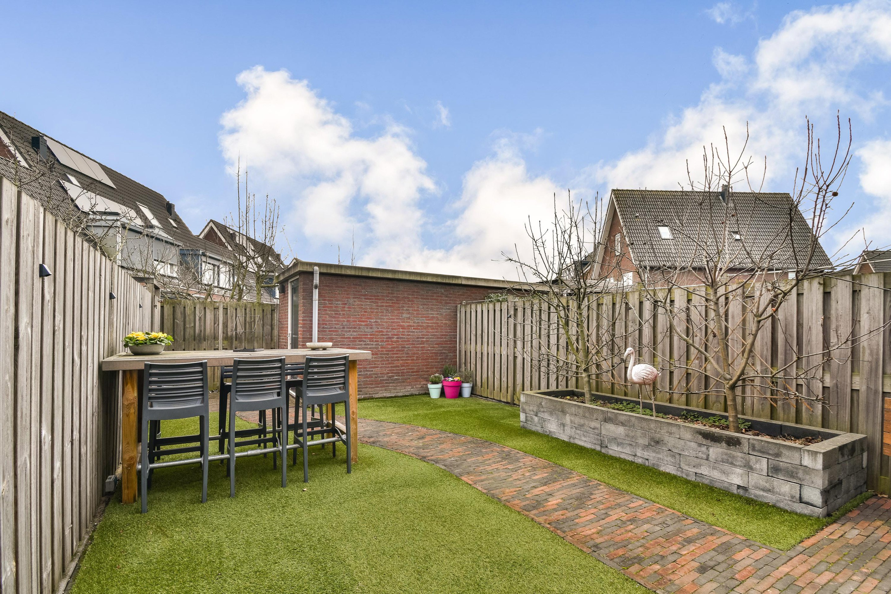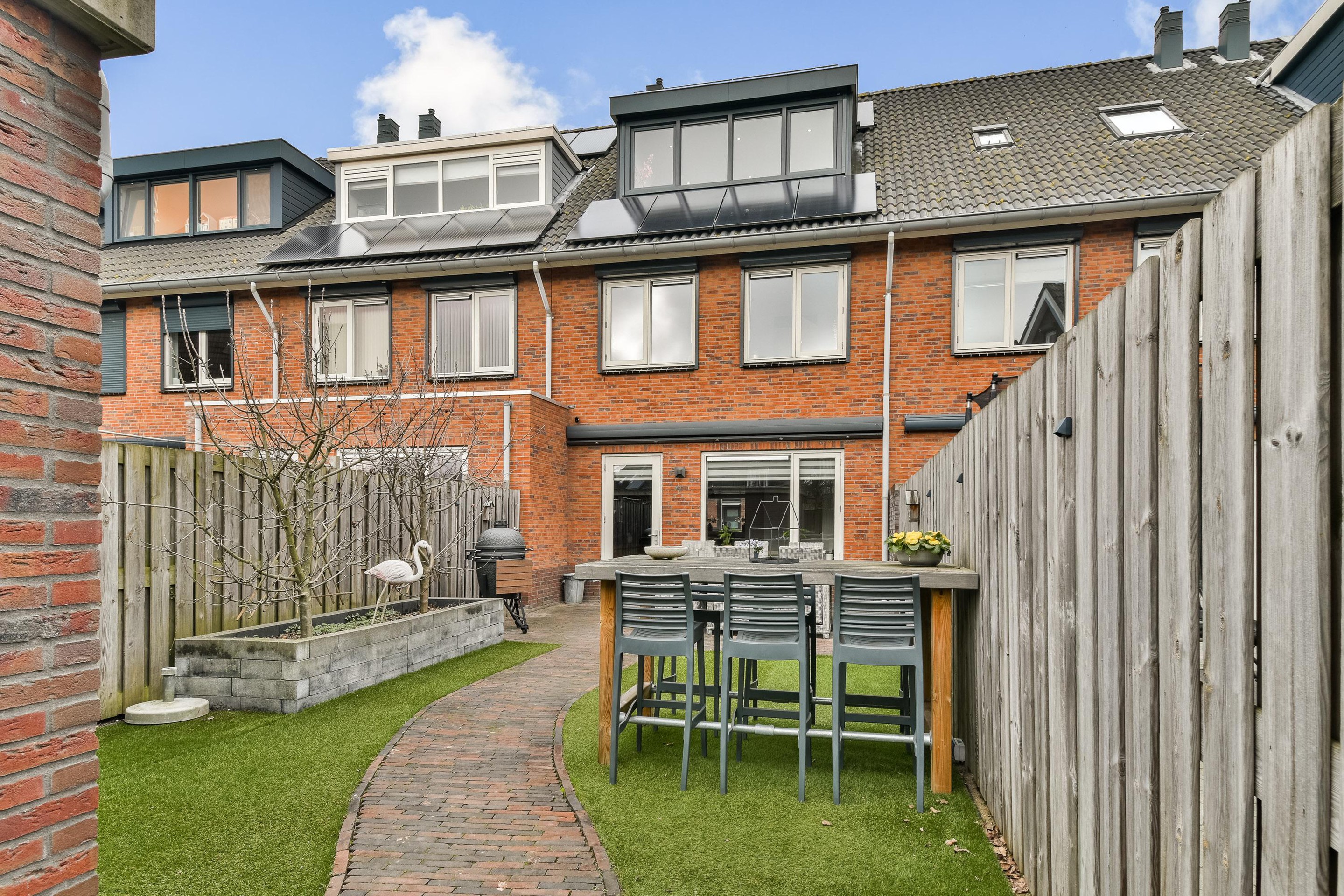 De op het zuiden gelegen achtertuin is keurig ingericht met nette bestrating en biedt aan beide zijden stroken kunstgras. In de opgemetselde plantenborder bevinden zich twee boompjes. Achterop het perceel vind je de praktische stenen berging en een achterom. Met het zonnescherm aan de gevel is hier altijd een plek in de schaduw! Op korte afstand ligt een klein speeltuintje.
