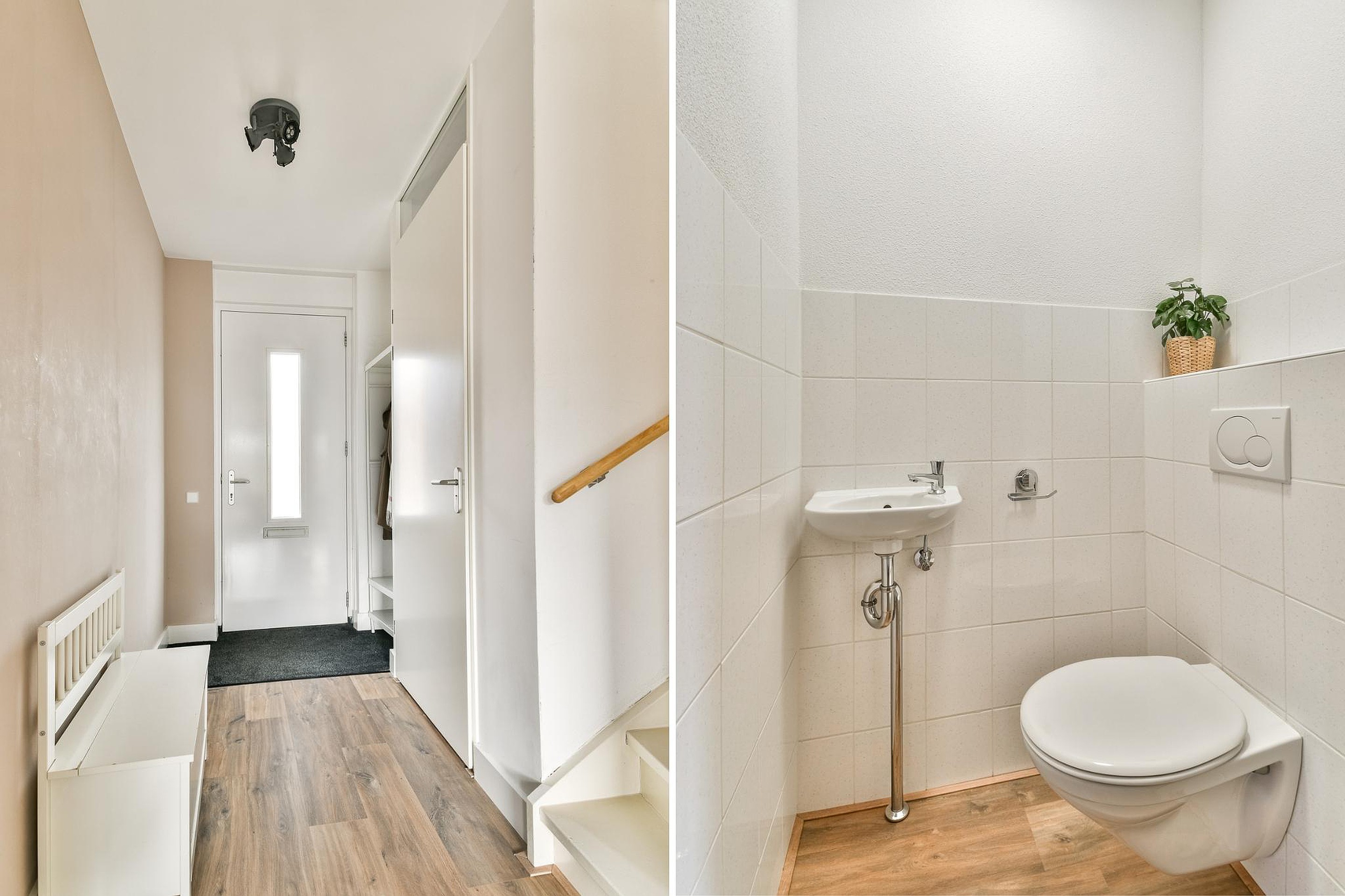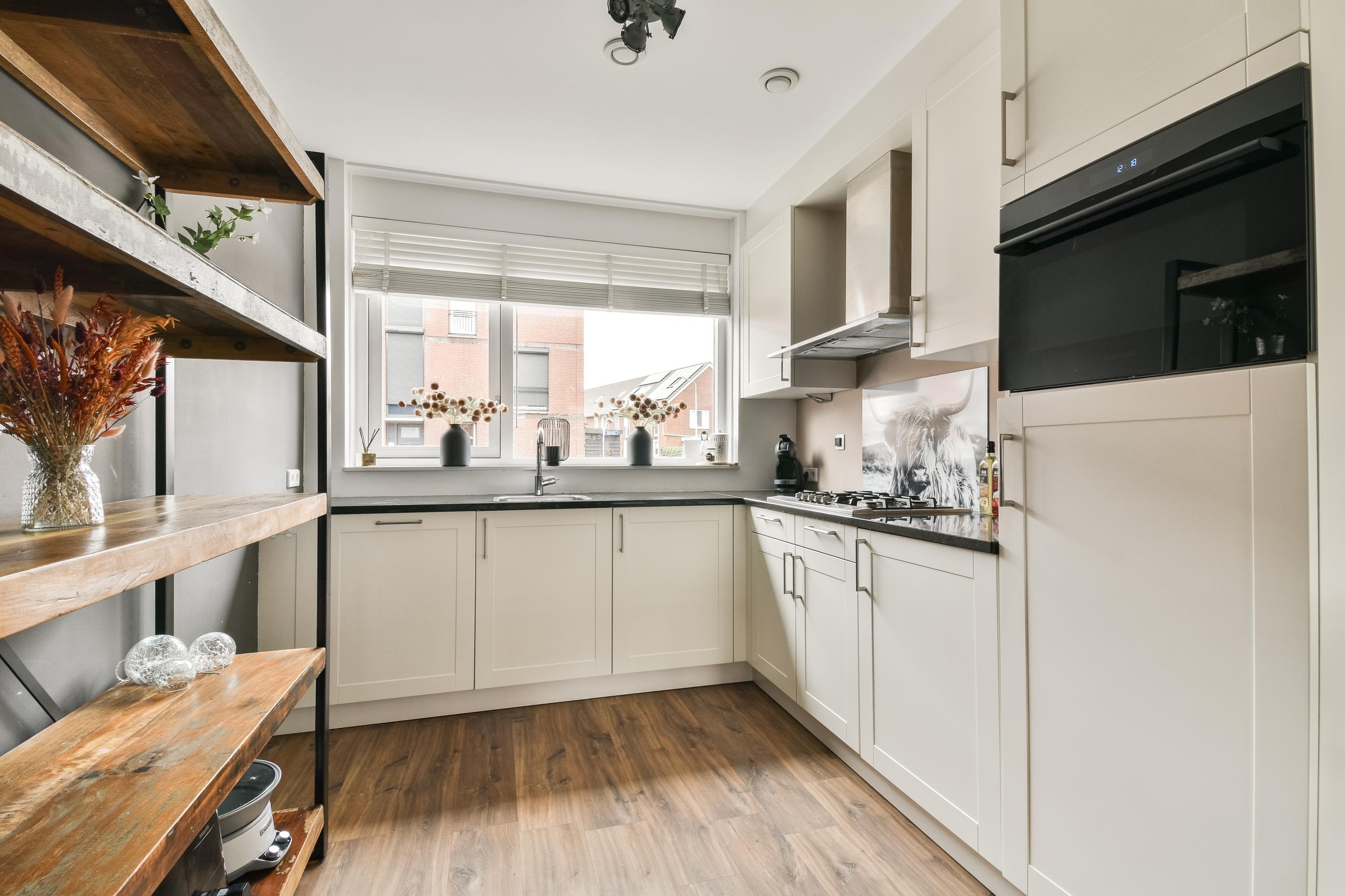 Keurige en overdekte entree in de ruime hal met meterkast (10 groepen / 3 aardlekschakelaars), garderoberuimte, nette toiletruimte met zwevend toilet en modern fonteintje en de trapopgang. De gehele begane grond is voorzien van comfortabele vloerverwarming. Lichte en sfeervolle L-vormige woonkamer met strakke afwerking en lichte kleuren. Aan de voorzijde, grenzend aan de keuken, bevindt zich het eetgedeelte met voldoende ruimte voor een royale eettafel. Aan de tuinzijde ligt het comfortabele zitgedeelte met een praktische vaste kast en directe toegang tot de achtertuin. De luxe open keuken in L-opstelling is heerlijk om in te koken en uitgerust met hoogwaardige apparatuur als een 5-pits gaskookplaat met afzuigkap, combi-oven met magnetron (2020), vaatwasser (vernieuwd) en inbouwkoelkast. Hiernaast vind je in de keuken voldoende opbergmogelijkheden.