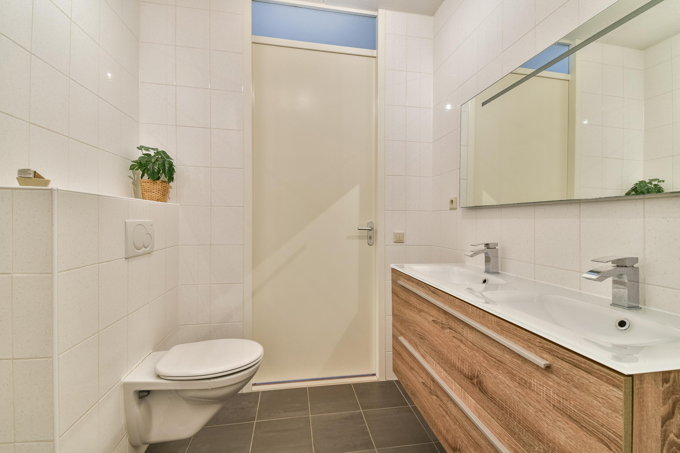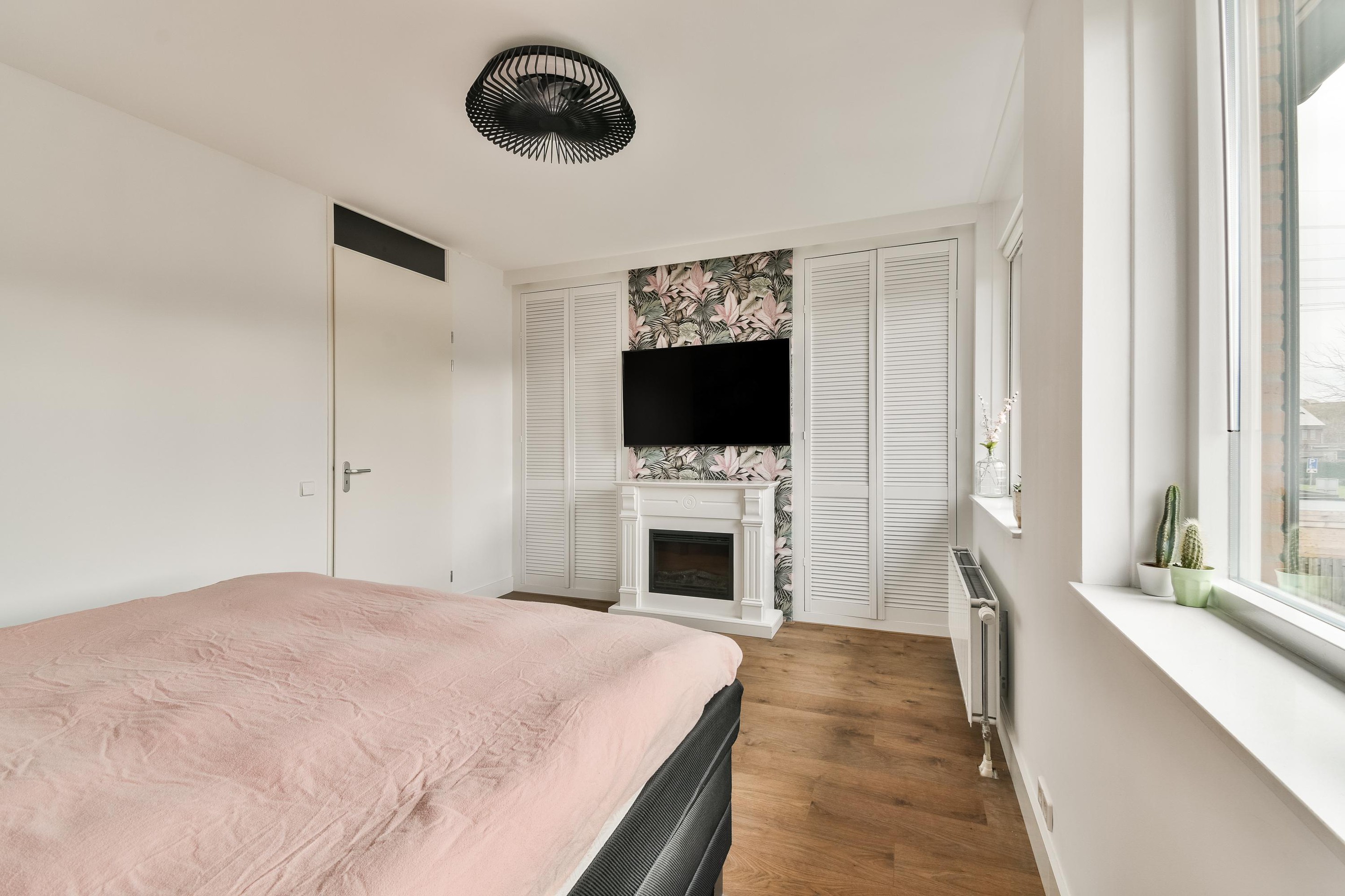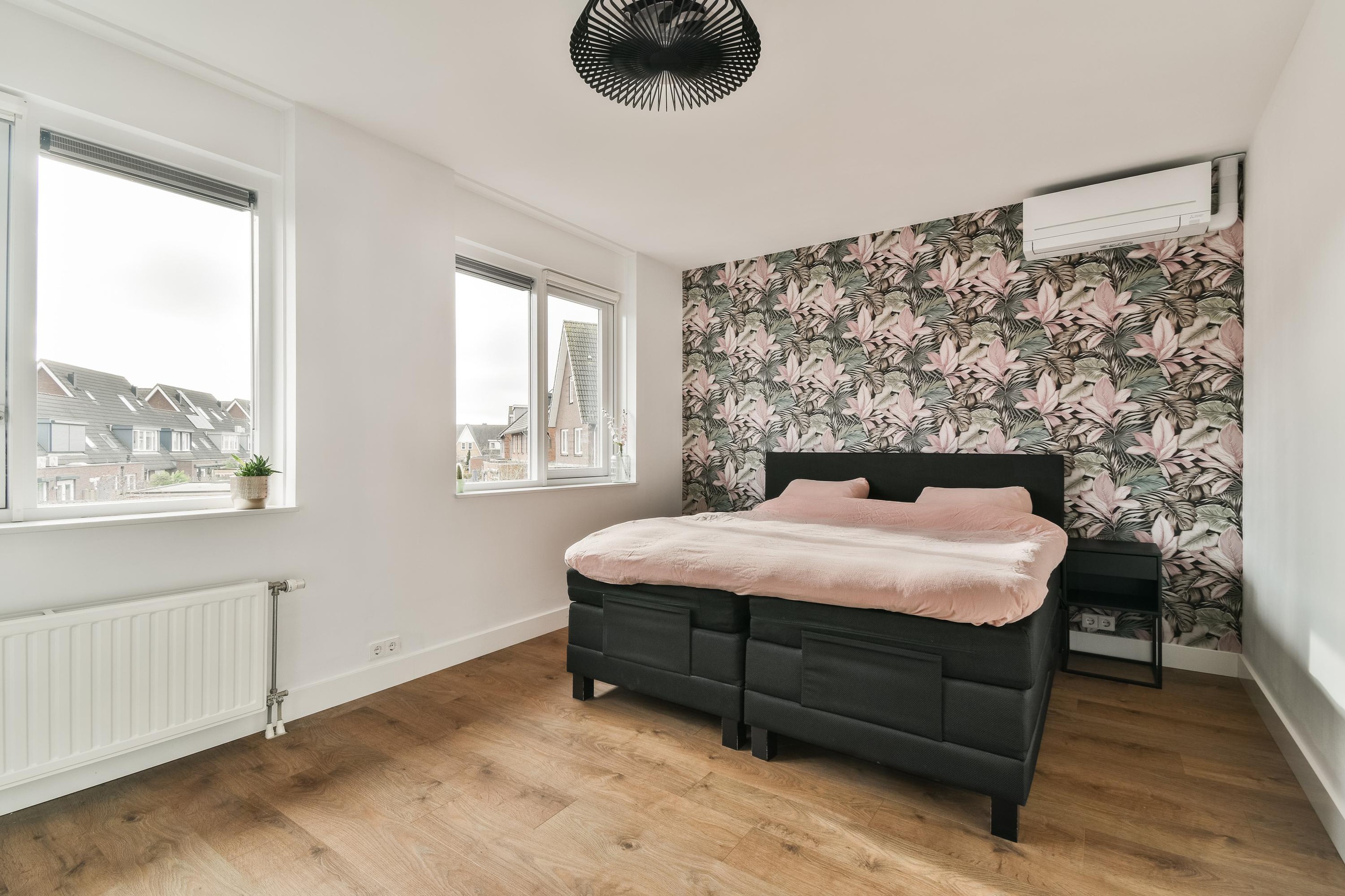 De overloop biedt toegang tot twee ruime slaapkamers, de badkamer en de trapopgang. De luxe badkamer is compleet met een heerlijk whirlpoolbad, een stijlvolle dubbele wastafel met strak meubel en een modern zwevend toilet. Ook beschikt de ruimte over mechanische ventilatie. De ouderslaapkamer (ca. 17m2) aan de achterzijde van de woning is voorzien van rolluiken en een airconditioningunit. De kamer beslaat de volledige breedte en beschikt bovendien over een praktische, ingebouwde kast. De tweede, L-vormige slaapkamer (ca. 14m2) ligt aan de voorzijde. Ook deze kamer is uitgerust met een airconditioningunit en elektrische rolluiken.