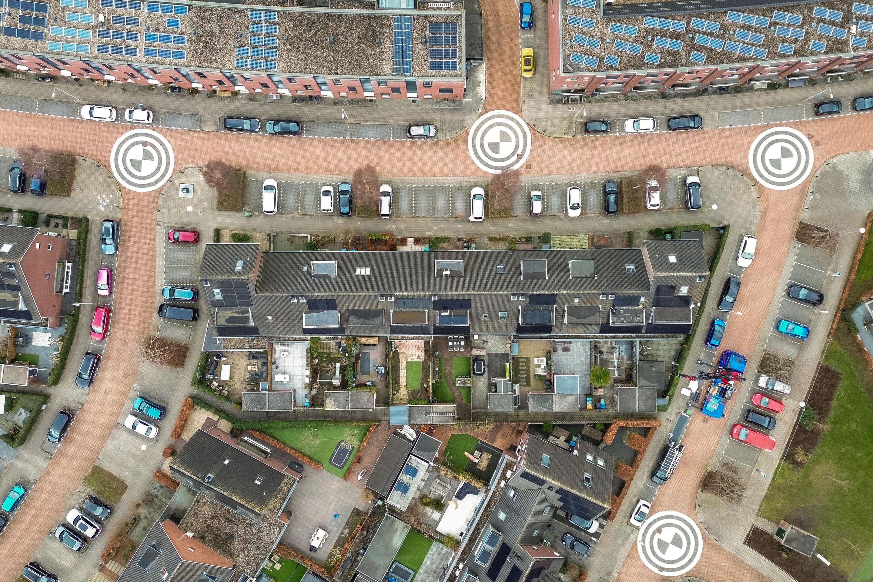 Aan de straatzijde ligt een strook van ca. drie meter diep met plek voor de groencontainers, een kleine grindborder en de overdekte entree van de woning.