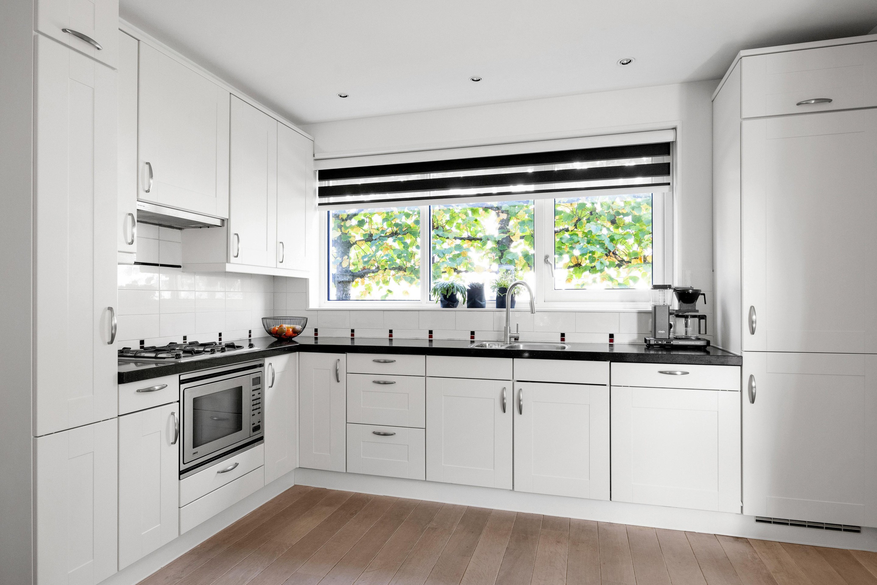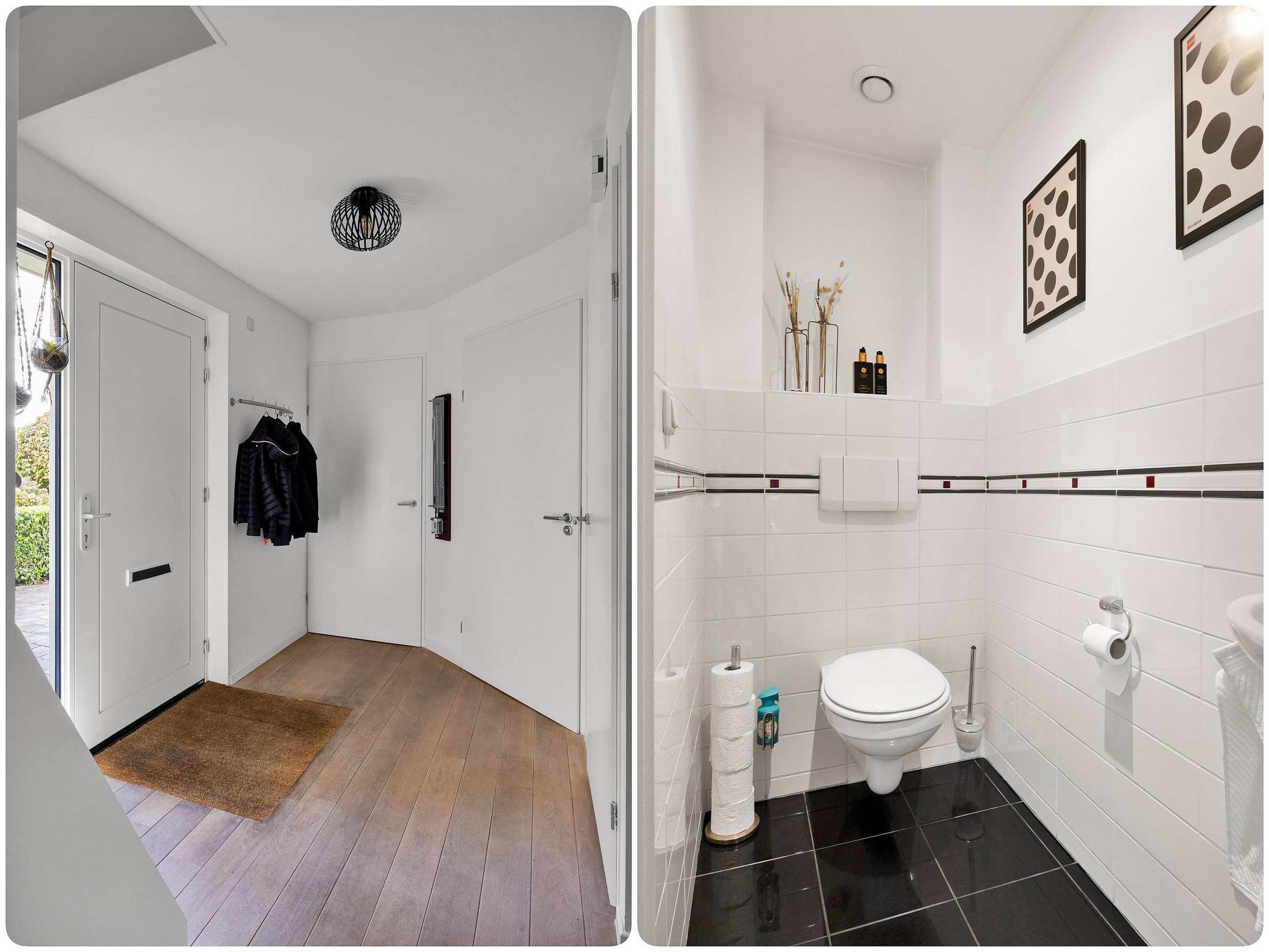 We betreden de woning via de voordeur en komen in de ruime hal met meterkast, trapopgang, toilet en wasruimte/kast met wasmachine- en drogeraansluiting. Via de hal is ook de woonkamer toegankelijk, deze is ruim en tuingericht, via de openslaande deuren stap je zo de fraai ingerichte achtertuin in. De open keuken bevindt zich aan de voorzijde van de woning en heeft een hoekopstelling welke voorzien is van diverse inbouwapparatuur zoals; koelkast, vrieskast, gaskookplaat, afzuigkap, oven en vaatwasser.