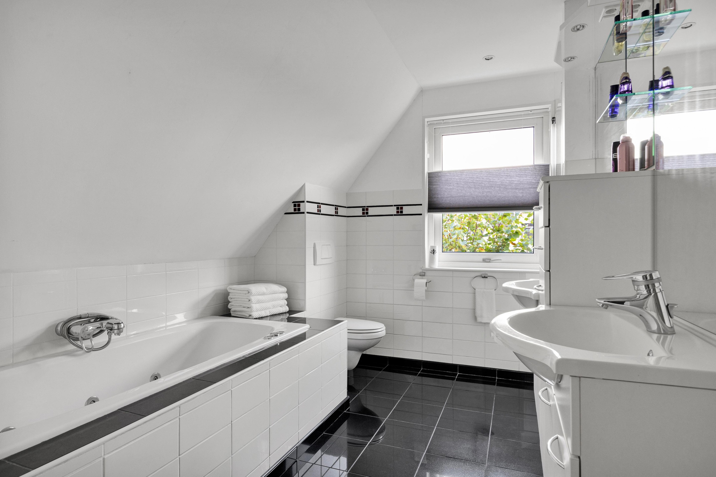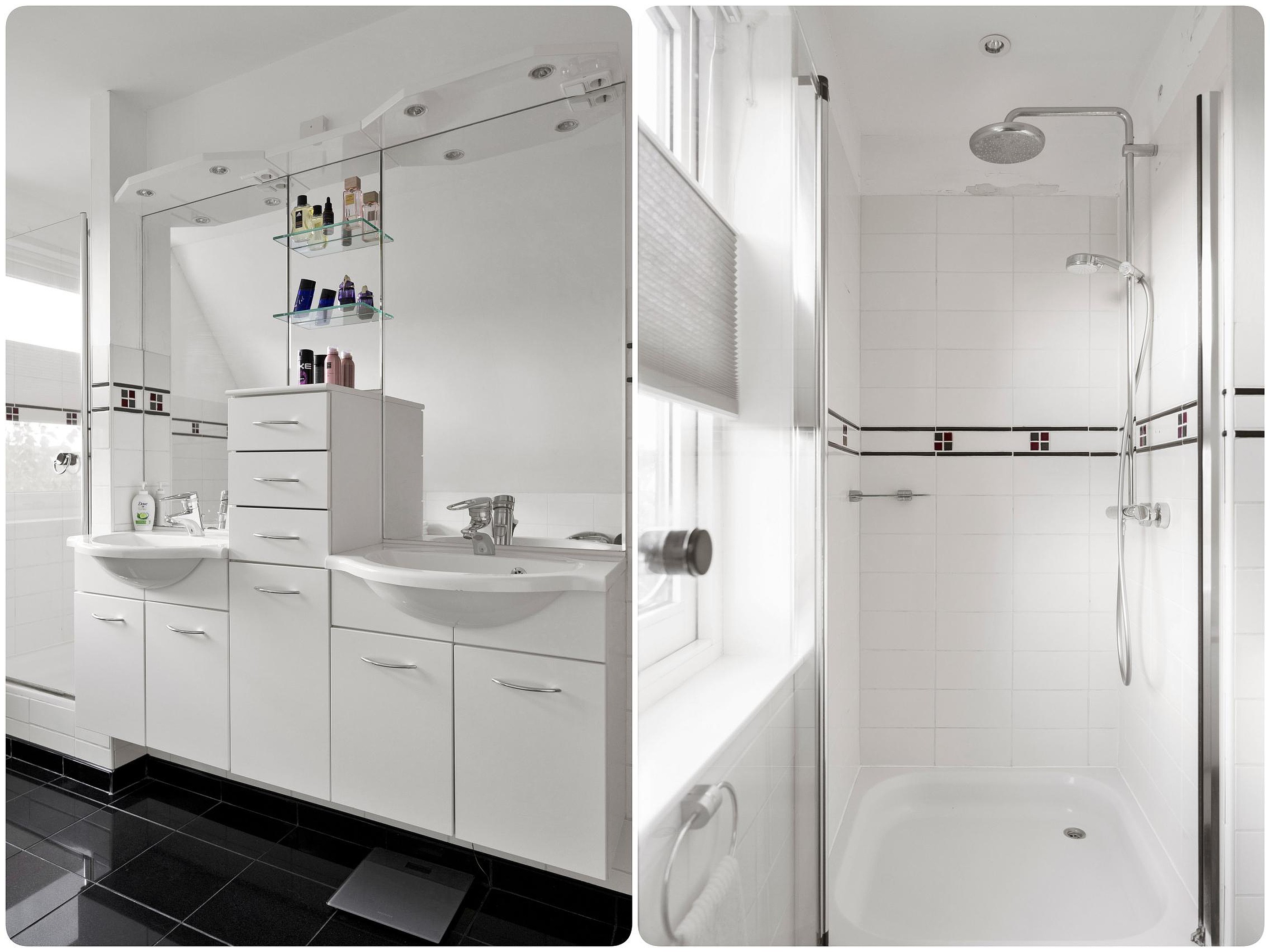 De overloop geeft toegang tot de 3 slaapkamers, waarvan 2 slaapkamers met vaste kasten. De badkamer is voorzien van een ligbad, douche, 2e toilet en dubbele wastafel met meubel.