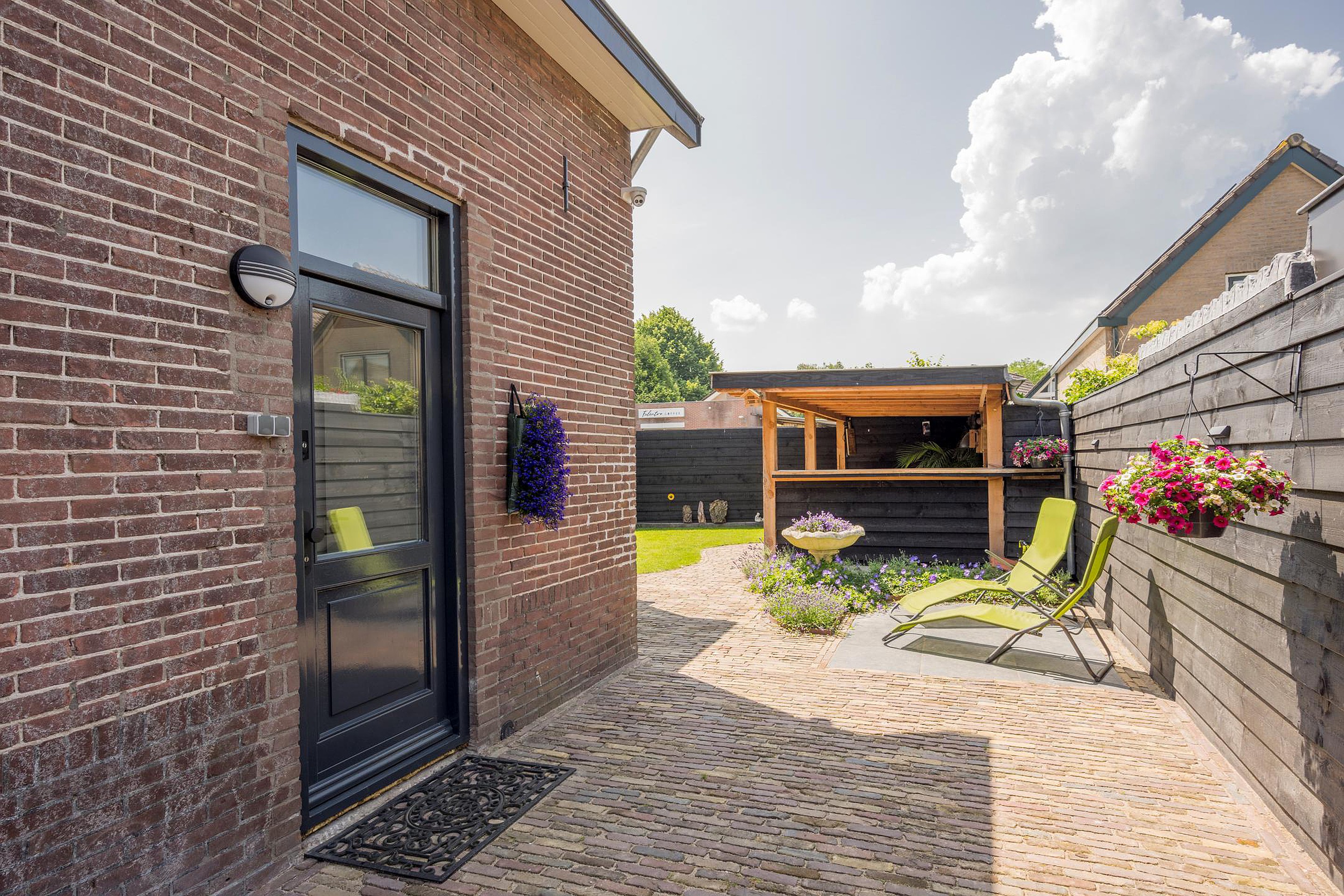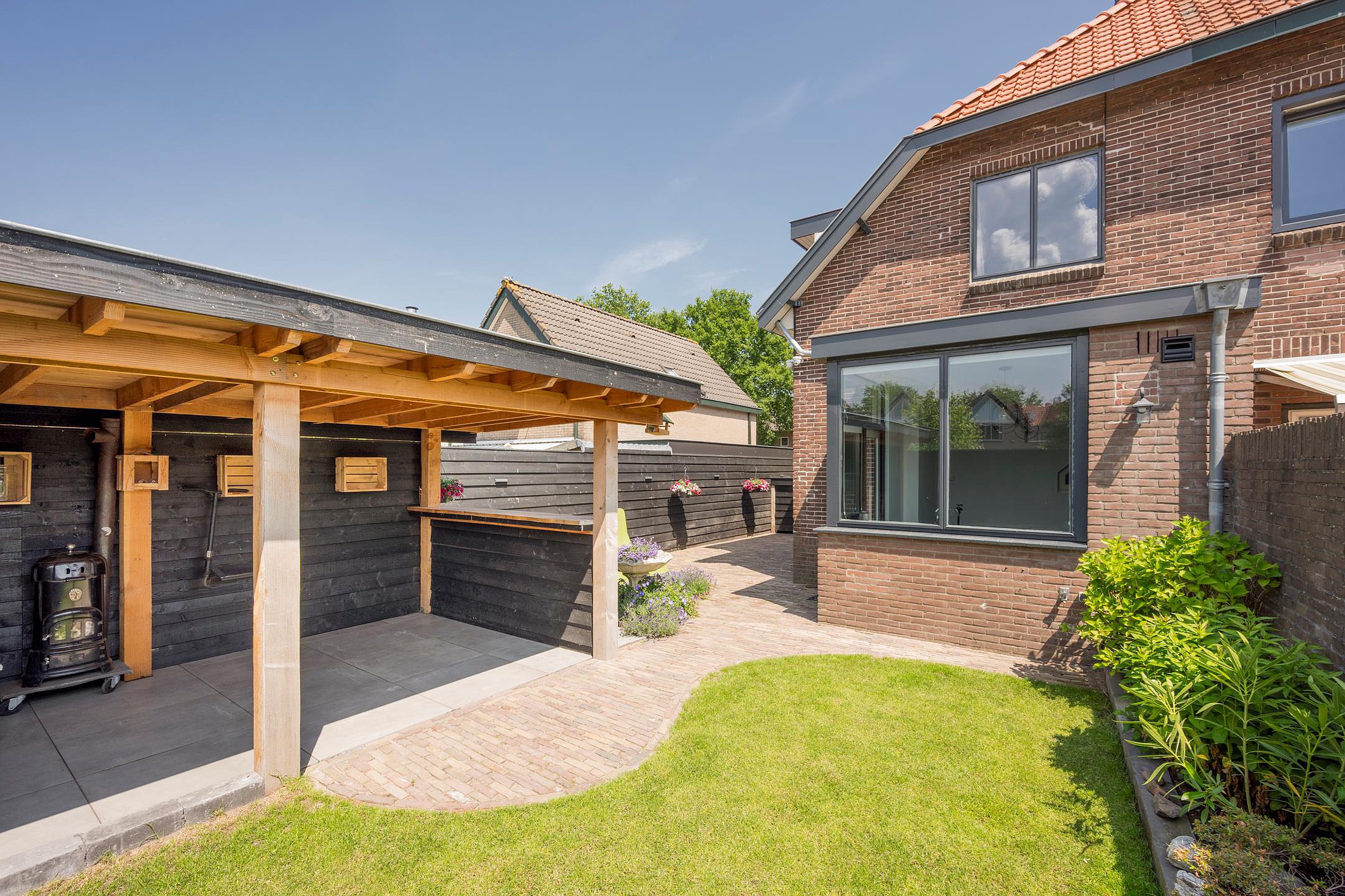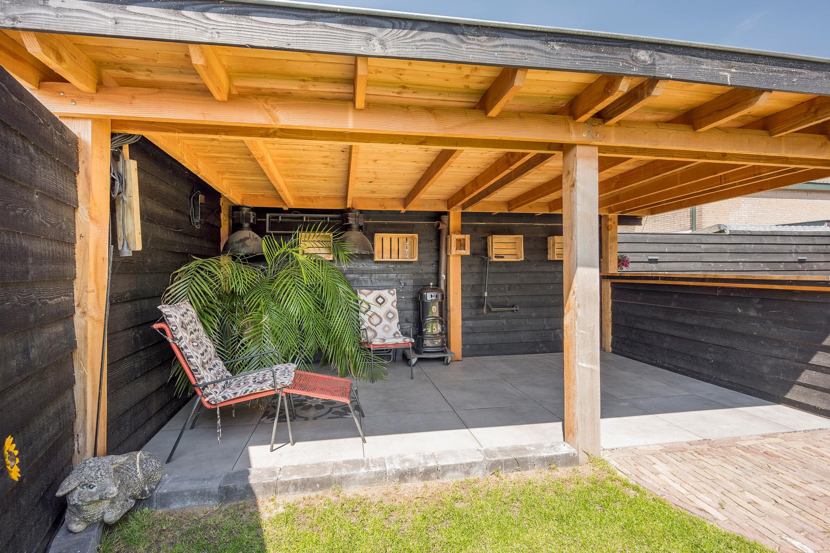 De achtertuin ligt op het westen en biedt volop zon in de middag en avond, perfect voor wie graag buiten eet of tot laat geniet van de dag. Achterin vind je een royale, overdekte zitplek: ideaal voor een loungeset of tuintafel, beschut bij elk weertype. Aan de zijkant is een brede oprit met ruimte om te parkeren op eigen terrein. De kliko-ombouw is netjes weggewerkt en draagt bij aan de verzorgde uitstraling. In de voortuin, gelegen op het oosten, geniet je juist van de ochtendzon met een kop koffie.
