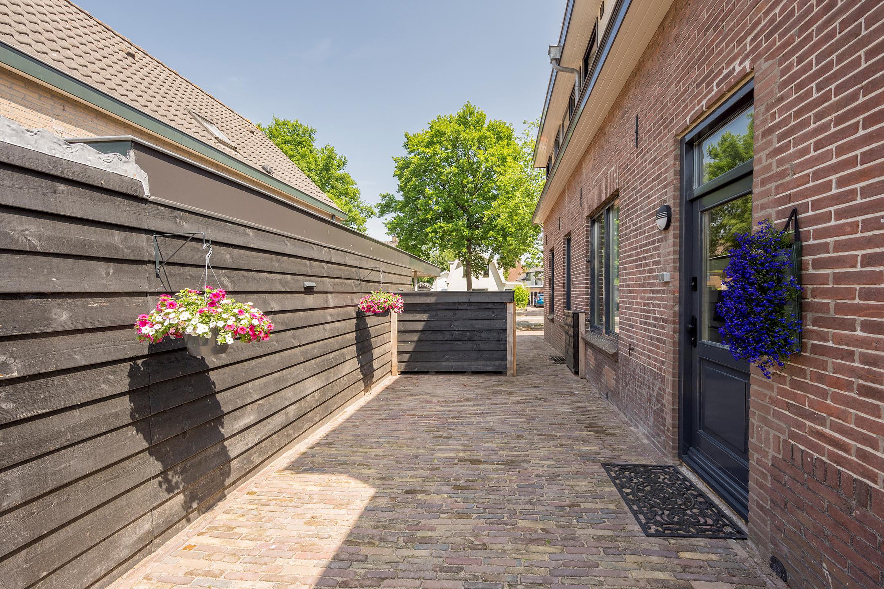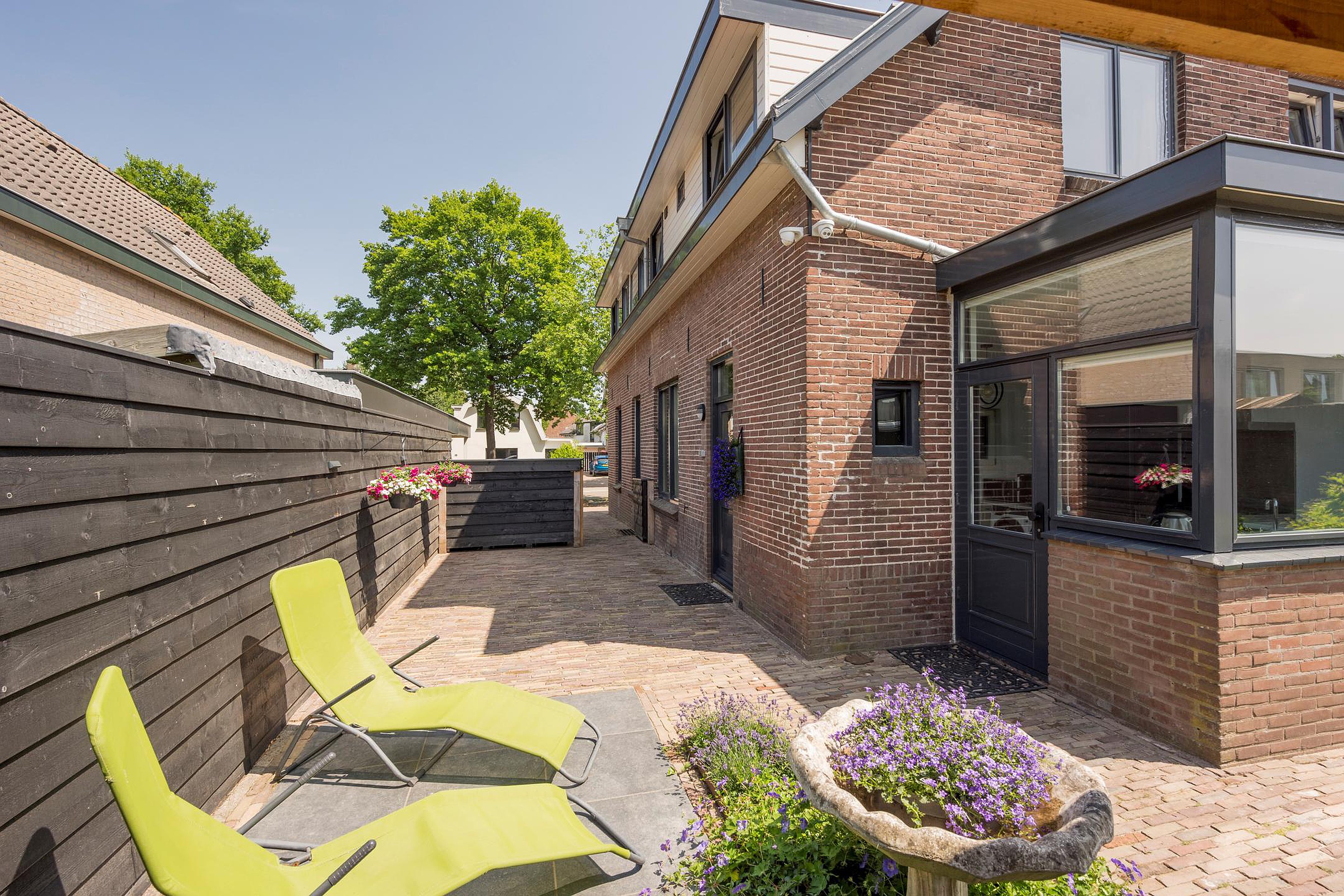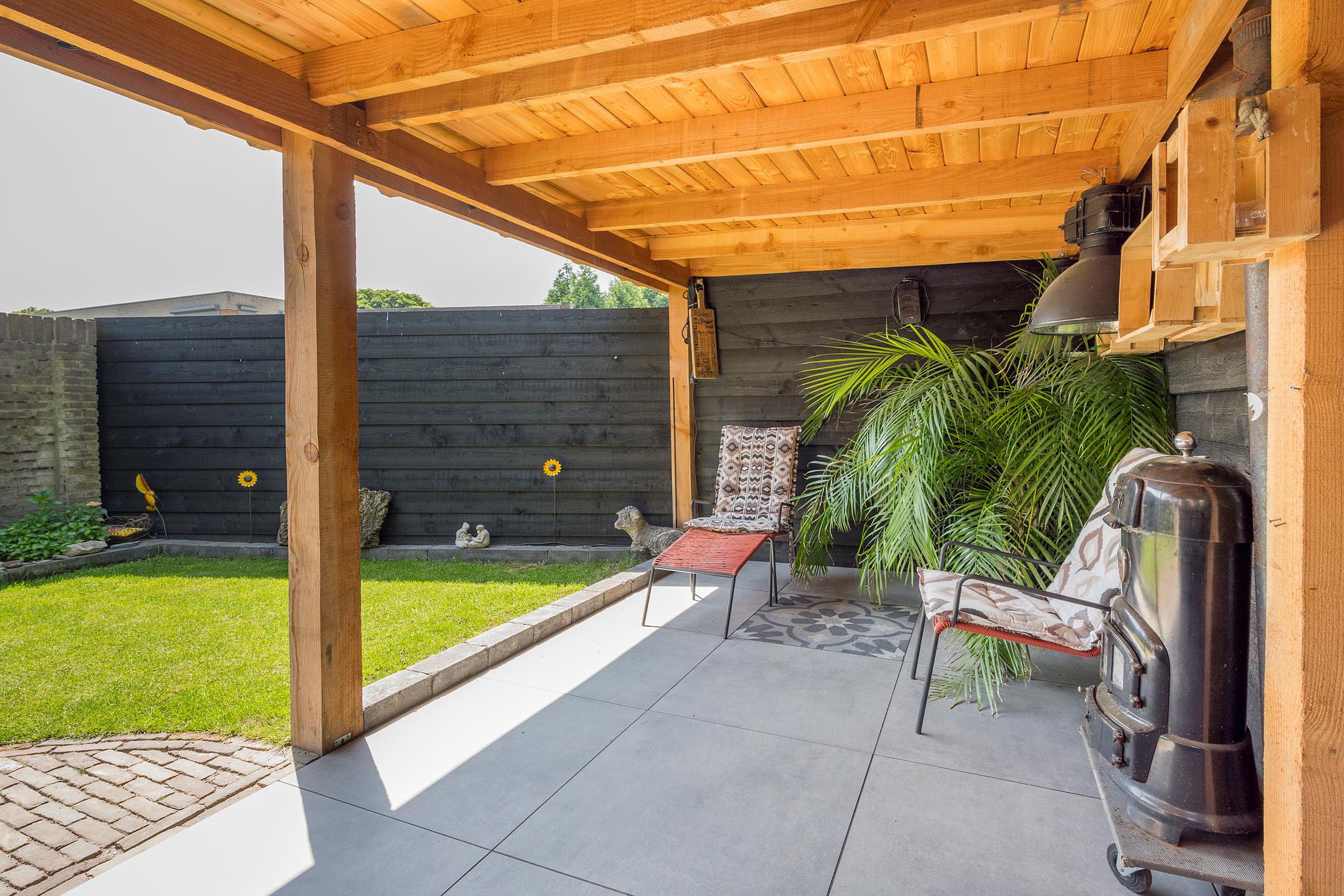 De achtertuin ligt op het westen en biedt volop zon in de middag en avond, perfect voor wie graag buiten eet of tot laat geniet van de dag. Achterin vind je een royale, overdekte zitplek: ideaal voor een loungeset of tuintafel, beschut bij elk weertype. Aan de zijkant is een brede oprit met ruimte om te parkeren op eigen terrein. De kliko-ombouw is netjes weggewerkt en draagt bij aan de verzorgde uitstraling. In de voortuin, gelegen op het oosten, geniet je juist van de ochtendzon met een kop koffie.