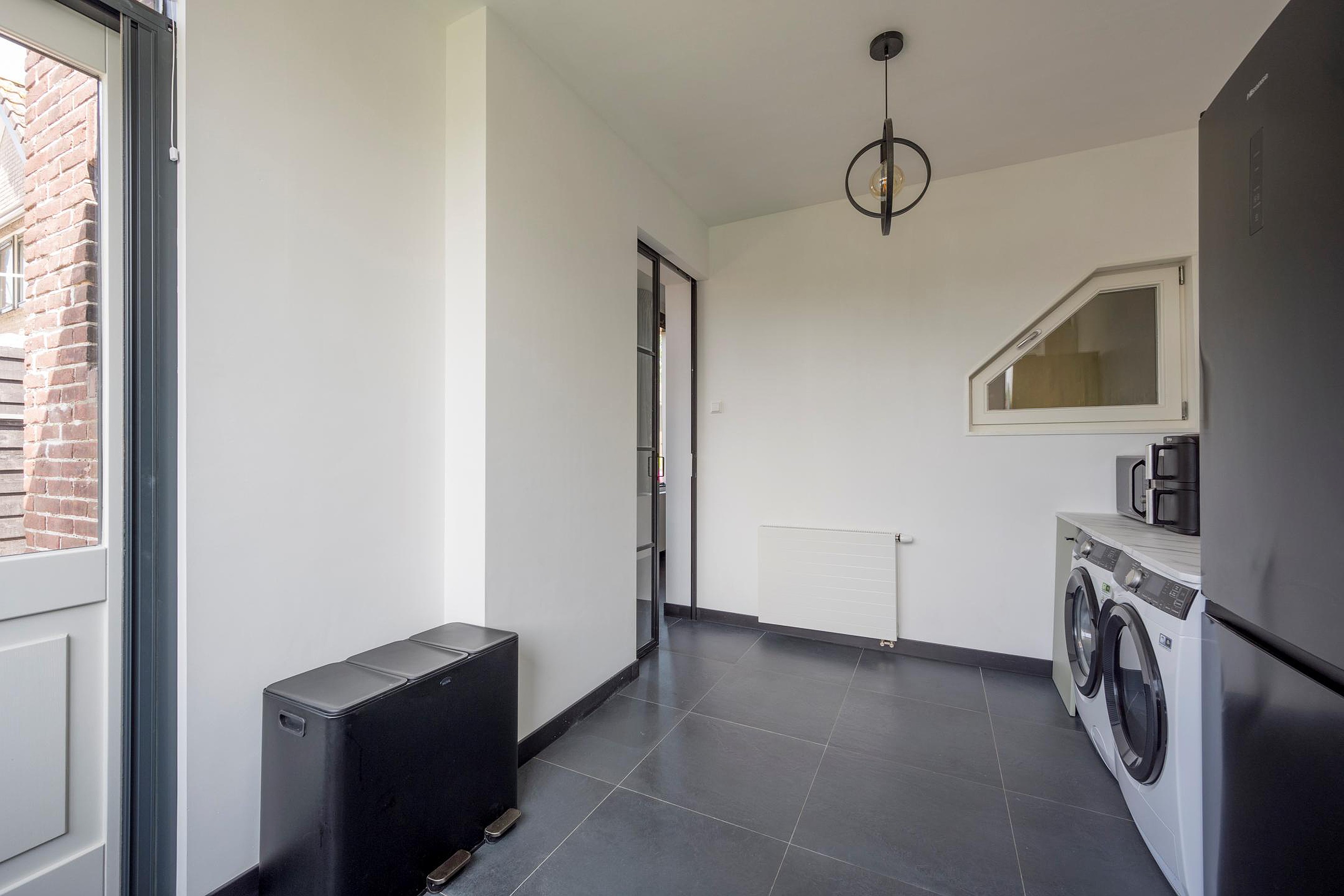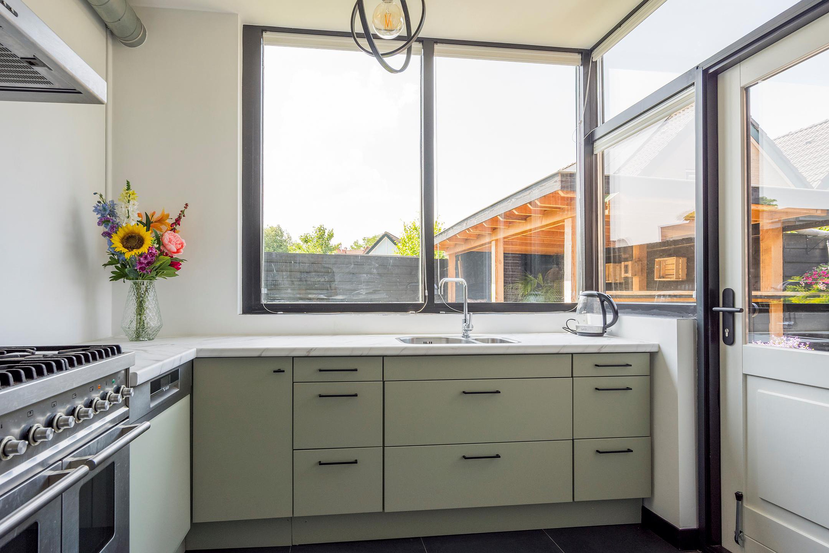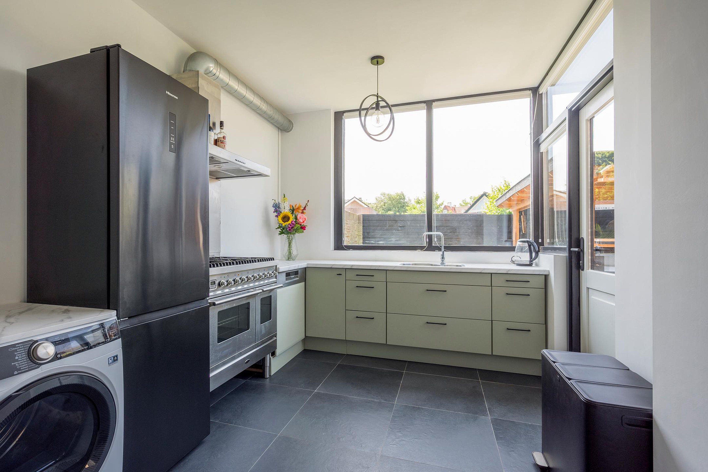 Via de zijingang stap je binnen in een centrale hal. Hier vind je het toilet en heb je toegang tot zowel de keuken als de woonkamer. Kom je vanuit de tuin, dan loop je gemakkelijk via de achterdeur de keuken in, handig als je net buiten bent geweest of de boodschappen moet uitpakken. De keuken is slim ingedeeld en voorzien van alles wat je nodig hebt: een Boretti 6-pits gasfornuis met dubbele oven, een afzuigkap, een vaatwasser en aansluitingen voor wasmachine en droger. De woonkamer ligt aan de voorzijde van het huis en is aangenaam licht. Grote ramen zorgen voor veel daglicht, en het hoge plafond van 2,75 meter versterkt het gevoel van ruimte. Een fijne plek om te ontspannen, werken of samen te zijn.