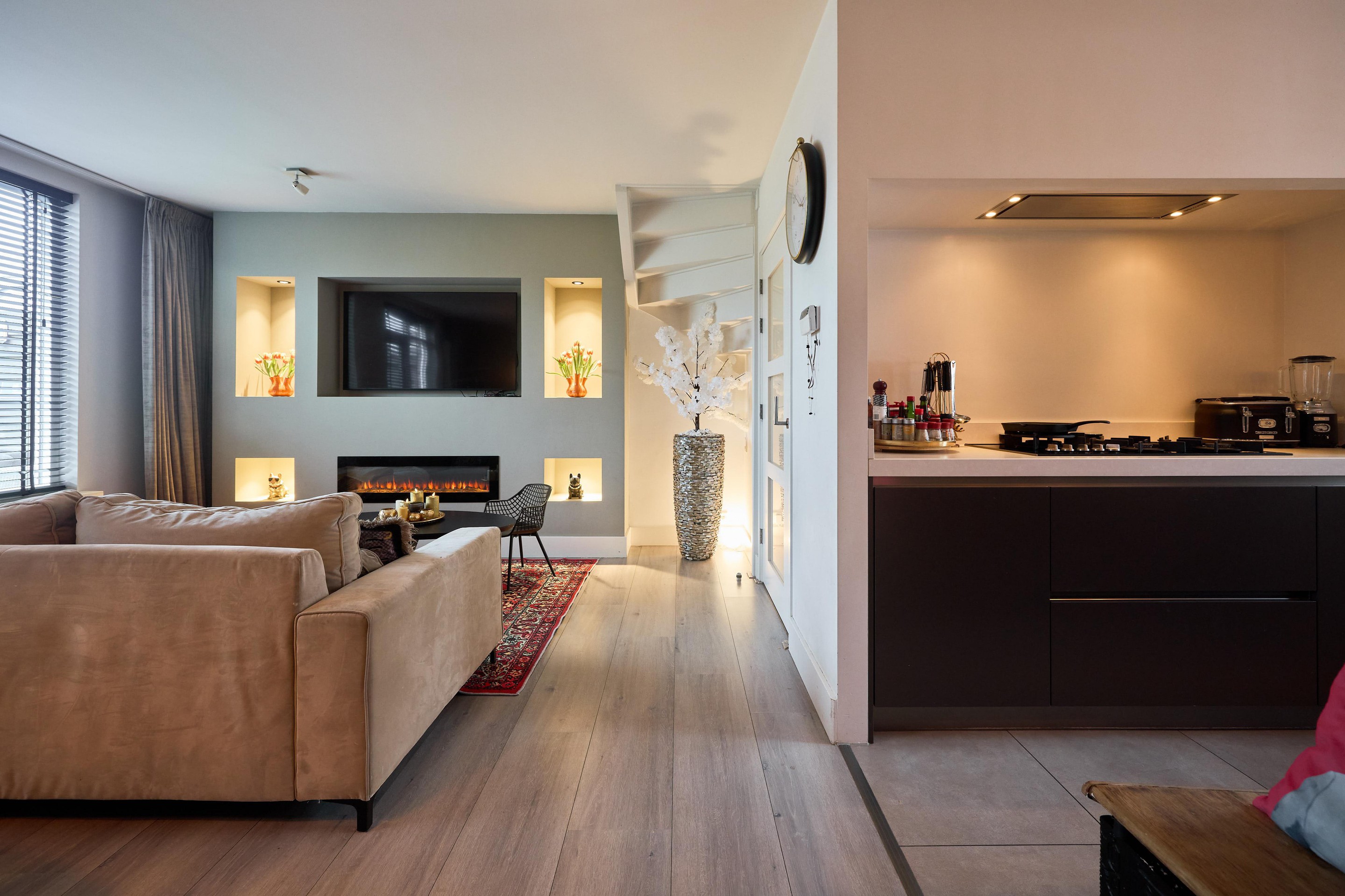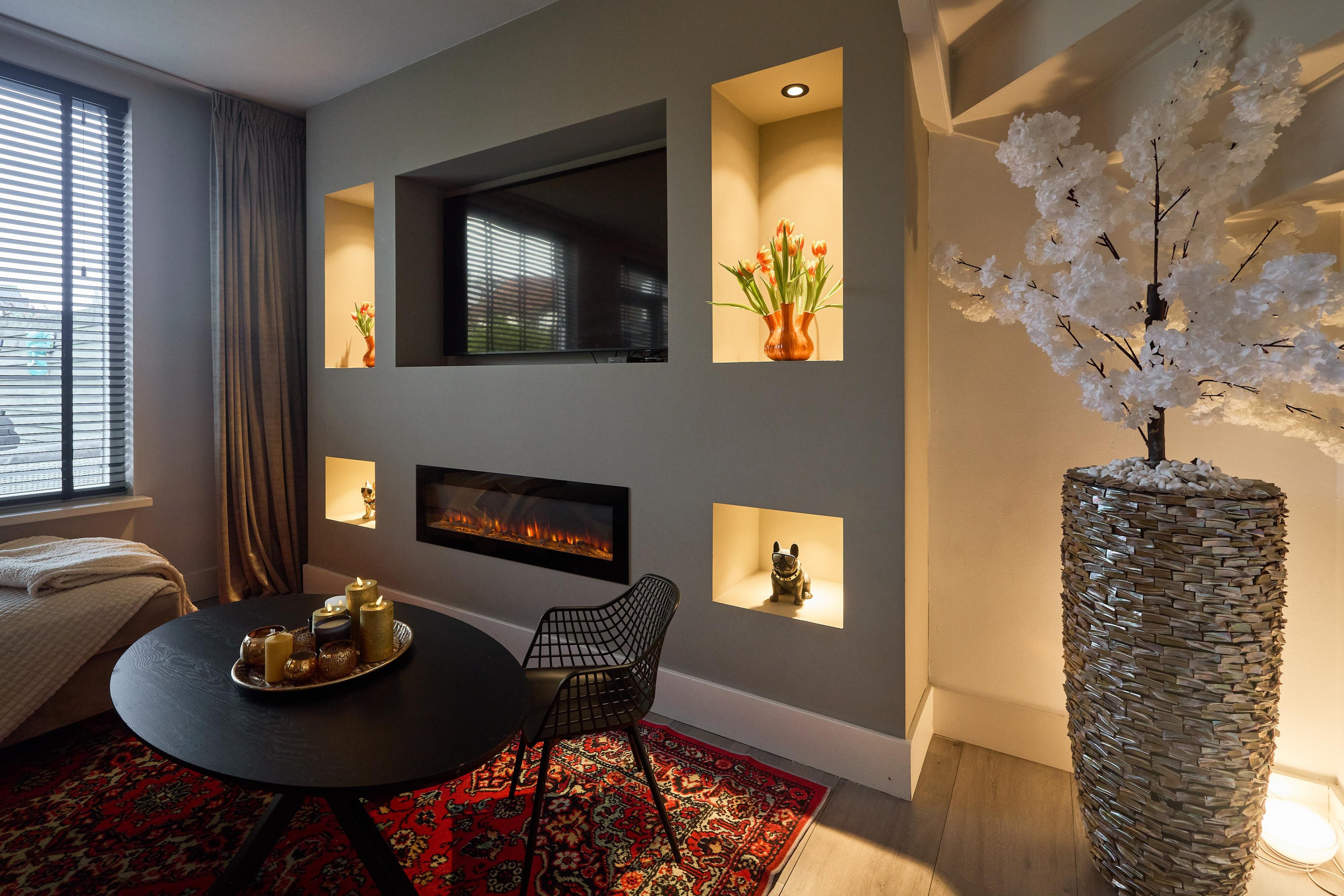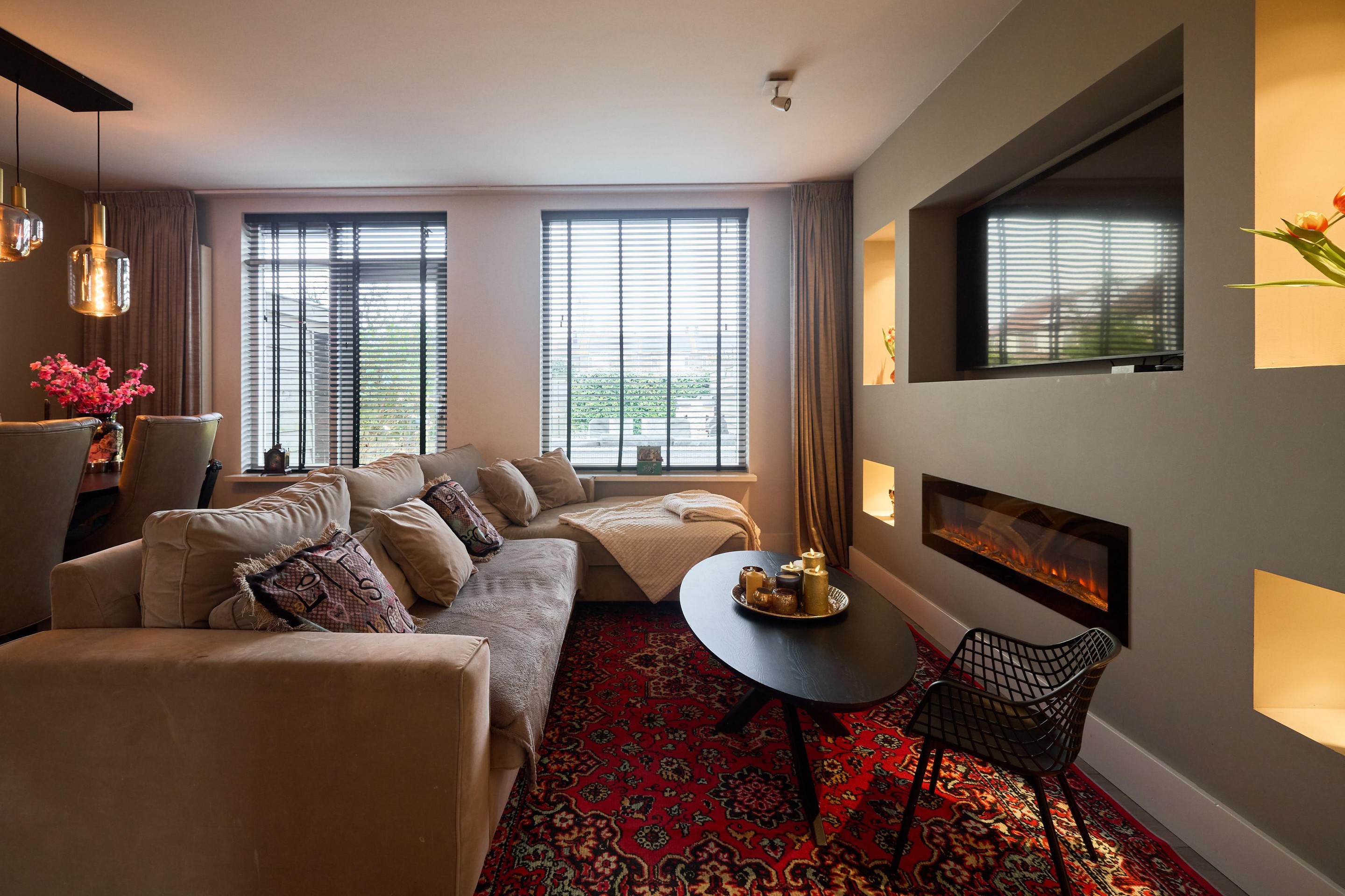 - Woonkamer met op maat gemaakte cinewall en elektrische haard