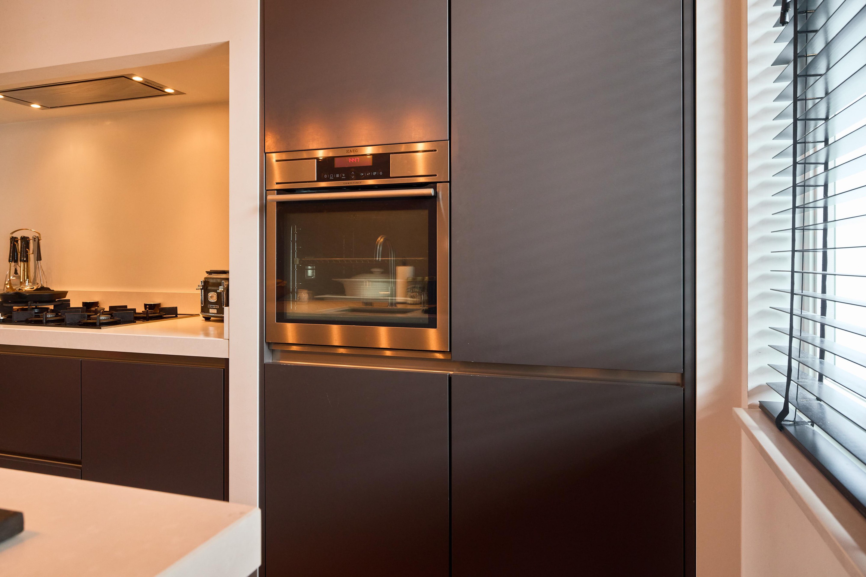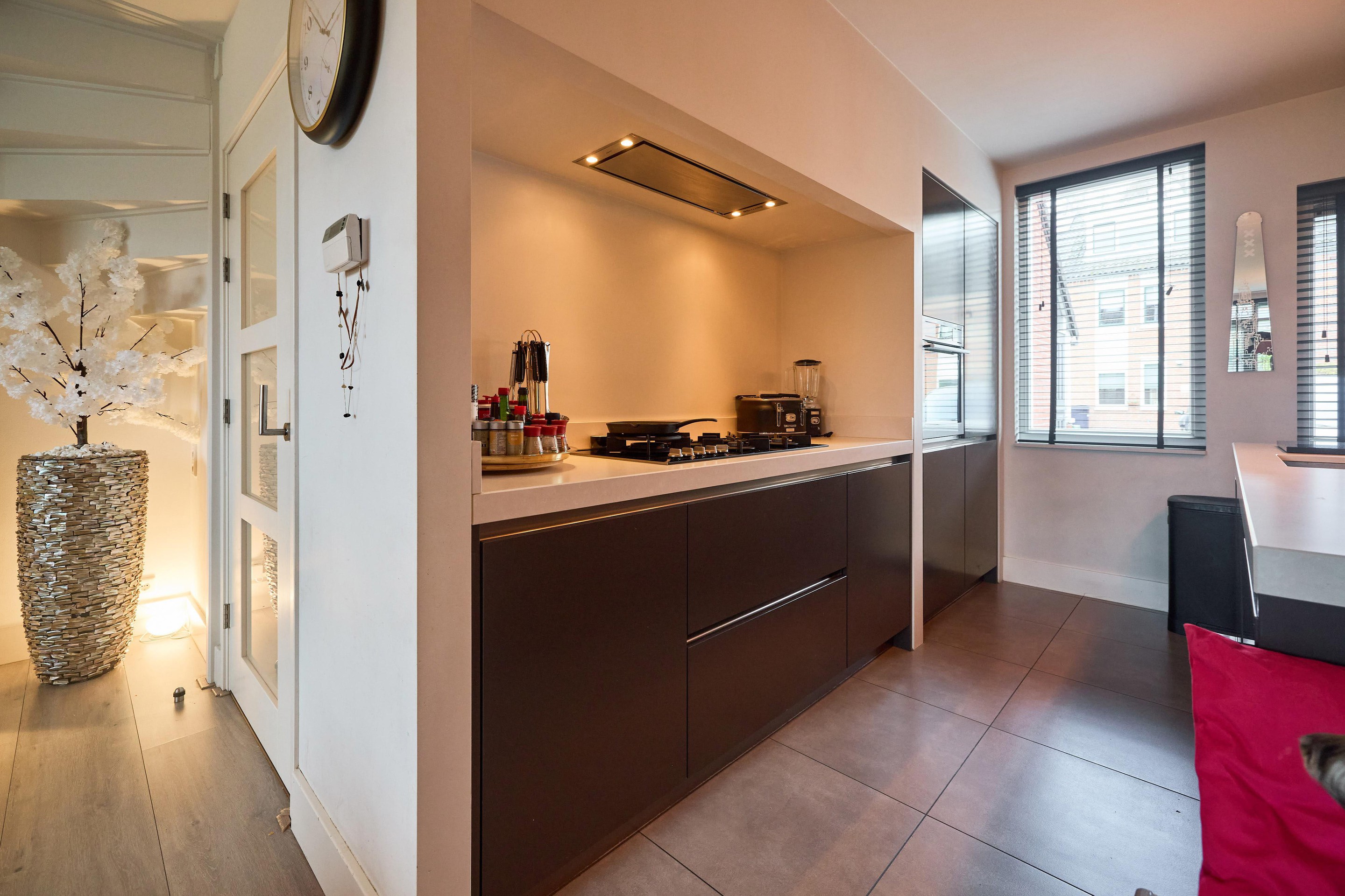 Aan de voorzijde van de woning bevindt zich de open keuken, uitgevoerd met een ruime keukenopstelling met barfunctie, geschikt voor twee tot drie barkrukken. De keuken is strak vormgegeven en voorzien van hoogwaardige inbouwapparatuur, waaronder een 5-pits ATAG gaskookplaat, Siemens vaatwasmachine, Novy afzuigkap, Liebherr koelkast en vriezer en een AEG oven. De keukenopstelling beschikt over kastruimte aan beide zijden en is aan beide kanten voorzien van elektra-aansluitingen, wat het gebruiksgemak vergroot. Het warme water in de keuken wordt verzorgd via een 10-liter elektrische boiler met A-label. Deze keuken vormt daarmee een centrale en praktische plek waar koken en samenkomen moeiteloos samengaan.