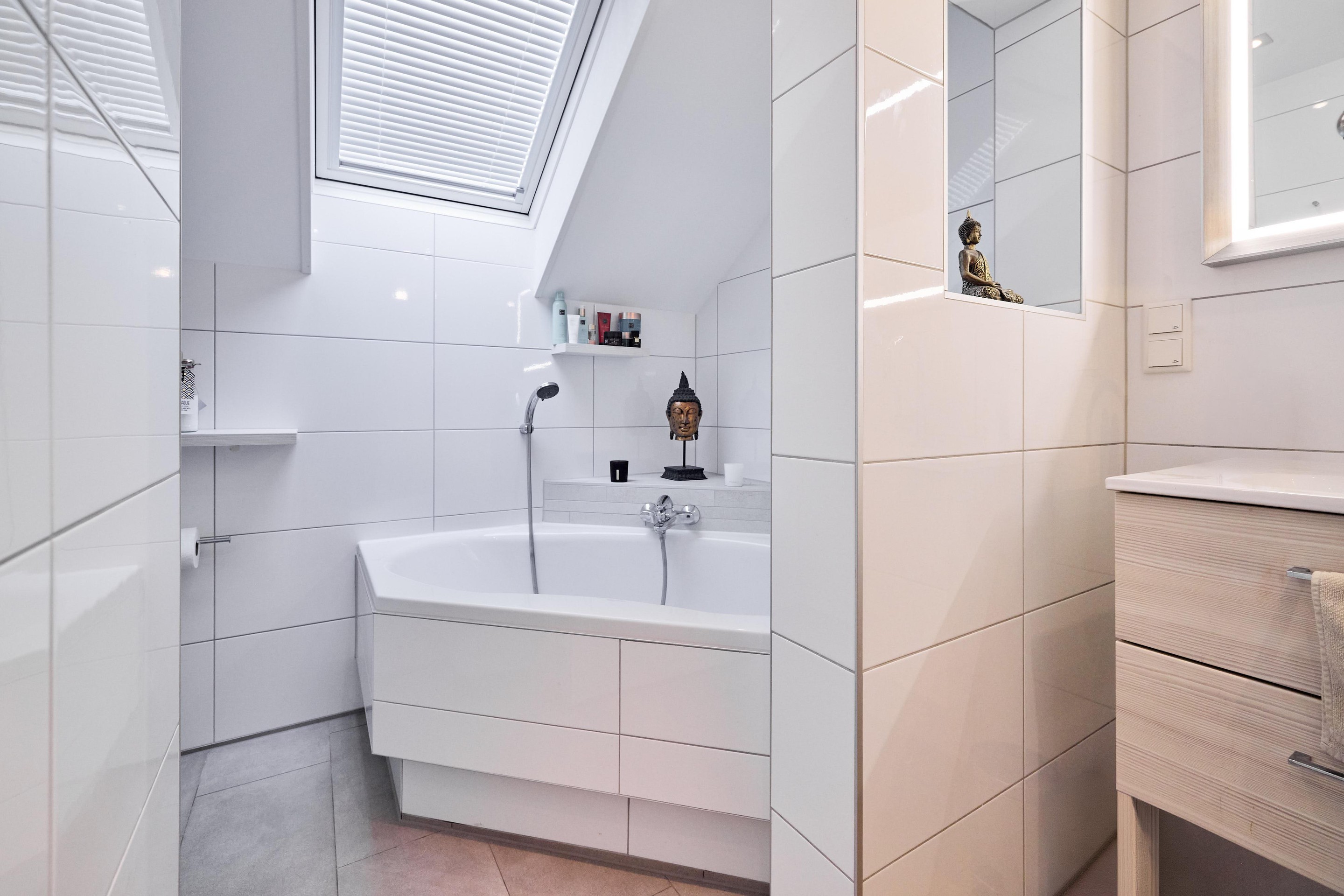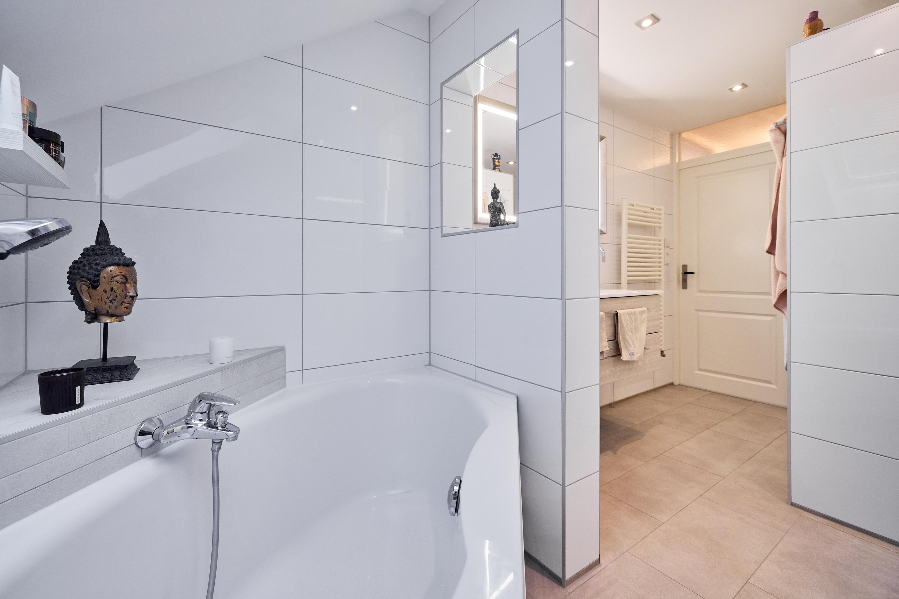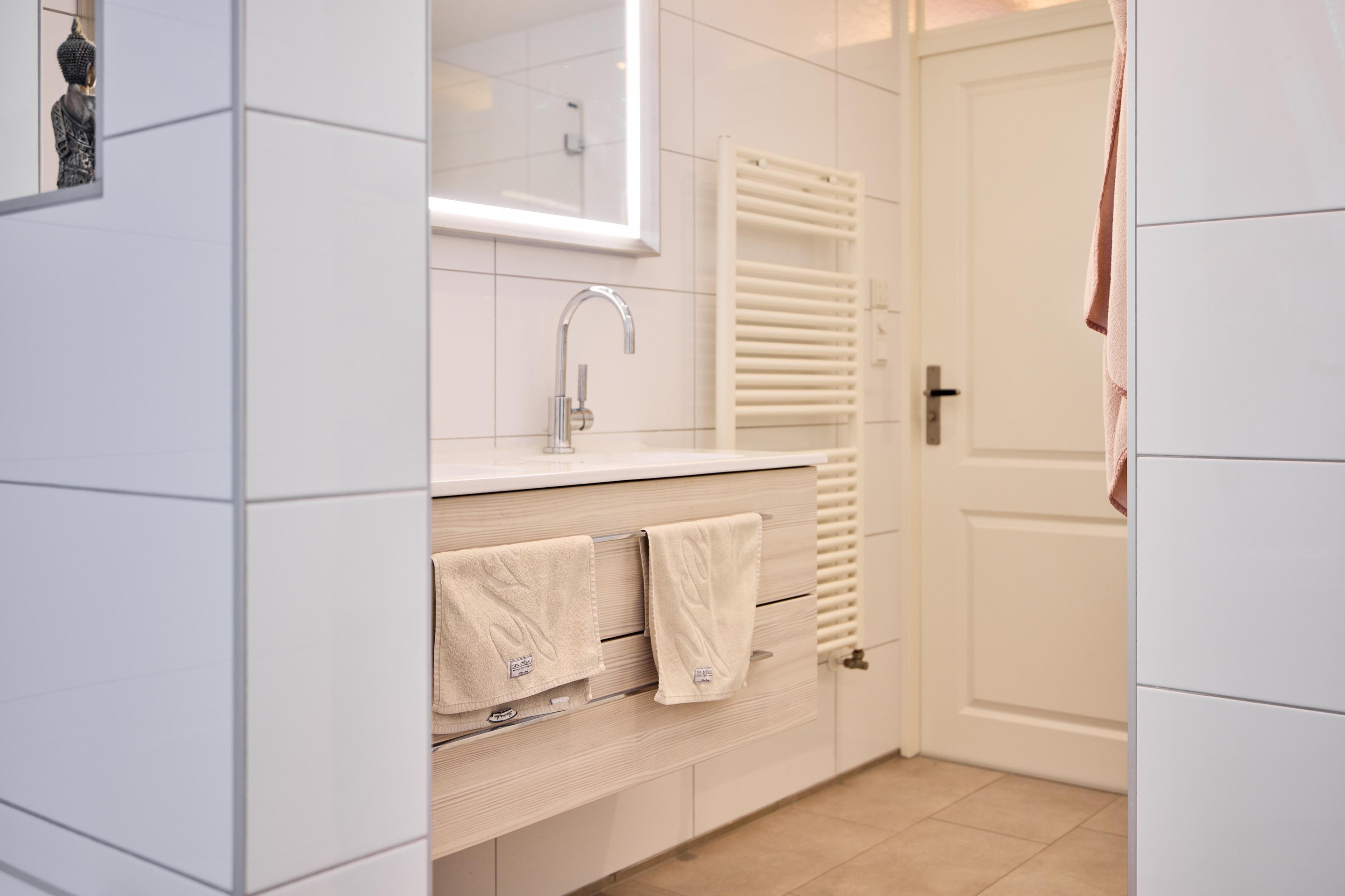 De badkamer is een echte blikvanger en onderscheidt zich duidelijk van wat je doorgaans tegenkomt. Deze prachtig uitgevoerde ruimte is voorzien van een dubbel wastafelmeubel, toilet, ligbad en een royale inloopdouche. Het dakraam zorgt voor prettig daglicht en extra ruimtelijkheid. De hoogwaardige afwerking, gecombineerd met de luxe spiegel met geïntegreerde verlichting, maakt dit een badkamer die je zelden zo ziet en die elke dag aanvoelt als een comfortabele wellnessruimte.