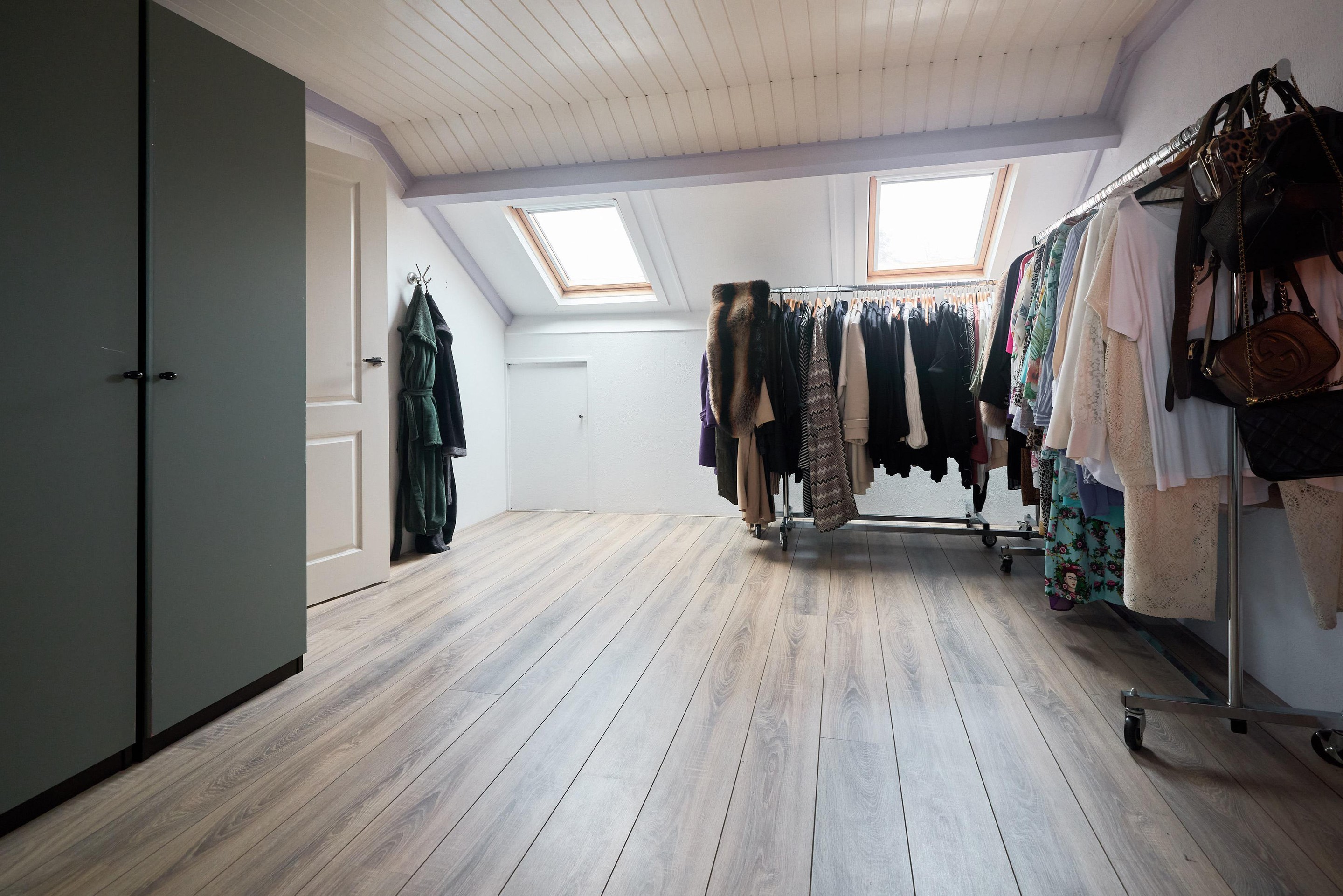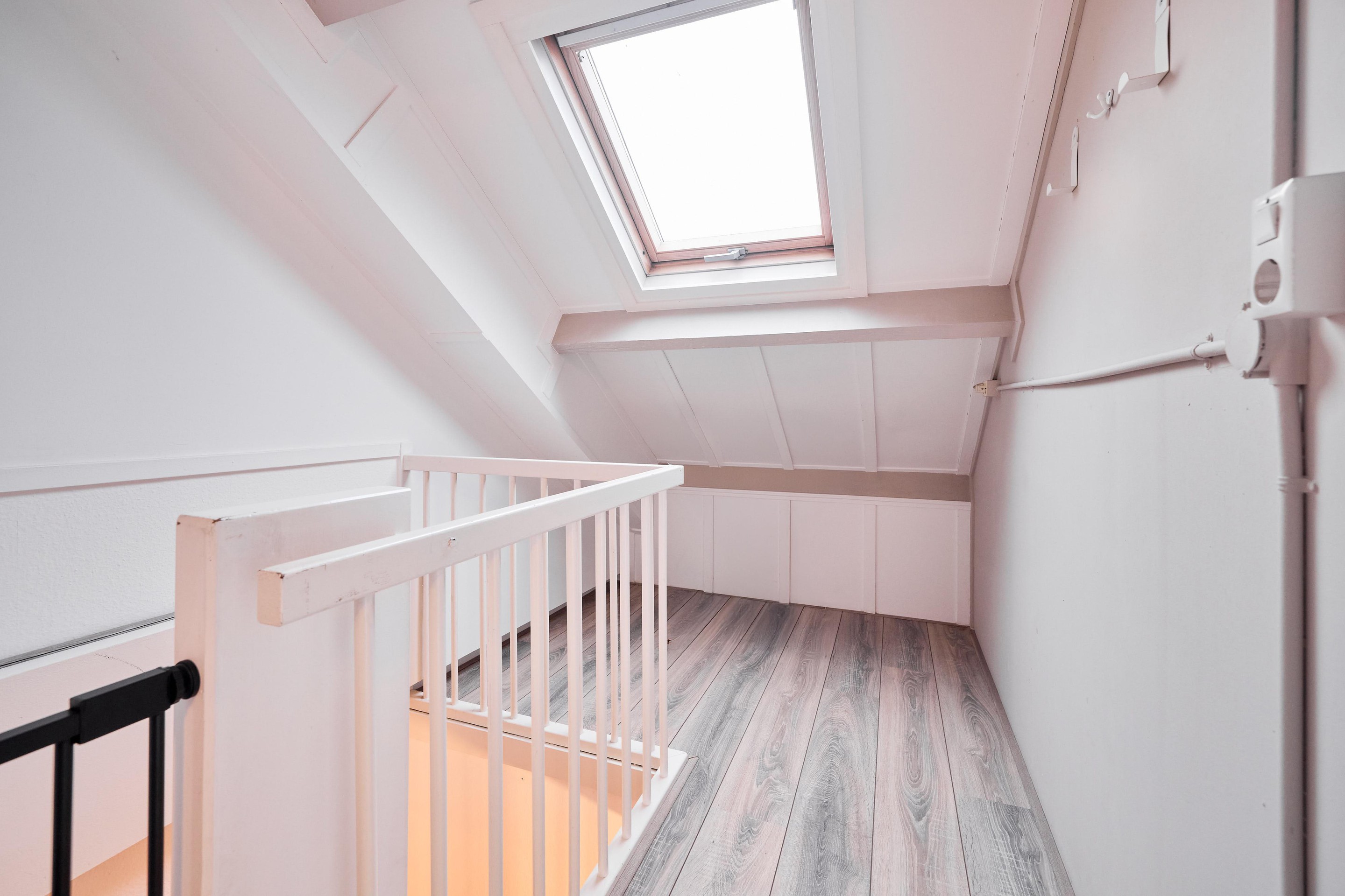 De slaapkamer is een volwaardige en prettige ruimte met een fijne lichtinval dankzij de dakramen. De kamer leent zich uitstekend voor gebruik als extra slaapkamer, werkruimte of een combinatie daarvan. Ook hier ligt dezelfde mooie laminaatvloer en achter de knieschotten is extra bergruimte aanwezig.