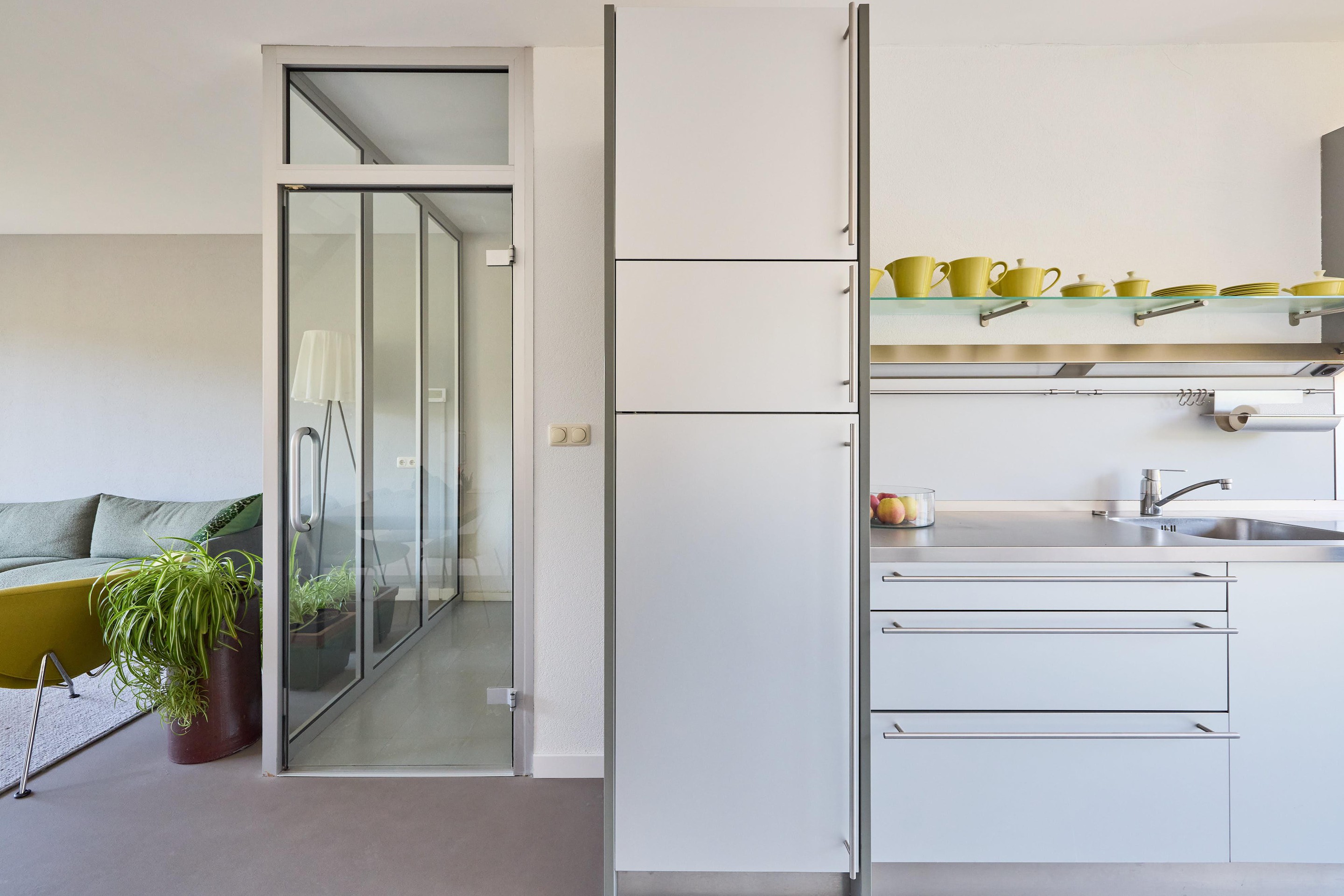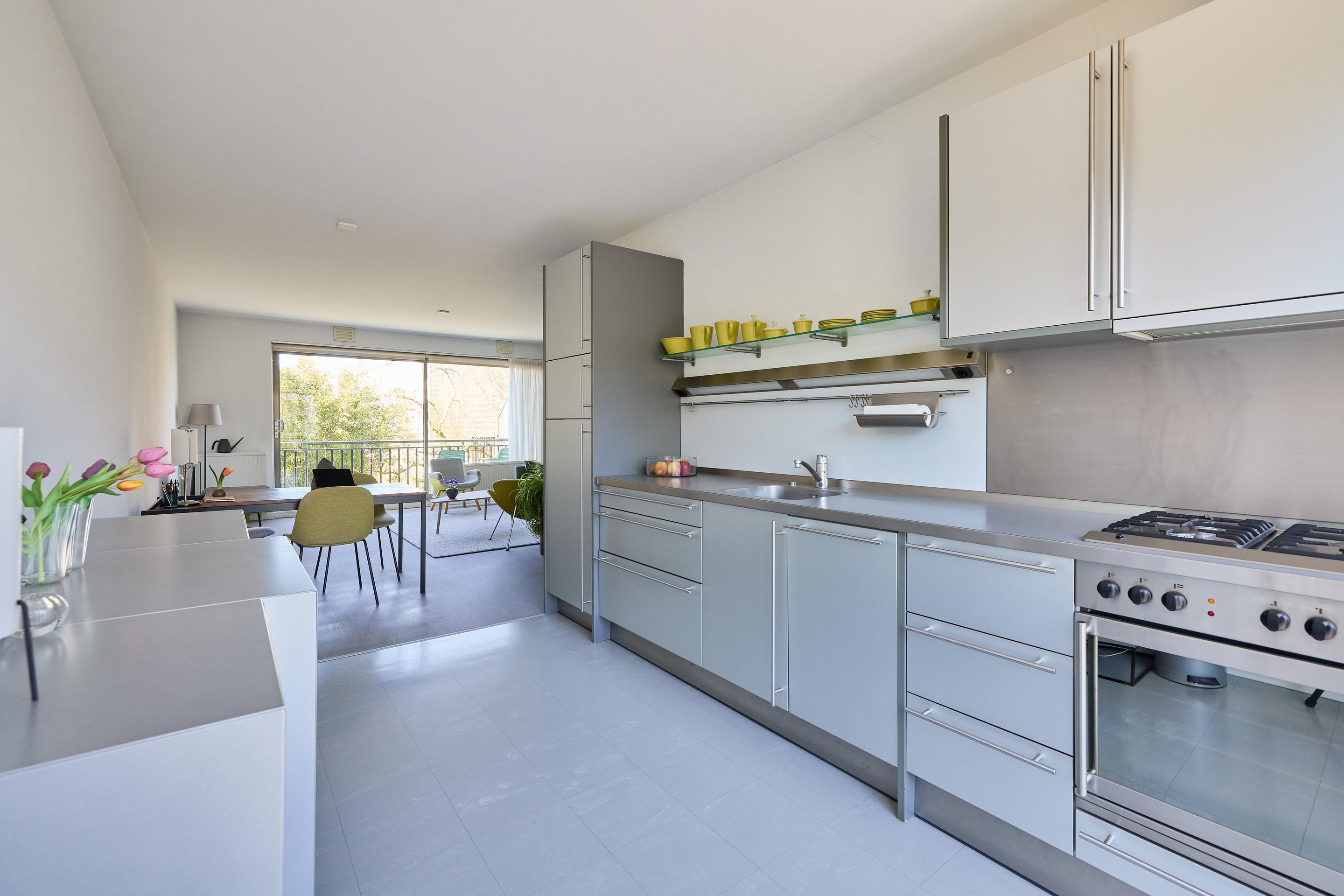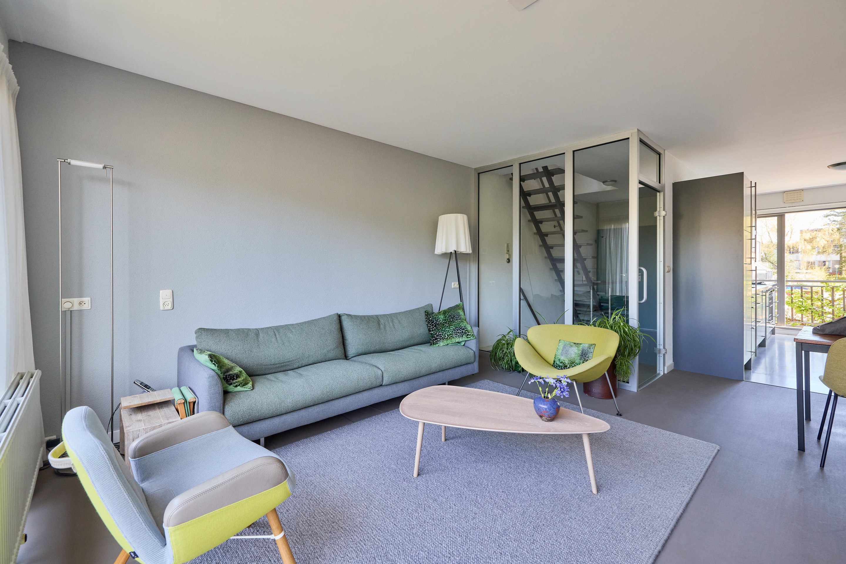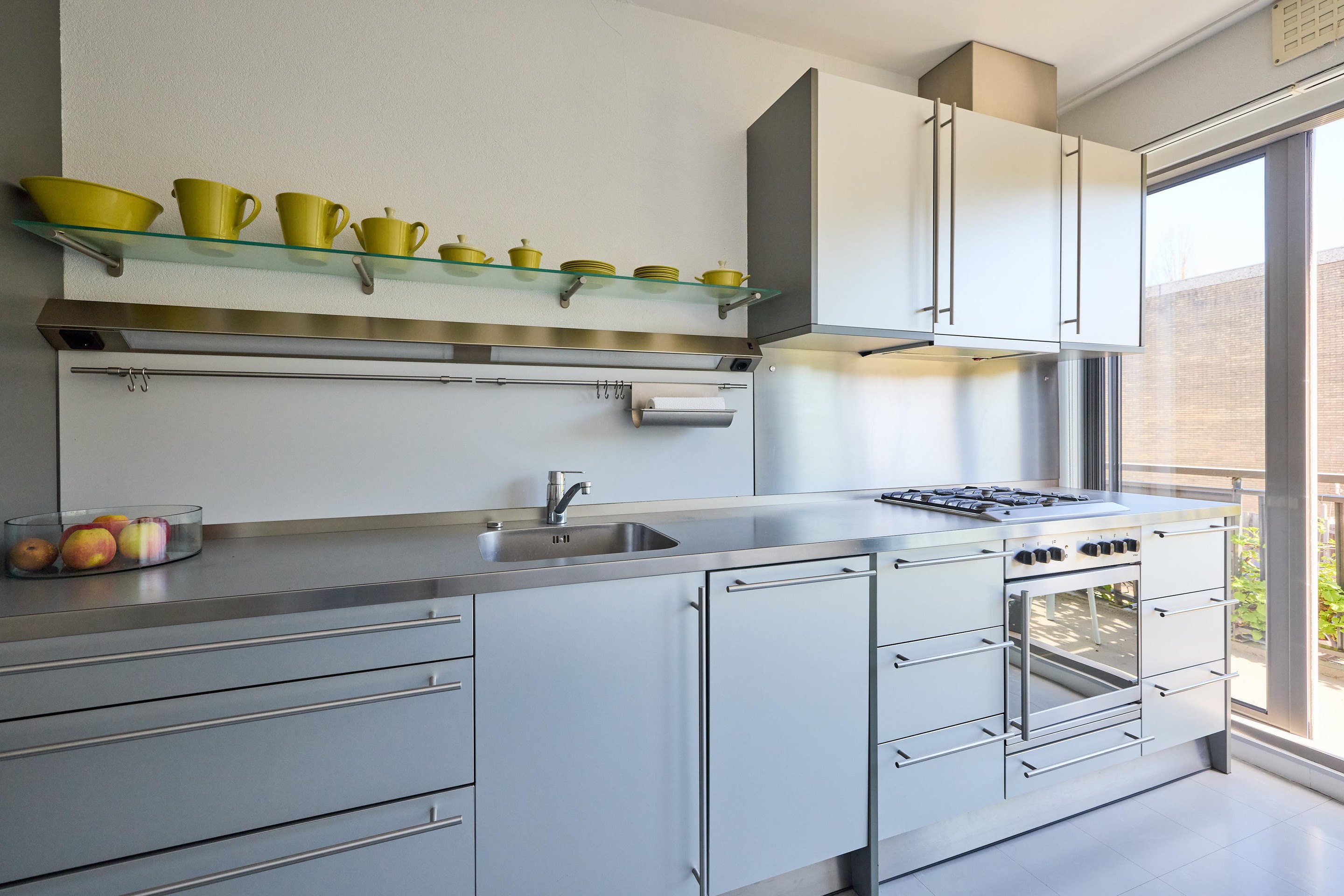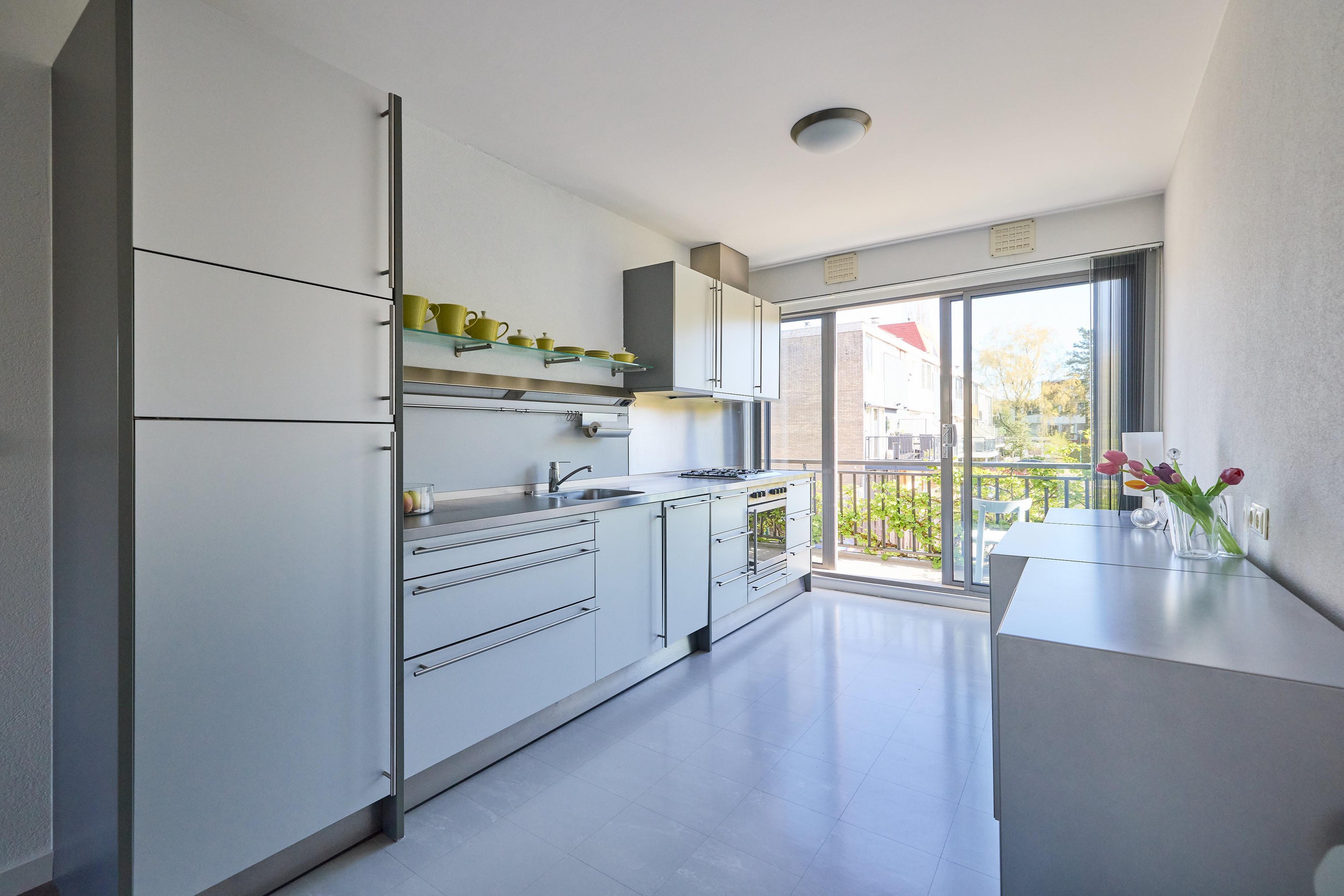 Eerste verdieping Op de eerste verdieping kom je op de overloop met toegang tot een separaat toilet en de opstelling van de cv-ketel (Remeha Calenta Ace 40c, 2018). Aan de voorzijde bevindt zich de moderne keuken, uitgevoerd in een strakke opstelling met veel werk- en bergruimte en voorzien van diverse inbouwapparatuur, waaronder een 4-pits gaskookplaat, afzuigkap, afwasmachine, oven en koelkast. De schuifpui zorgt voor veel lichtinval en geeft direct toegang tot het balkon aan de voorzijde, gelegen op het noordoosten. Aan de achterzijde ligt de woonkamer, een lichte en comfortabele leefruimte met een grote schuifpui over de volle breedte. Hierdoor ontstaat een fijne verbinding met buiten en stap je zo het balkon op, met uitzicht op de zonnige achtertuin op het zuidwesten. De moderne glazen scheidingswand geeft de verdieping een speelse indeling en zorgt voor een open en ruimtelijk gevoel.