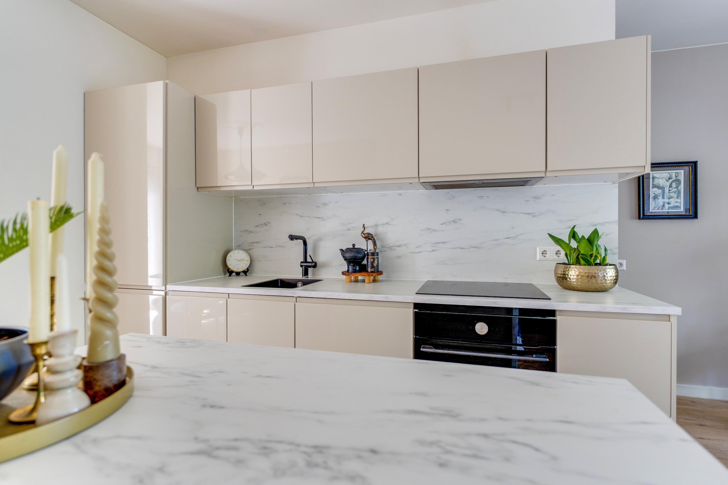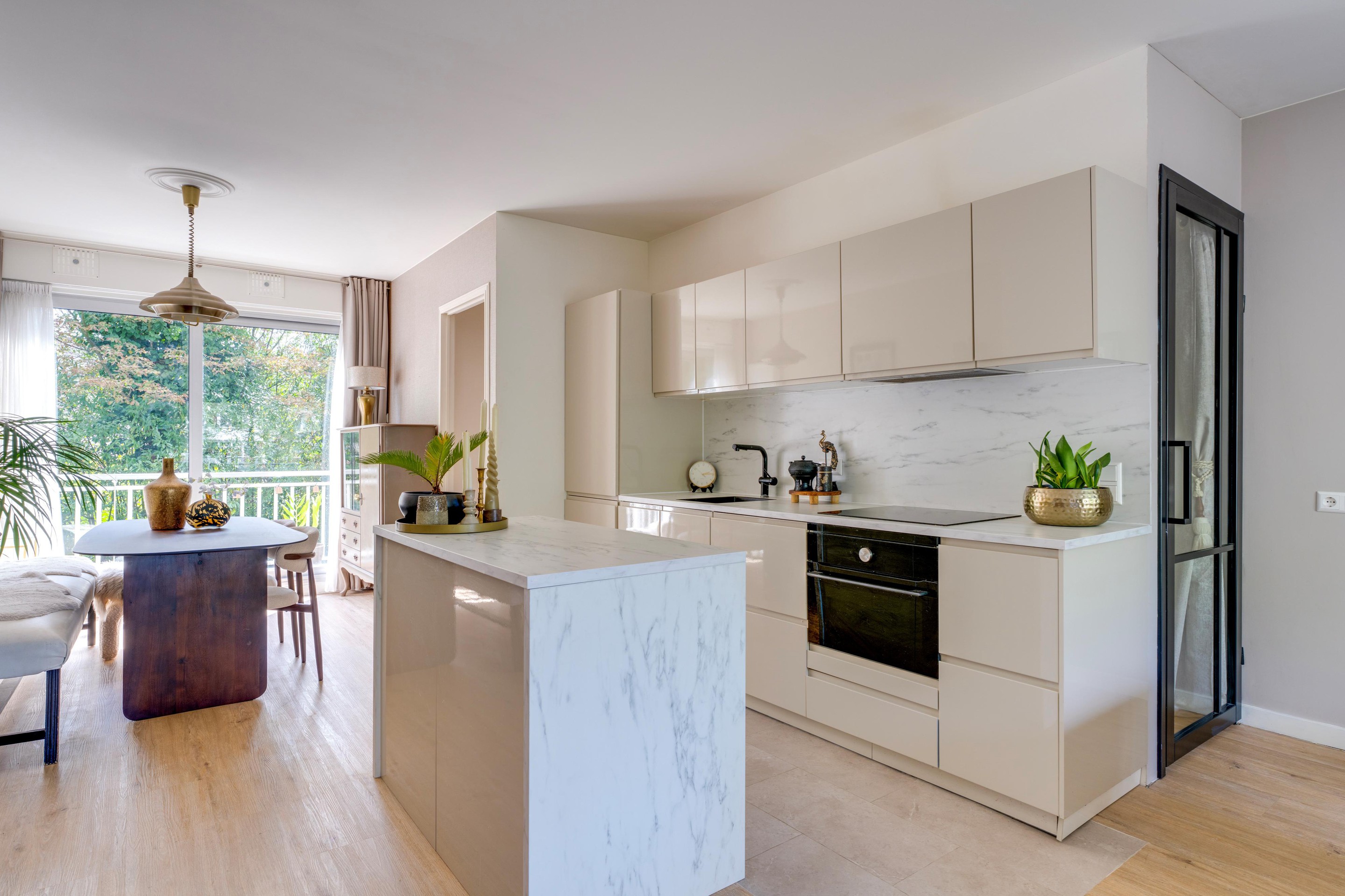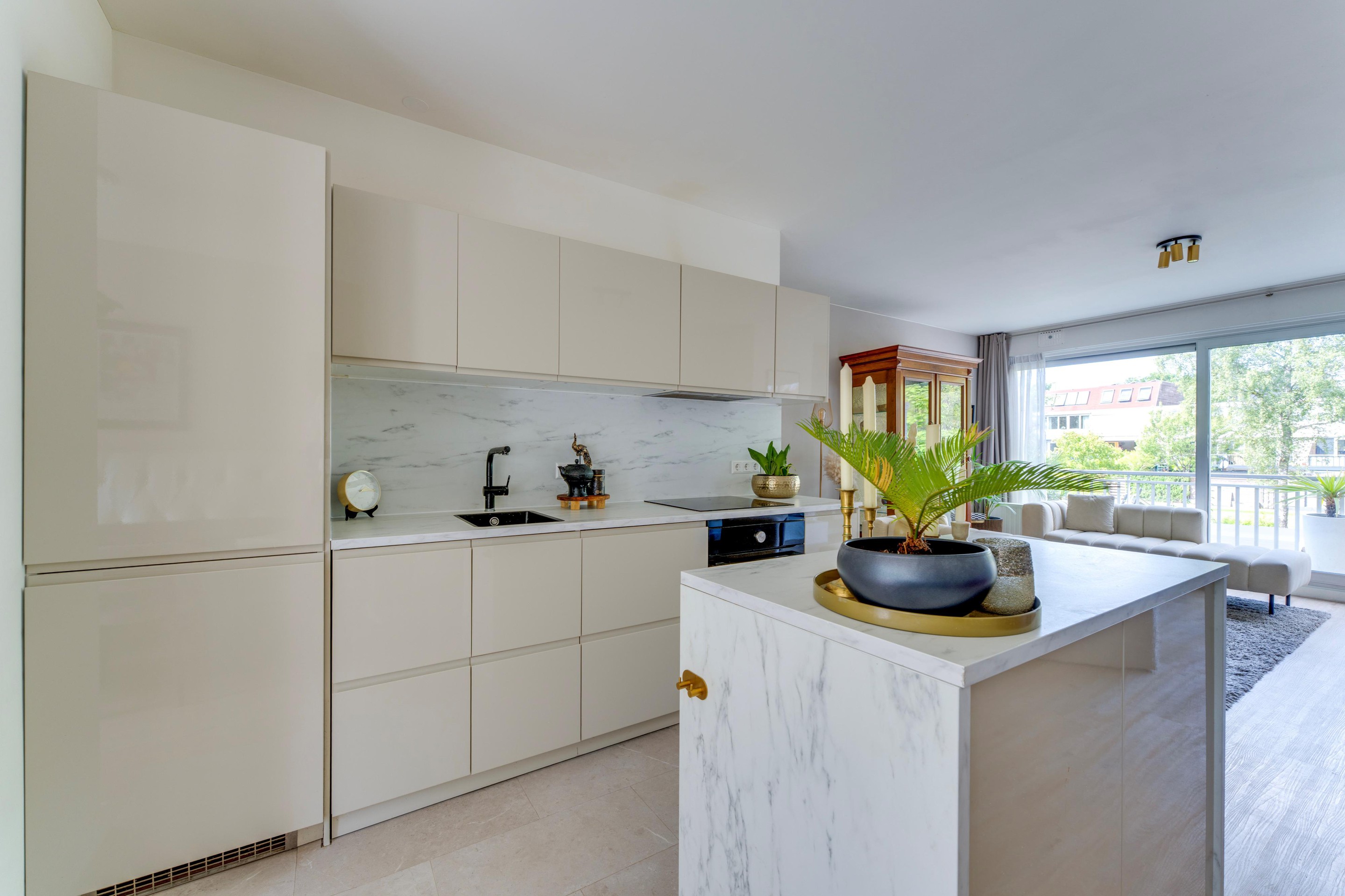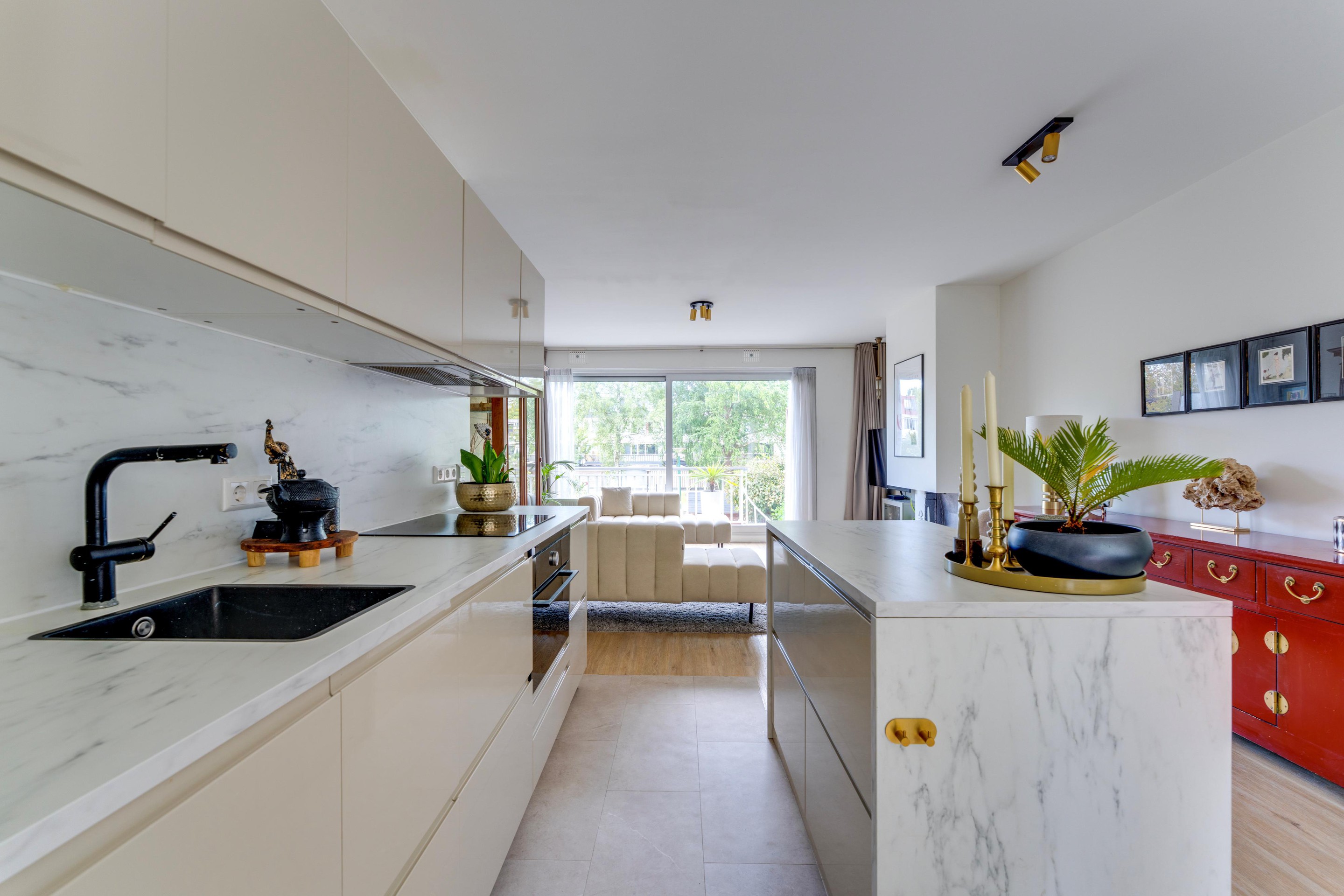 Aan de voorzijde ligt de moderne open keuken met een gezellige eethoek en toegang tot het tweede balkon, gelegen op het zuidoosten. De keuken is strak en stijlvol afgewerkt en voorzien van alle benodigde inbouwapparatuur: een 4-pits inductiekookplaat, combimagnetron, afzuigkap, koelkast, vriezer en vaatwasser. Het marmerlook werkblad geeft het geheel een luxe uitstraling.