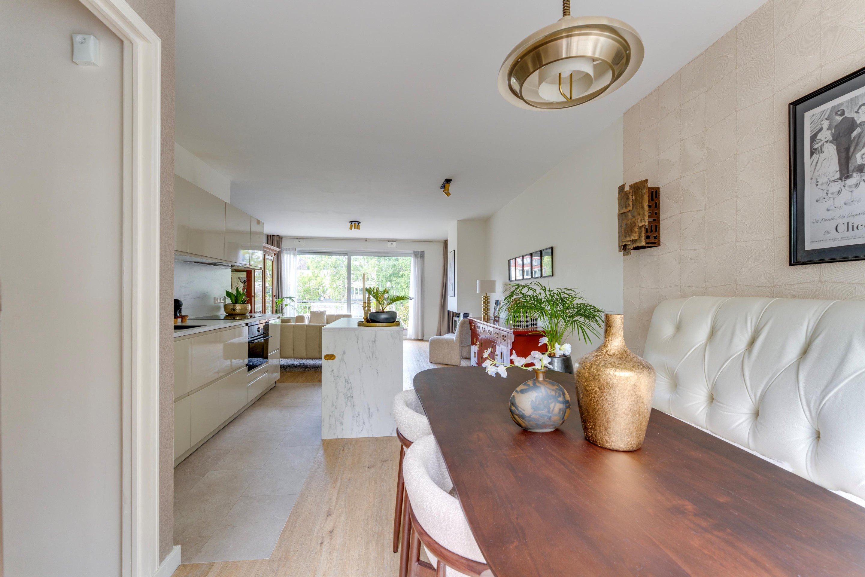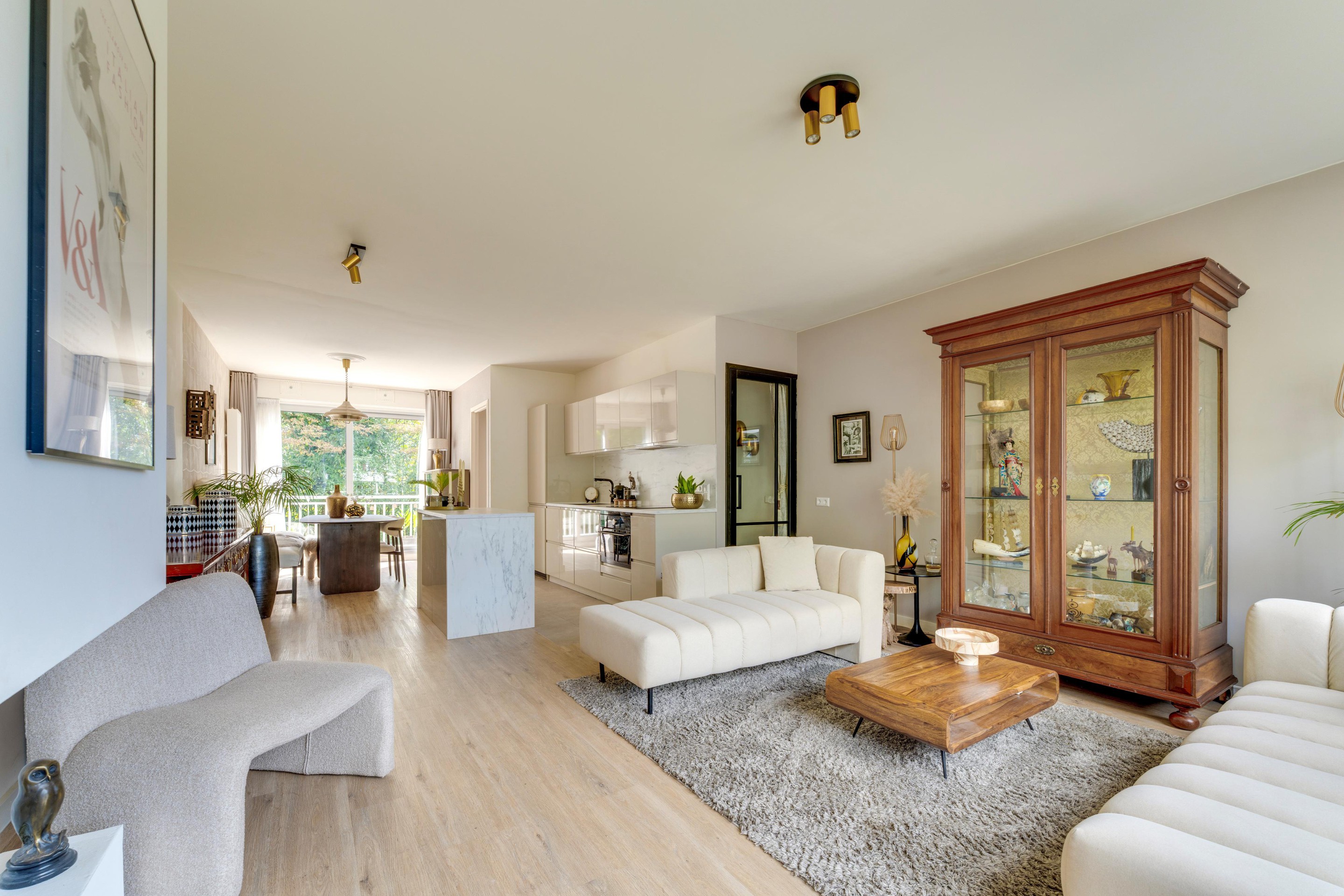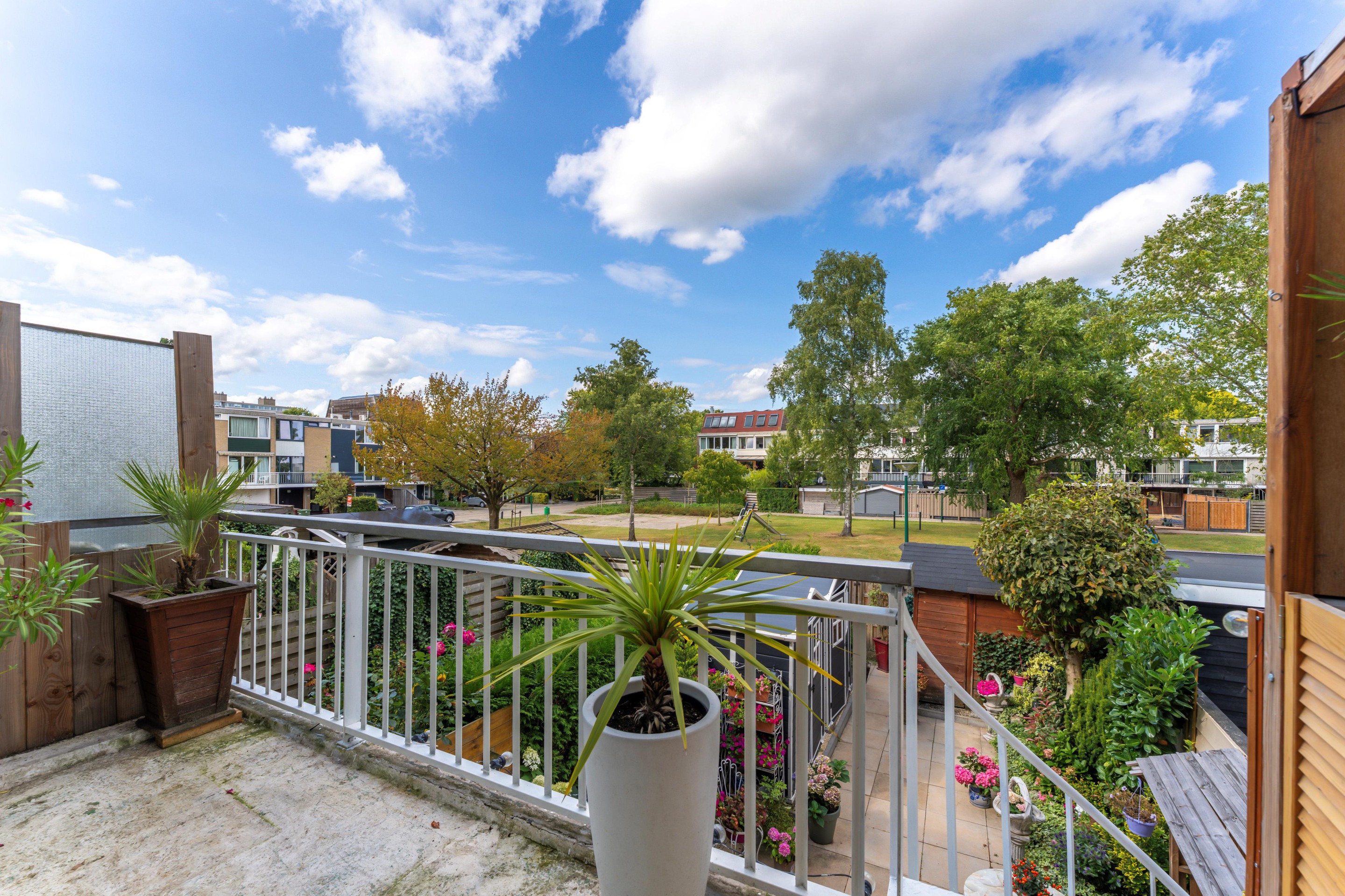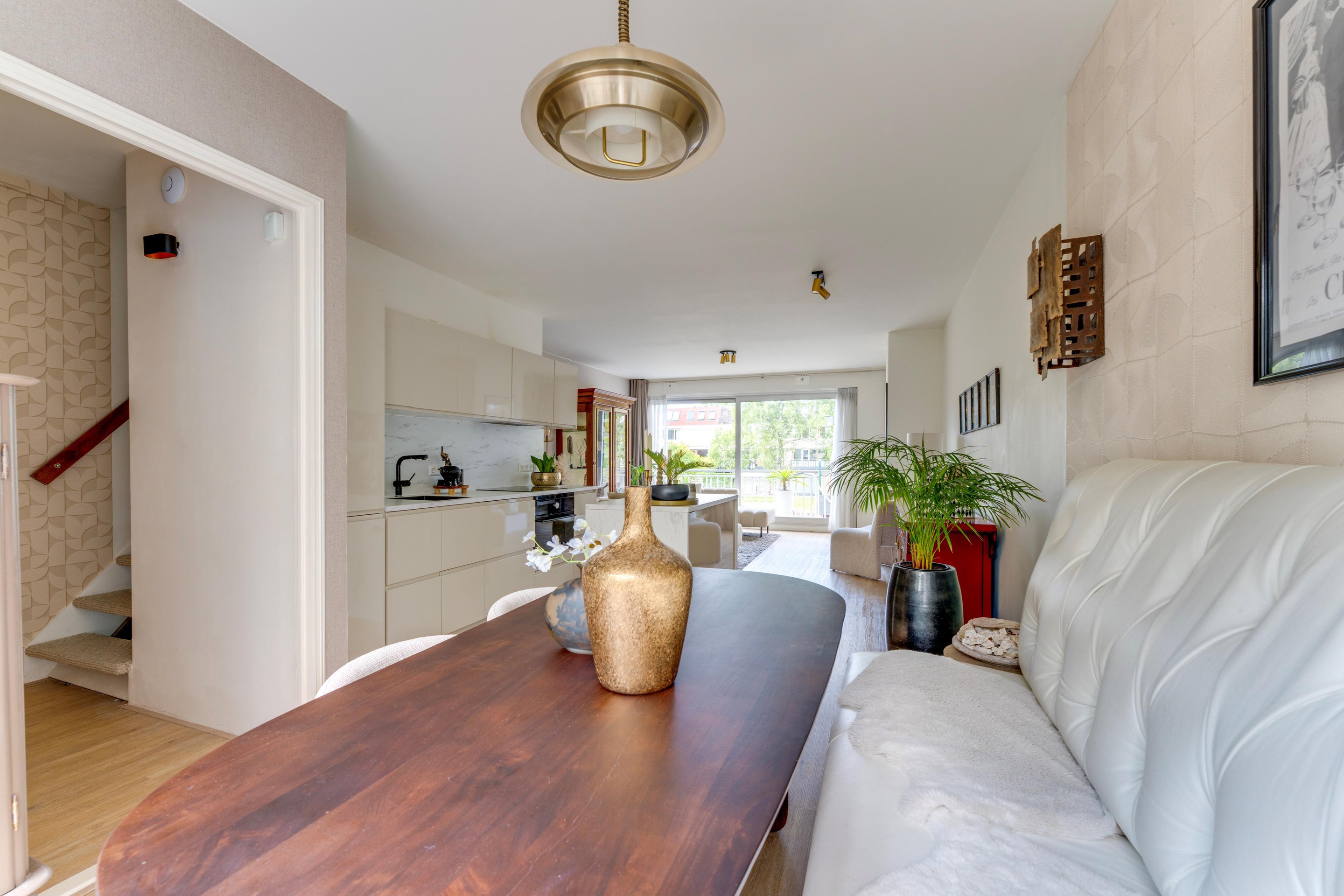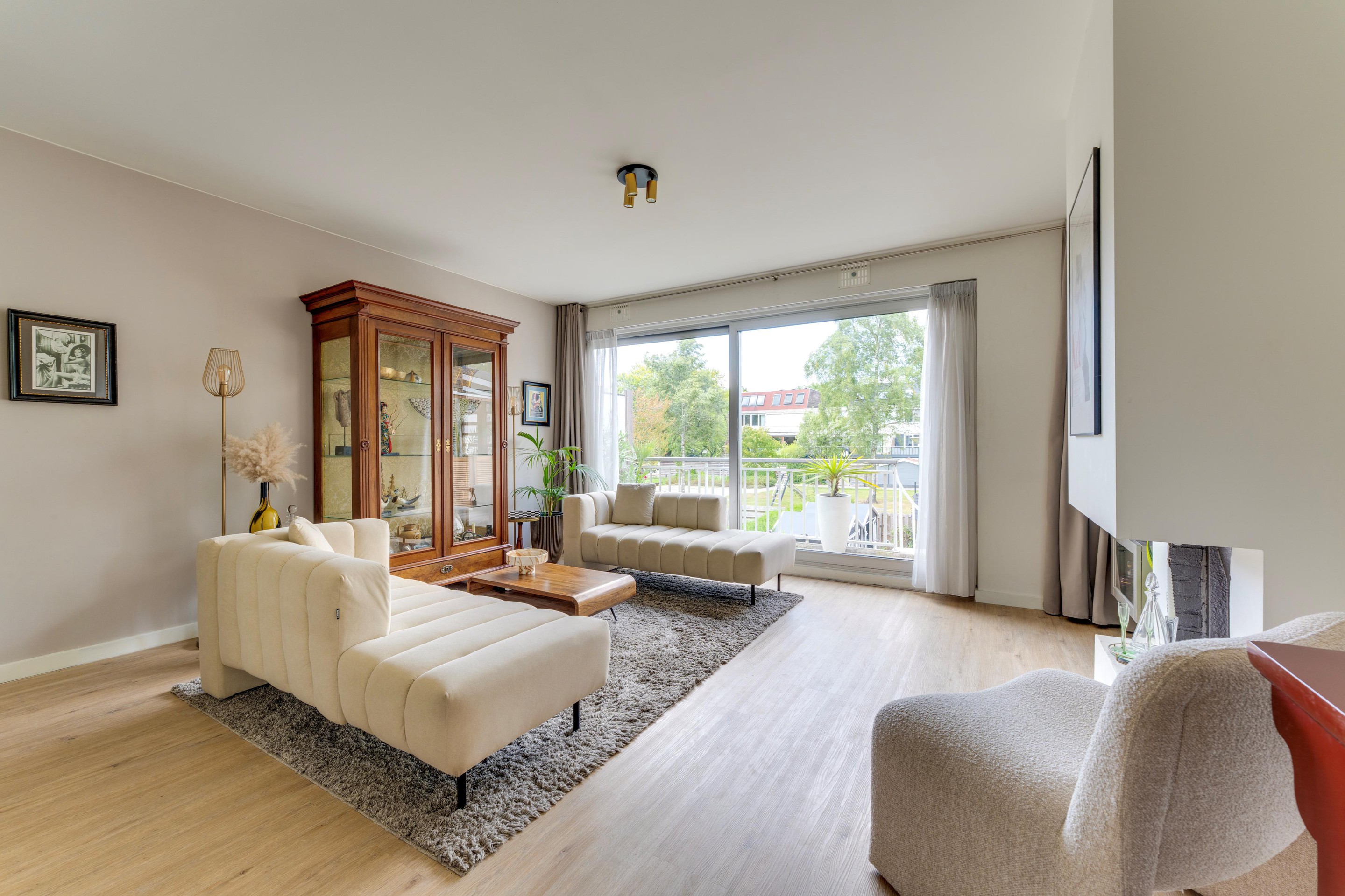 De eerste verdieping vormt het kloppend hart van deze woning. Aan de achterzijde bevindt zich de ruime en lichte woonkamer met grote schuifpui naar het balkon op het noordwesten. Hier kijk je prachtig uit over een groen plantsoen – een levendig maar ontspannen uitzicht waar je elke dag van kunt genieten. Extra fijn: via een vaste trap loop je vanaf dit balkon zó de achtertuin in.