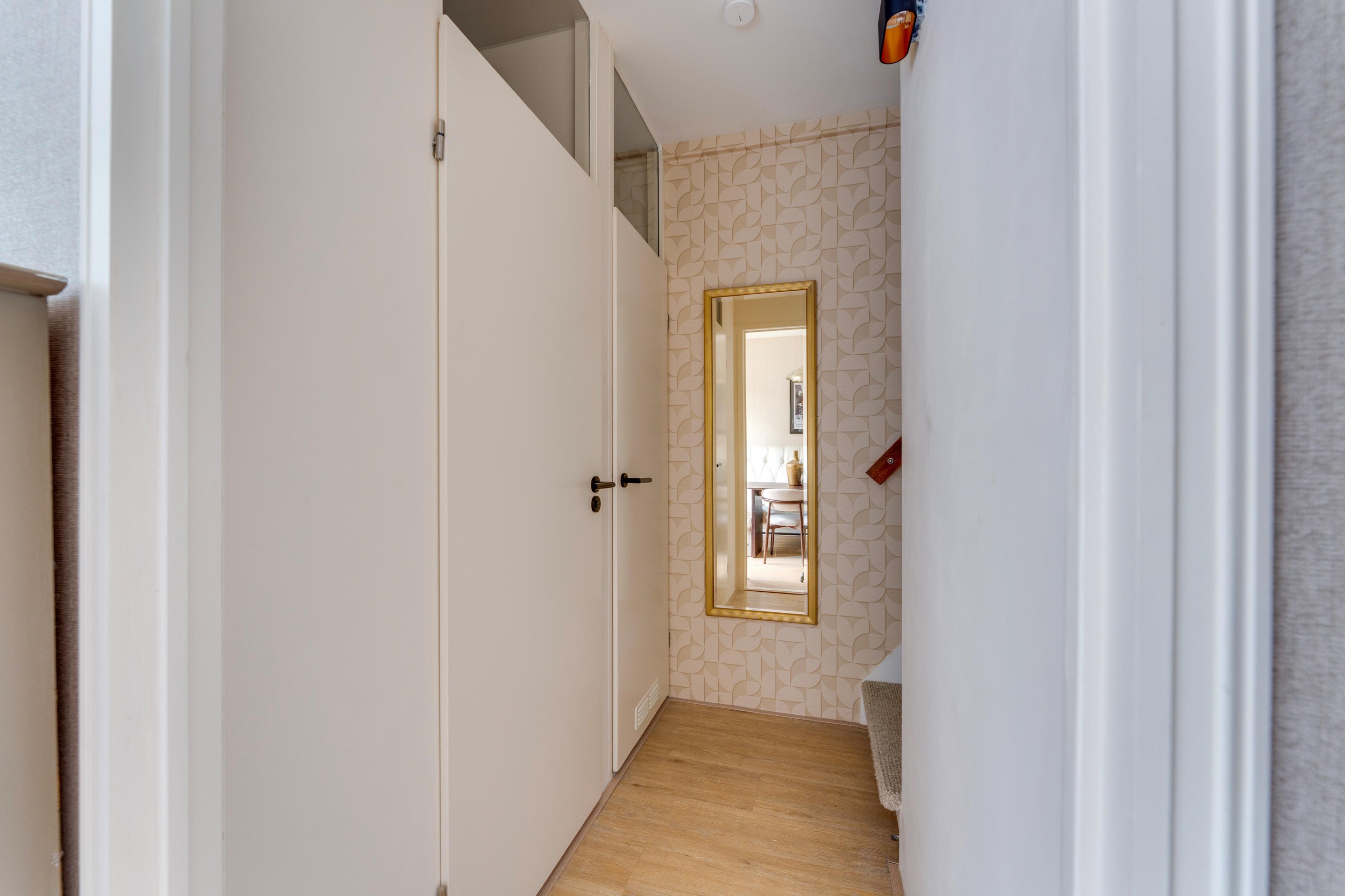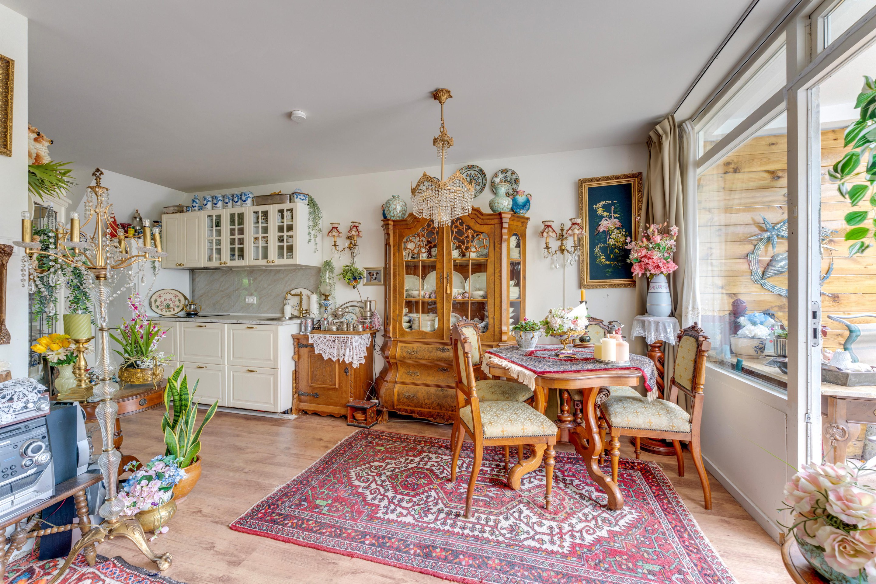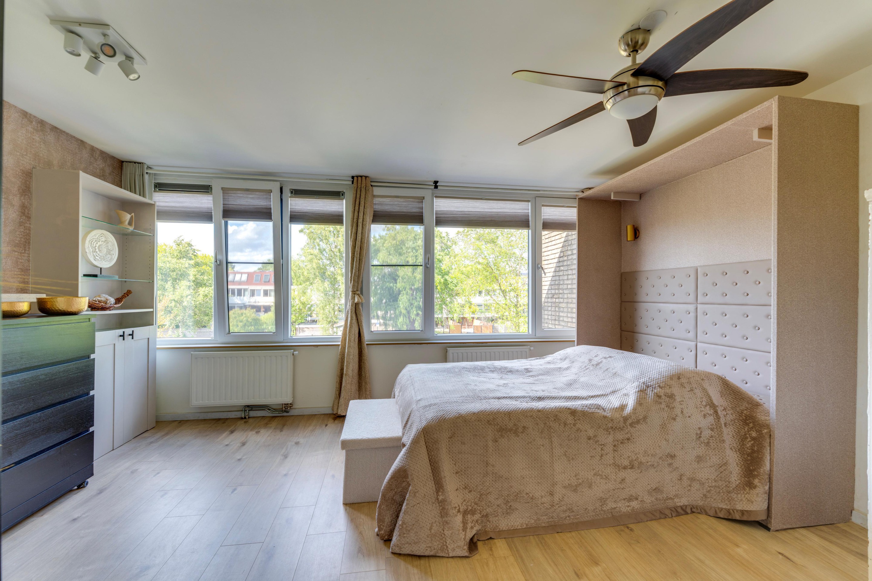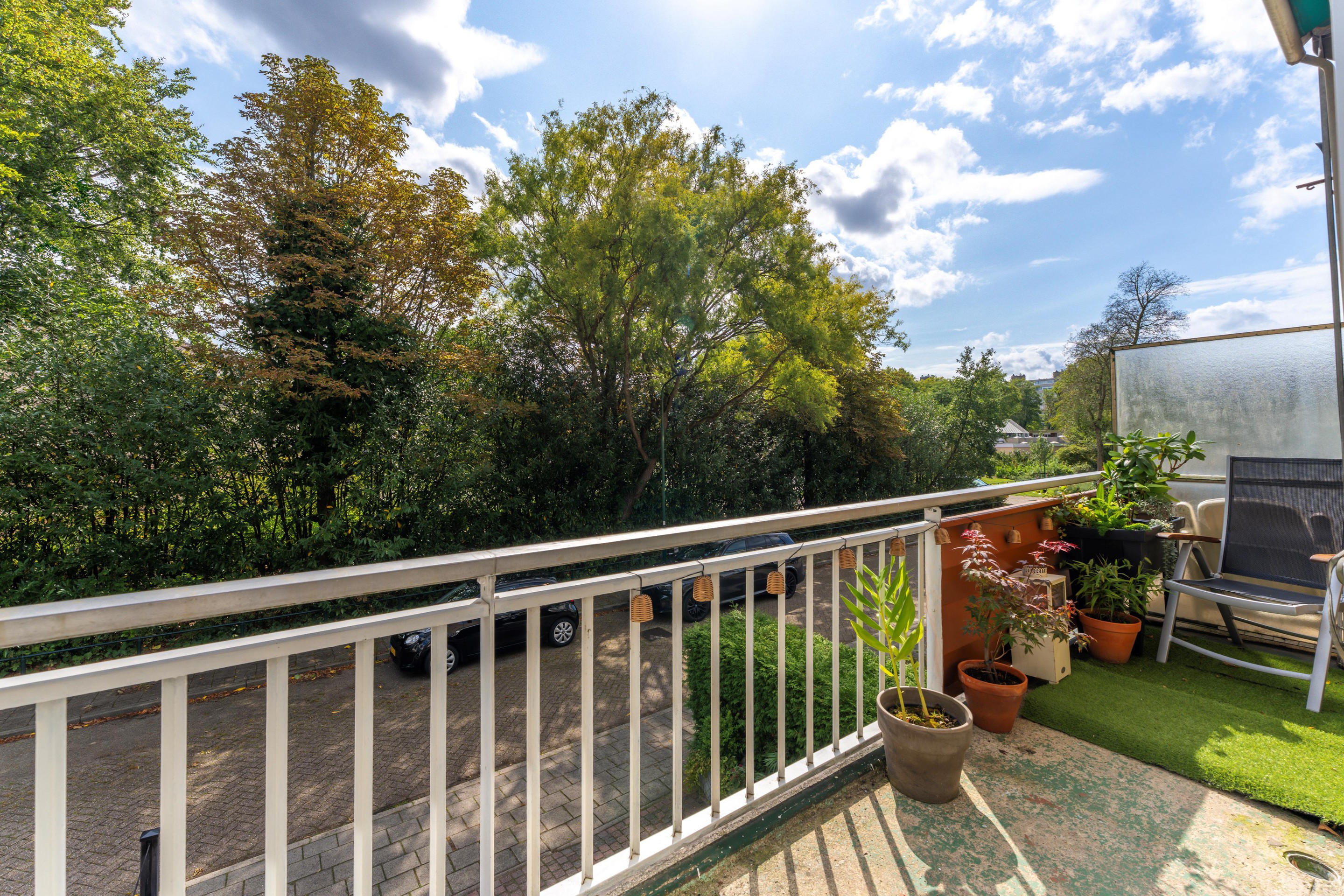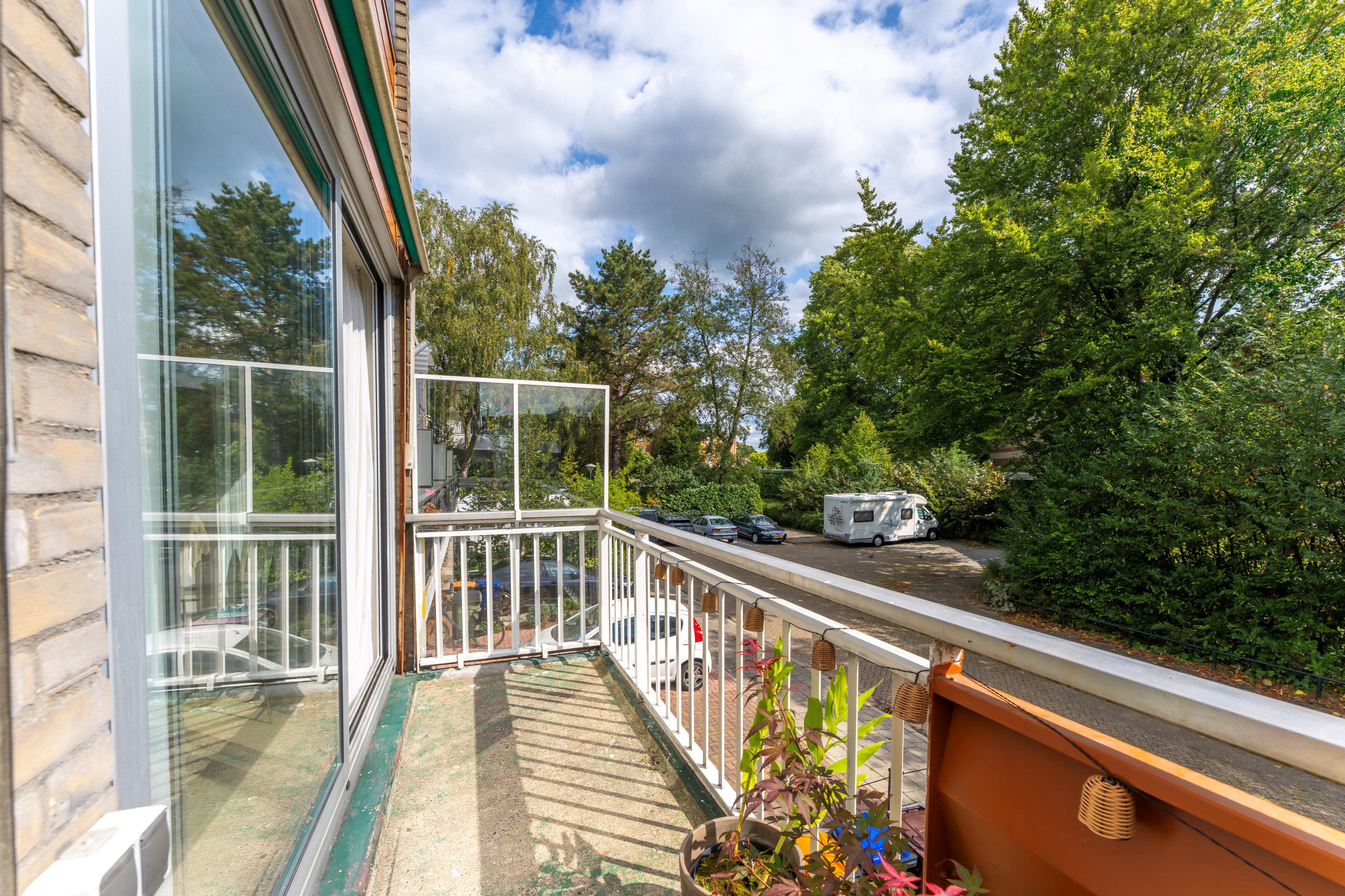 De eerste verdieping vormt het kloppend hart van deze woning. Aan de achterzijde bevindt zich de ruime en lichte woonkamer met grote schuifpui naar het balkon op het noordwesten. Hier kijk je prachtig uit over een groen plantsoen – een levendig maar ontspannen uitzicht waar je elke dag van kunt genieten. Extra fijn: via een vaste trap loop je vanaf dit balkon zó de achtertuin in.