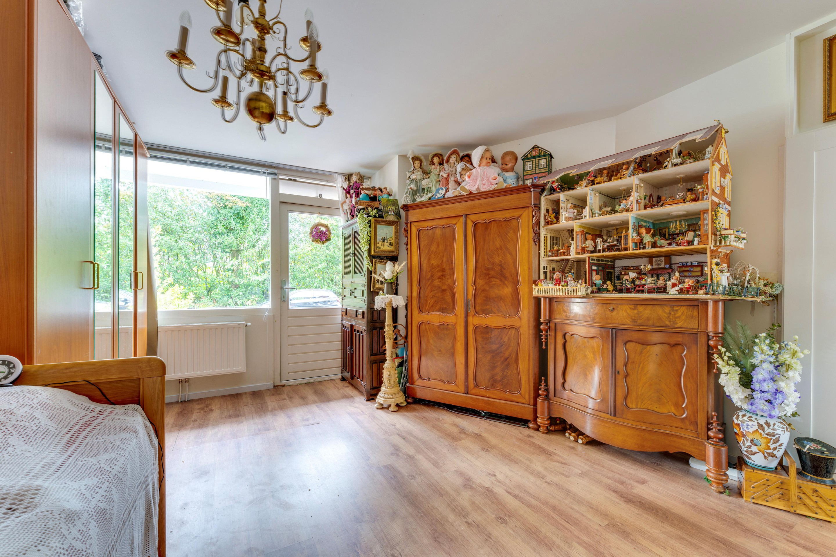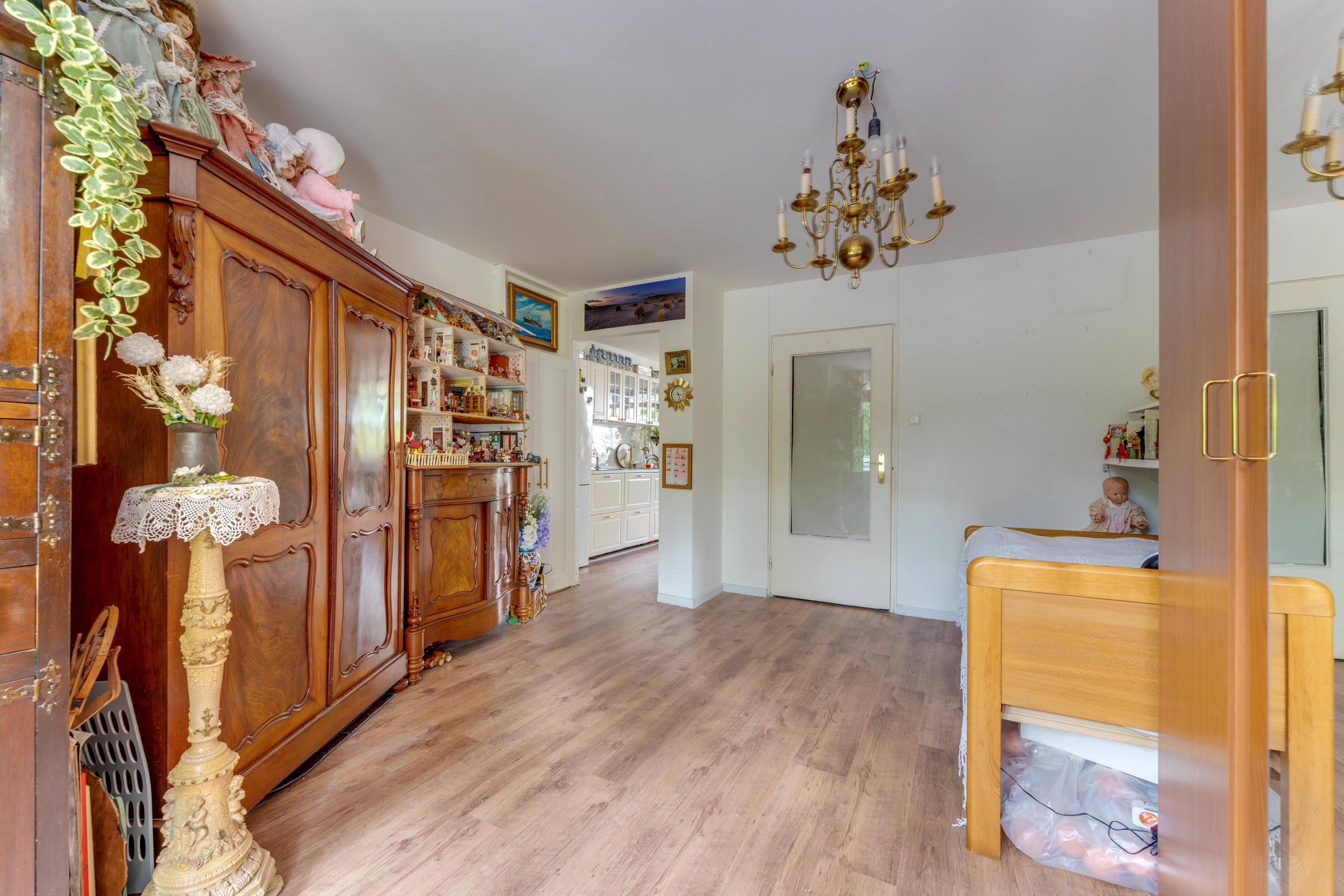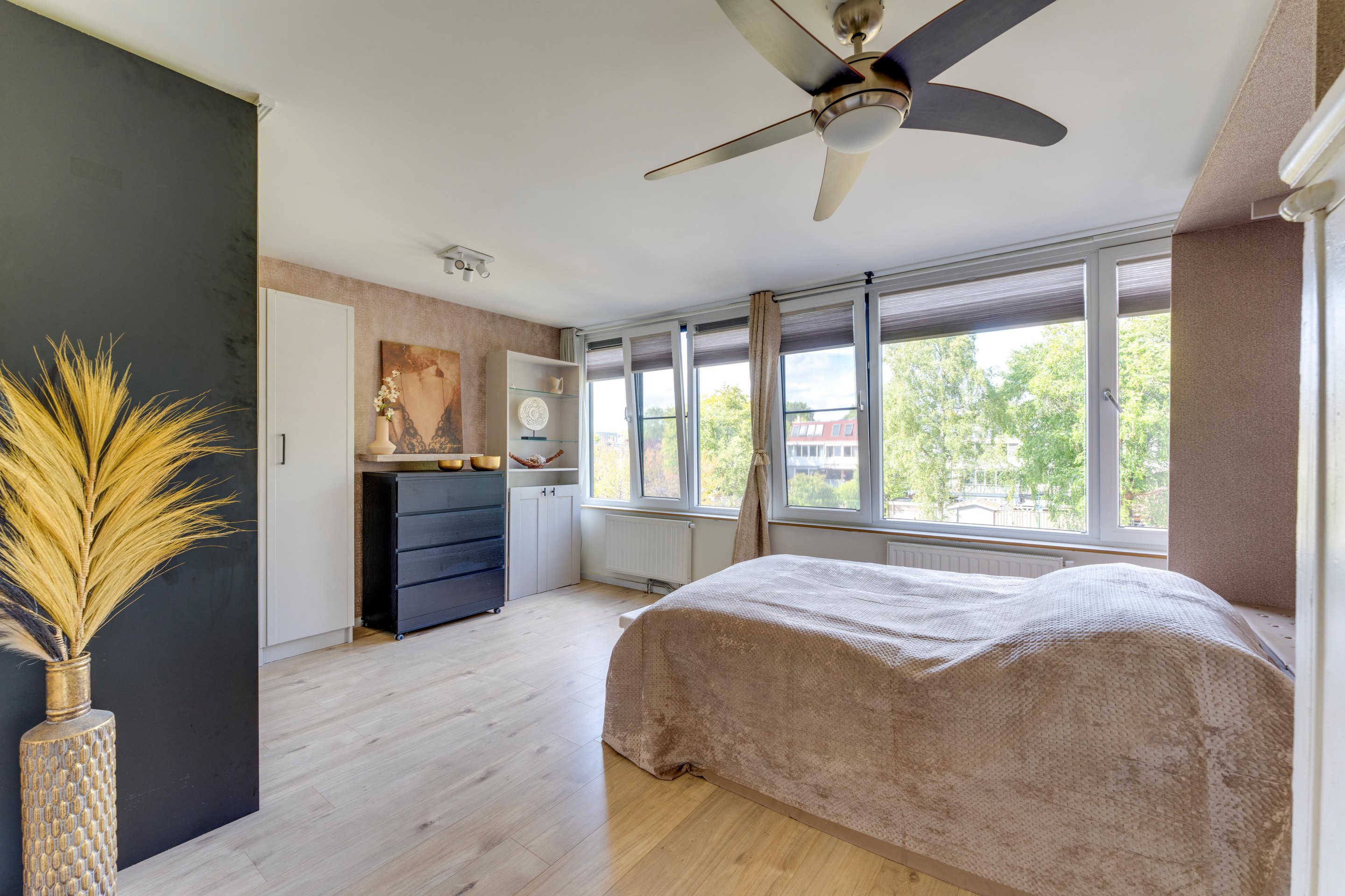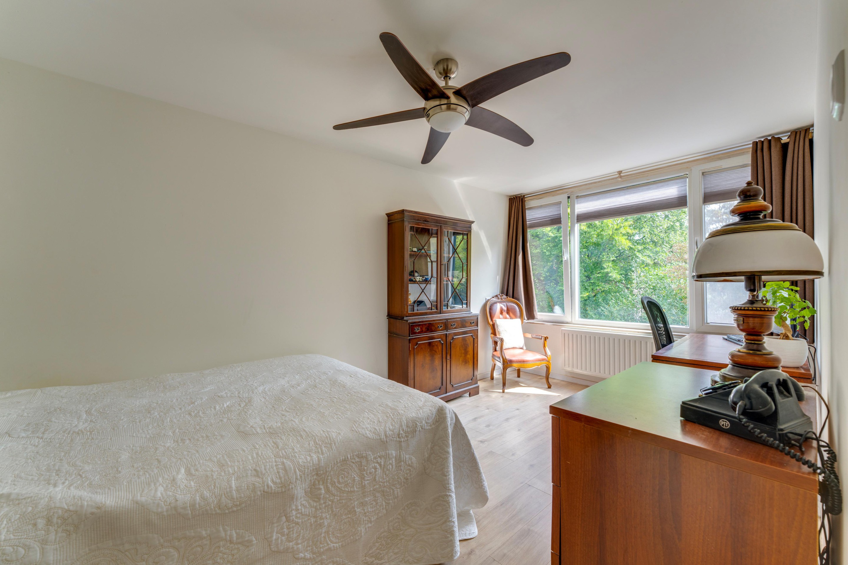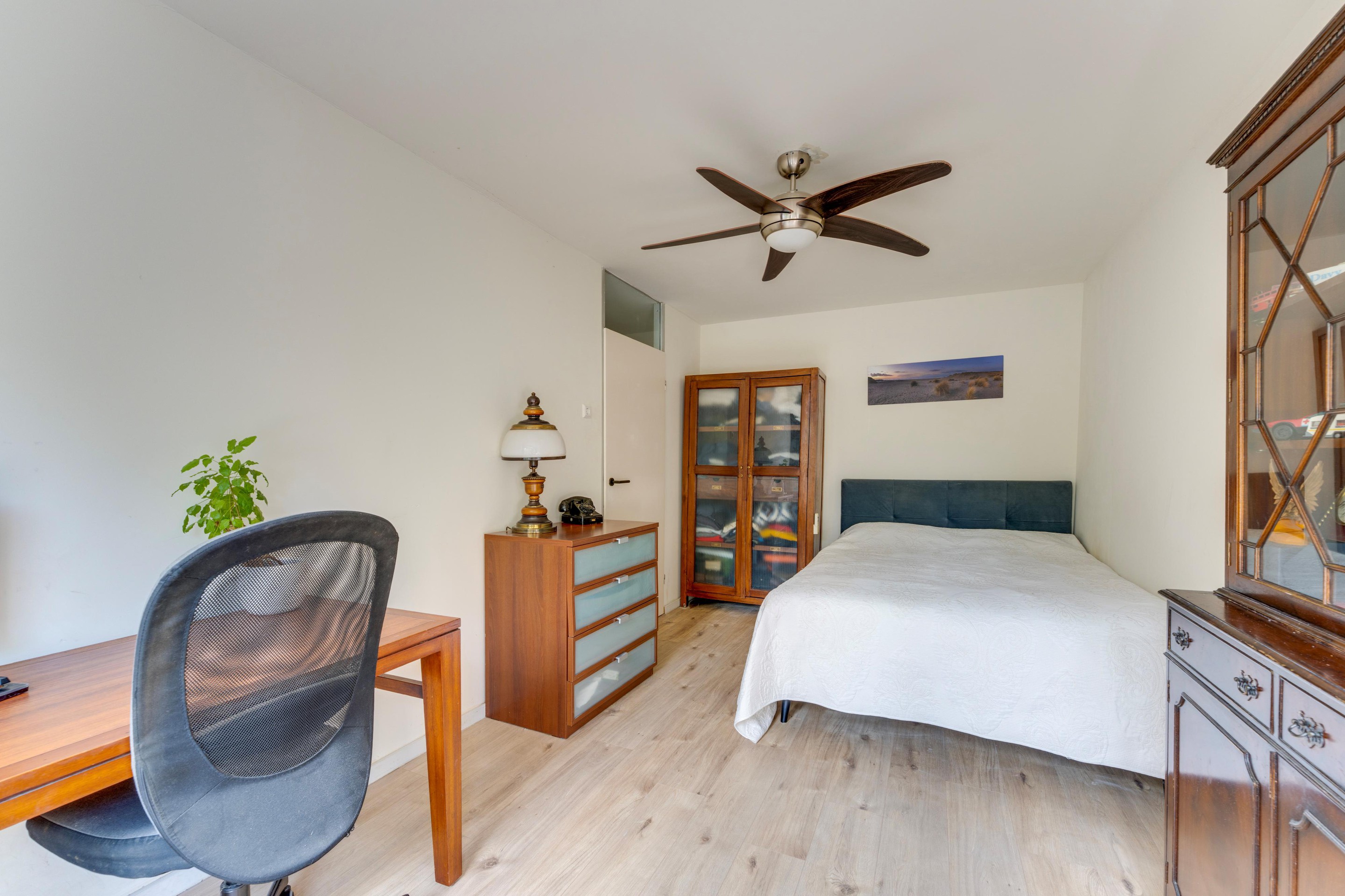 De eerste verdieping vormt het kloppend hart van deze woning. Aan de achterzijde bevindt zich de ruime en lichte woonkamer met grote schuifpui naar het balkon op het noordwesten. Hier kijk je prachtig uit over een groen plantsoen – een levendig maar ontspannen uitzicht waar je elke dag van kunt genieten. Extra fijn: via een vaste trap loop je vanaf dit balkon zó de achtertuin in.