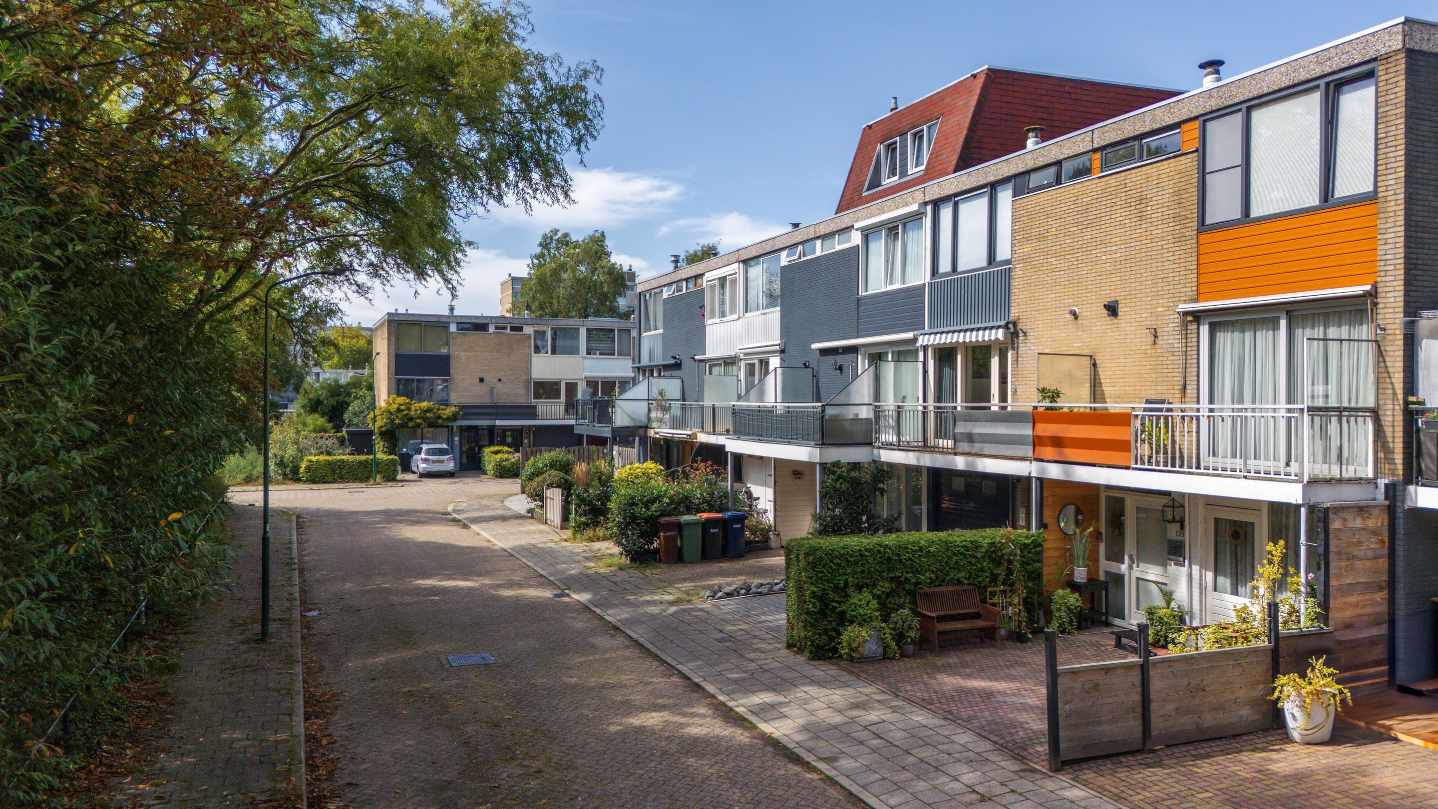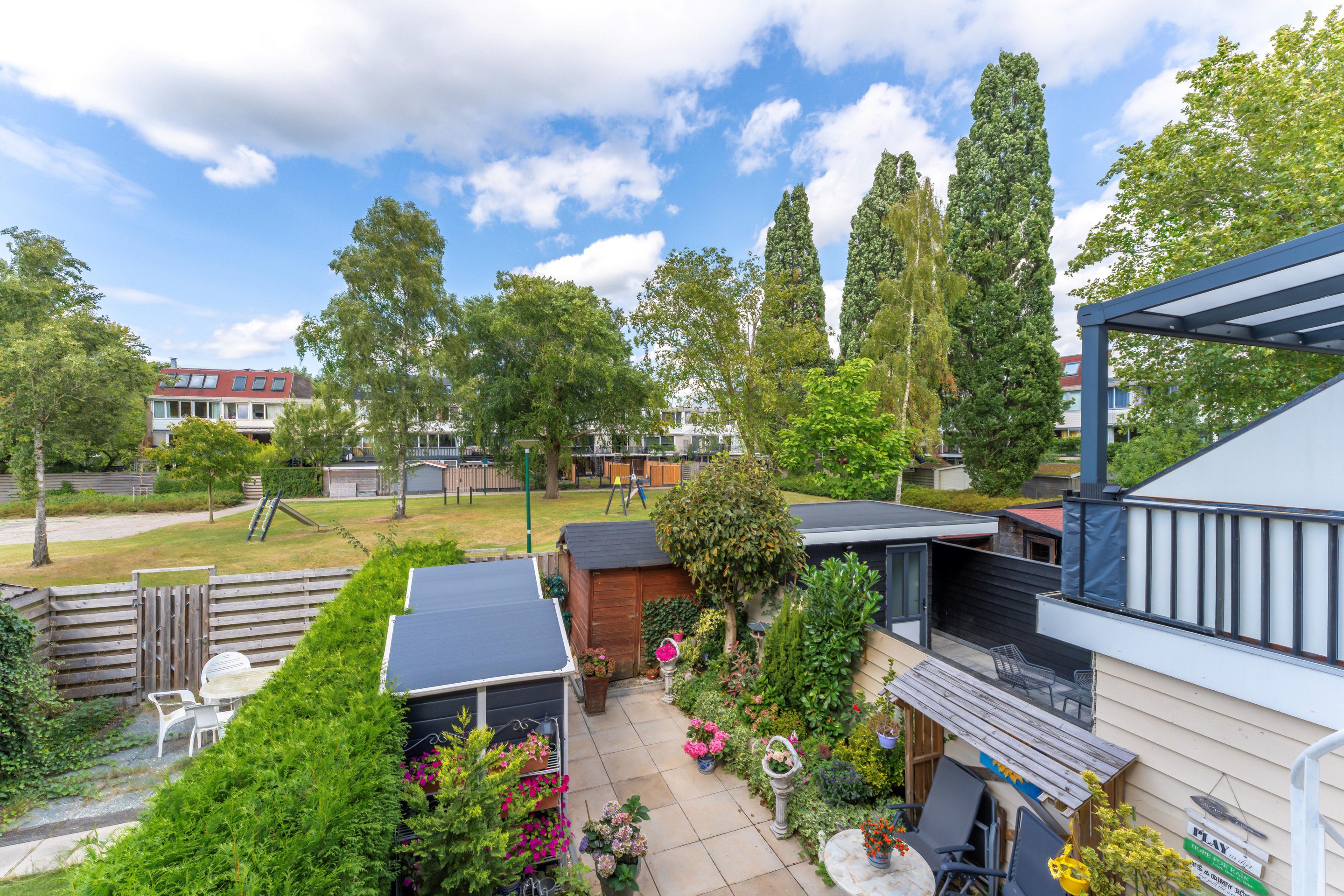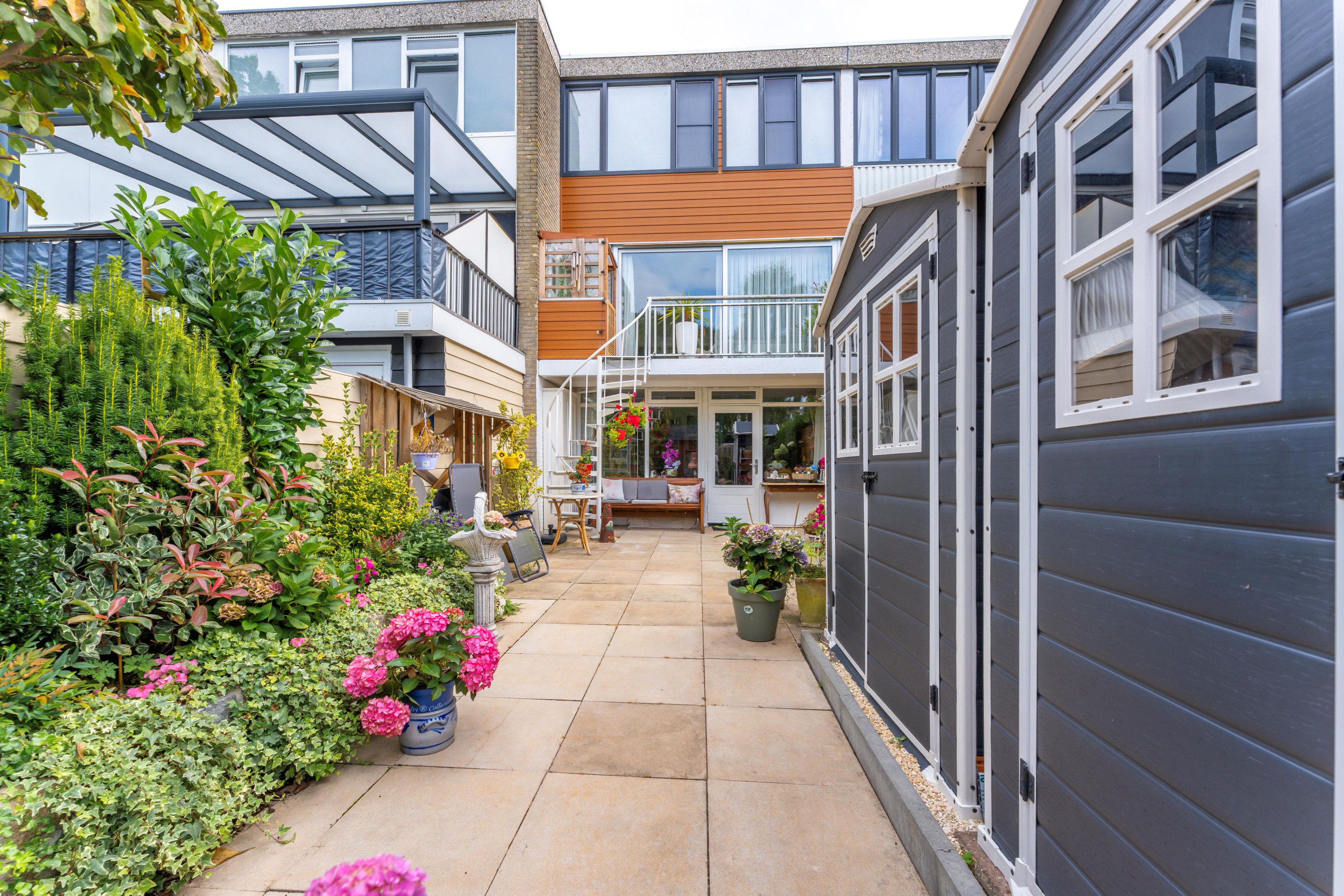 De achtertuin is gericht op het noordwesten en biedt juist in de middag en avond een heerlijke plek om buiten te zitten. Dankzij de ligging aan een breed plantsoen is er veel privacy én een vrij gevoel van ruimte. De tuin is strak bestraat en sfeervol aangeplant met kleurrijke borders. Er is volop ruimte voor meerdere zitplekken, een loungeset of een buitentafel. Vanaf het balkon op de eerste verdieping loopt een vaste trap elegant naar beneden, waardoor binnen en buiten mooi met elkaar verbonden zijn. Een buitenruimte waar aan alles is gedacht, of je nu wilt ontspannen, tuinieren of gewoon lekker buiten wilt zijn.