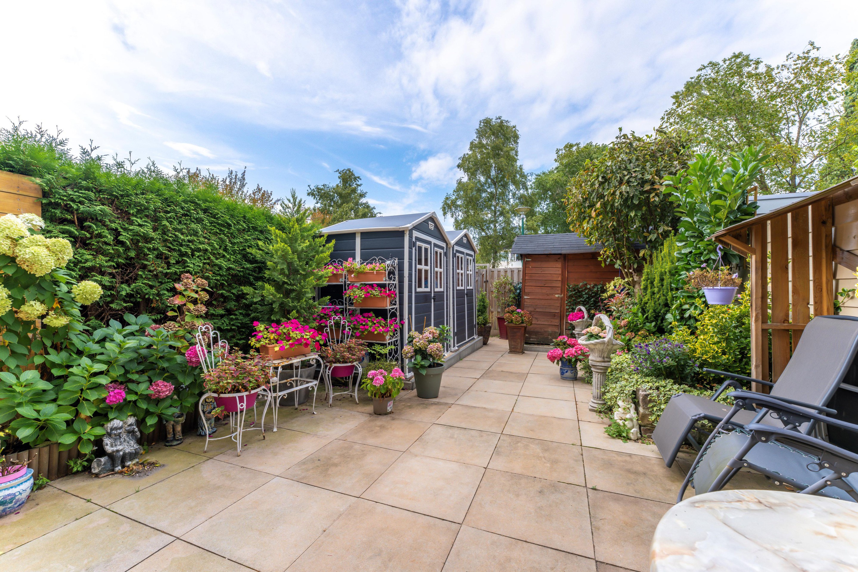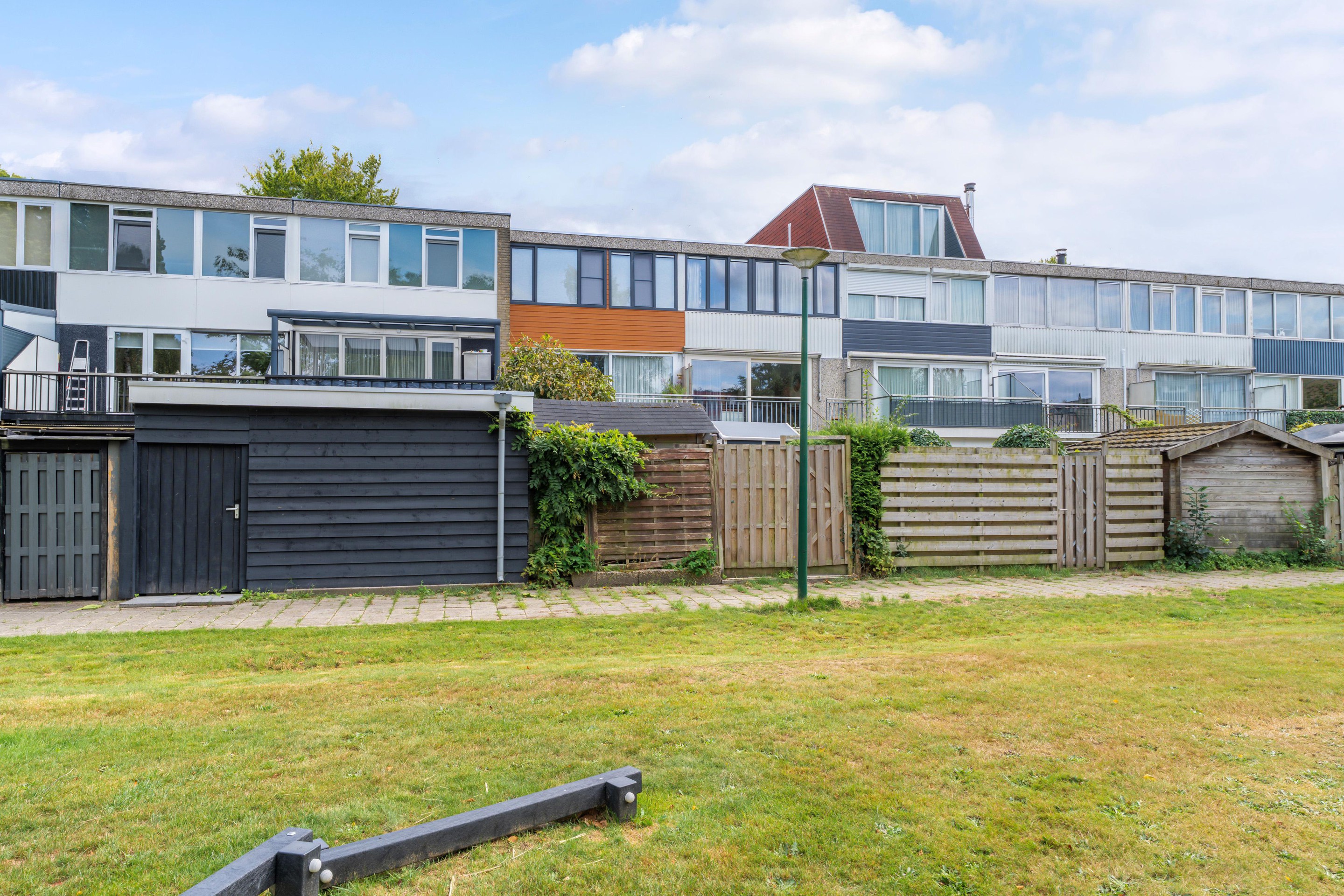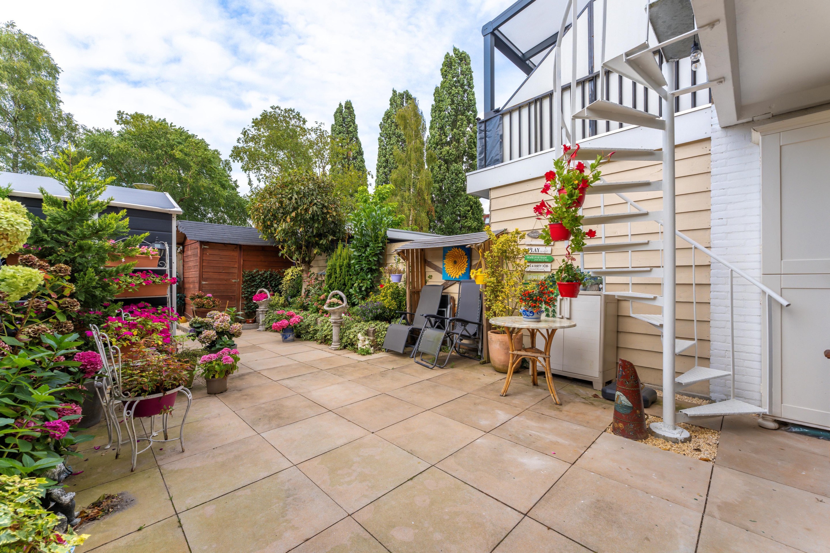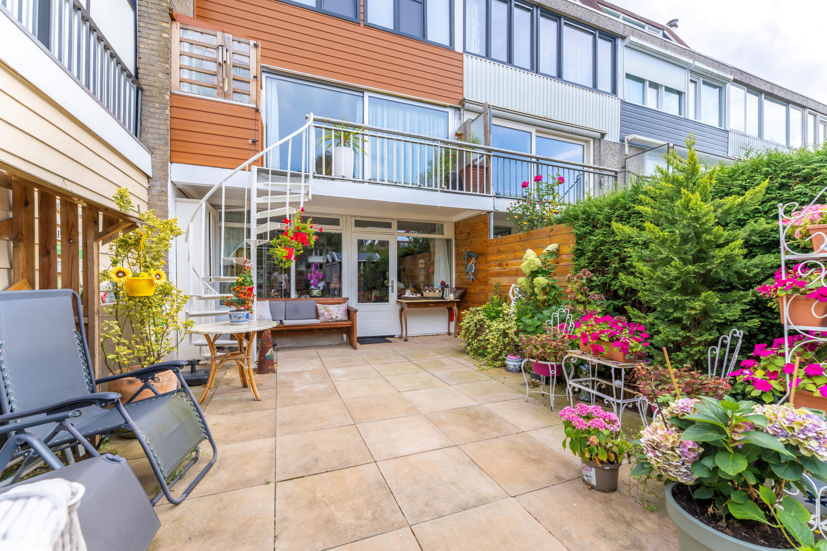 De achtertuin is gericht op het noordwesten en biedt juist in de middag en avond een heerlijke plek om buiten te zitten. Dankzij de ligging aan een breed plantsoen is er veel privacy én een vrij gevoel van ruimte. De tuin is strak bestraat en sfeervol aangeplant met kleurrijke borders. Er is volop ruimte voor meerdere zitplekken, een loungeset of een buitentafel. Vanaf het balkon op de eerste verdieping loopt een vaste trap elegant naar beneden, waardoor binnen en buiten mooi met elkaar verbonden zijn. Een buitenruimte waar aan alles is gedacht, of je nu wilt ontspannen, tuinieren of gewoon lekker buiten wilt zijn.