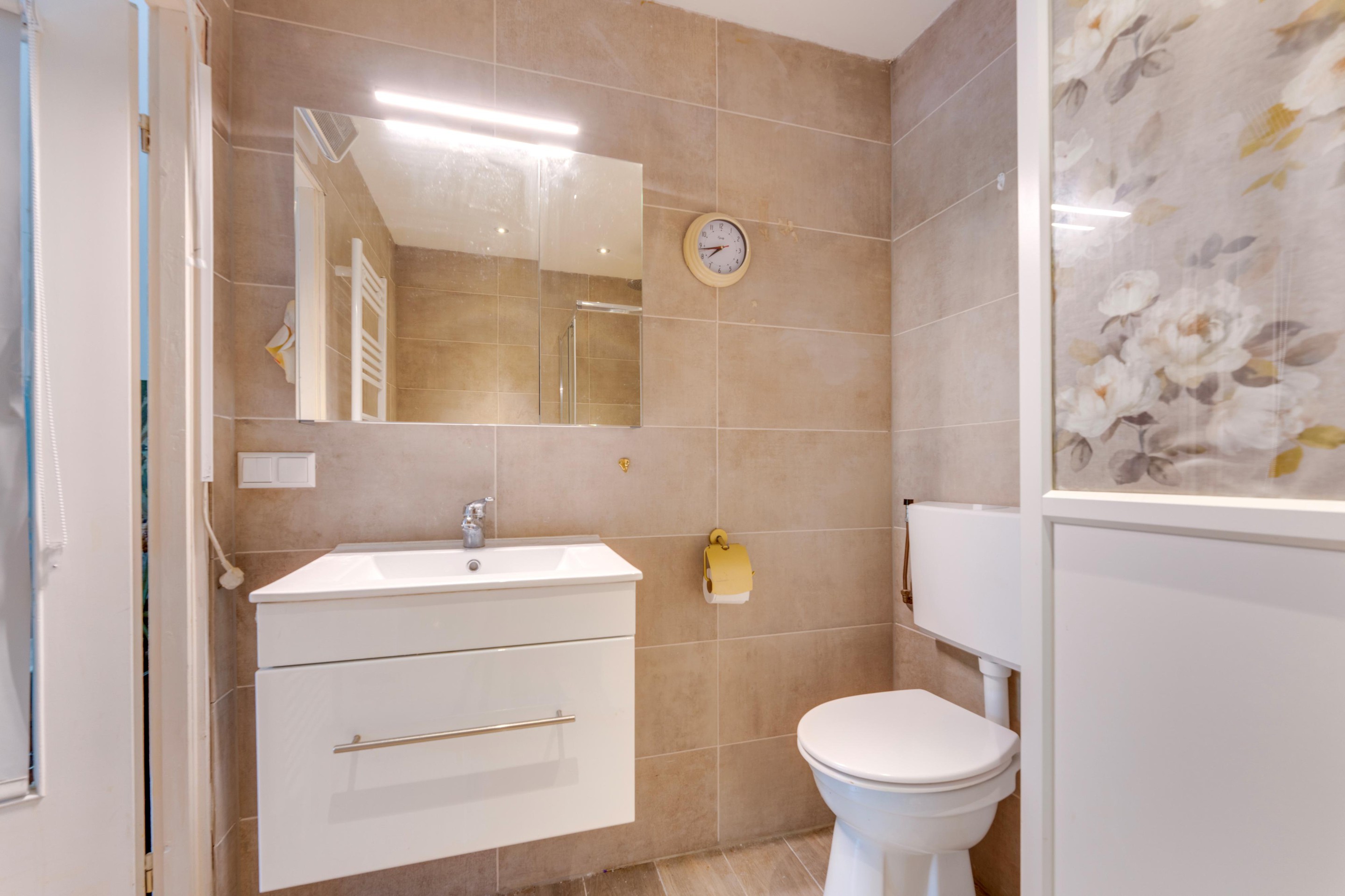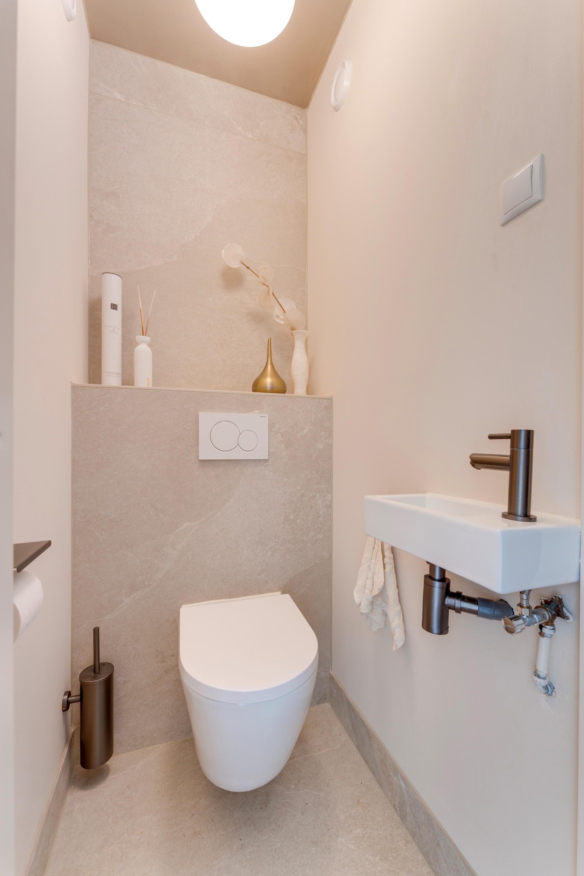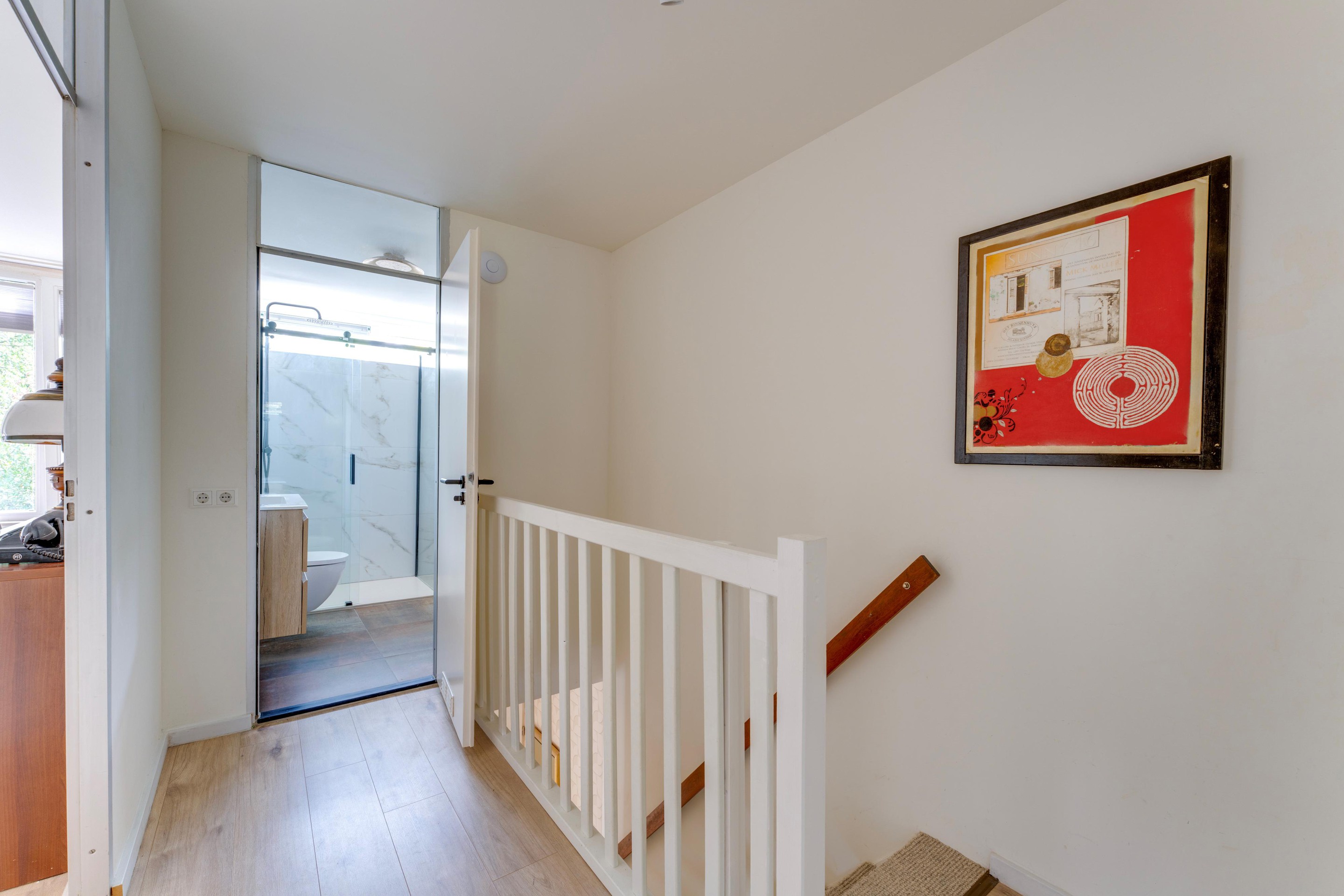 De 1ste verdieping is afgewerkt met een onderhoudsvriendelijke pvc-vloer in een warme houttint. Op de overloop vind je een extra bergkast waarin ook de cv-ketel is geplaatst: een Intergas Kombi Kompakt HRE 36/30 A uit 2022. Daarnaast is er een modern toilet met fonteintje – uitgevoerd in neutrale tinten en met oog voor detail afgewerkt.