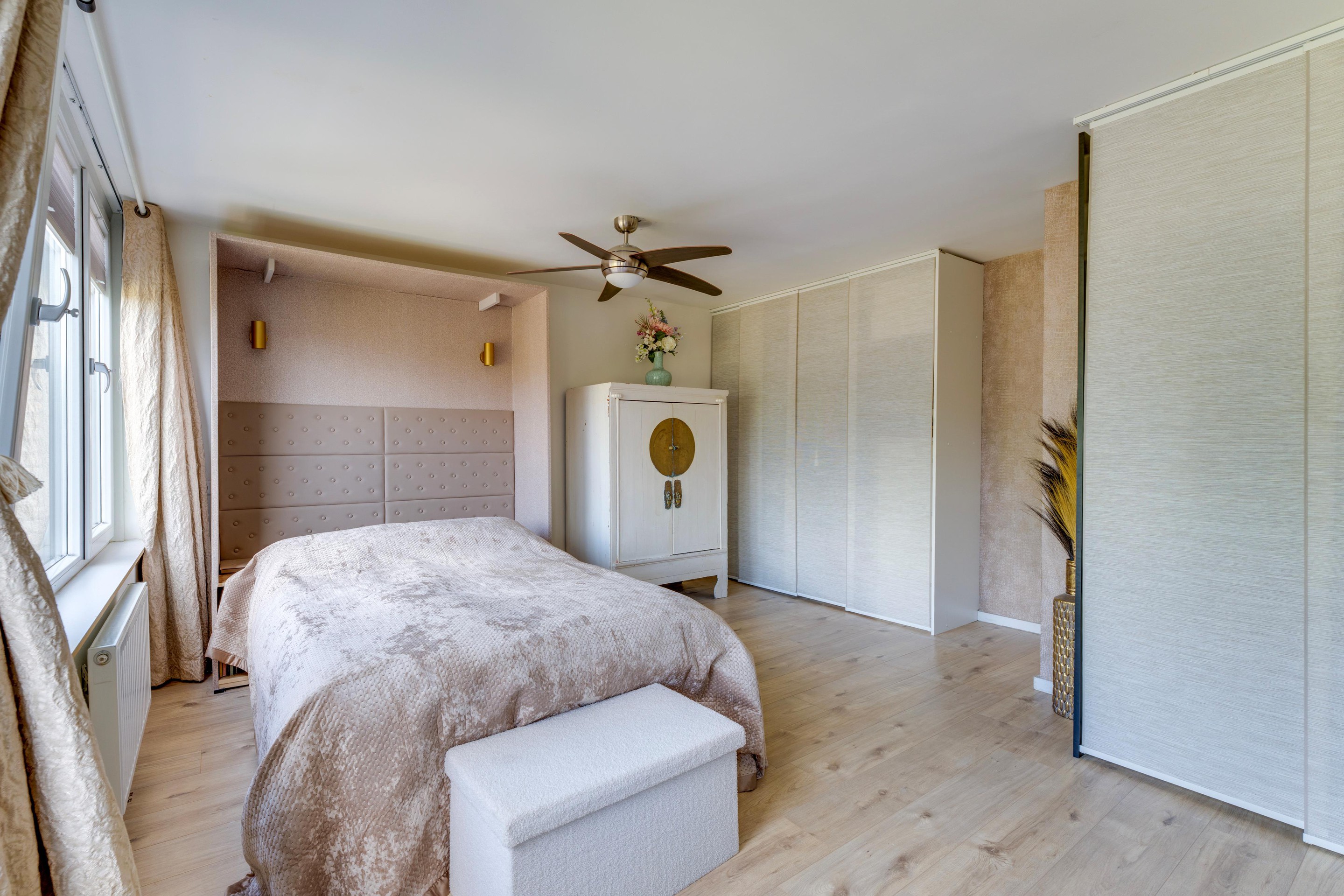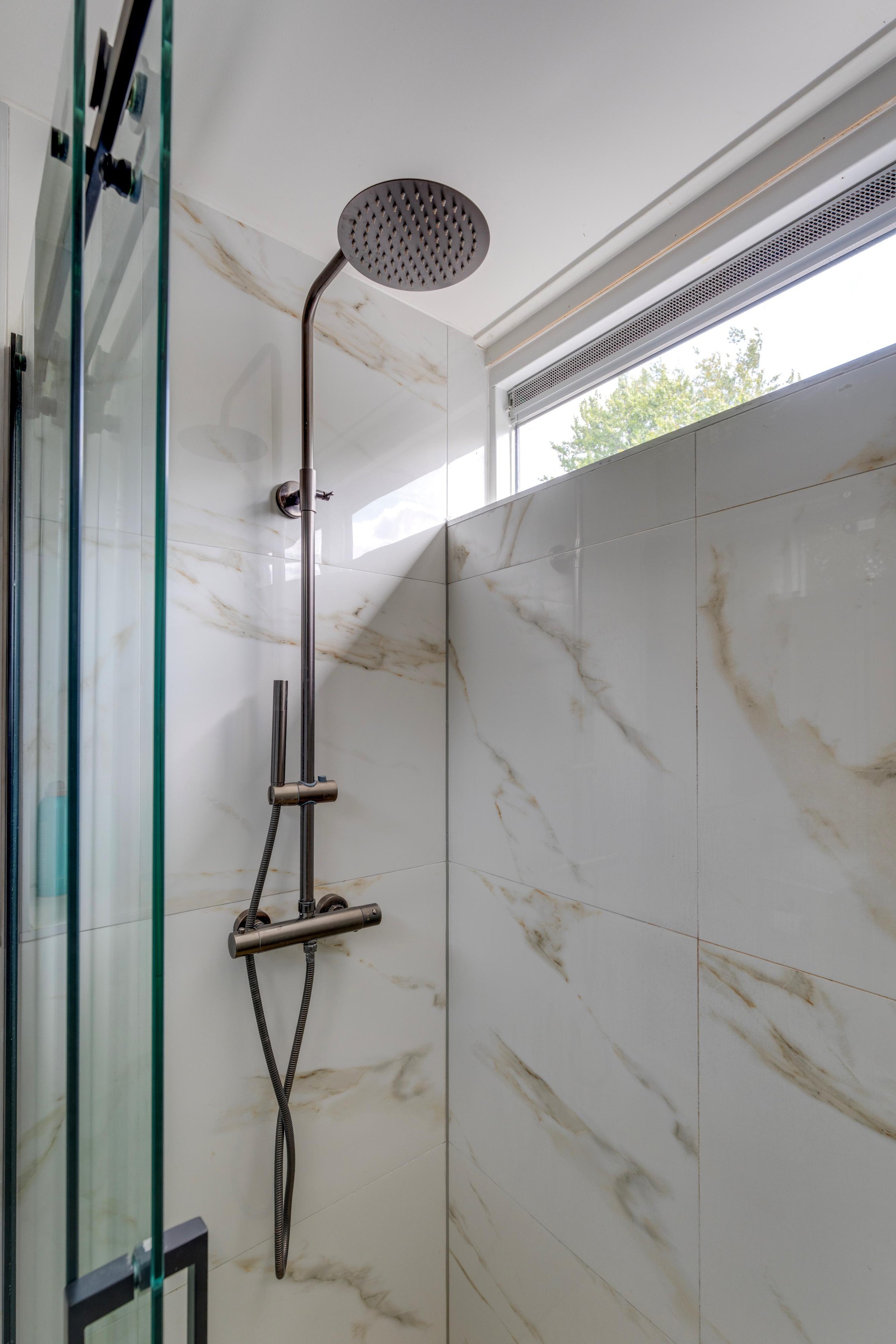 Op de tweede verdieping vind je twee royale slaapkamers en een moderne, strak afgewerkte badkamer. Oorspronkelijk waren dit drie kamers, maar door de slimme herindeling zijn er nu twee ruime slaapkamers ontstaan die volop comfort en indelingsvrijheid bieden. De master bedroom aan de achterzijde is een echte blikvanger, met meer dan genoeg ruimte voor een groot bed én kastenwand. Ook de tweede slaapkamer, gelegen aan de voorzijde, is ruim opgezet en ideaal als kinderkamer, werkkamer of logeerkamer. De badkamer is stijlvol betegeld en uitgerust met een royale inloopdouche met glazen schuifwand, een modern wastafelmeubel, een designradiator en een tweede toilet. De aansluitingen voor de wasmachine zijn hier netjes geïntegreerd – praktisch én uit het zicht.