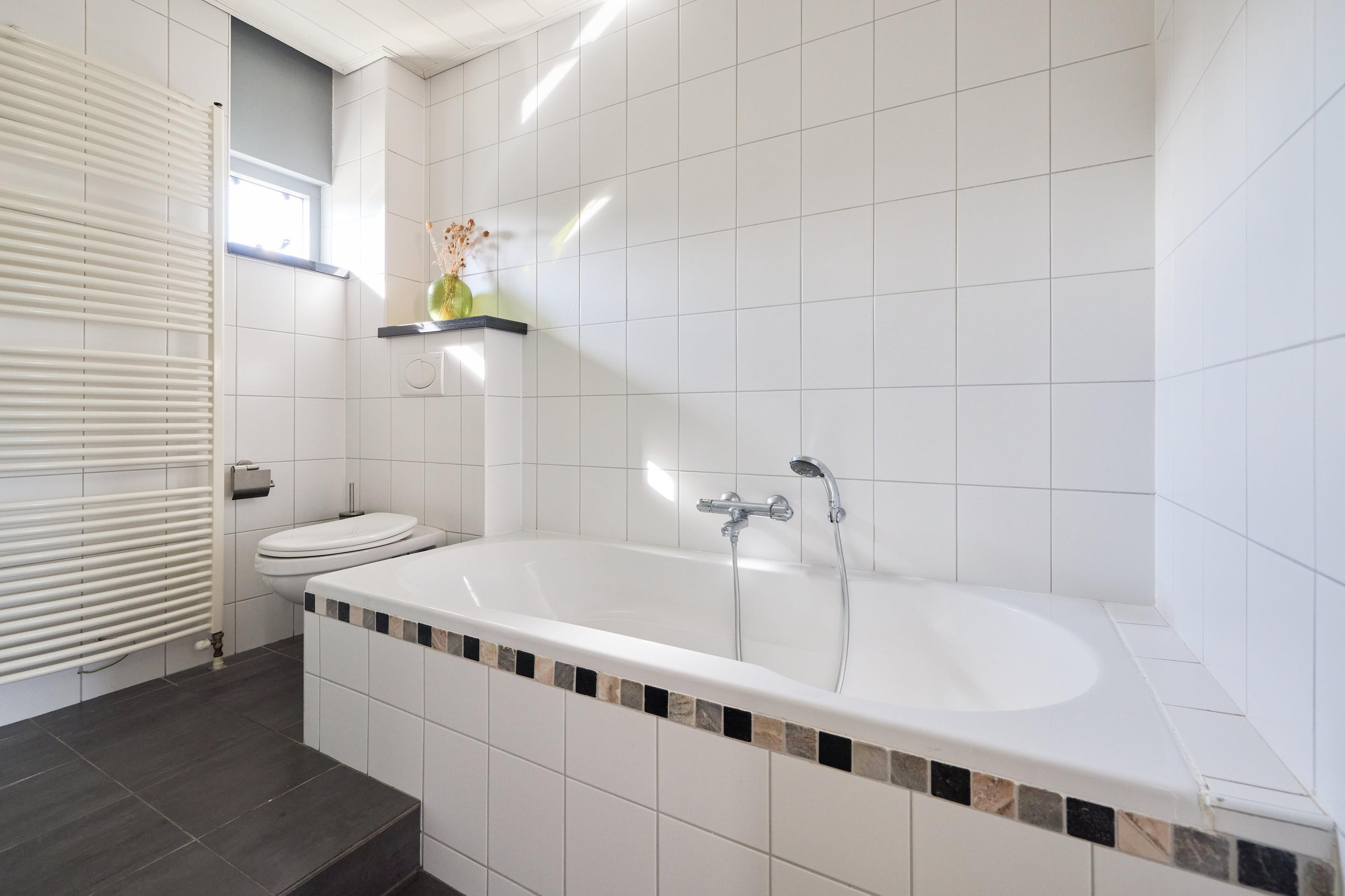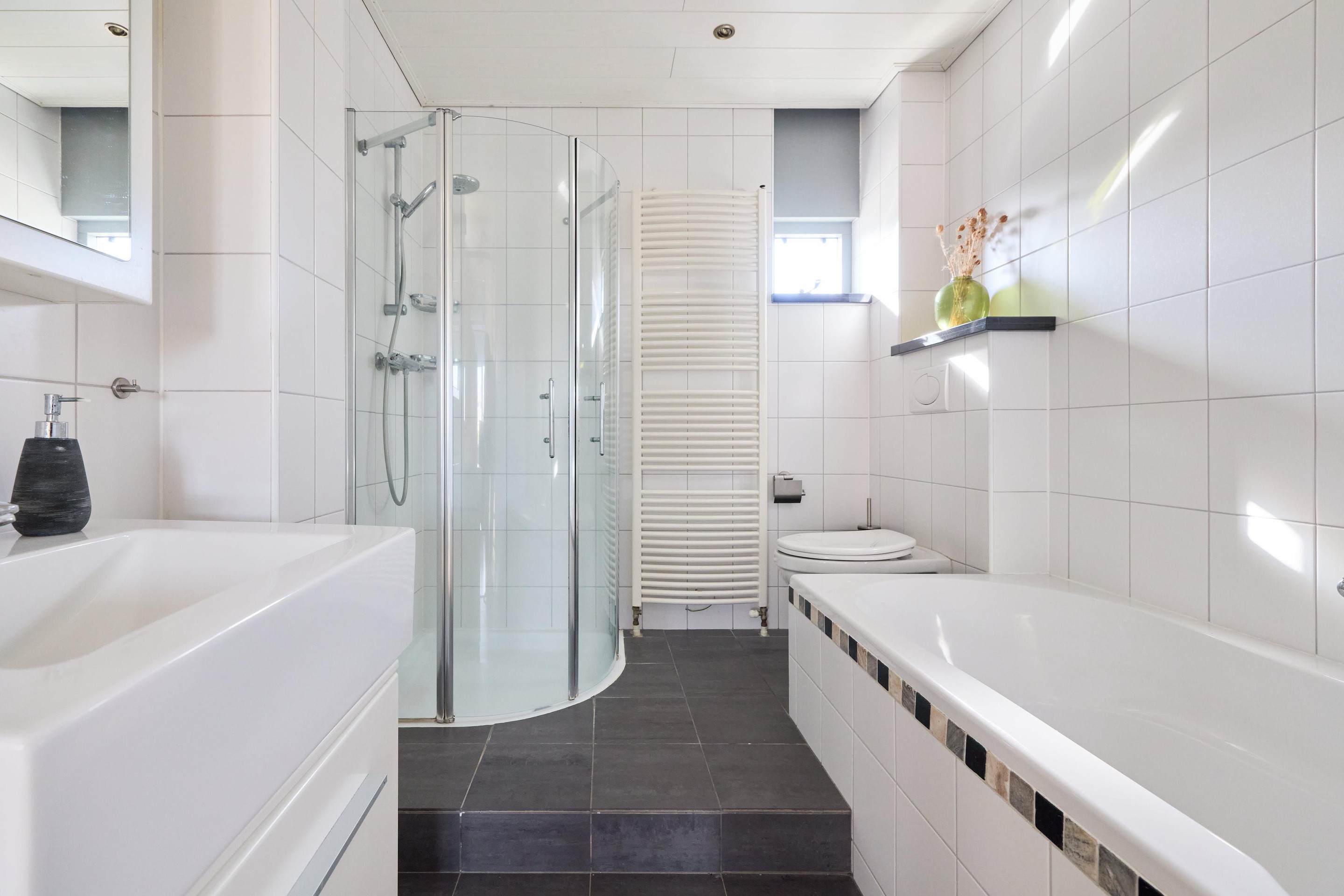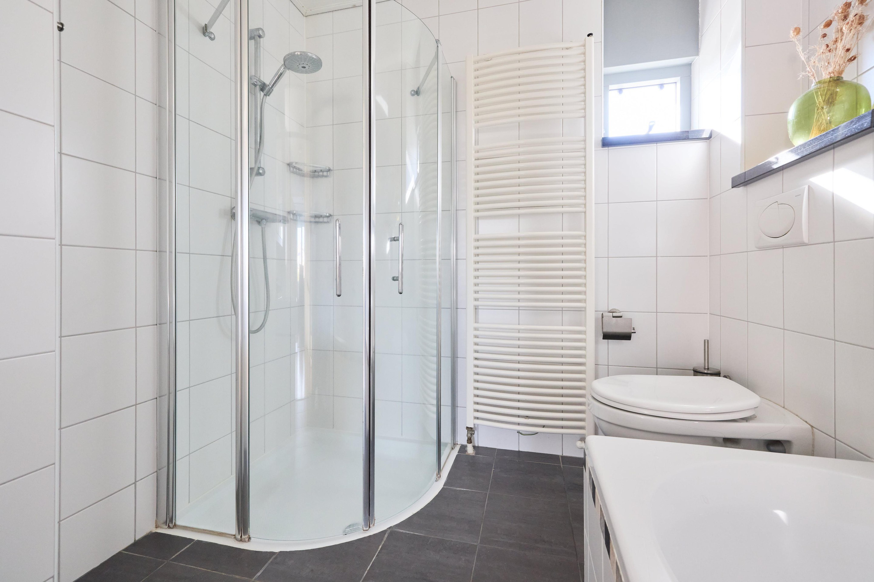 Eerste verdieping Op de eerste verdieping kom je uit op de overloop, die toegang geeft tot drie slaapkamers en de badkamer. De verdieping is voorzien van een nette laminaatvloer, wat zorgt voor een rustige en verzorgde basis. De slaapkamers zijn goed van formaat en hebben een fijne lichtinval dankzij de grote ramen. Daarnaast is er voldoende ruimte voor kasten, waardoor je ze praktisch en comfortabel kunt inrichten. De badkamer is compleet en verzorgd, met een ligbad, een aparte douche, een wastafelmeubel en een tweede toilet. De designradiator zorgt voor extra comfort en het raam brengt daglicht en natuurlijke ventilatie.
