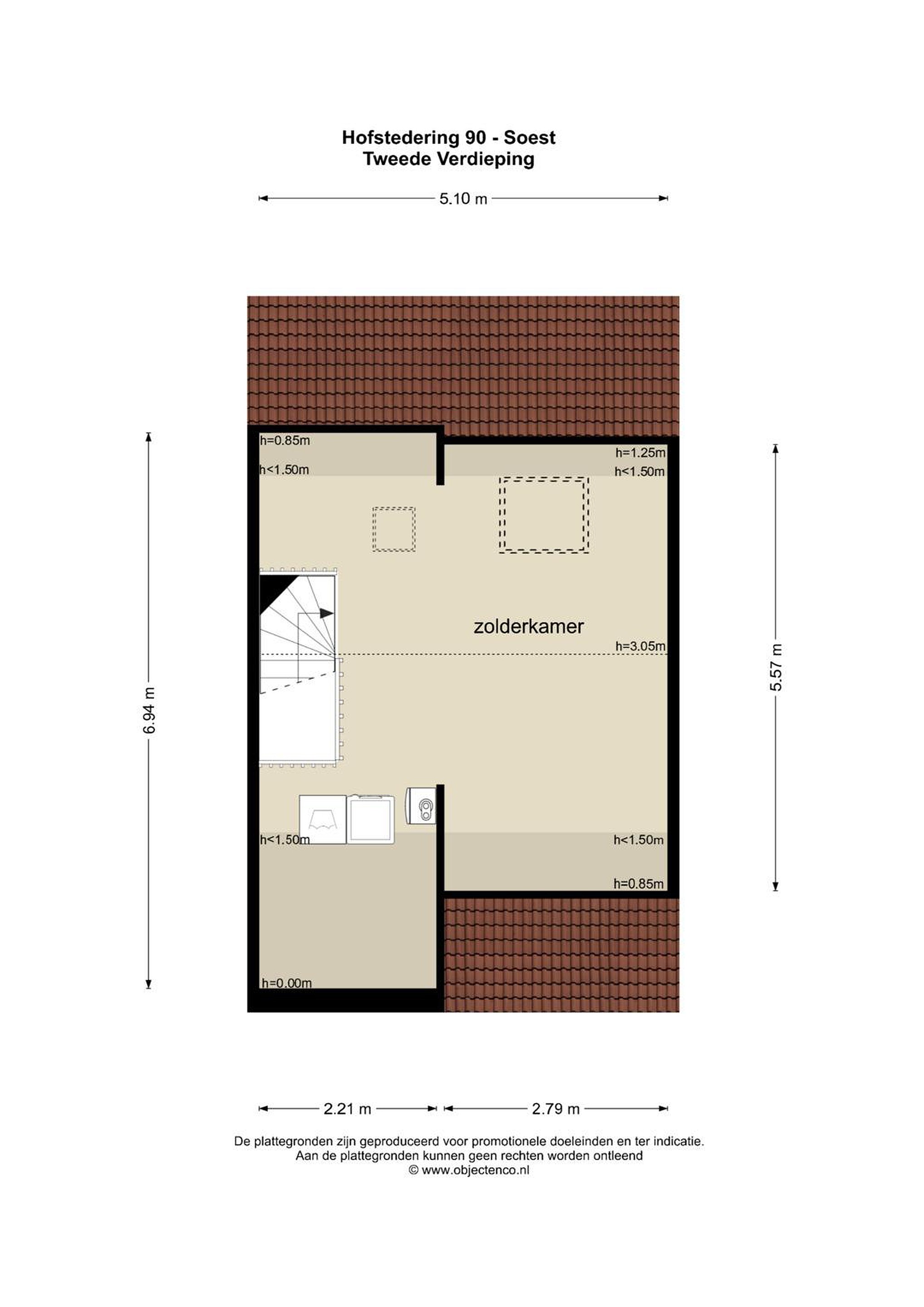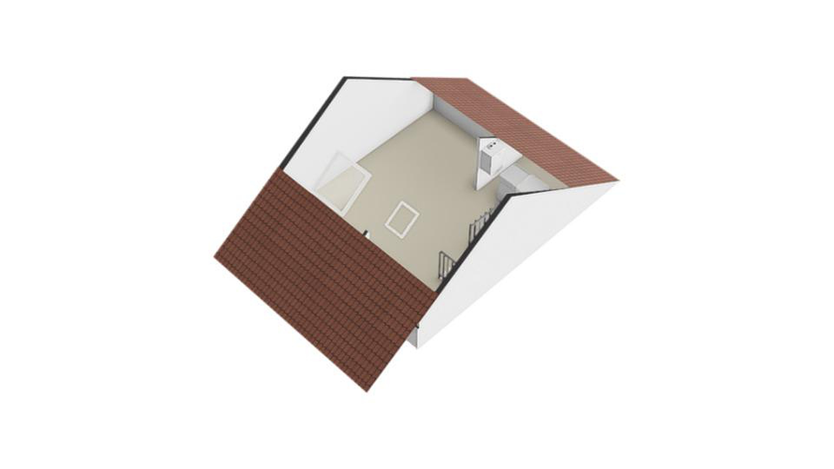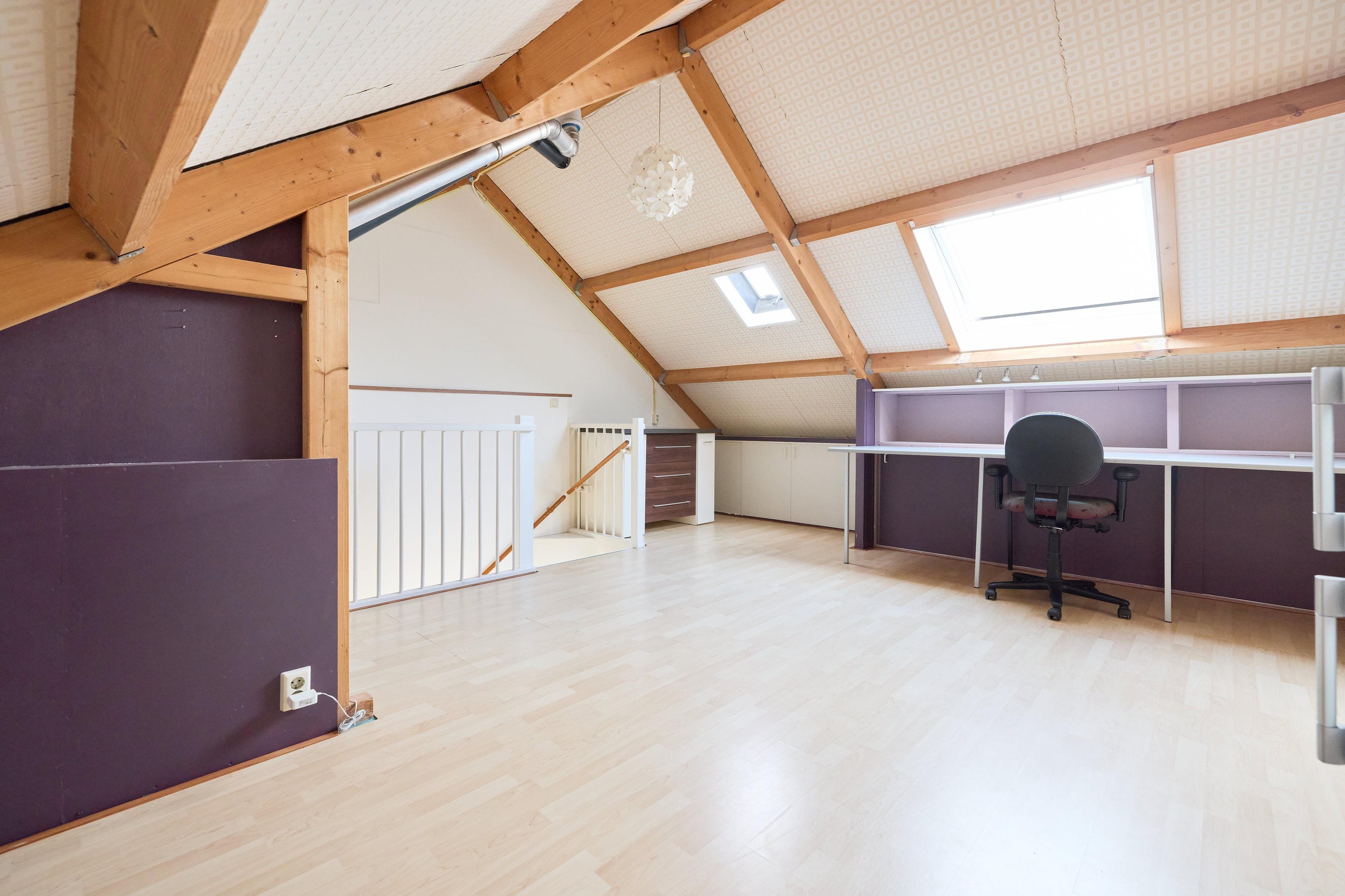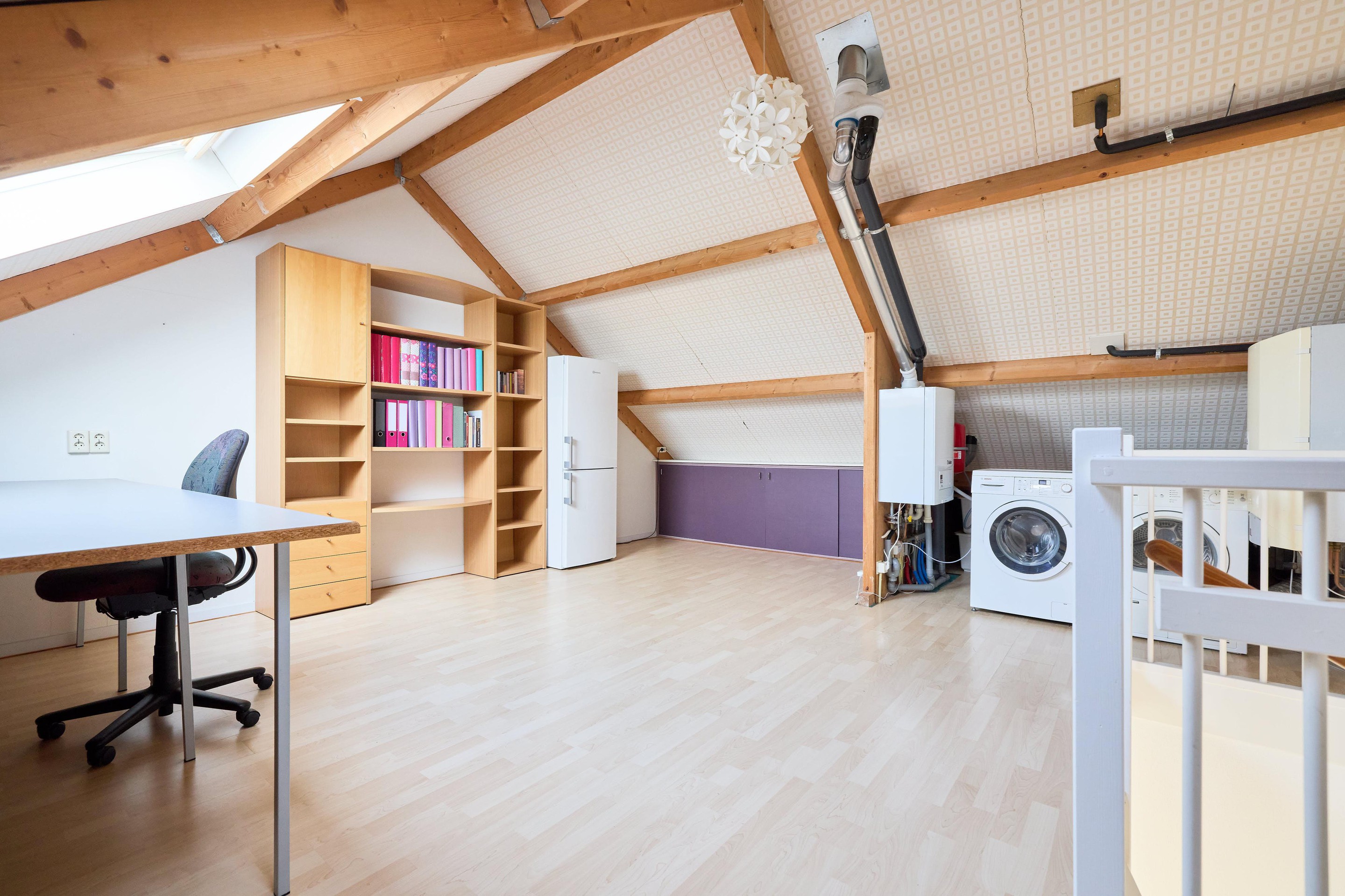 Tweede verdieping Via de vaste trap bereik je de tweede verdieping. Ook hier ligt een laminaatvloer, wat zorgt voor een verzorgde en lichte basis. De zolderverdieping is verrassend ruim en open van opzet. Dankzij de dakramen en de zichtbare kapconstructie heeft de ruimte een prettige sfeer en voelt het geheel licht en ruimtelijk aan. Je hebt hier alle vrijheid om de verdieping naar wens in te delen, bijvoorbeeld als extra slaapkamer, werkruimte of een combinatie daarvan. Daarnaast vind je hier de opstelling voor de wasmachine en droger, evenals de cv-installatie. Achter de knieschotten is praktische bergruimte aanwezig, ideaal om spullen netjes op te bergen.