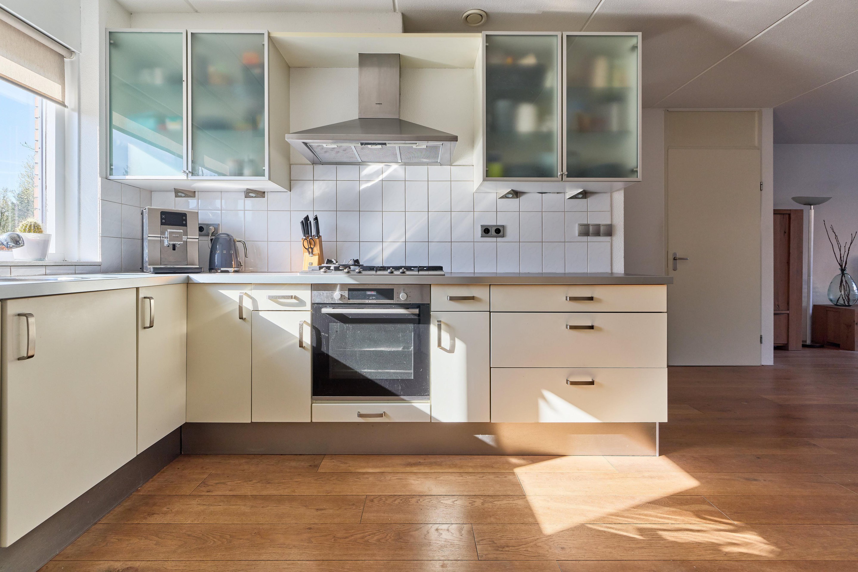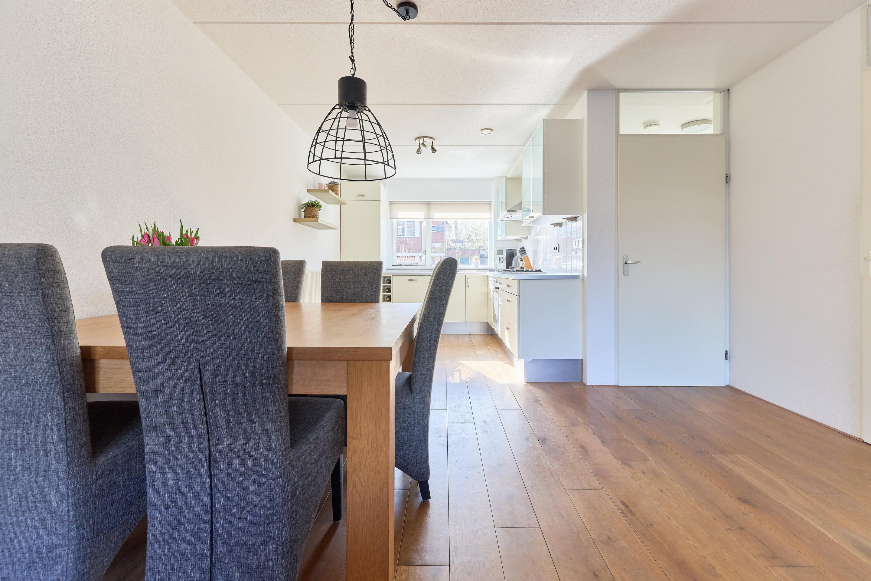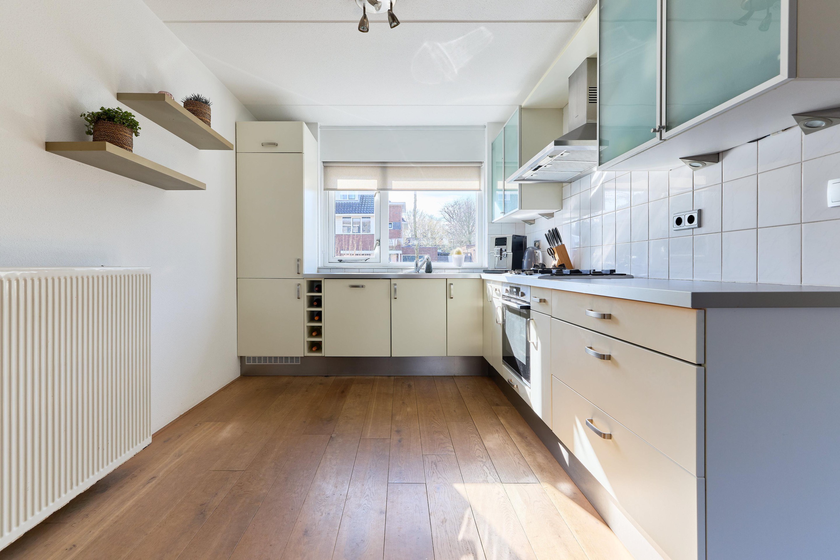 Begane grond Via de entree kom je binnen in de hal met toegang tot de meterkast, het toilet, de trapopgang en de woonkamer. De woonkamer is tuingericht en voelt heerlijk licht en open aan dankzij de grote raampartijen aan de achterzijde. Hier heb je alle ruimte voor een comfortabele zithoek met zicht op de tuin. Daarnaast beschikt de woonkamer over een praktische trapkast, ideaal voor het opbergen van provisie, huishoudelijke spullen of extra voorraad. De eikenhouten vloer loopt door over de gehele begane grond en zorgt voor een warme, rustige uitstraling. Aan de voorzijde ligt de open keuken, die naadloos aansluit op de leefruimte. Er is volop plek voor een ruime eettafel, waardoor koken en tafelen hier mooi samenkomen. De keuken is praktisch ingericht en voorzien van een 5-pits gaskookplaat, afzuigkap, oven, vaatwasser, koelkast en vriezer. Een fijne, open begane grond met ruimte om samen te komen, te koken en te leven.