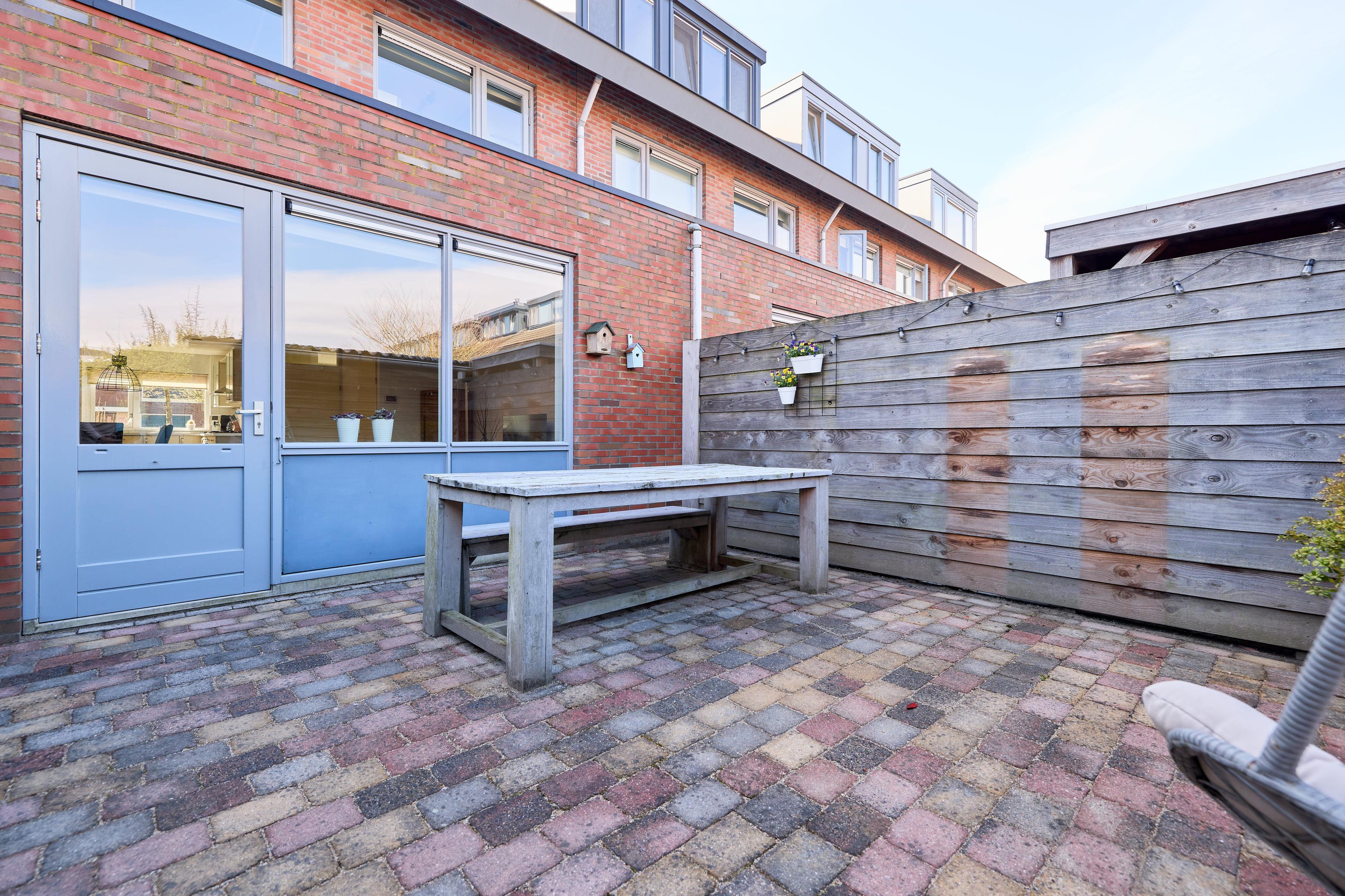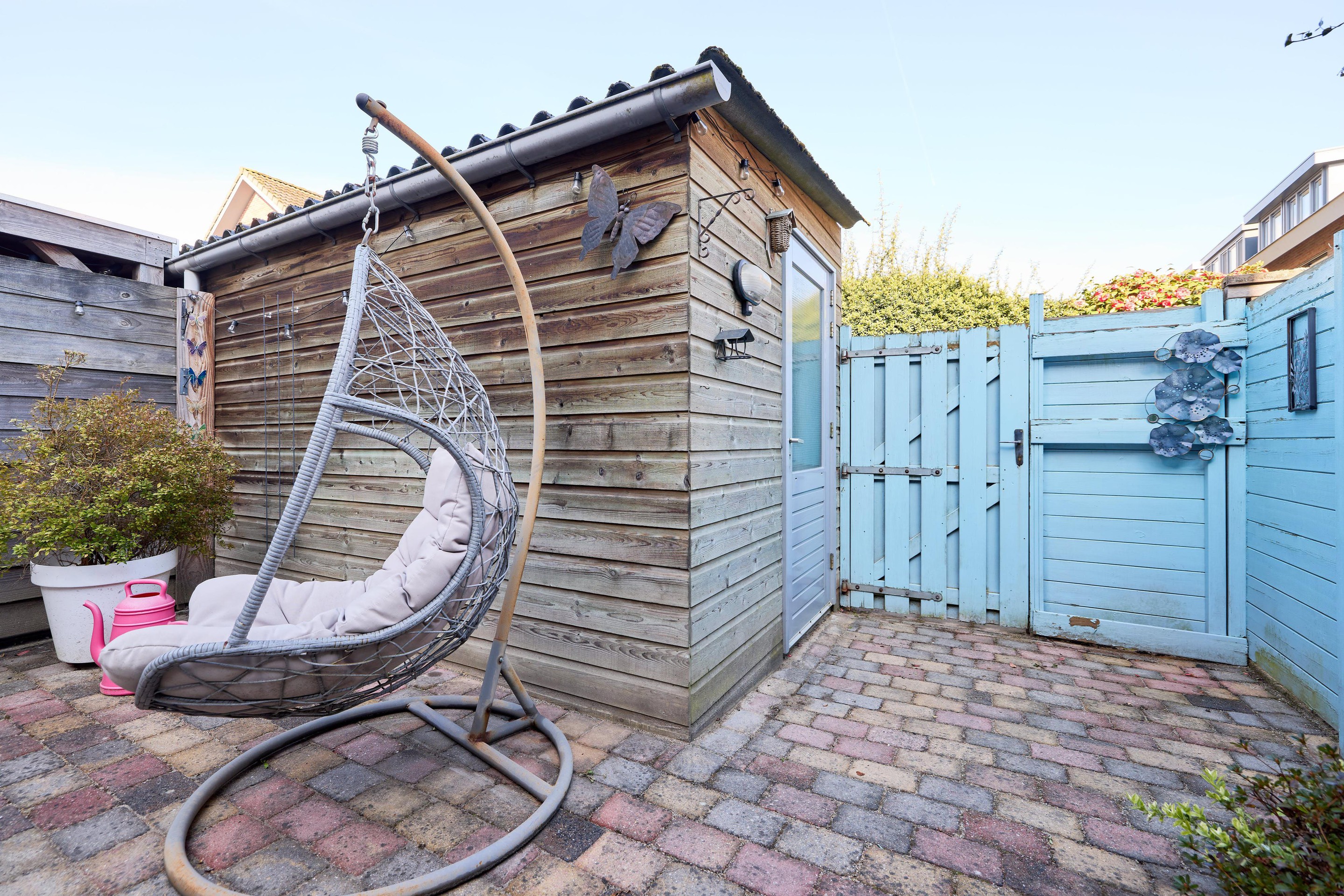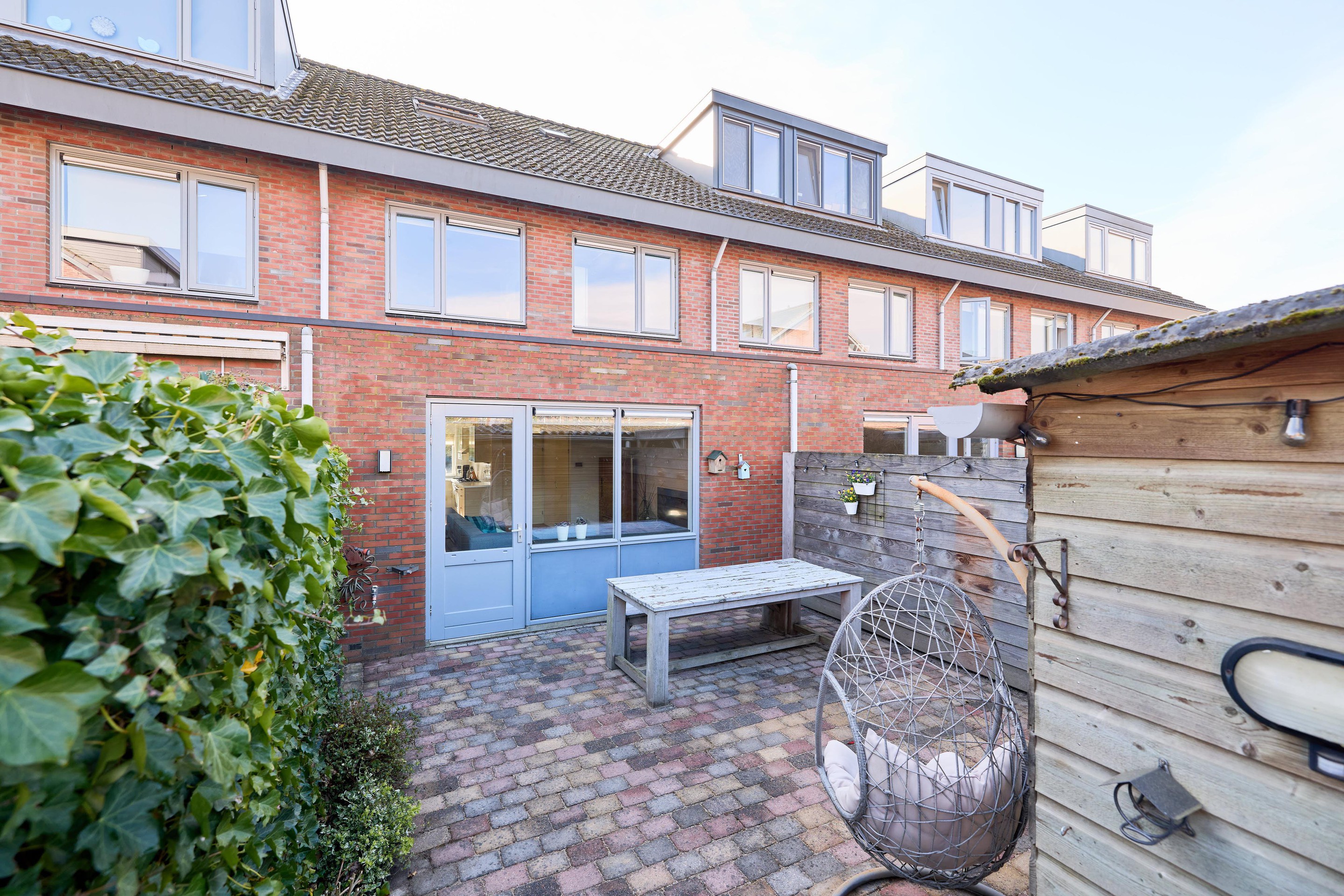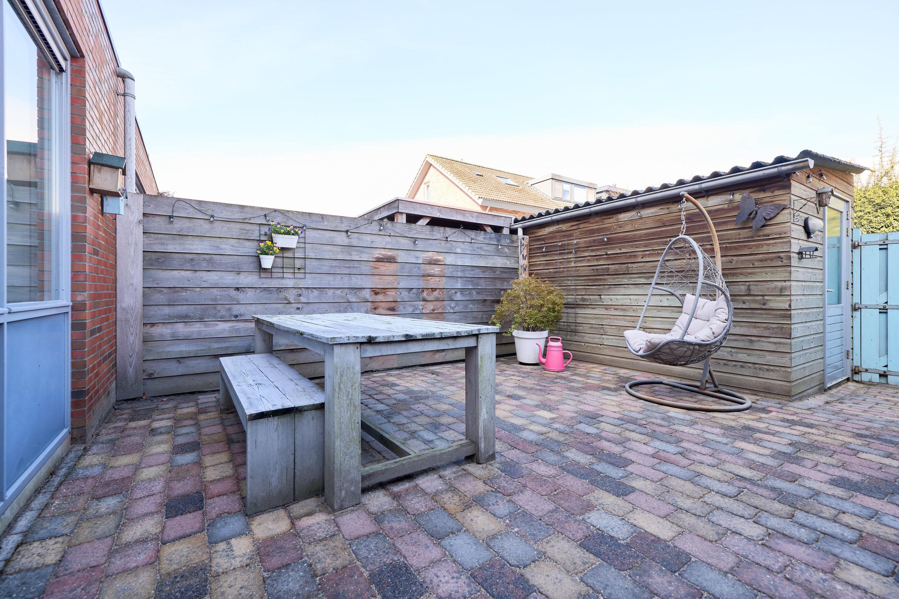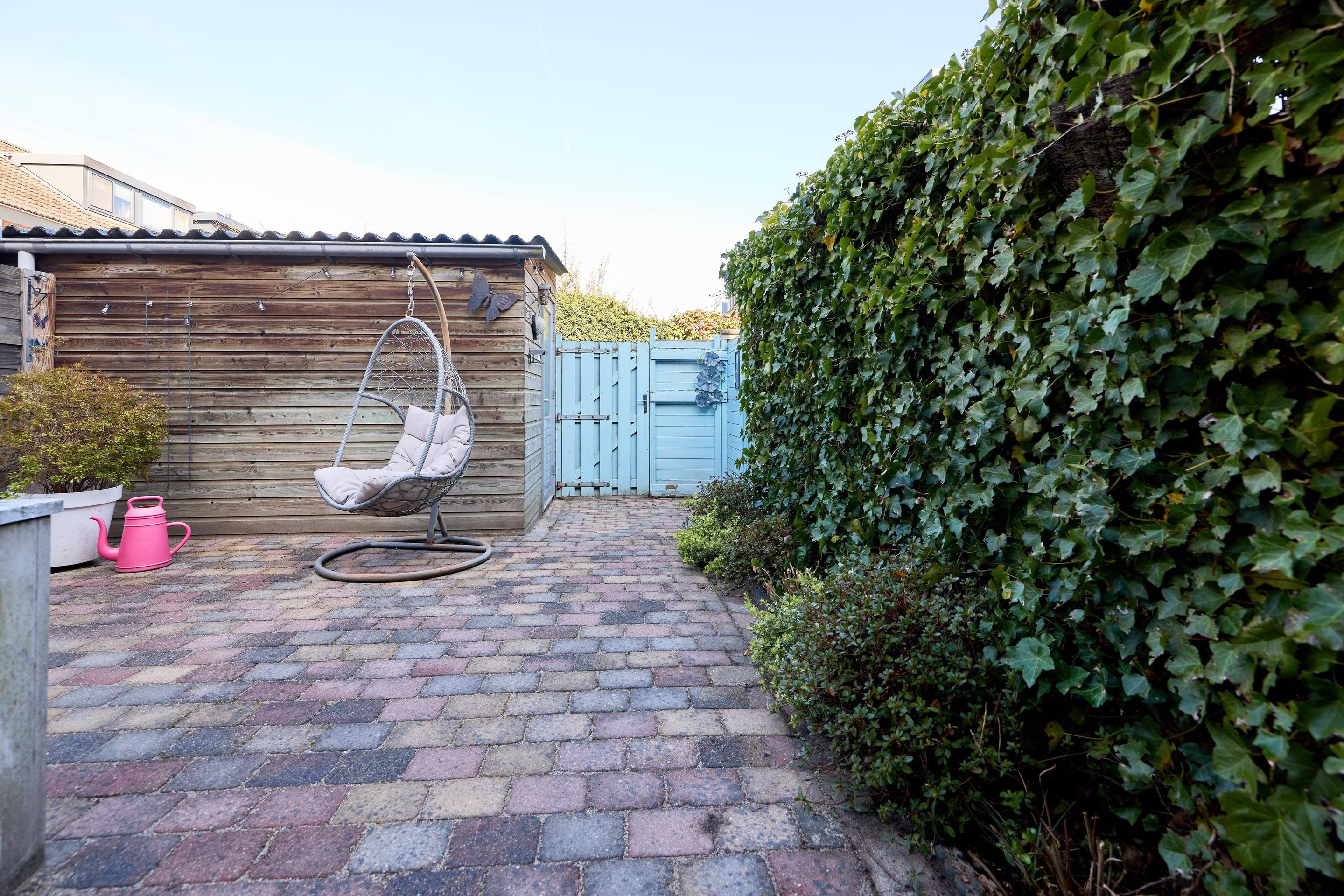 Tuin Achter de woning vind je een verzorgde en onderhoudsvriendelijke achtertuin, gelegen op het noordwesten. Hier geniet je in de middag en avond van de zon, terwijl er altijd een plek in de schaduw te vinden is. De tuin is grotendeels bestraat en biedt volop ruimte voor een gezellige zithoek of een lange eettafel om buiten te eten. Er is een buitenkraan aanwezig, wel zo praktisch voor tuinonderhoud of op warme dagen. Achterin de tuin staat een houten berging, voorzien van elektra – ideaal voor het opbergen van fietsen en tuinspullen of het opladen van bijvoorbeeld elektrische fietsen. Via de achterom is de tuin bovendien gemakkelijk bereikbaar. Aan de voorzijde, op het zuidoosten, geniet je juist van de ochtendzon. Een fijne plek om de dag rustig te beginnen met een kop koffie, met uitzicht op de straat en het groene karakter van de omgeving. Een tuin waar je op elk moment van de dag een fijne plek vindt.