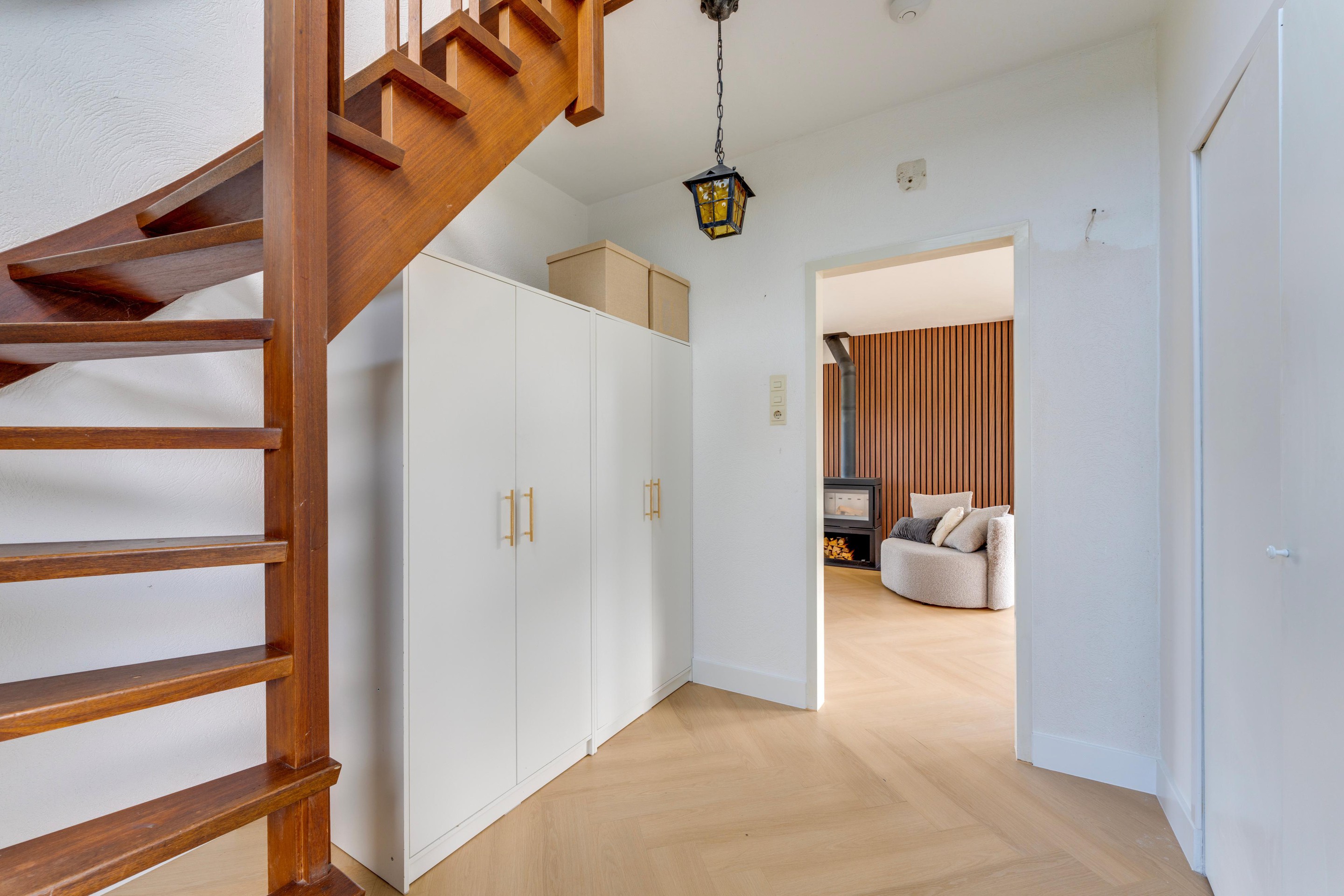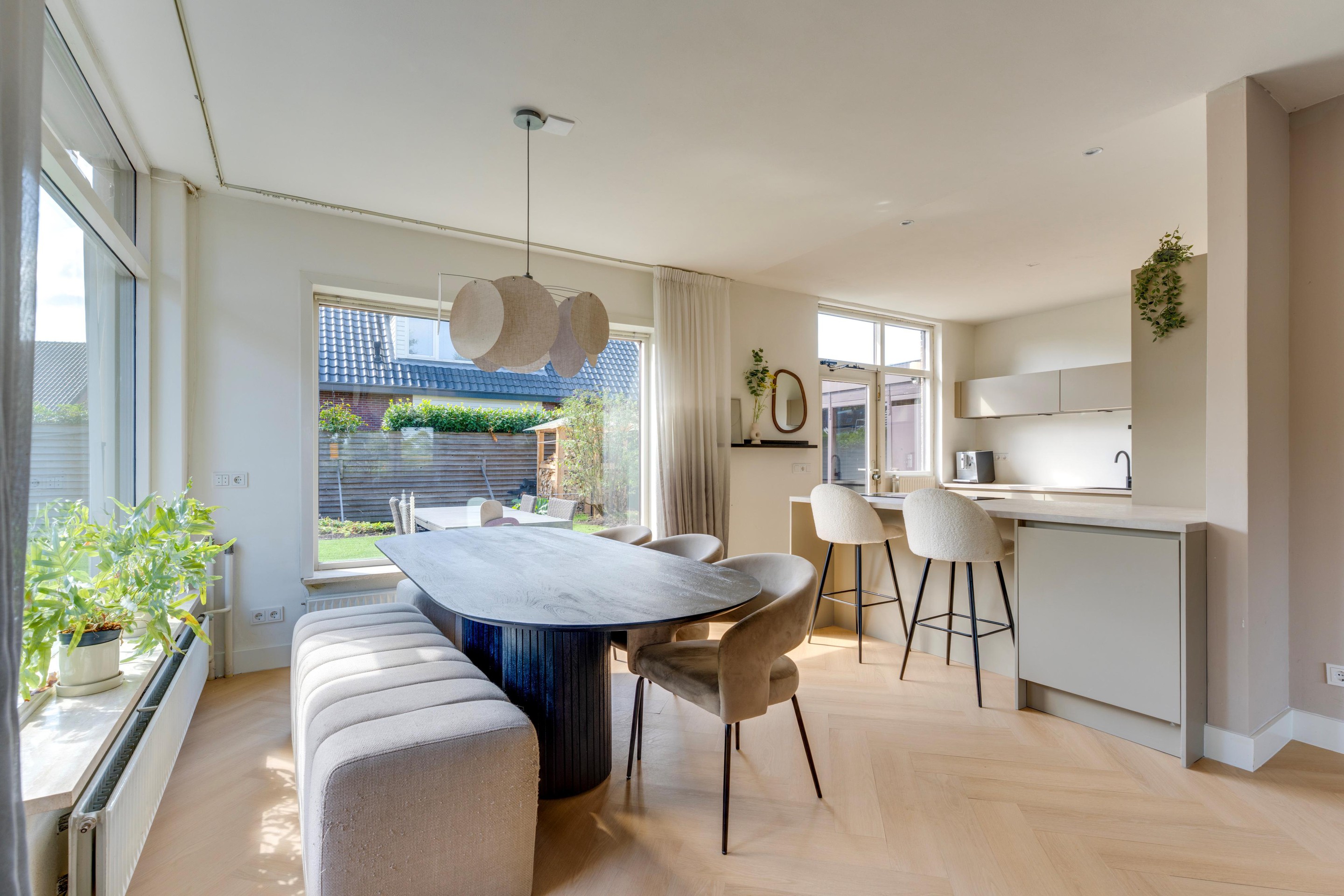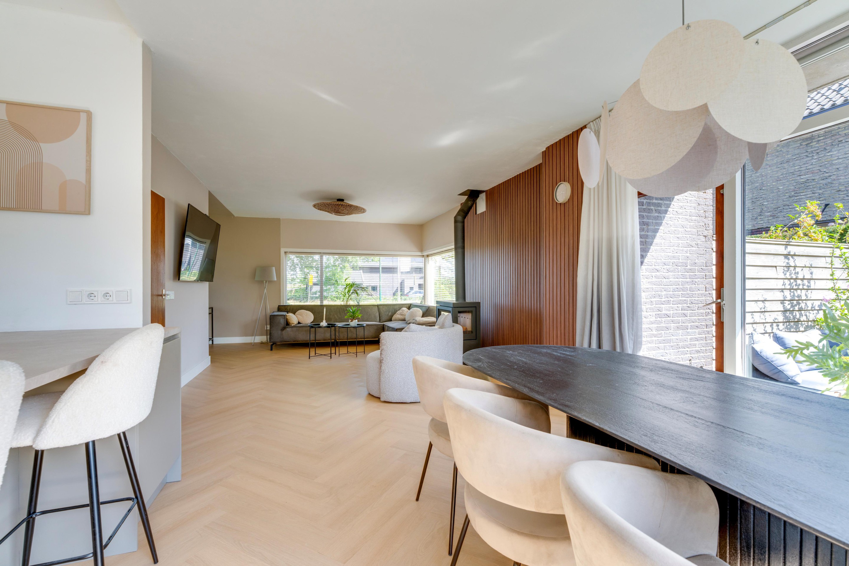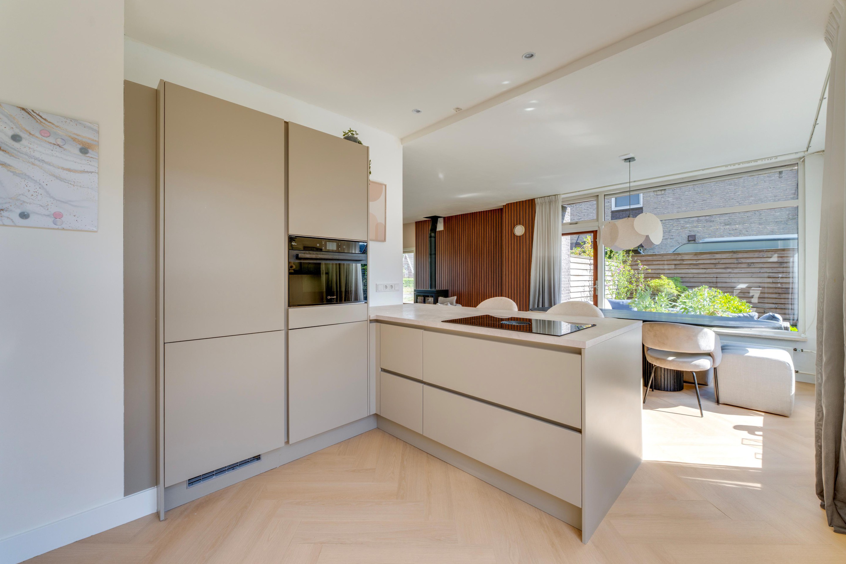Begane grond Je komt binnen in een ruime, lichte hal met hoog plafond, meterkast, trapopgang en toegang tot het toilet. Vanuit hier stap je de royale living binnen: een open en sfeervolle ruimte met een moderne visgraatvloer, vloerverwarming en grote raampartijen rondom. Aan de voorzijde is er plek voor een comfortabele zithoek bij de houtkachel – een warme en uitnodigende plek in huis. Hier is ook ruimte voor een bureau of werkplek, zonder dat het de rust van de woonkamer verstoort. Aan de tuinzijde is er volop plek voor een grote eettafel, waar je uitkijkt op het groen en zo de deur naar buiten opent. De keuken is een echte blikvanger: strak vormgegeven, uitgevoerd in rustige tinten en van alle gemakken voorzien. Het kookeiland met 4-pits Bora inductiekookplaat en bar vormt het hart van de ruimte. Daarnaast beschik je hier over een ingebouwde koelkast, vaatwasser en combimagnetron. Een plek waar je net zo graag samenkomt voor een goed glas wijn als dat je er even rustig met de laptop gaat zitten. Vanuit de keuken heb je direct toegang tot de achtertuin. Alles op de begane grond voelt licht, open en verbonden – een fijne basis om verder op te bouwen.