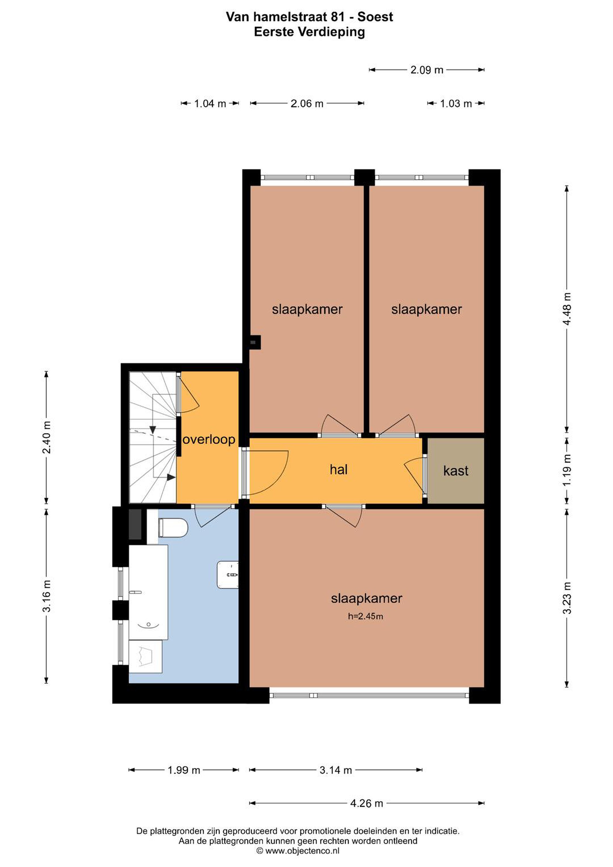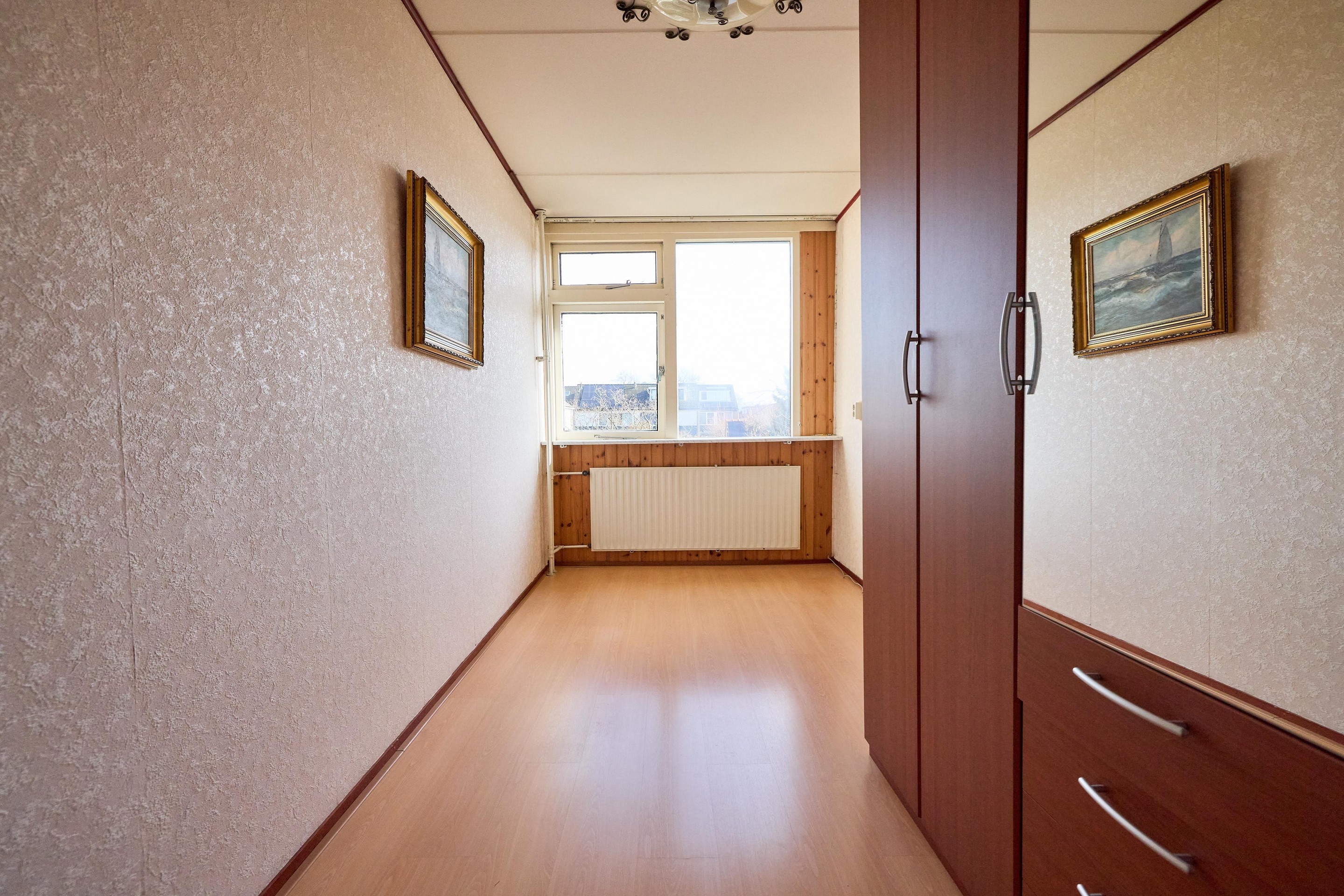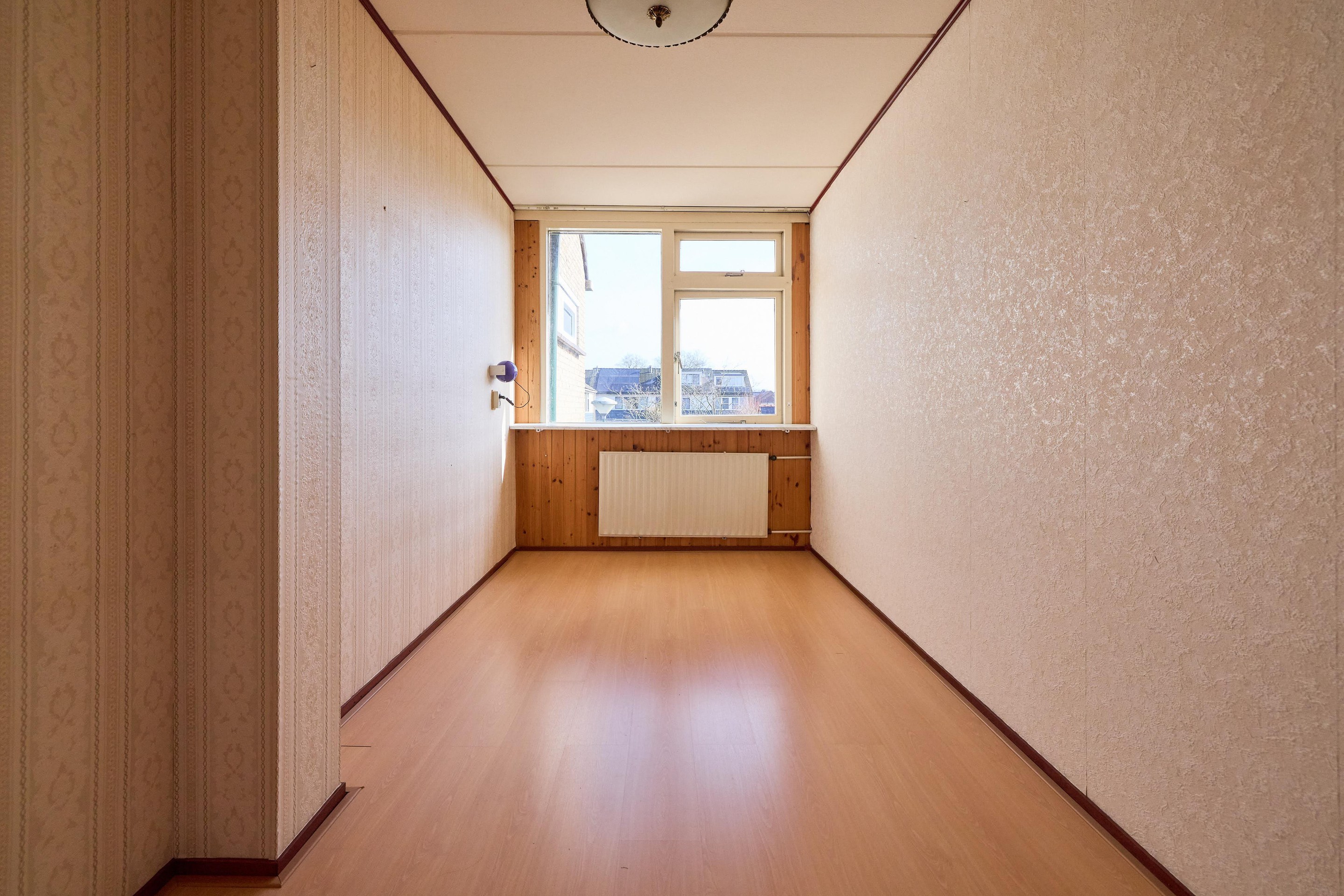 Eerste verdieping Via de overloop heb je toegang tot drie slaapkamers en de badkamer. Aan de achterzijde bevindt zich een ruime slaapkamer met een grote raampartij en vrij uitzicht over de straat. Ook de slaapkamer aan de voorzijde is van goed formaat en beschikt over prettig daglicht. De derde kamer is ideaal als kinder-, werk- of logeerkamer. De badkamer is ruim opgezet en uitgevoerd met een ligbad met douche, wastafel en een tweede toilet. Dankzij de ramen komt er prettig daglicht binnen en kun je hier goed ventileren. Vanaf de overloop heb je daarnaast toegang tot een praktische vaste kast, ideaal voor het opbergen van linnengoed en andere spullen.