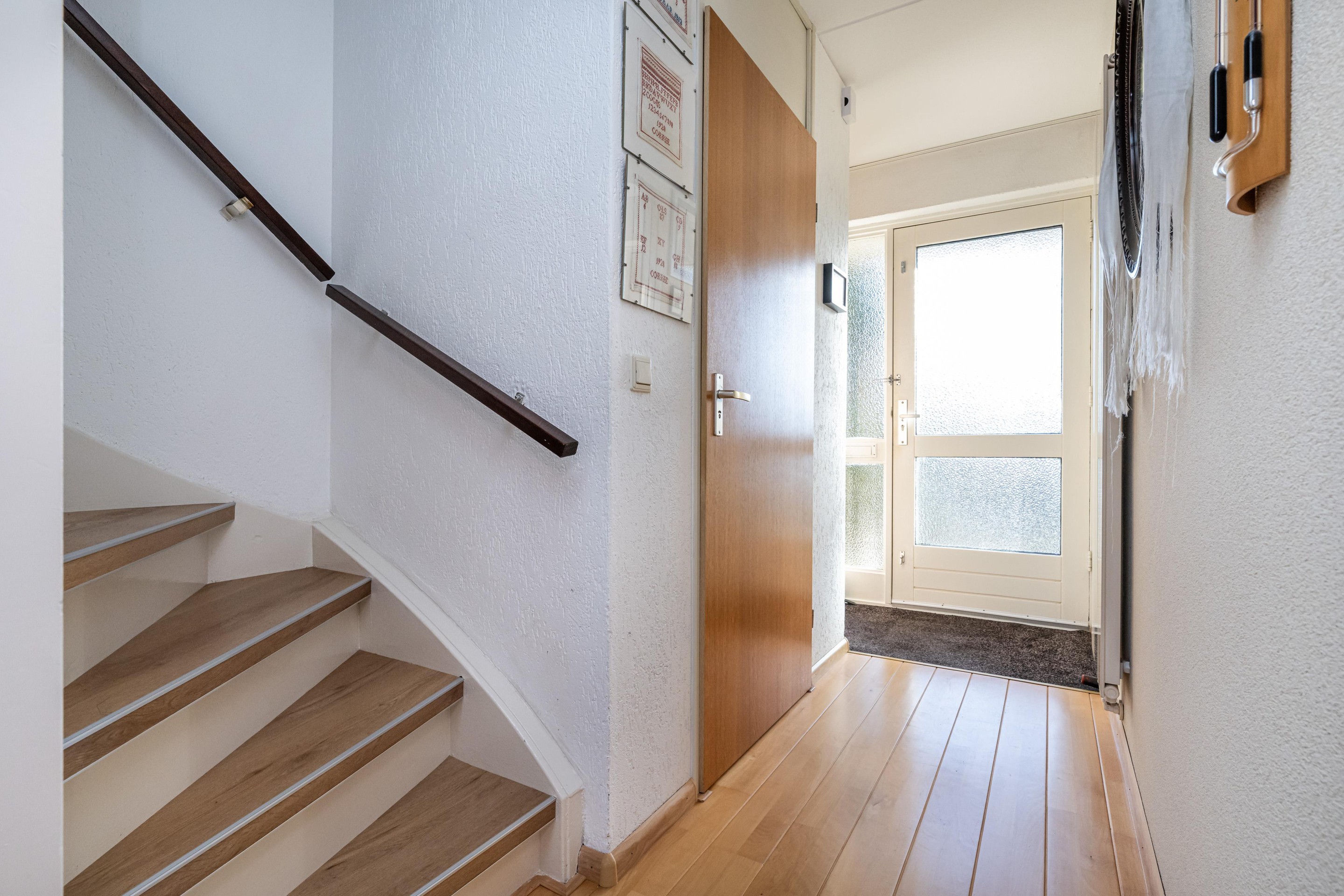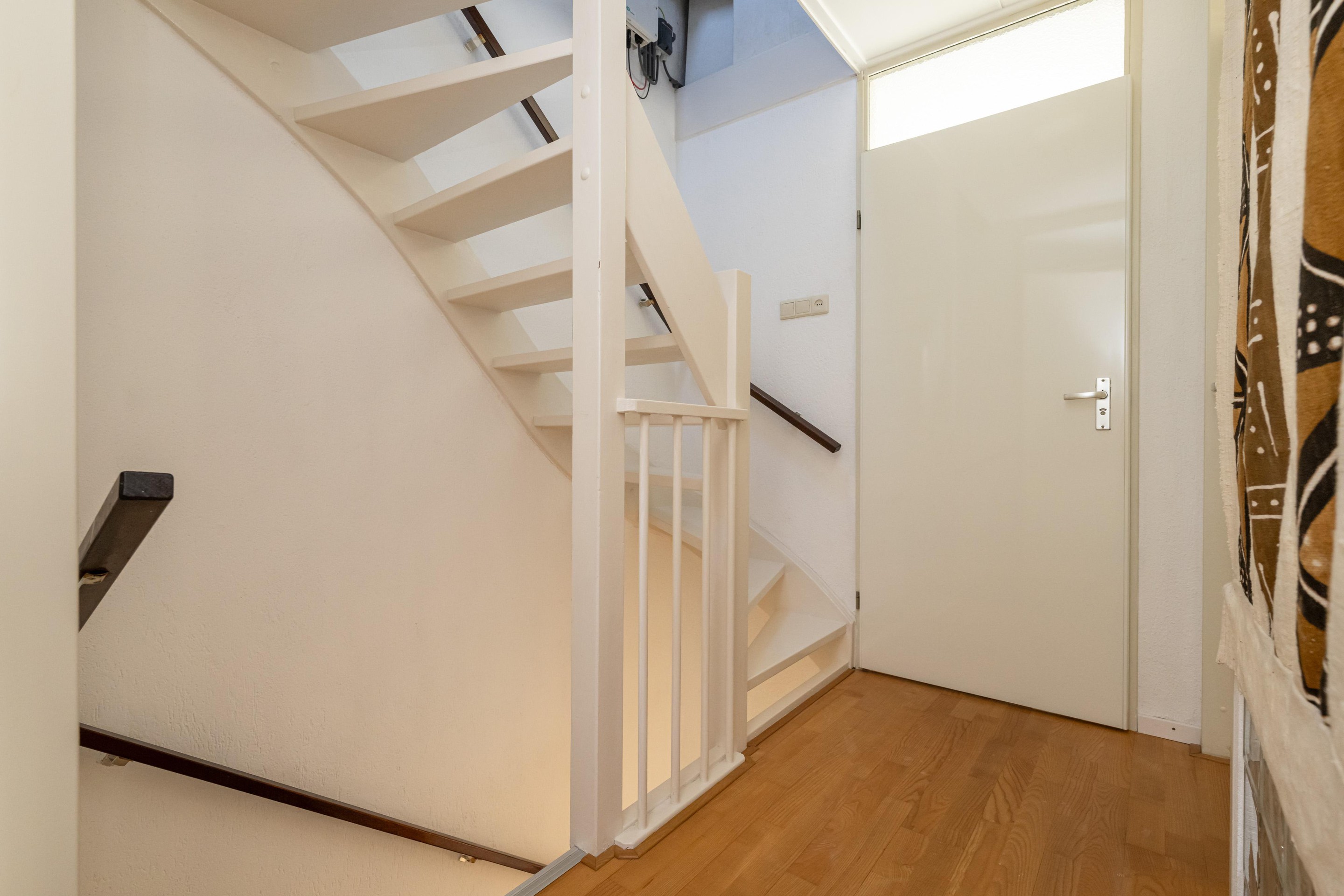 Parketvloer, groepenkast, trapopgang naar 1e etage en een radiator.