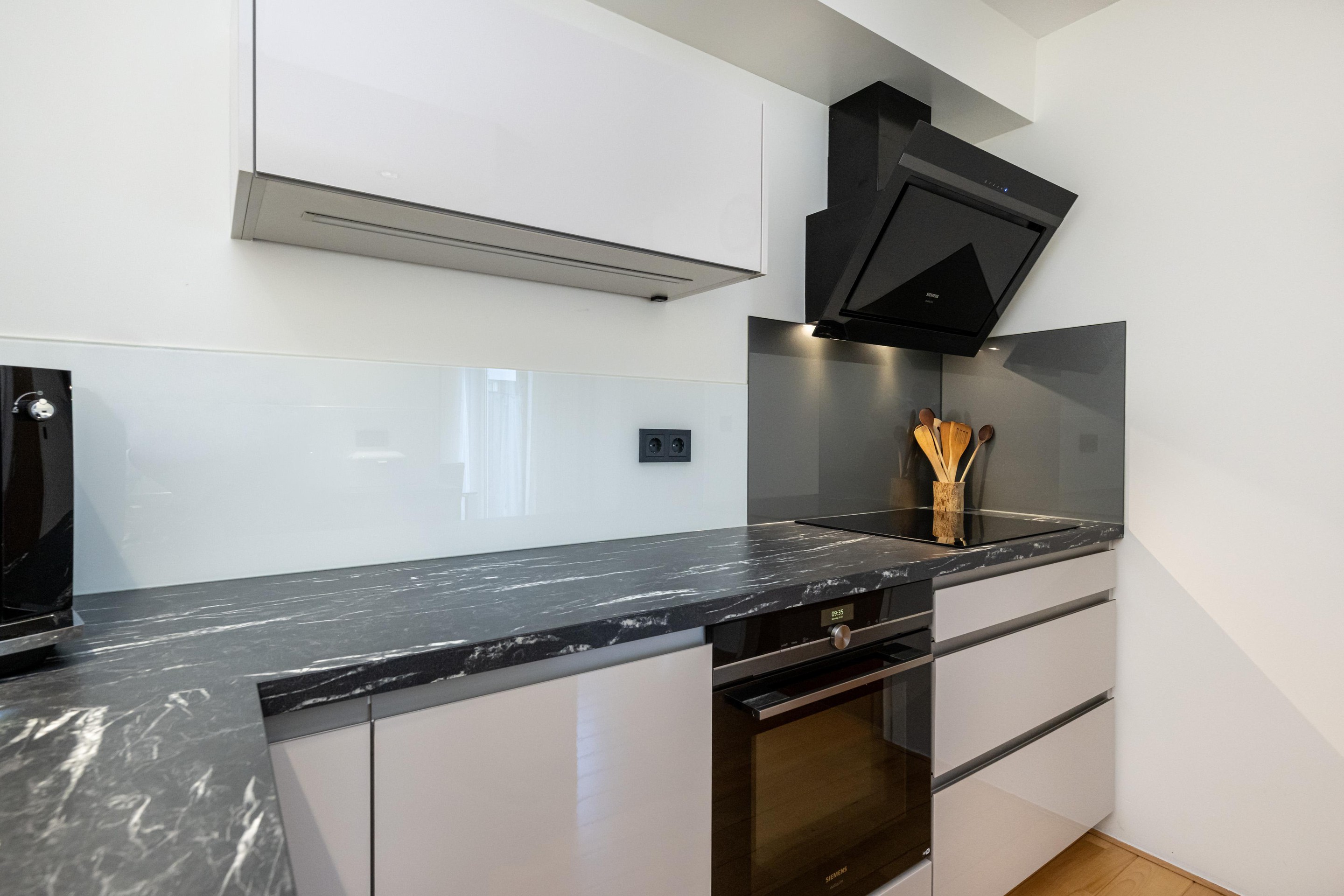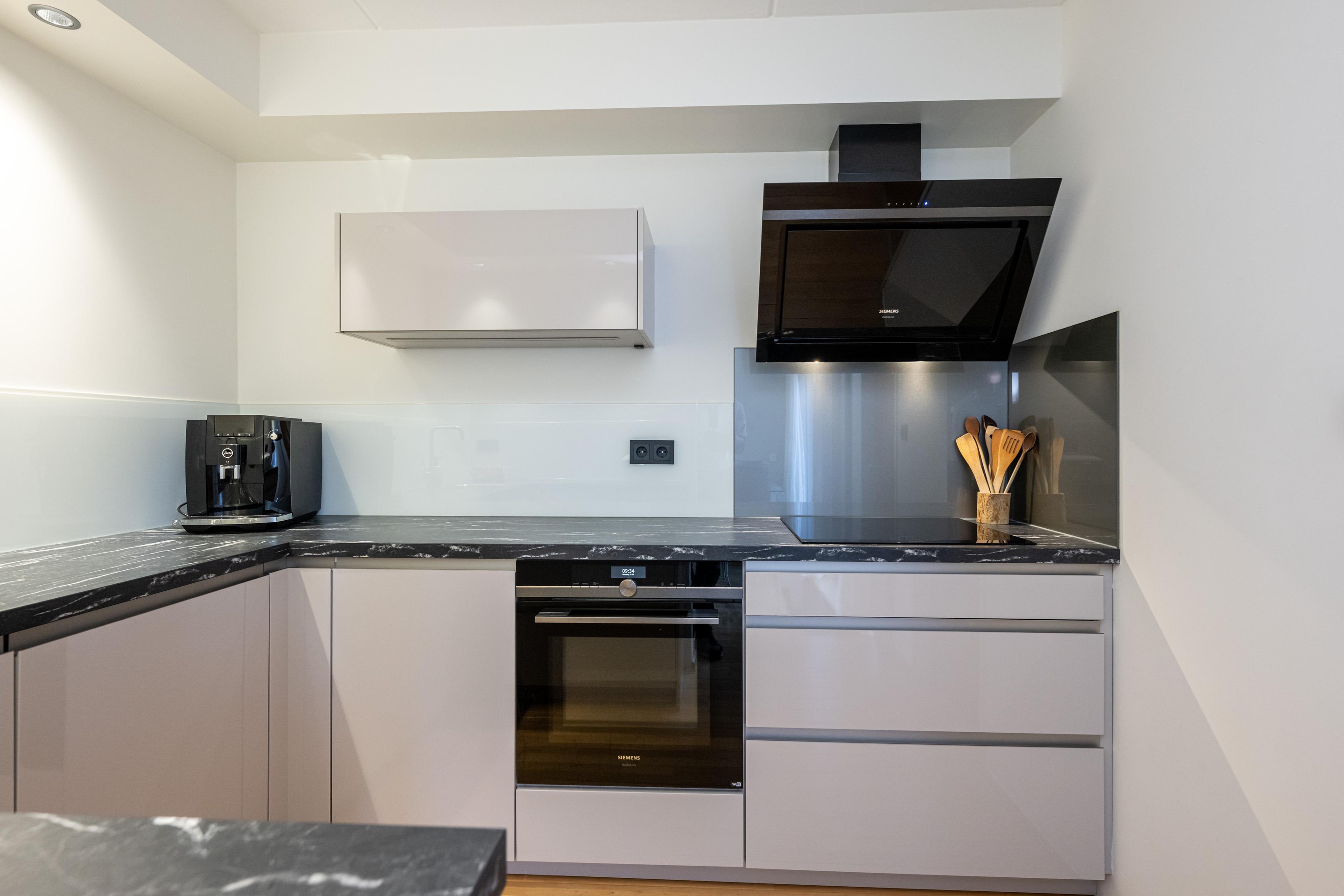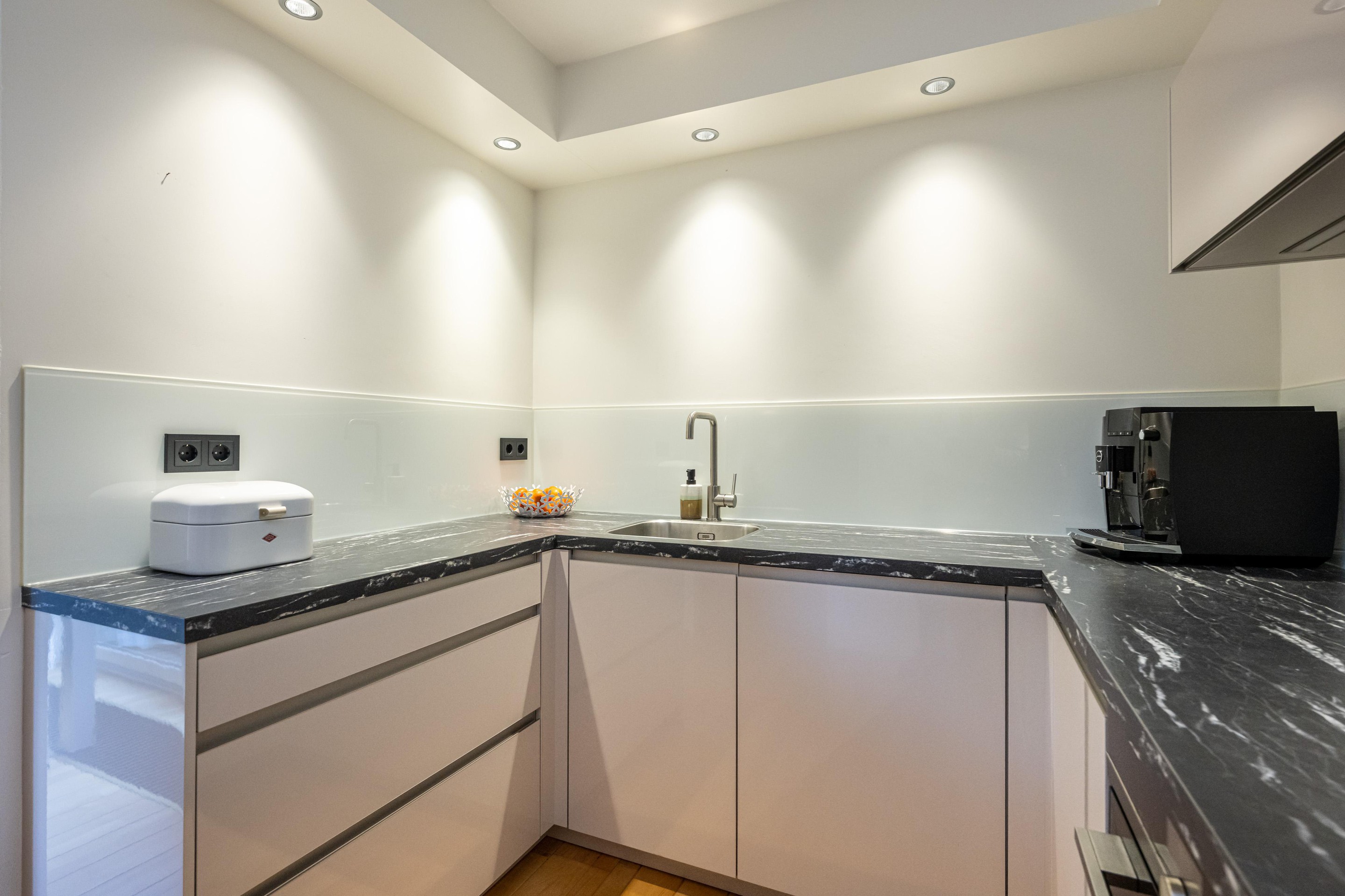 Parketvloer, enkele spoelbak, close-in boiler, vaatwasser, combi-magnetron, 4 pits inductiekookplaat, afzuigkap en spots.