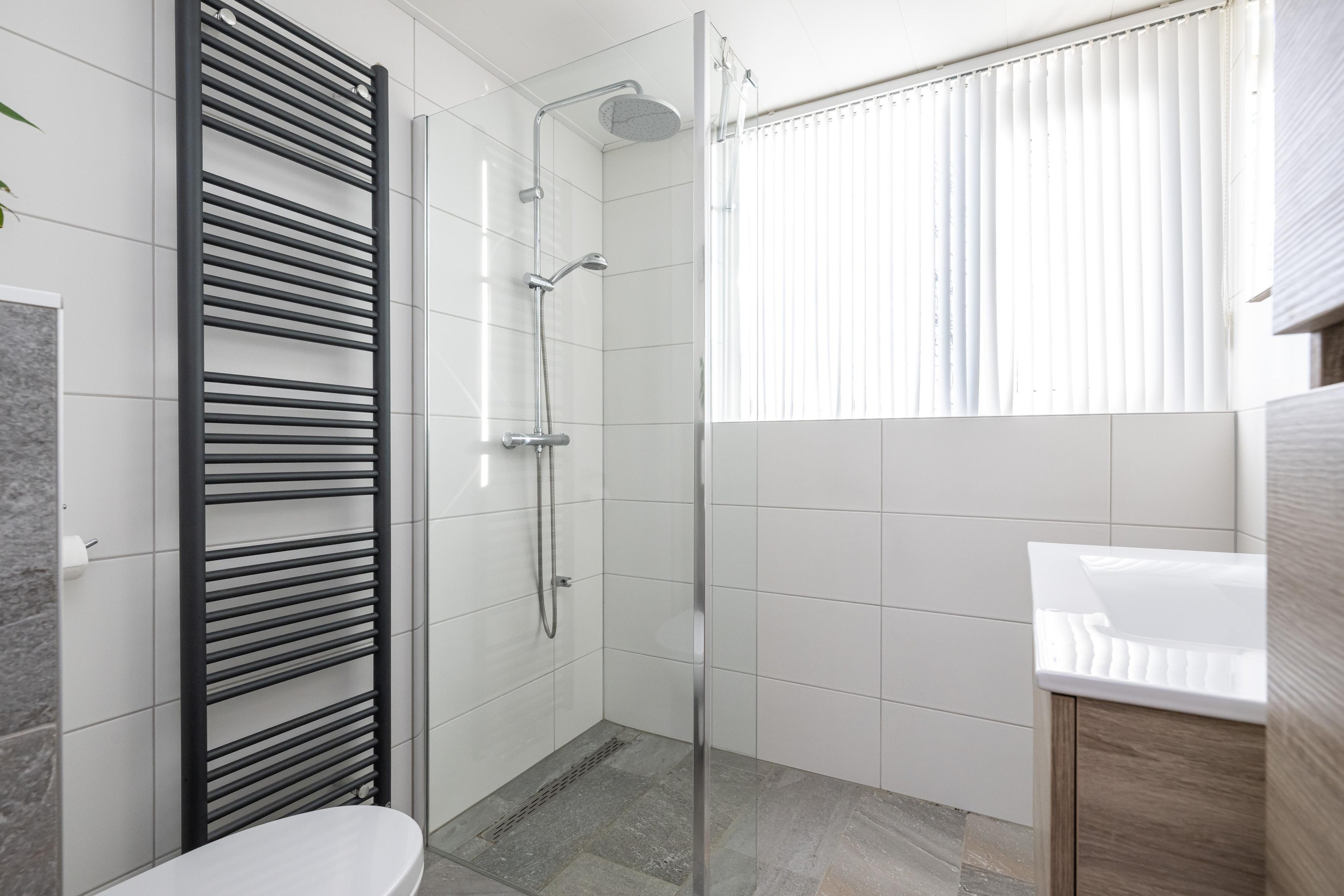 Plavuizenvloer, geheel betegeld, wastafel met meubel, handdoekenkast, inloopdouche, zwevend toilet, handdoekenradiator, en elektrische afzuiging.