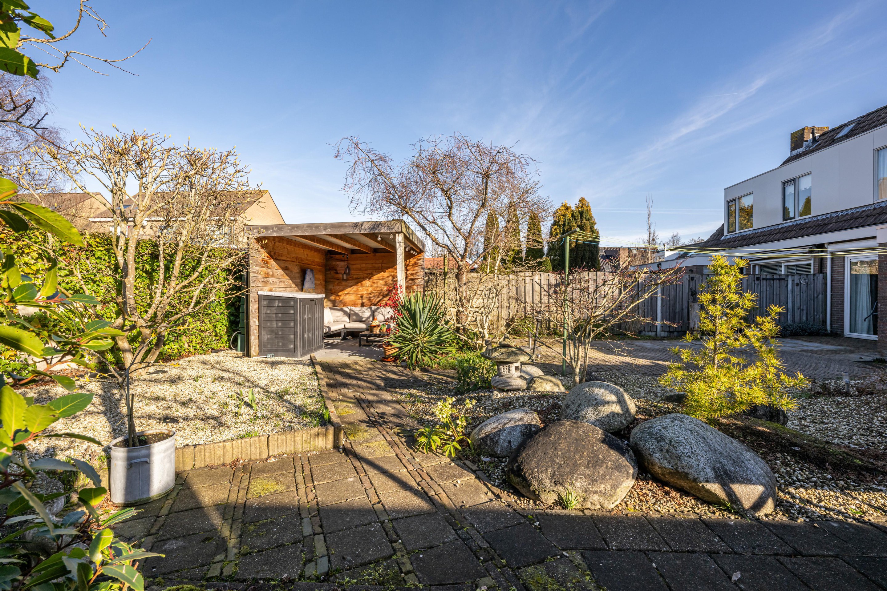 Buiten komt het woongenot volledig tot zijn recht. De achtertuin is gelegen op het westen, wat betekent dat u hier optimaal kunt genieten van de middag- en avondzon. Of u nu na een werkdag nog even wilt ontspannen met een kop koffie of op een zomerse avond lang buiten wilt tafelen, deze tuin biedt daar alle gelegenheid voor. De overkapping in de achtertuin vormt een sfeervolle aanvulling en maakt het mogelijk om ook bij minder mooi weer comfortabel buiten te zitten. Zo verlengt u het buitenseizoen aanzienlijk en heeft u een fijne plek om te genieten van rust, privacy en gezelligheid.