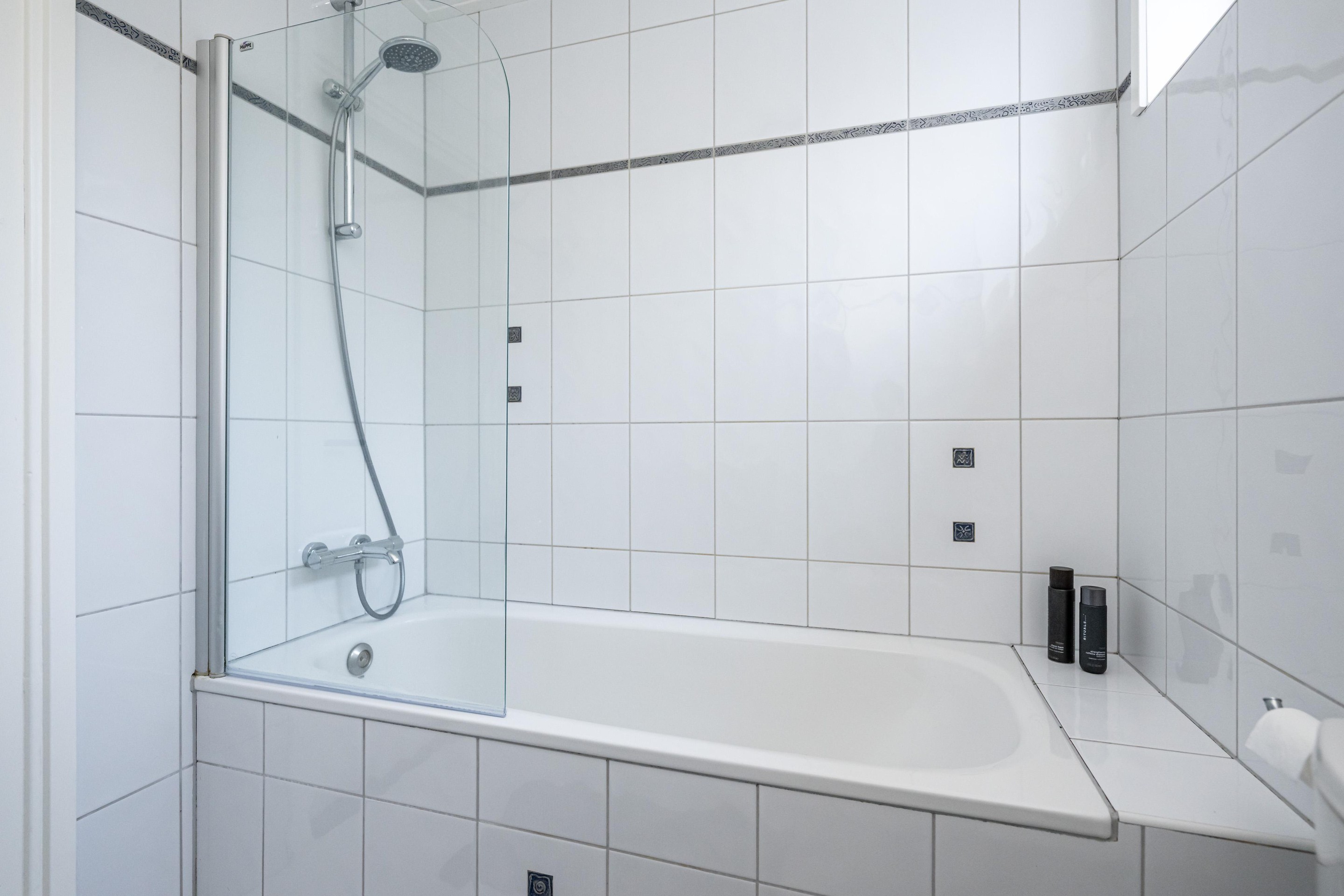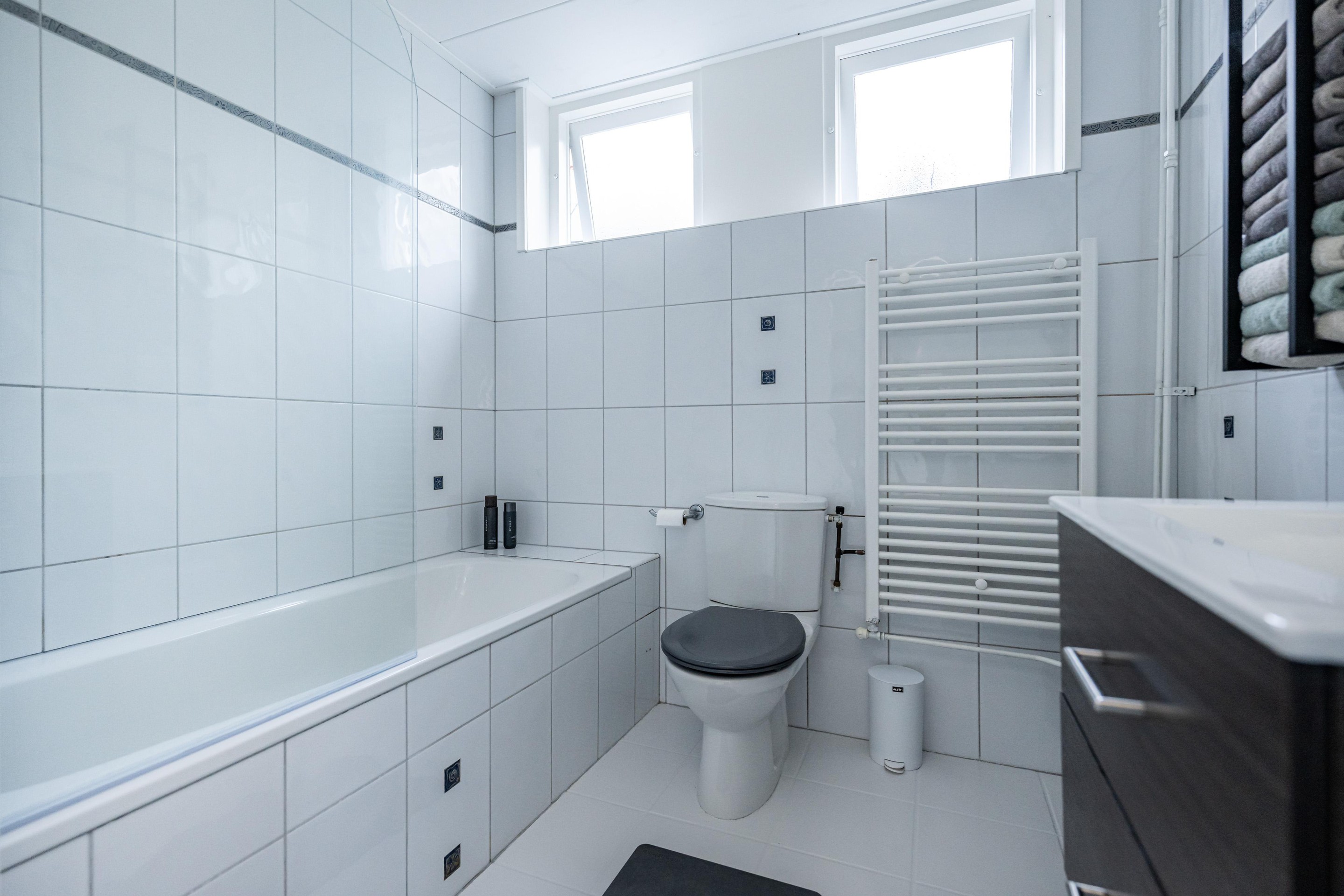 Bad/douche combinatie, toilet, handdoekenradiator, wastafelmeubel, spiegel en geheel betegeld.