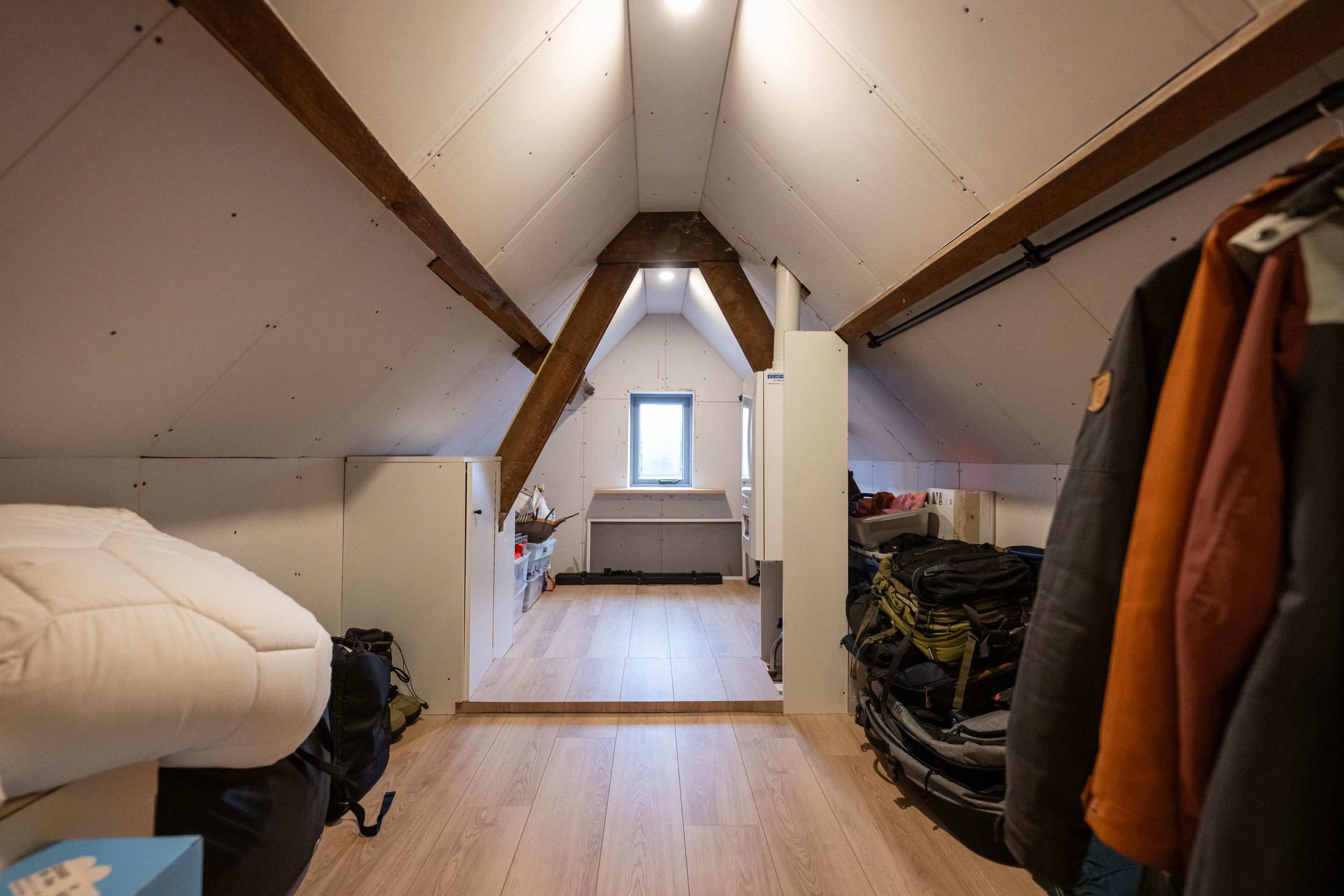 Laminaatvloer, Velux dakvenster, radiator en walk-in closet.