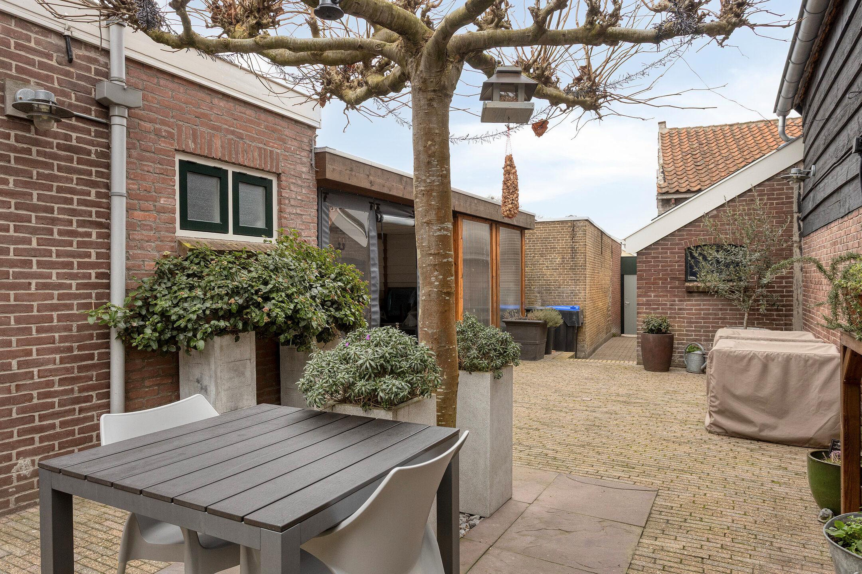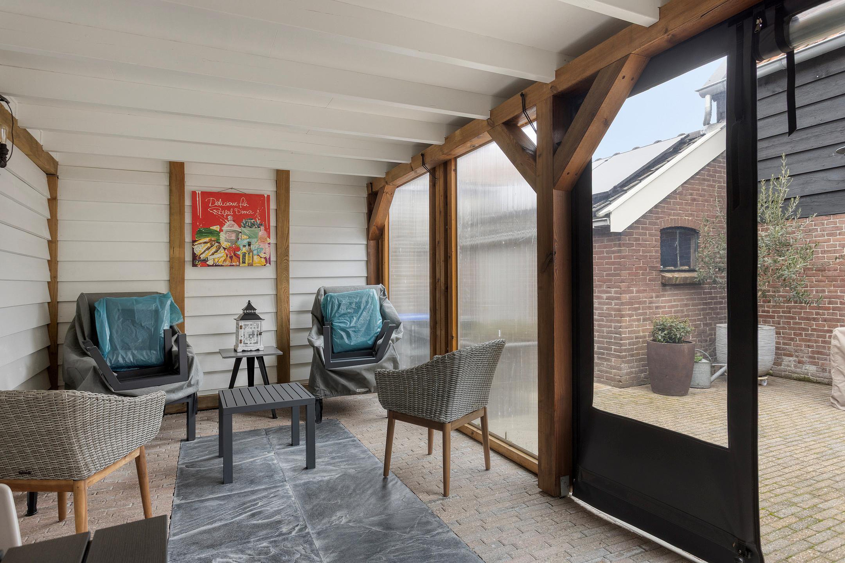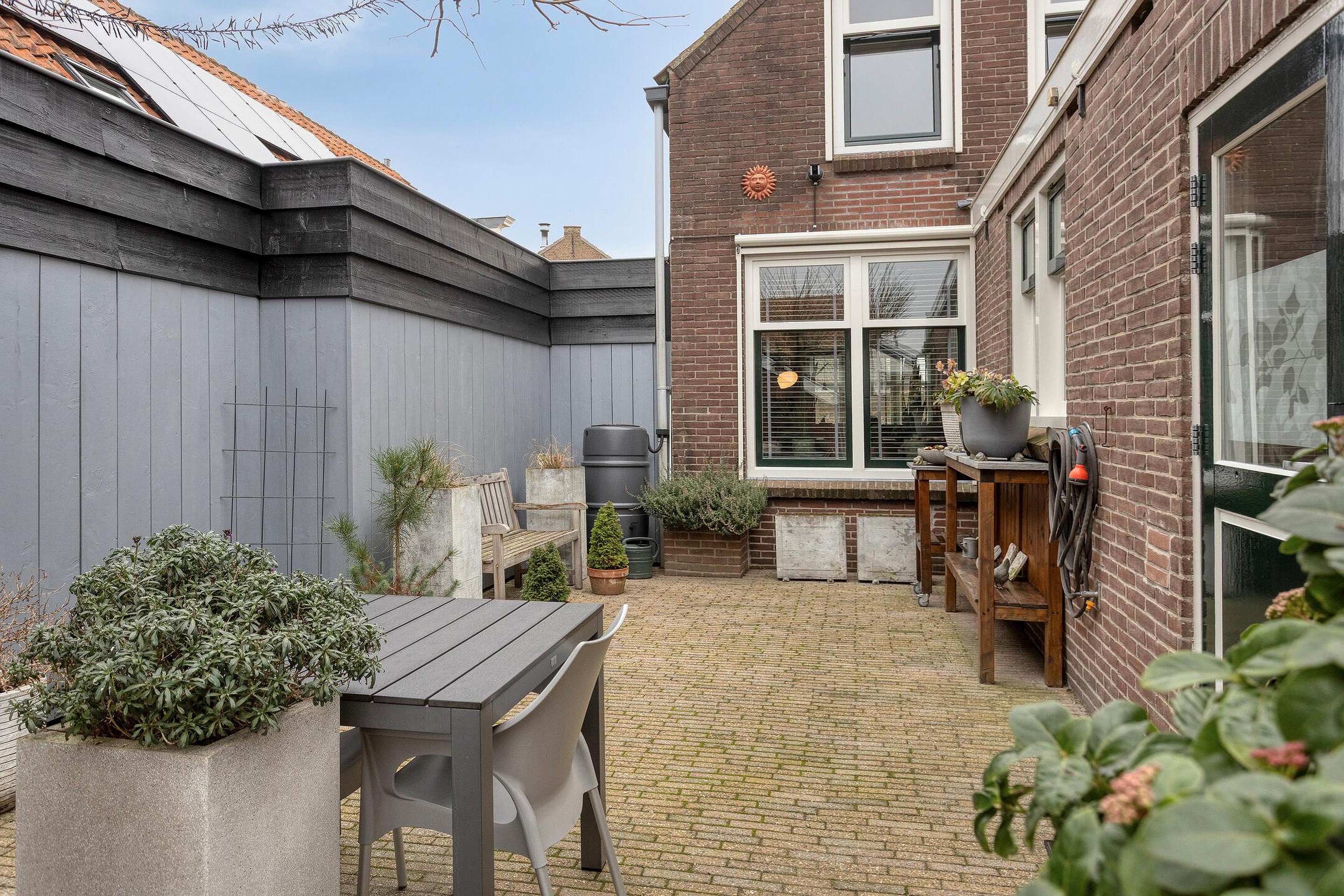 Tuin De verzorgde achtertuin is gesitueerd op het westen en beschikt over een fijne overkapping, waardoor je hier het hele jaar door kunt genieten. Achterin de tuin staat de berging, ideaal voor fietsen, gereedschap of opslag. De tuin heeft een uitgang via de af te sluiten poort naar de Westelijke Achterweg.