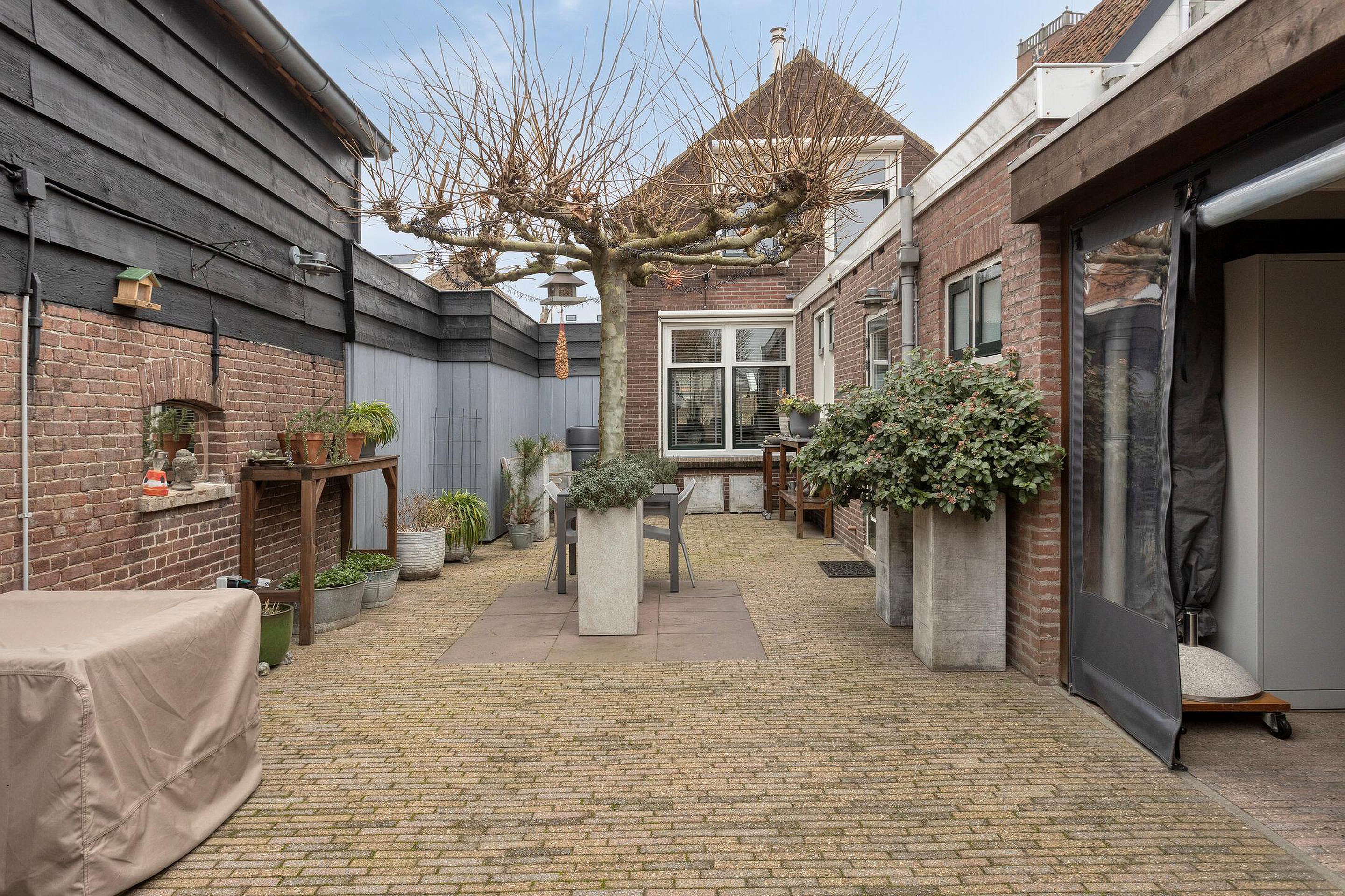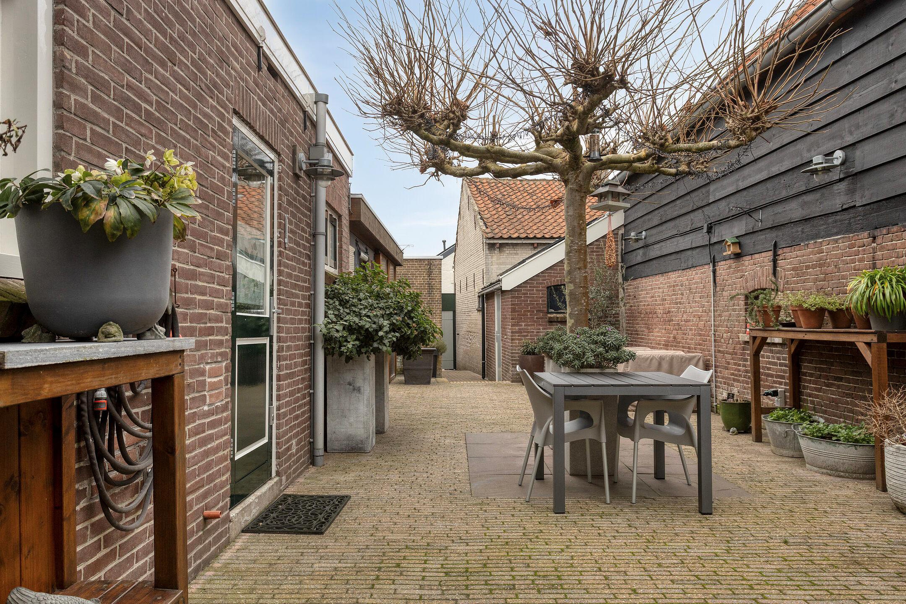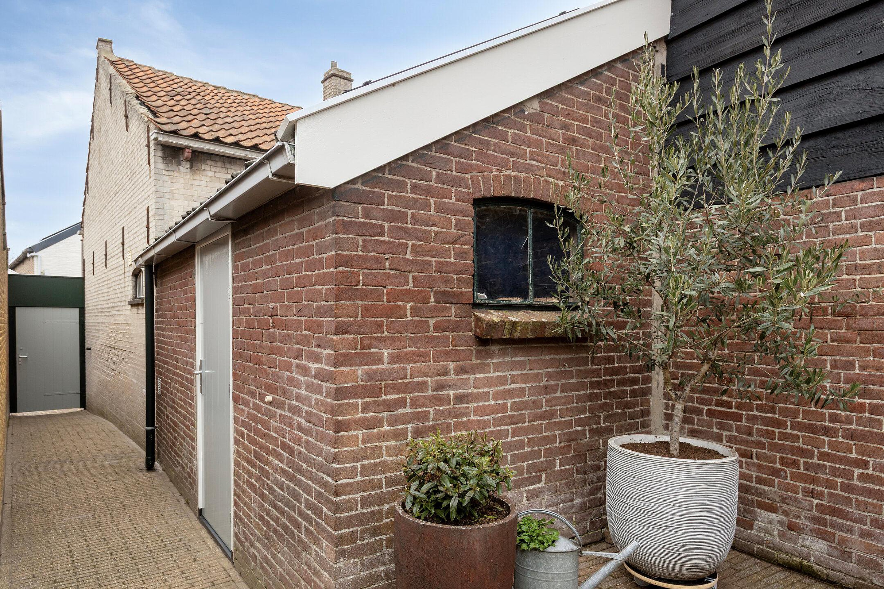 Tuin De verzorgde achtertuin is gesitueerd op het westen en beschikt over een fijne overkapping, waardoor je hier het hele jaar door kunt genieten. Achterin de tuin staat de berging, ideaal voor fietsen, gereedschap of opslag. De tuin heeft een uitgang via de af te sluiten poort naar de Westelijke Achterweg.