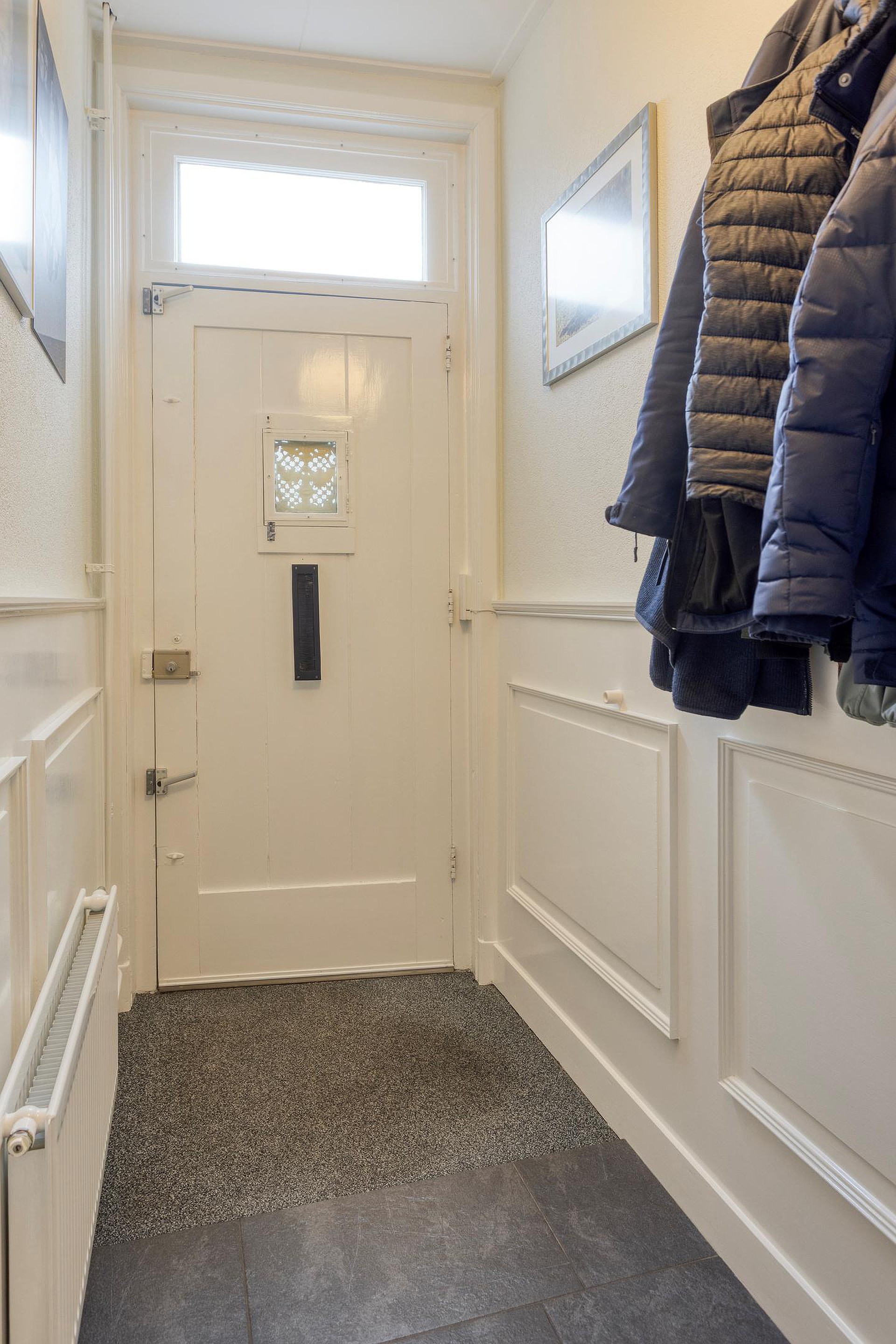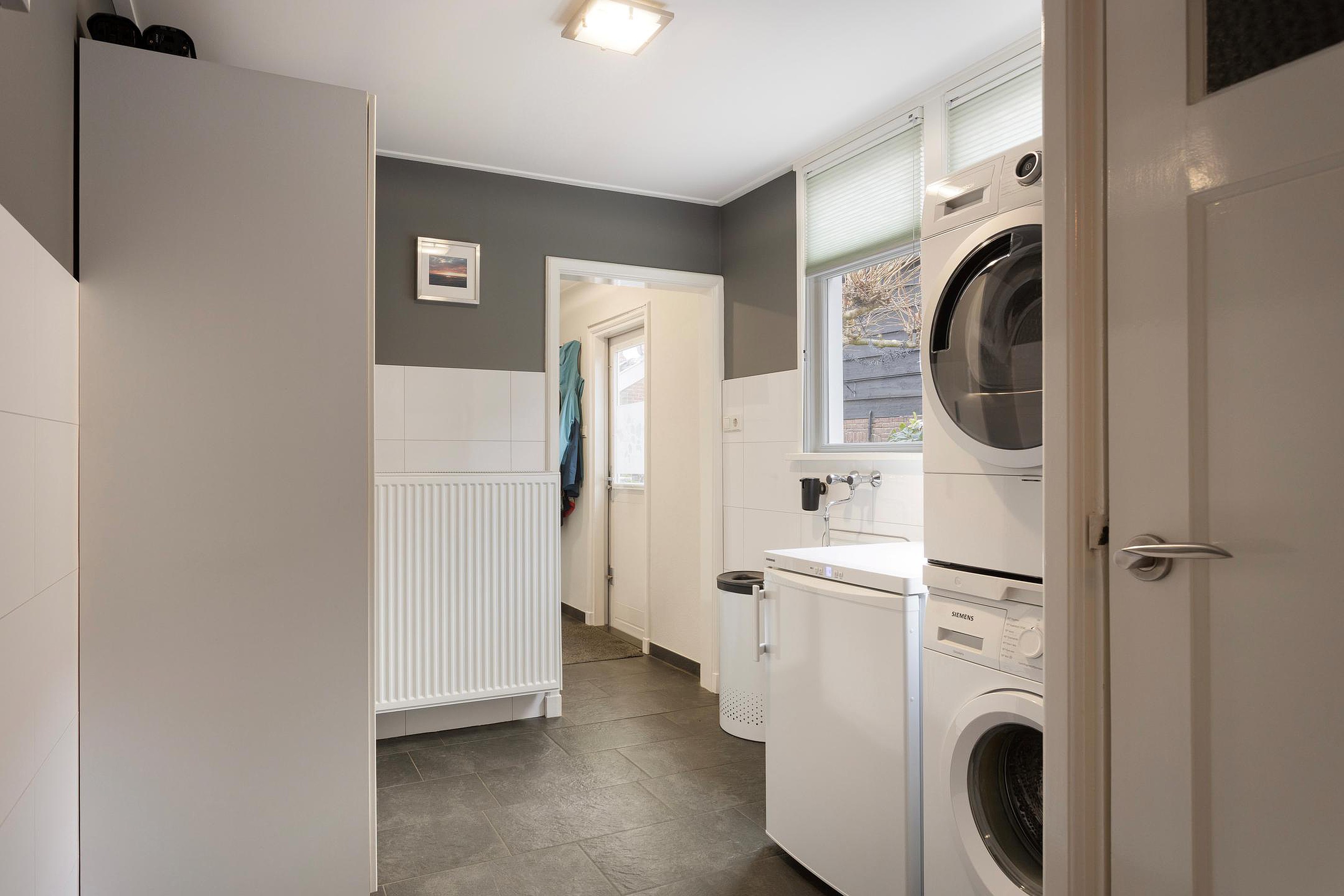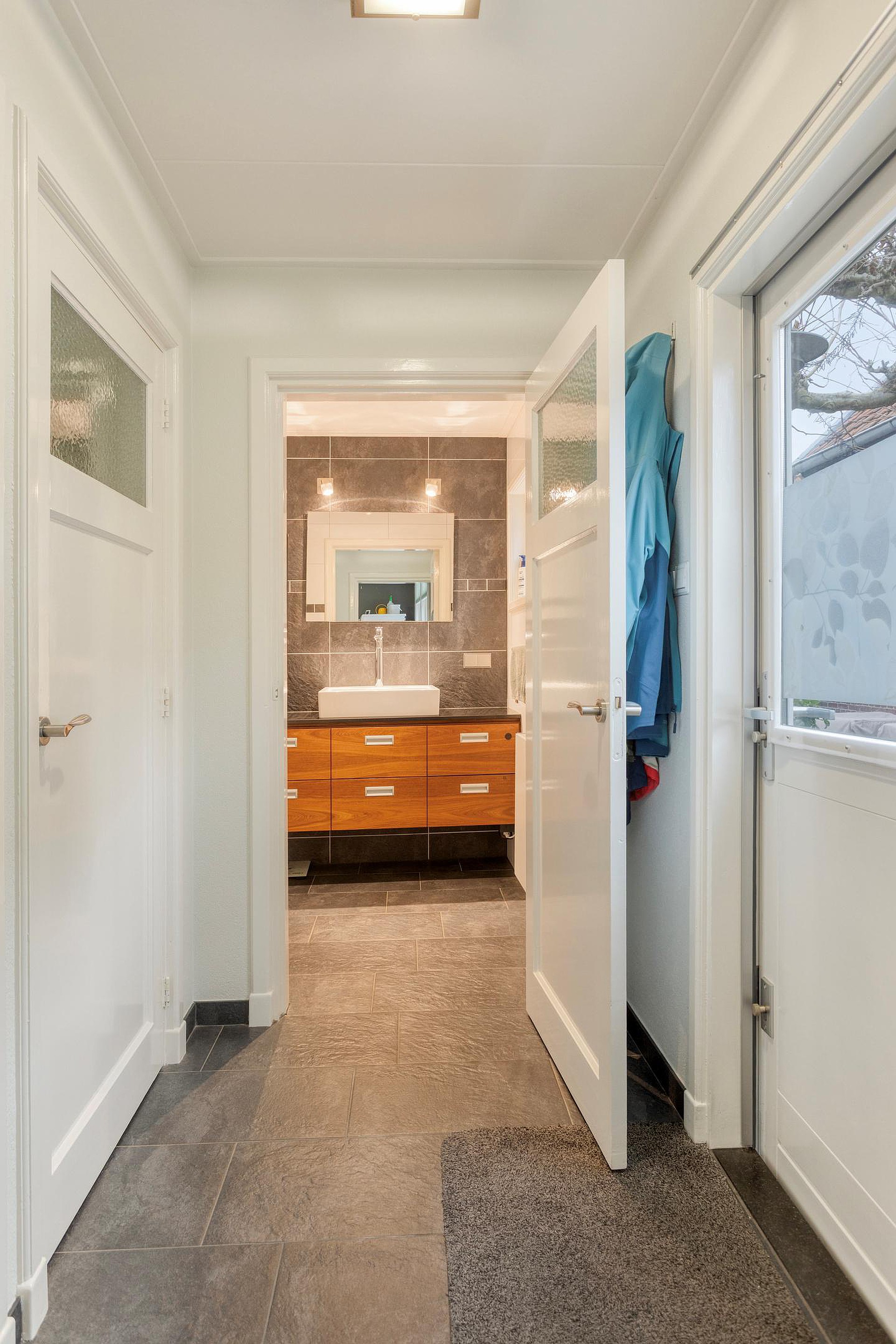 De moderne keuken is aan de voorzijde van de woonruimte gesitueerd en voorzien van diverse inbouwapparatuur. Aan de achterzijde bevindt zich de praktische bijkeuken met extra werk- en bergruimte. Aansluitend aan de bijkeuken is er de hal achter. Vanuit deze bereik je de CV-ruimte, het toilet en ook de badkamer op de begane grond, uitgevoerd met douche en wastafelmeubel. Vanuit de hal bereik je de ruime achtertuin.