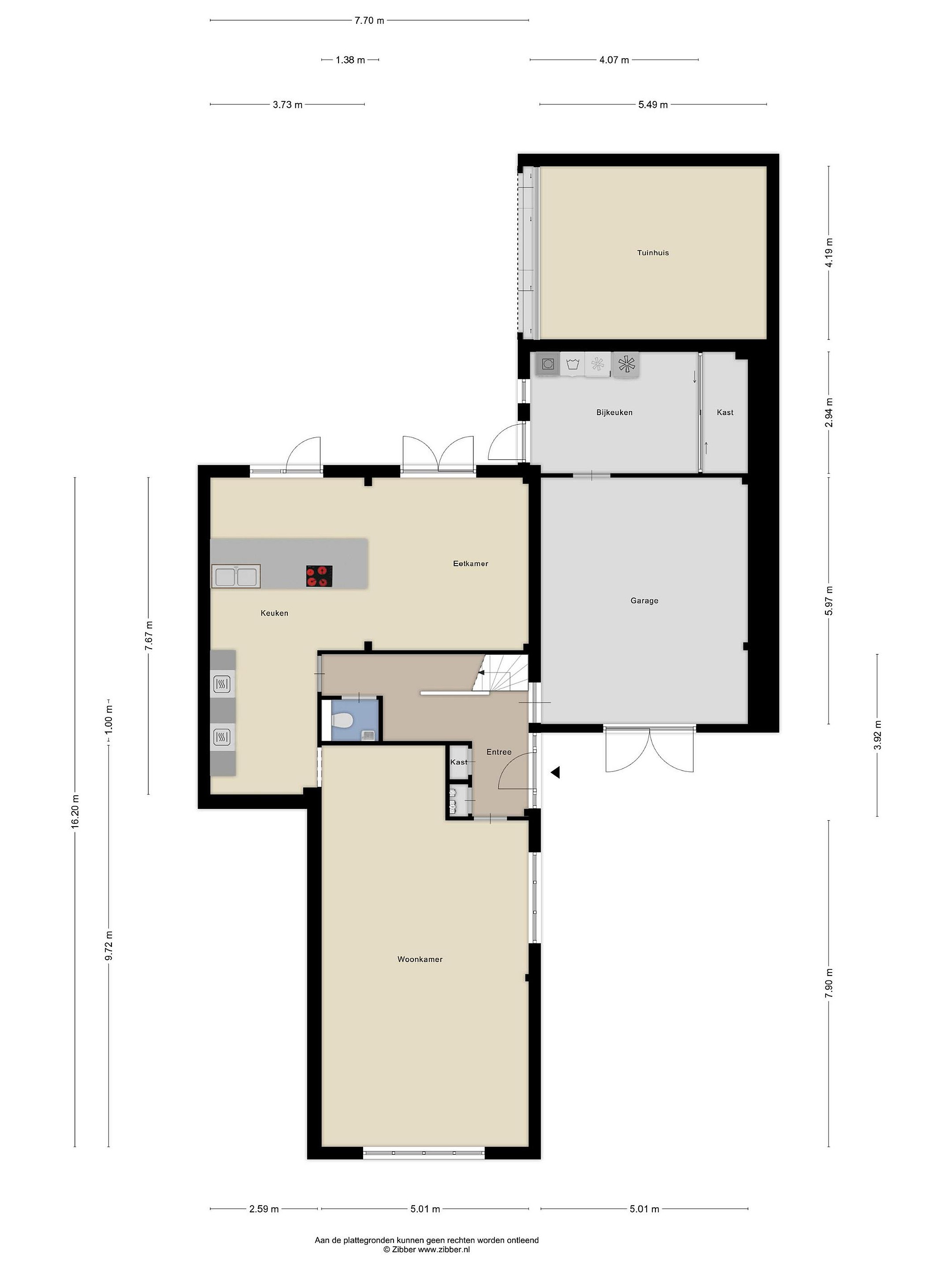 Begane grond: Entree, toilet, woonkamer met draagbalken en gashaard, luxe keuken, bijkeuken en garage.
